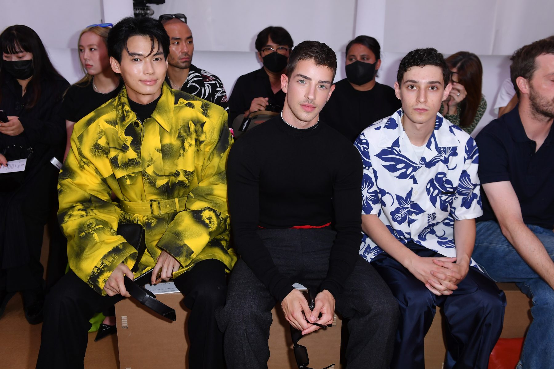 MILAN, ITALY - JUNE 19: Metawin Opas-iamkajorn, Manu Rios and Filippo Scotti attend Prada Spring/Summer 2023 Menswear Fashion Show on June 19, 2022 in Milan, Italy. (Photo by Jacopo M. Raule/Getty Images for Prada)