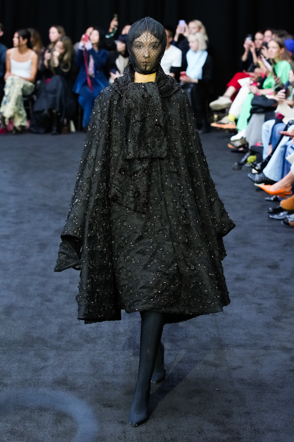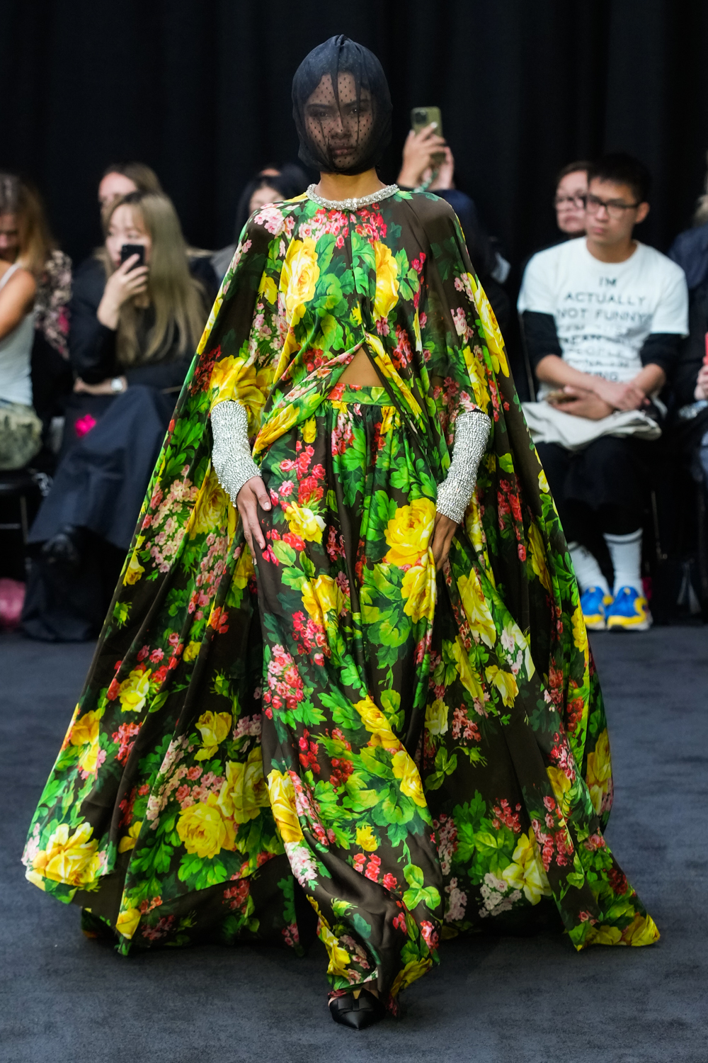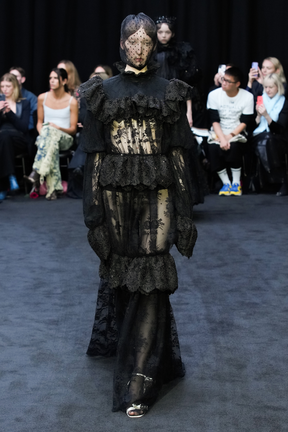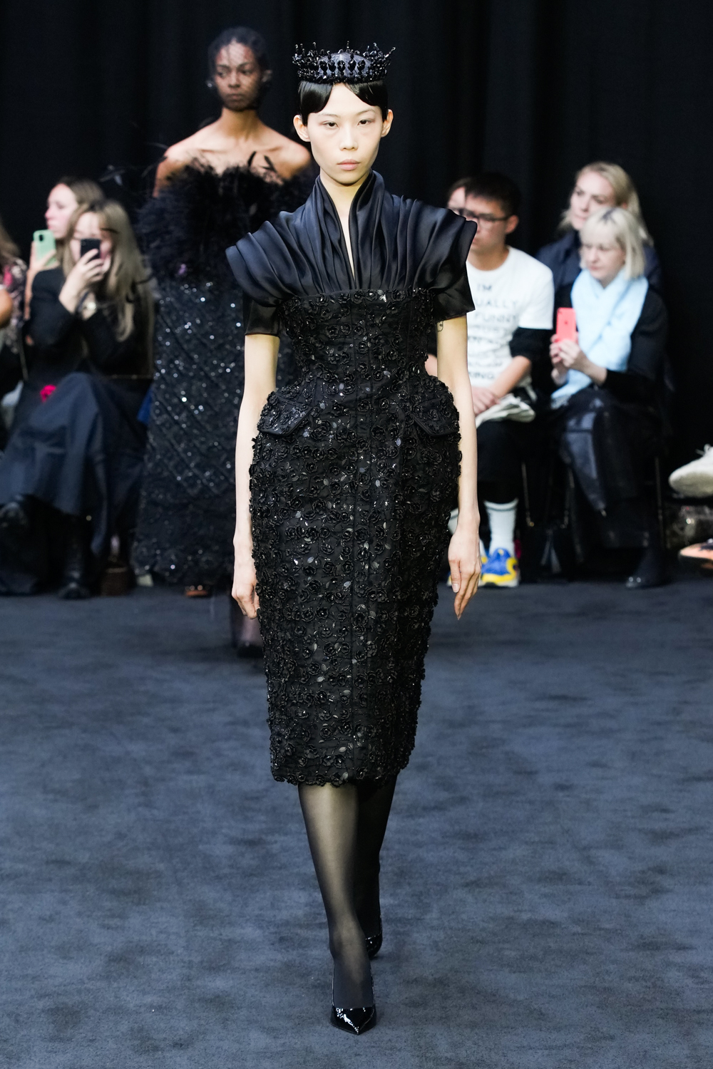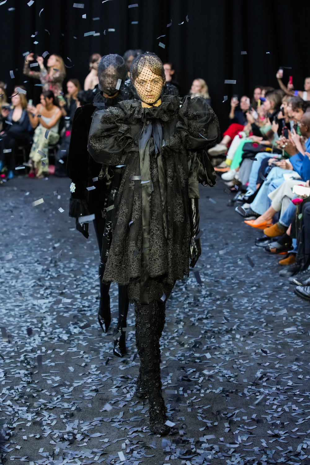 過去所有標誌式數碼印刷化為立體的黑色刺繡,甚至深受1952年佐治六世的葬禮上黑袍高級訂製所啟發,不難看見 Richard Quinn 使出渾身解數打造出 Cristóbal Balenciaga 式的黑色輪廓、1950年代稱身正式禮服、lurex 巨大斗篷等元素。而所有模特兒都被精緻閃爍的黑色刺繡喱士所覆蓋,甚至出現黑色皇冠,一切都如時裝展筆記般:「Richard Quinn 將2023春夏系列獻給女王陛下,這位曾經以優雅和仁慈感動過的他和所有人的女王。」 因為設計師知道,自己的成功某程度上歸功於英女王,成為大家對 Richard Quinn 第一印象。