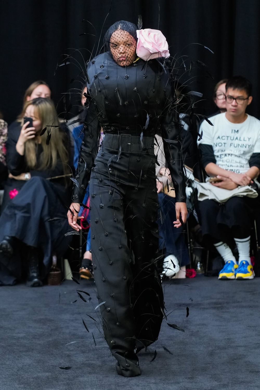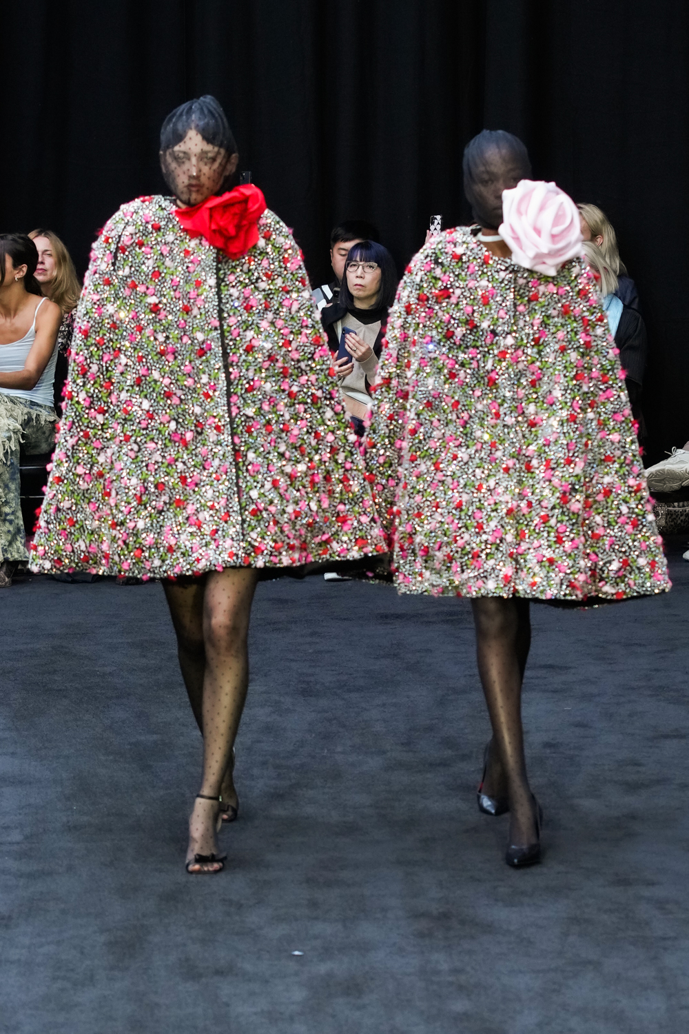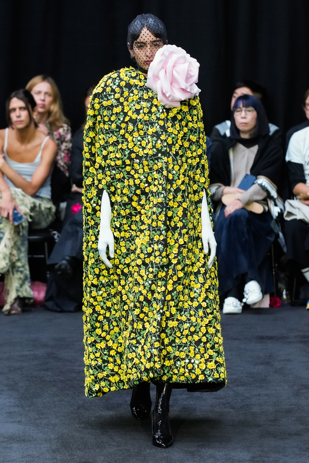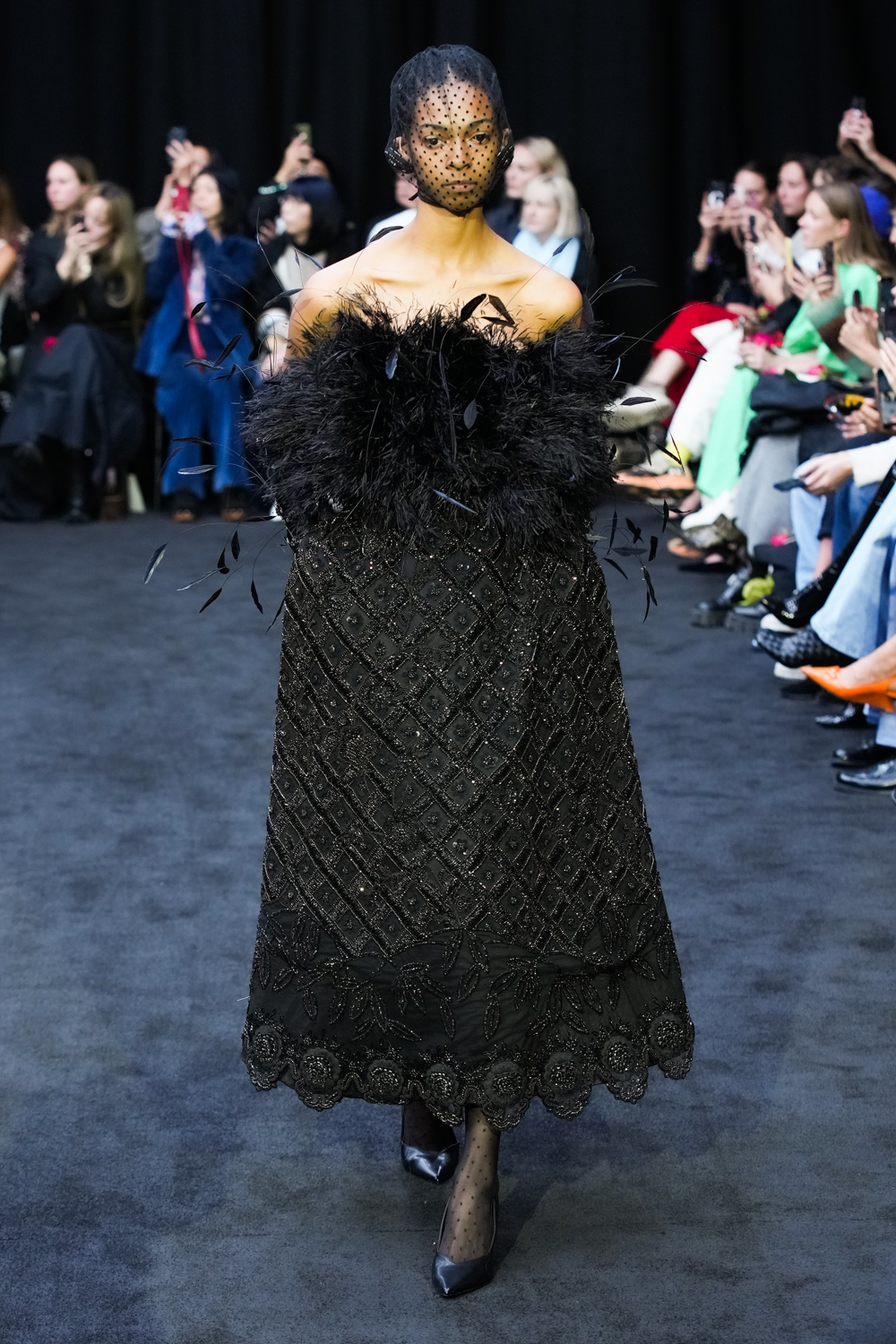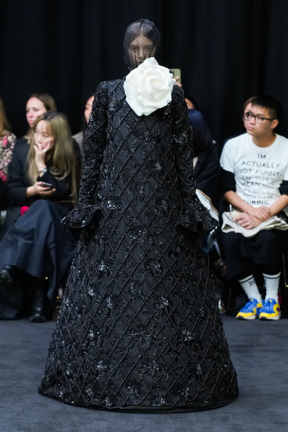 過去所有標誌式數碼印刷化為立體的黑色刺繡,甚至深受1952年佐治六世的葬禮上黑袍高級訂製所啟發,不難看見 Richard Quinn 使出渾身解數打造出 Cristóbal Balenciaga 式的黑色輪廓、1950年代稱身正式禮服、lurex 巨大斗篷等元素。而所有模特兒都被精緻閃爍的黑色刺繡喱士所覆蓋,甚至出現黑色皇冠,一切都如時裝展筆記般:「Richard Quinn 將2023春夏系列獻給女王陛下,這位曾經以優雅和仁慈感動過的他和所有人的女王。」 因為設計師知道,自己的成功某程度上歸功於英女王,成為大家對 Richard Quinn 第一印象。