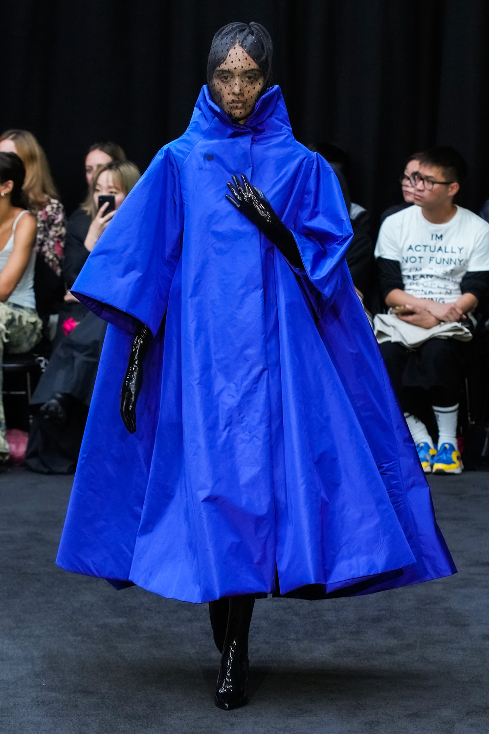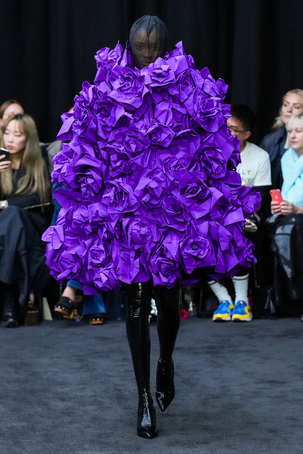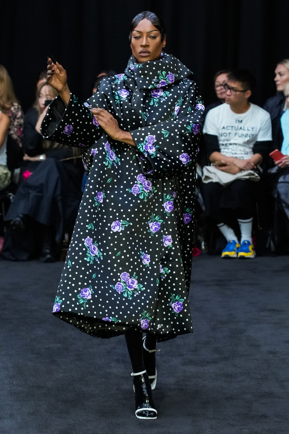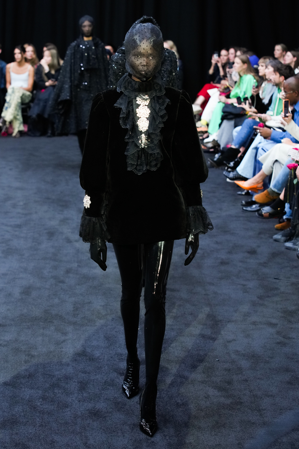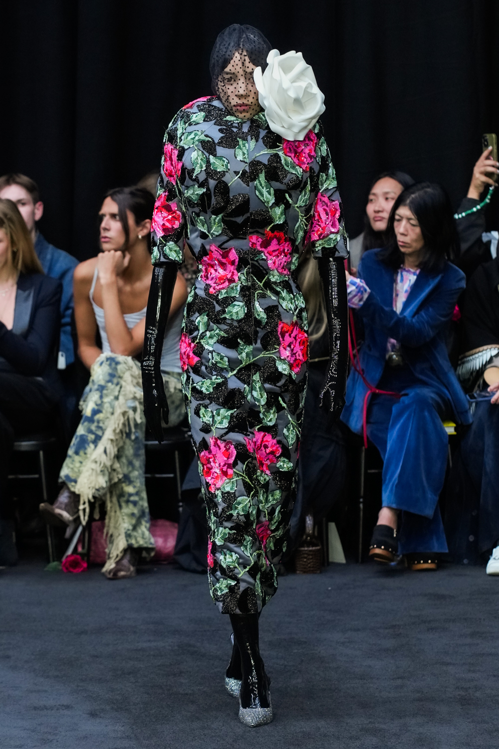 過去所有標誌式數碼印刷化為立體的黑色刺繡,甚至深受1952年佐治六世的葬禮上黑袍高級訂製所啟發,不難看見 Richard Quinn 使出渾身解數打造出 Cristóbal Balenciaga 式的黑色輪廓、1950年代稱身正式禮服、lurex 巨大斗篷等元素。而所有模特兒都被精緻閃爍的黑色刺繡喱士所覆蓋,甚至出現黑色皇冠,一切都如時裝展筆記般:「Richard Quinn 將2023春夏系列獻給女王陛下,這位曾經以優雅和仁慈感動過的他和所有人的女王。」 因為設計師知道,自己的成功某程度上歸功於英女王,成為大家對 Richard Quinn 第一印象。
