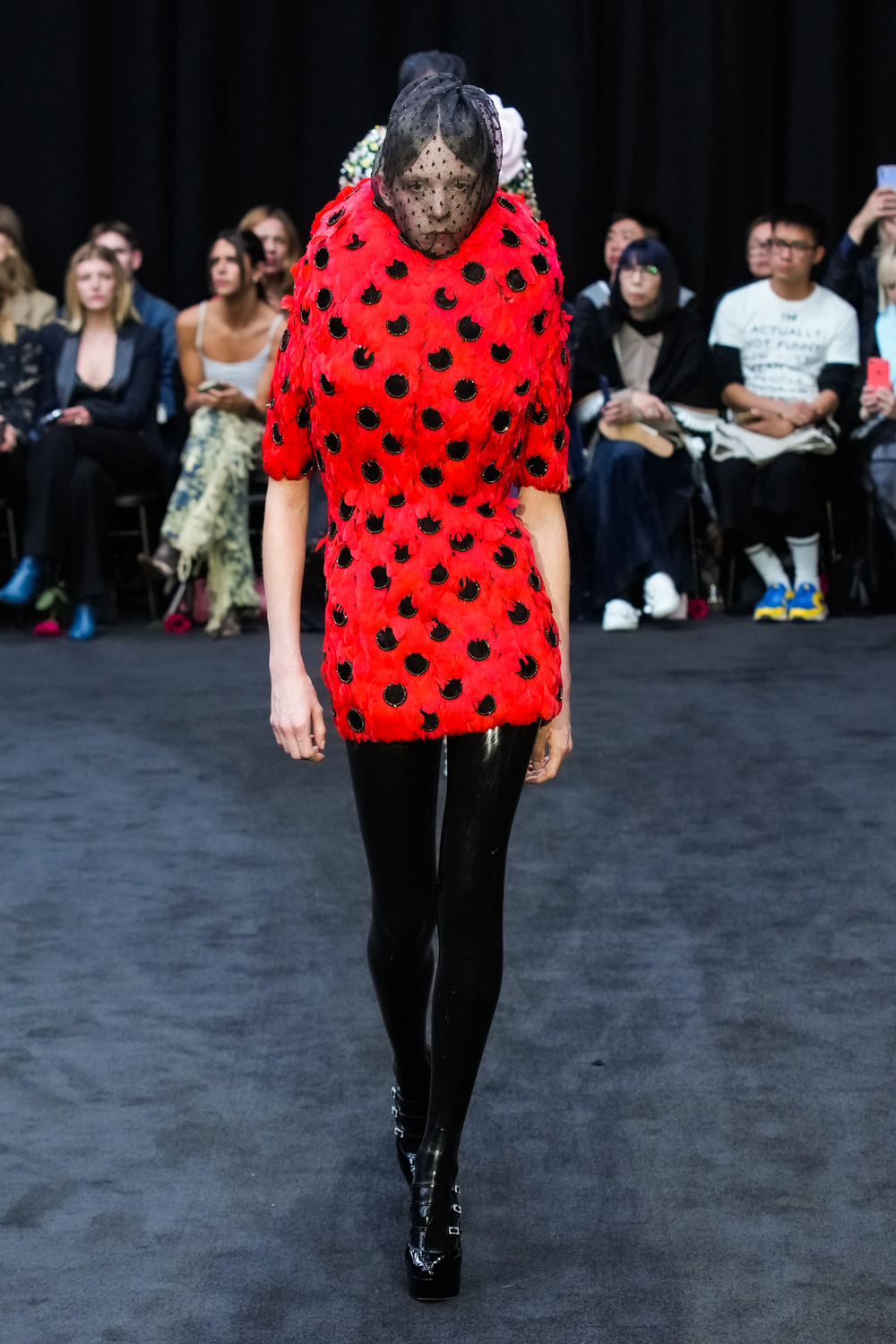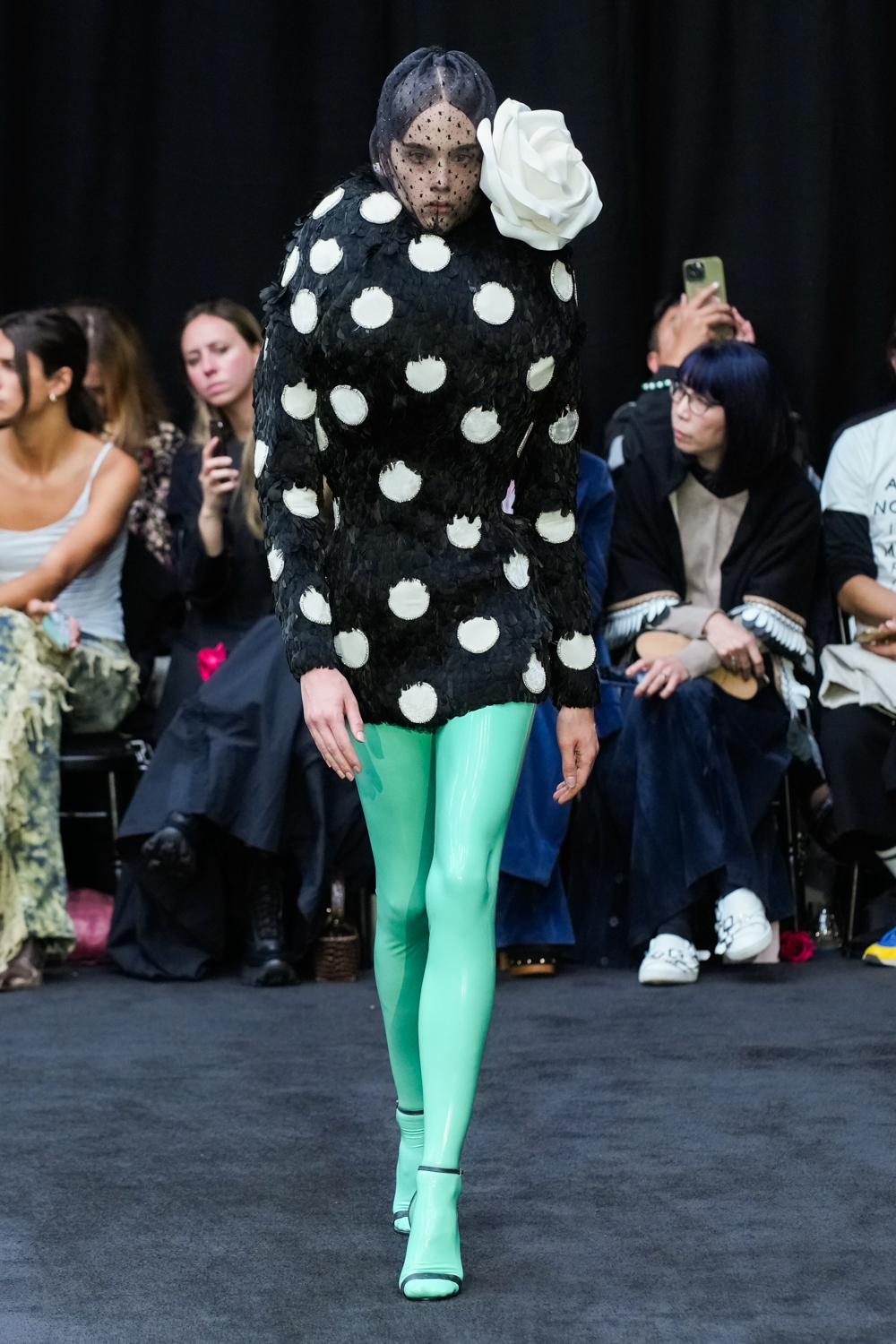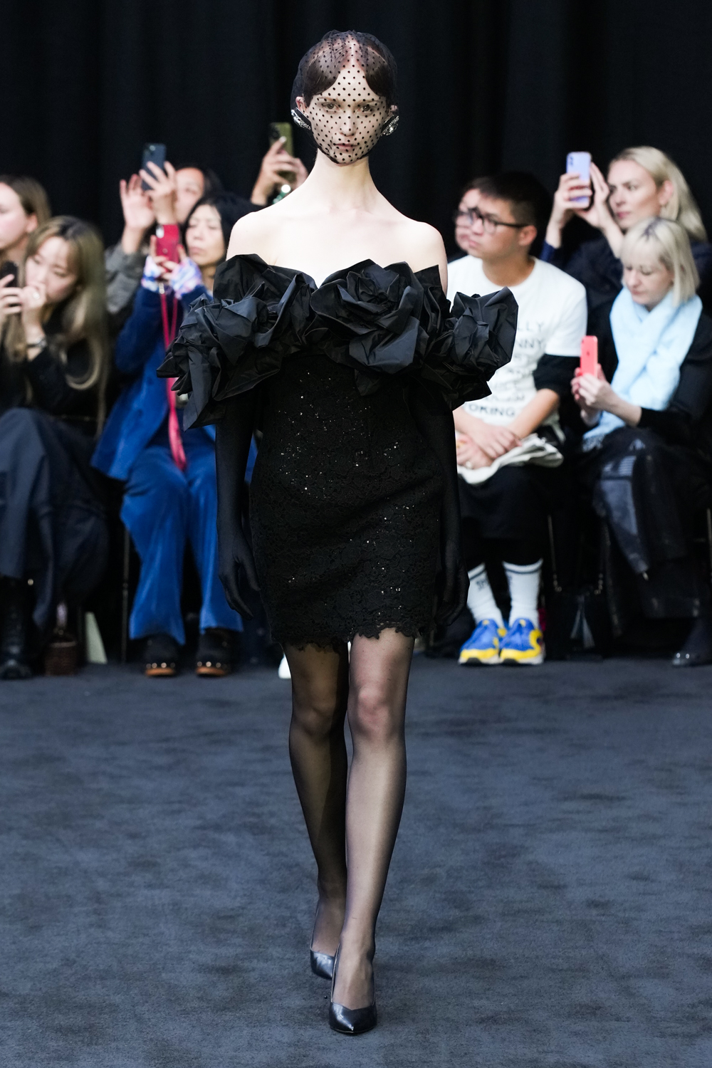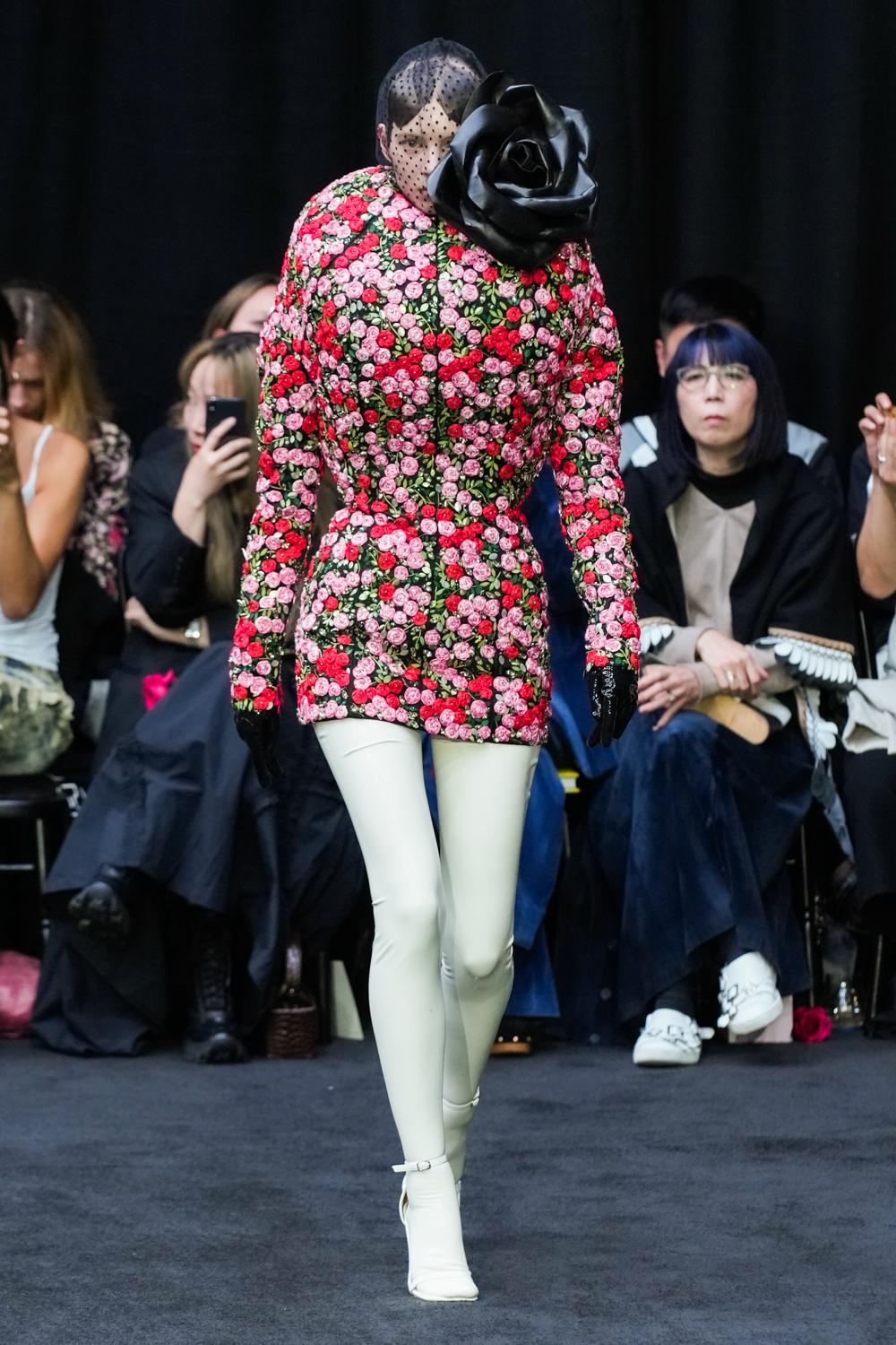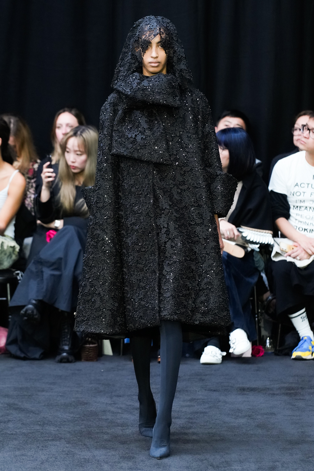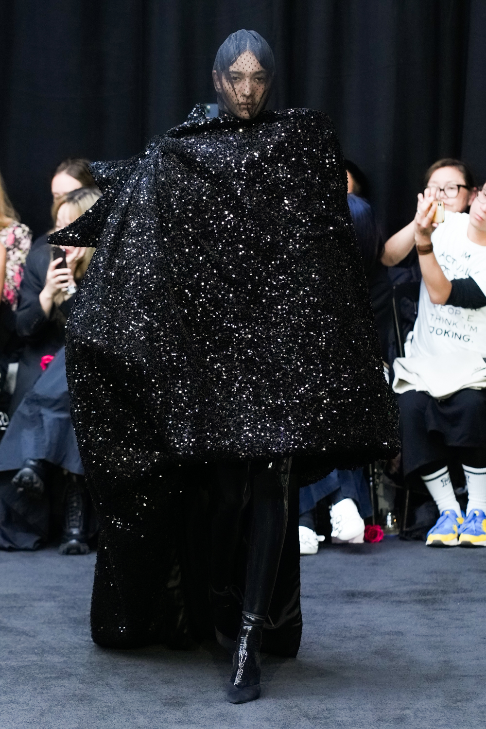 過去所有標誌式數碼印刷化為立體的黑色刺繡,甚至深受1952年佐治六世的葬禮上黑袍高級訂製所啟發,不難看見 Richard Quinn 使出渾身解數打造出 Cristóbal Balenciaga 式的黑色輪廓、1950年代稱身正式禮服、lurex 巨大斗篷等元素。而所有模特兒都被精緻閃爍的黑色刺繡喱士所覆蓋,甚至出現黑色皇冠,一切都如時裝展筆記般:「Richard Quinn 將2023春夏系列獻給女王陛下,這位曾經以優雅和仁慈感動過的他和所有人的女王。」 因為設計師知道,自己的成功某程度上歸功於英女王,成為大家對 Richard Quinn 第一印象。