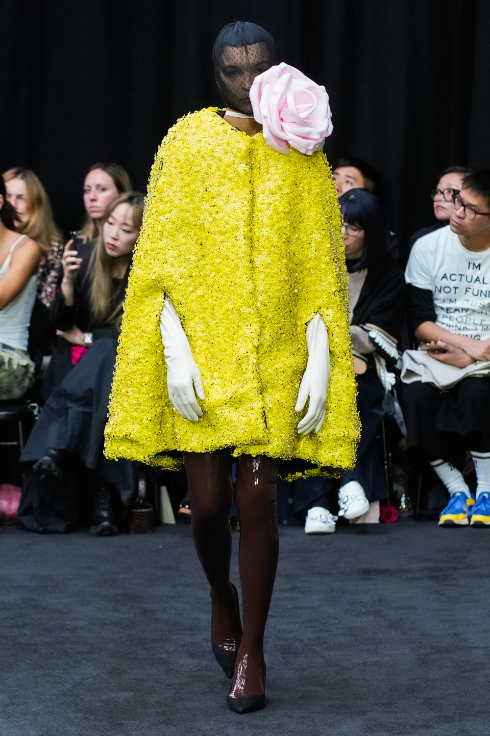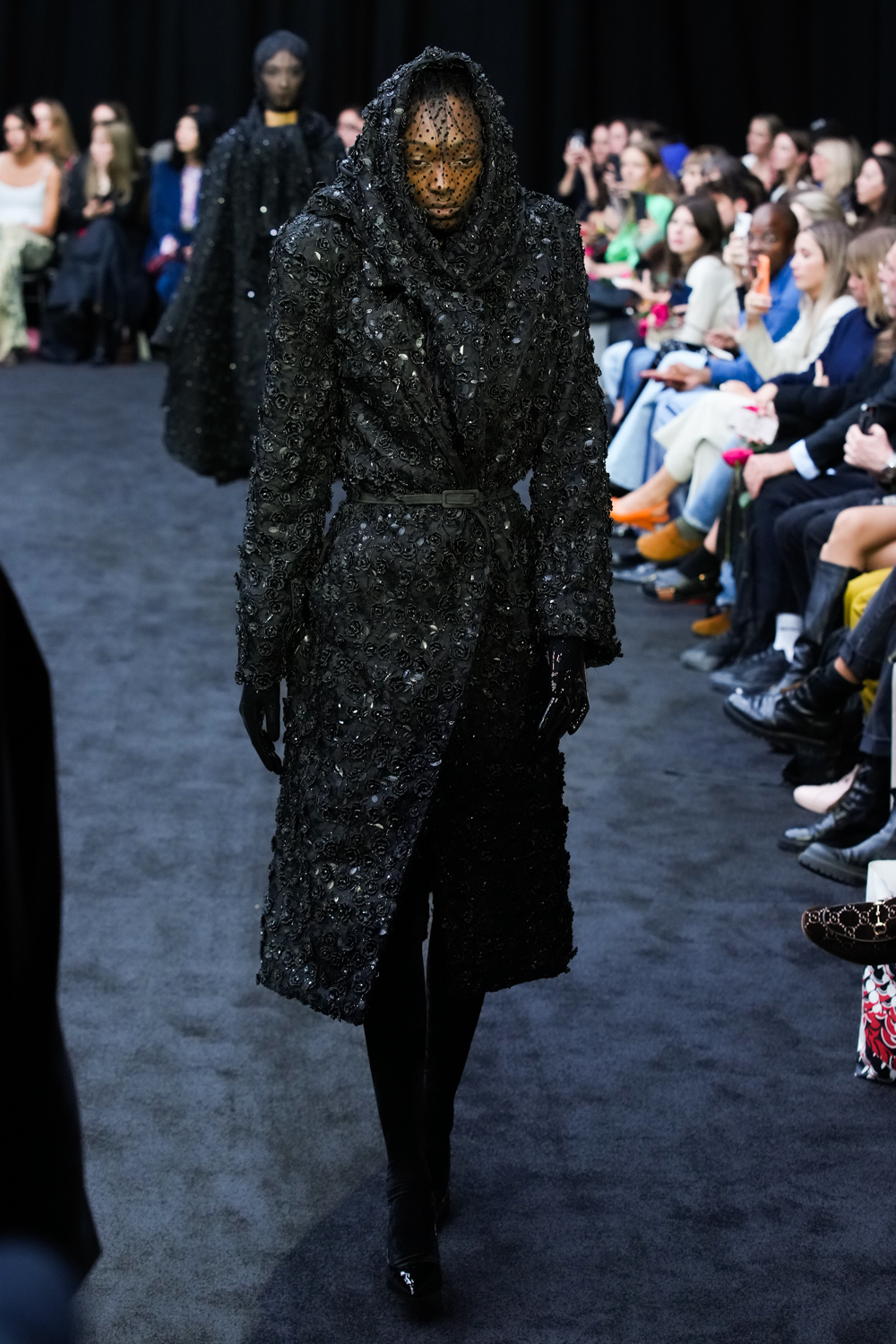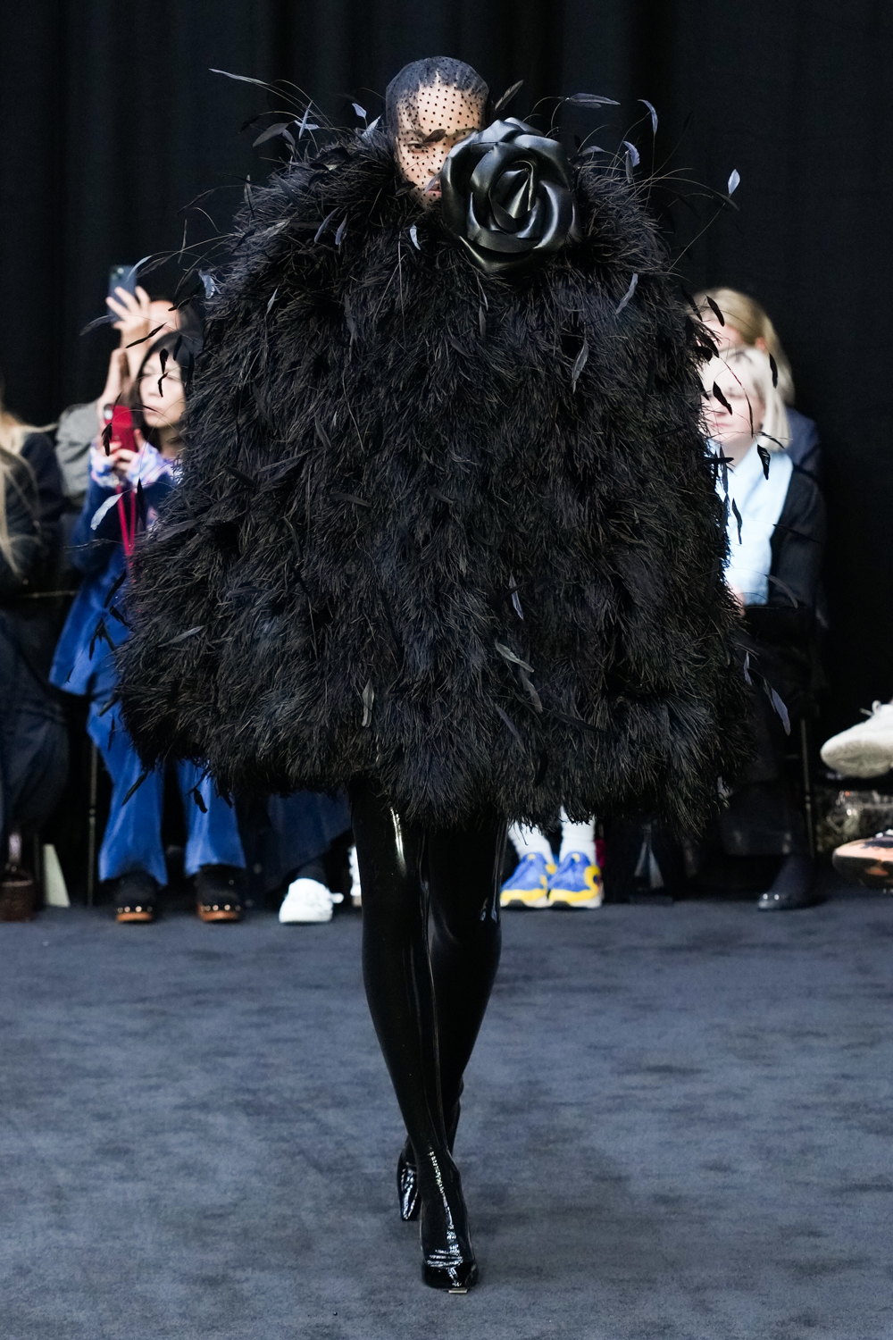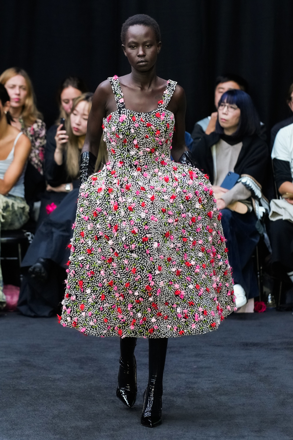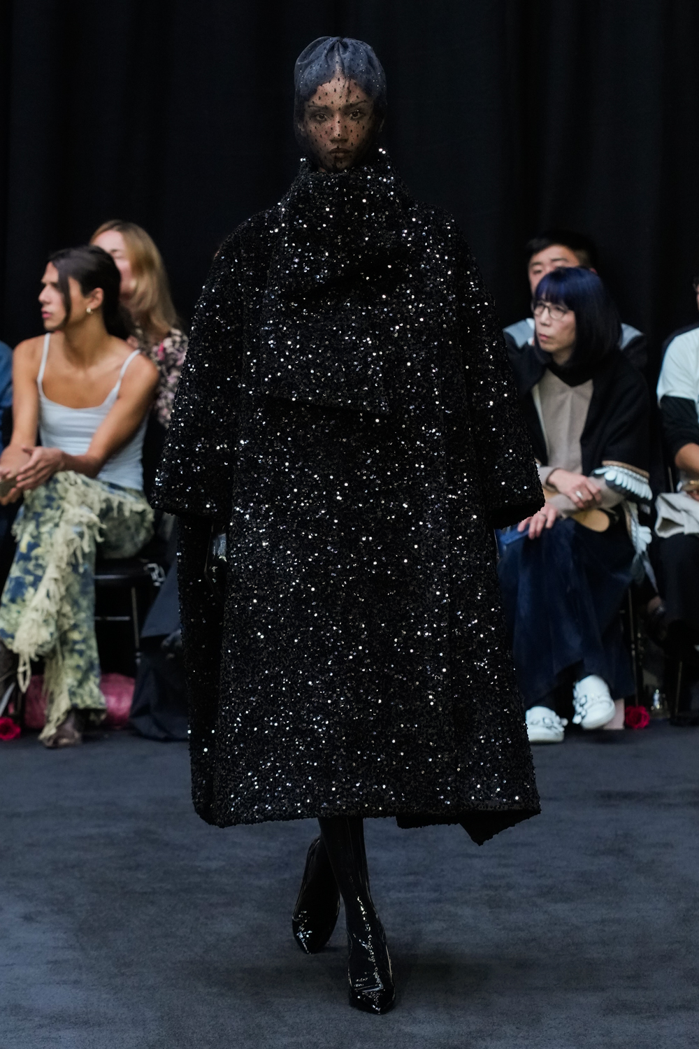 過去所有標誌式數碼印刷化為立體的黑色刺繡,甚至深受1952年佐治六世的葬禮上黑袍高級訂製所啟發,不難看見 Richard Quinn 使出渾身解數打造出 Cristóbal Balenciaga 式的黑色輪廓、1950年代稱身正式禮服、lurex 巨大斗篷等元素。而所有模特兒都被精緻閃爍的黑色刺繡喱士所覆蓋,甚至出現黑色皇冠,一切都如時裝展筆記般:「Richard Quinn 將2023春夏系列獻給女王陛下,這位曾經以優雅和仁慈感動過的他和所有人的女王。」 因為設計師知道,自己的成功某程度上歸功於英女王,成為大家對 Richard Quinn 第一印象。