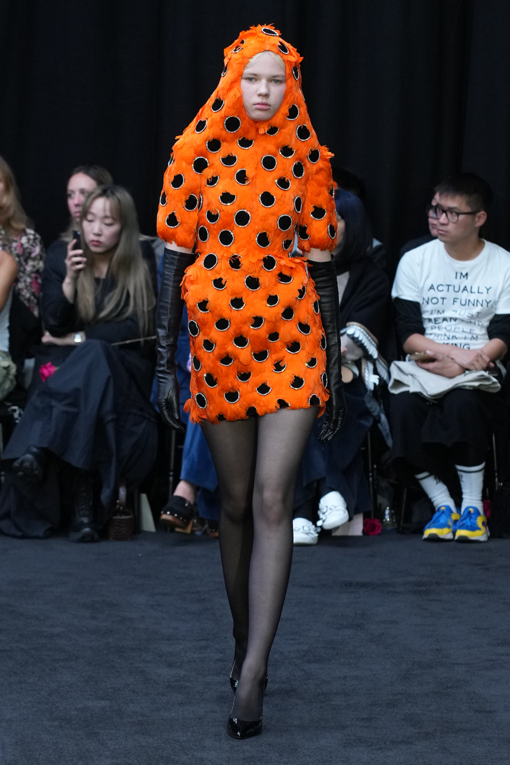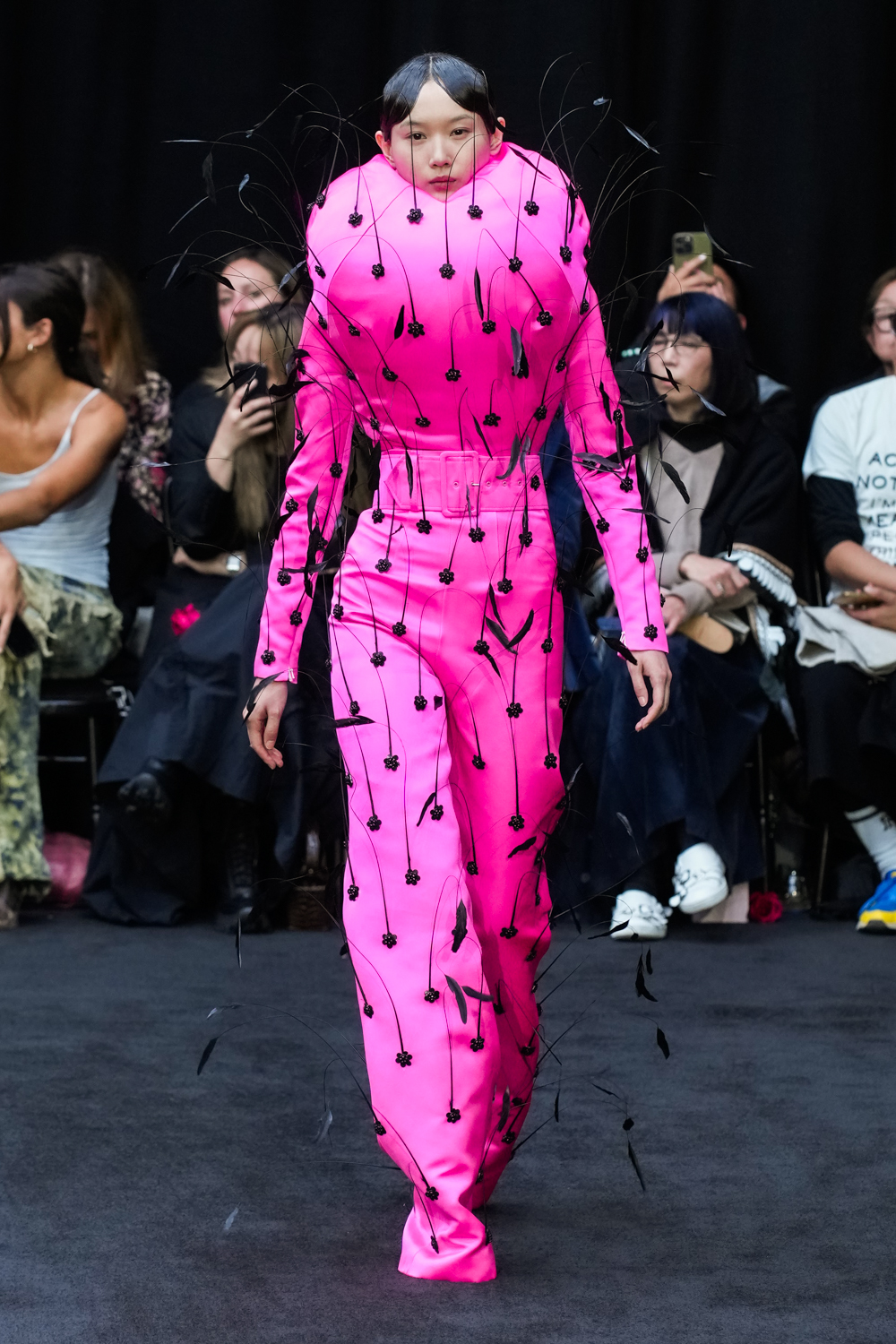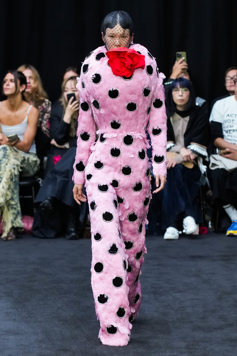 2023春夏系列的第二部分,則是回歸了 Richard Quinn 的標誌式 Disco 色調和俏皮的花紋圖案。今次靈感來自於太空和科幻元素,設計師在繭狀連衣裙中跳脫出來,加入根根分明的羽毛配飾,或是毛絨的粉紅色波點,打造出讓人意想不到的太空服裝。而模特兒頸部更有一朵如人頭般大小的花朵,感覺就像是行走的花瓶般供人遠觀,保留品牌一貫戲劇性的風格。