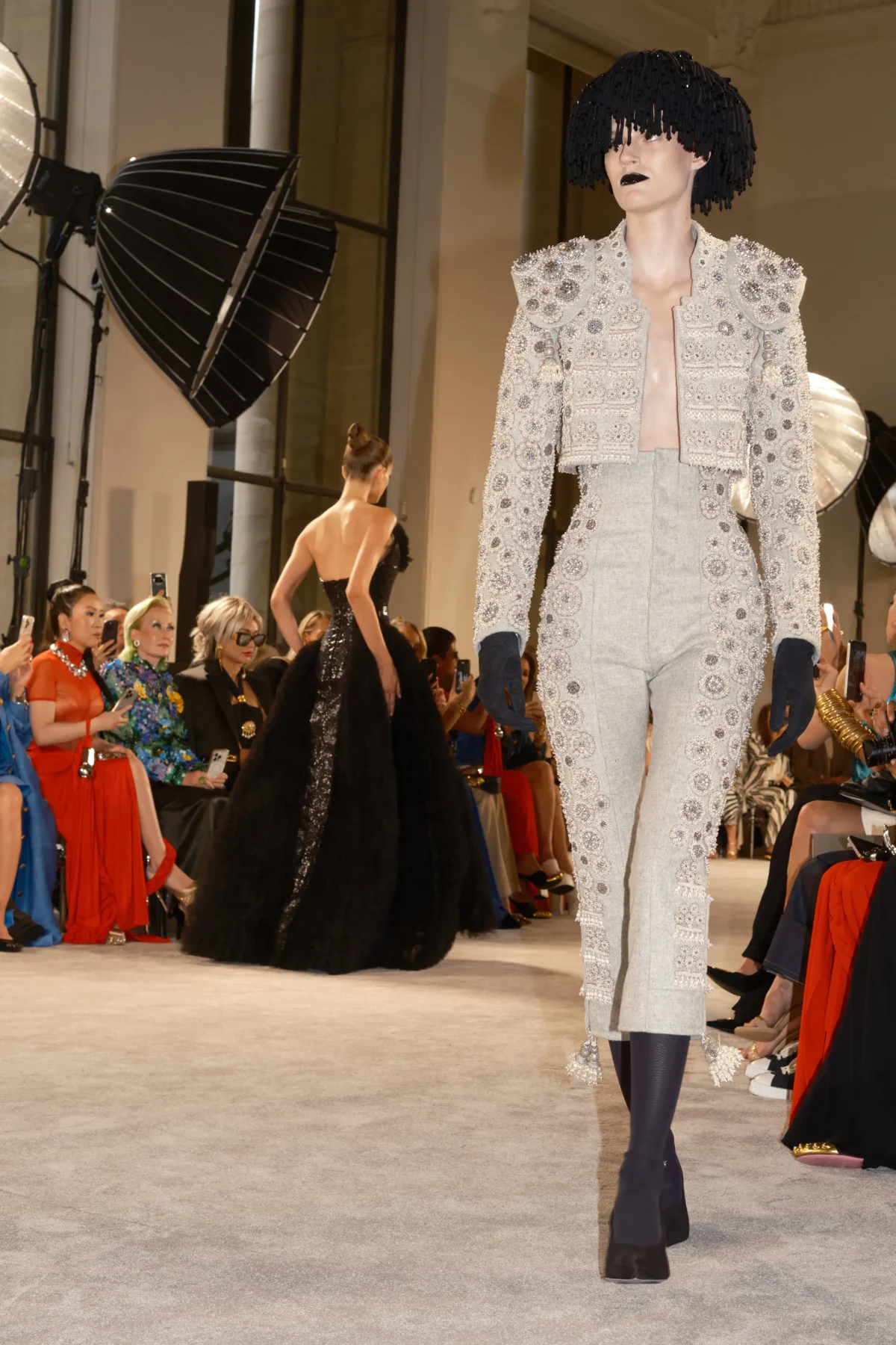 Roseberry今次還減少採用束腰設計。有時候,華麗的視覺元素會轟炸我們的視線,壓制了我們對於細節和工藝的欣賞。但這次並非如此,Roseberry從黑暗中創造出一些令人驚嘆的色彩效果:黑色薄紗讓濃密Donegal粗花呢裙裝的表面變得柔和,一套黑色圓點量身訂製的西裝,近看時竟是半透明設計。