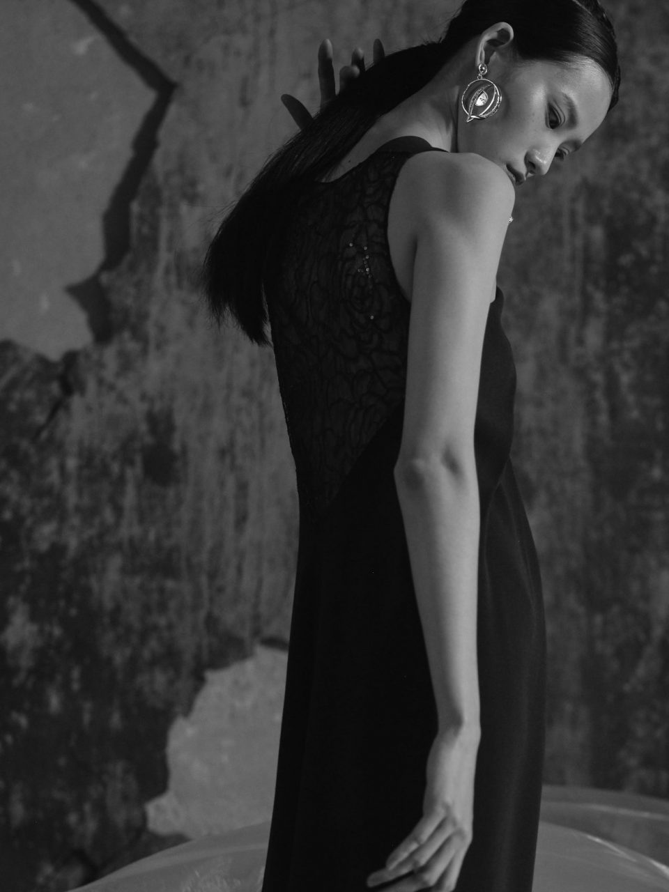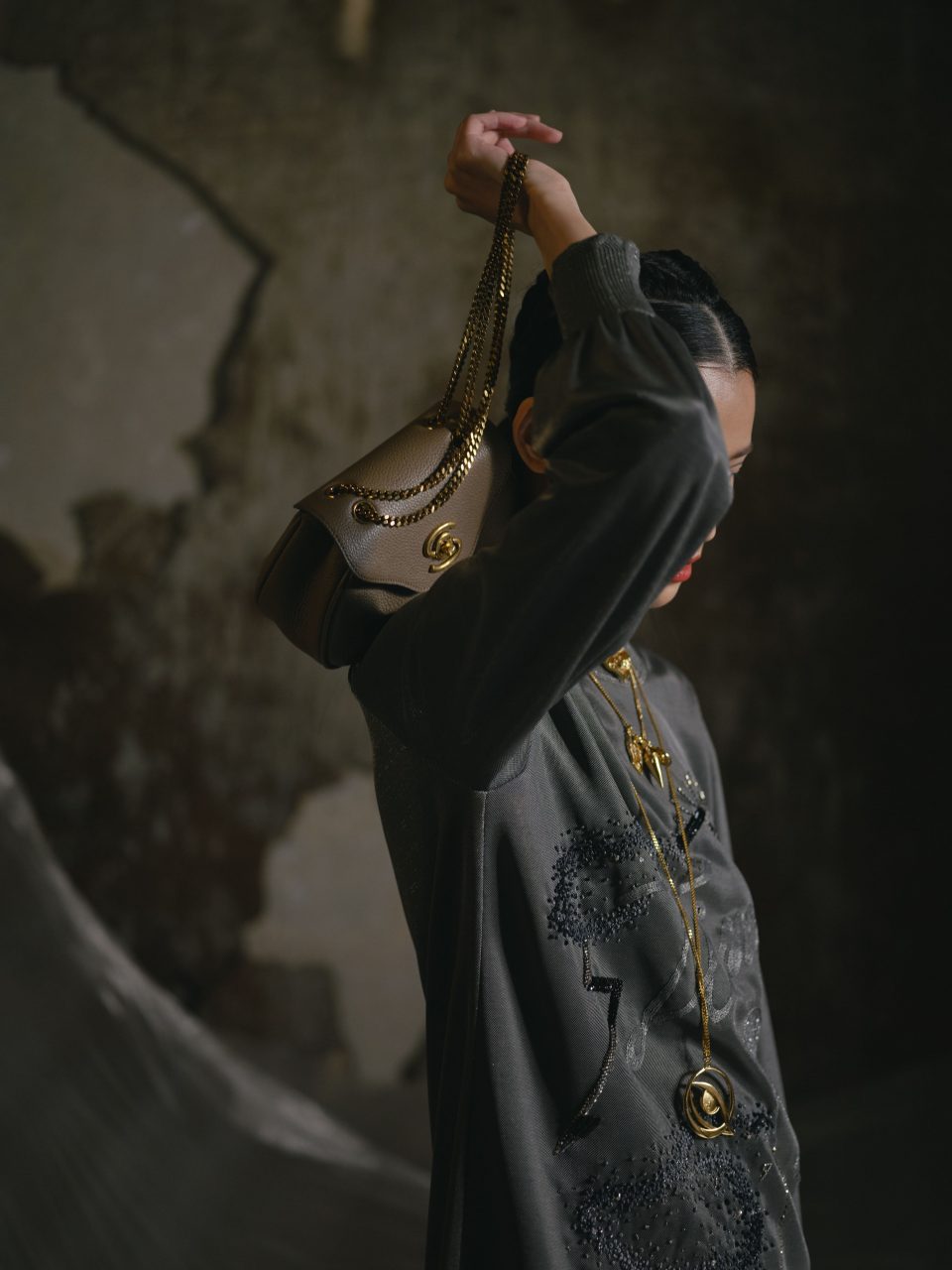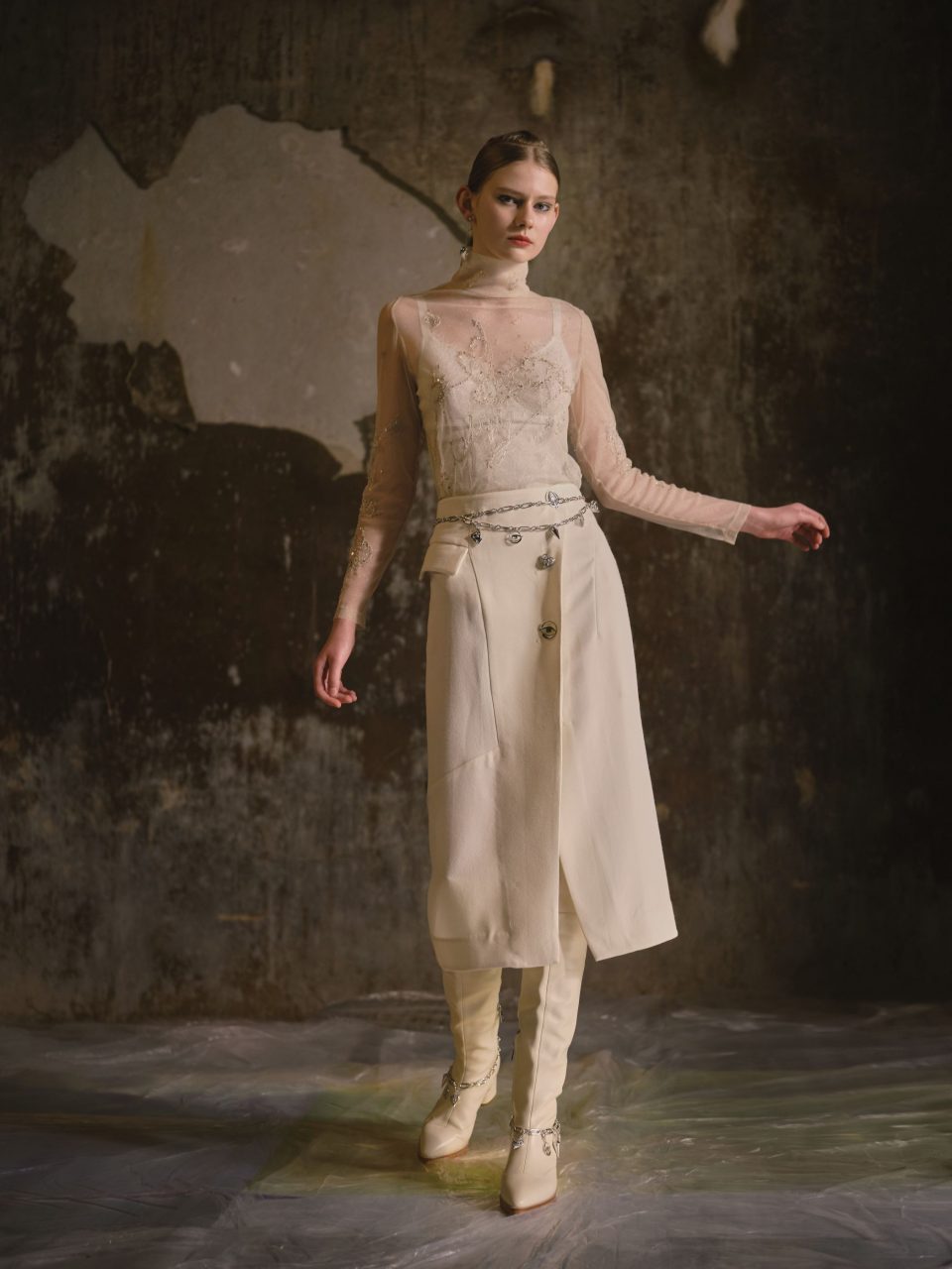 當中大量的超現實符碼以燒花、緹花、彩繪、刺繡等表現,織出富有年輕氣息的圖案。 圖騰元素不僅於織品上展現,同時也以具象的形態於飾品上展露無遺; 如項鍊、不對稱耳環、手鍊、腰鍊等,服裝上秉持著品牌手工技藝的核心精神不再拘泥於傳統的中式印象,打破制式的框架,定義現代東方奢華。 值得一提的是,今季較多比例的褲裝以及窄版裙裝,呈現簡約俐落的中性風格。 如小羊皮五分褲的造型配上帥氣長靴,上身混搭男性襯衫,OVERSIZE尺寸的大衣,長版連帽休閒衫等, 再以蕾絲馬甲內搭背心、透膚網紗刺繡上衣,金屬綴飾頸鏈及腰鍊,組合成剛柔並存的女性化的風貌;更重要的是,這些服裝設計耐看而實穿,符合當下重視細水長流的穿搭風格。