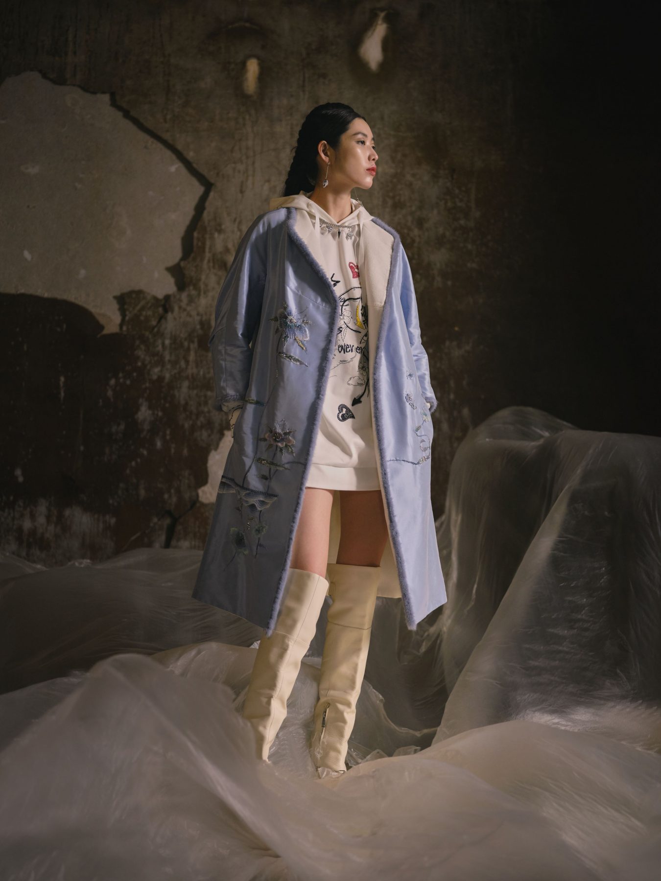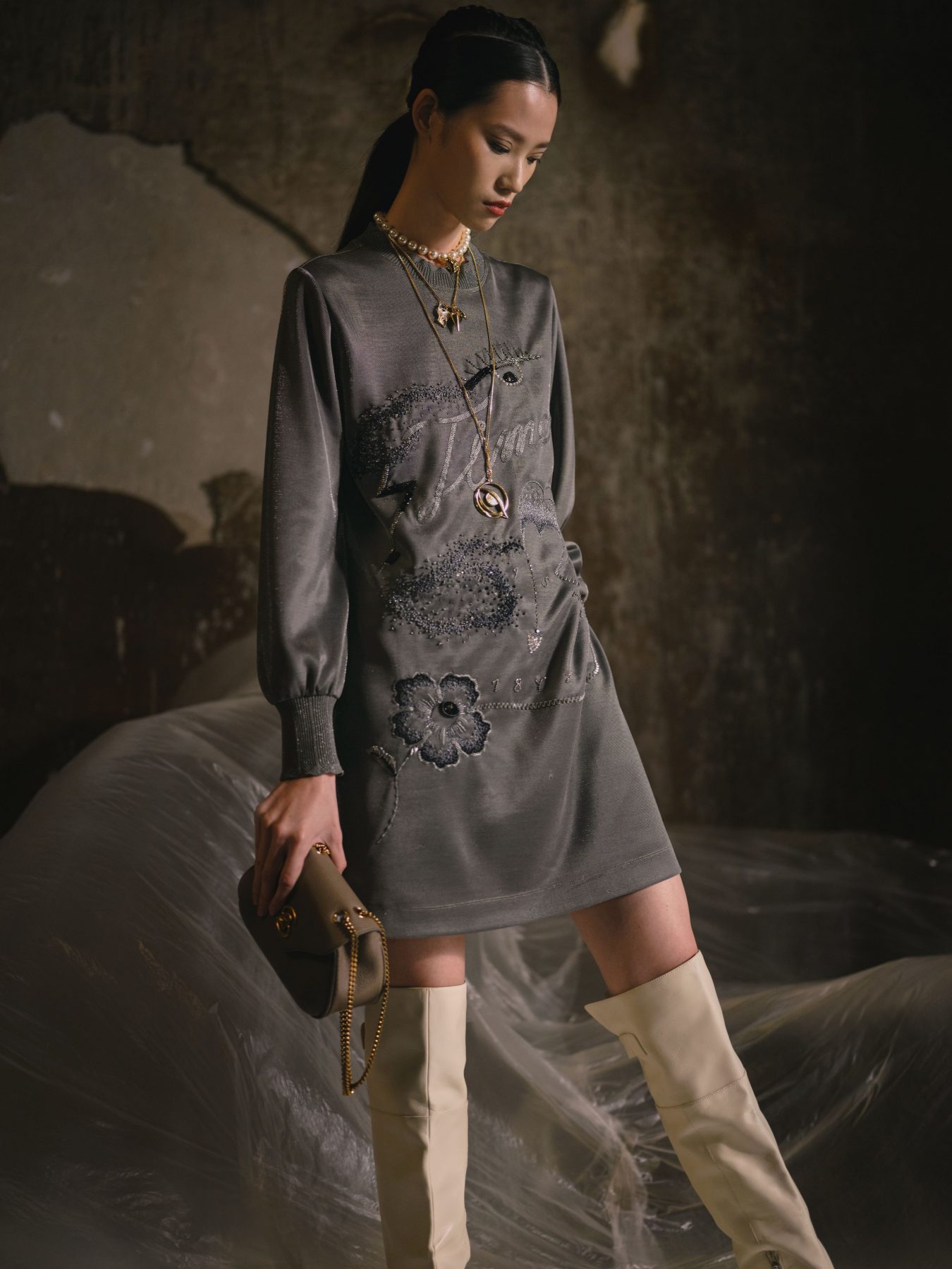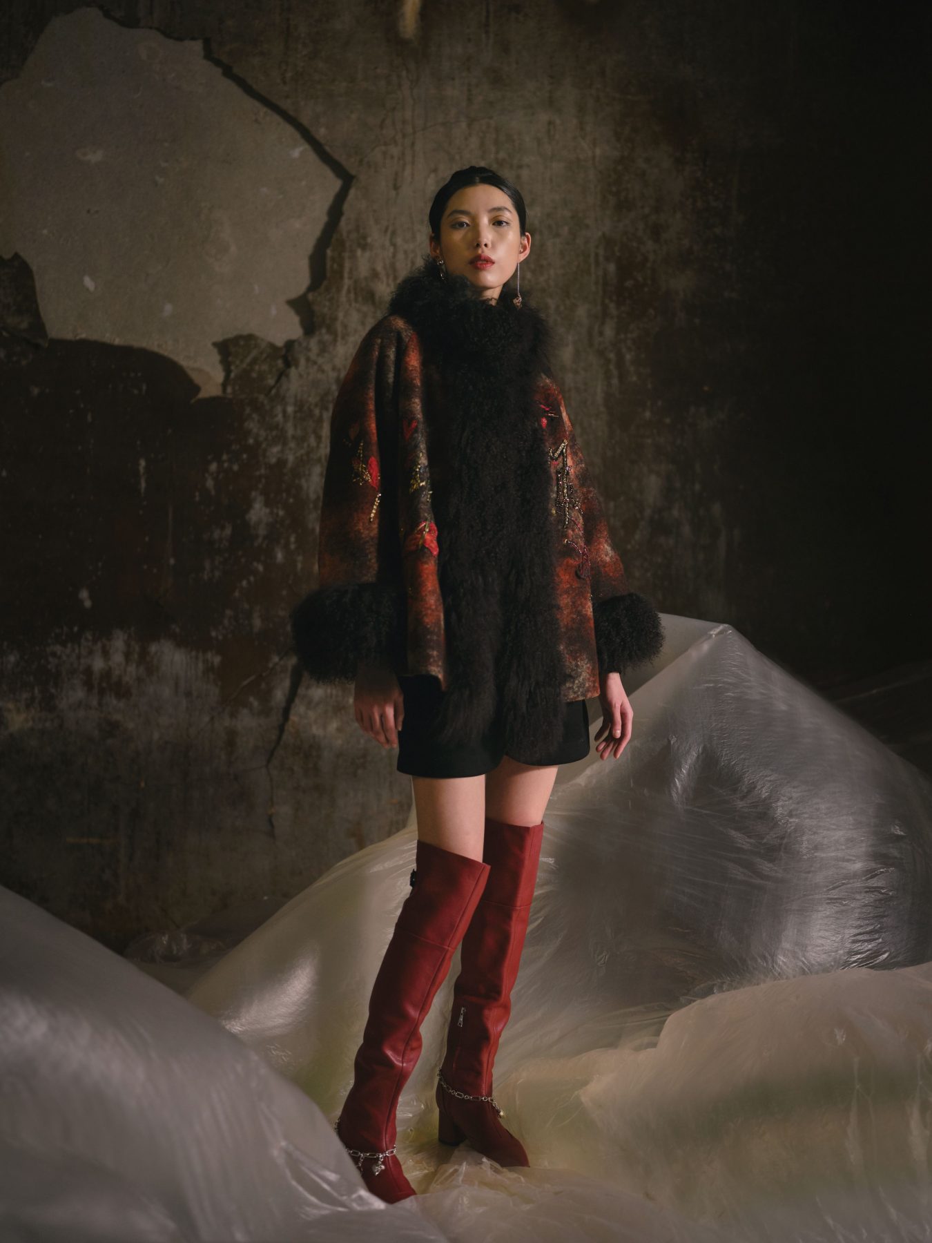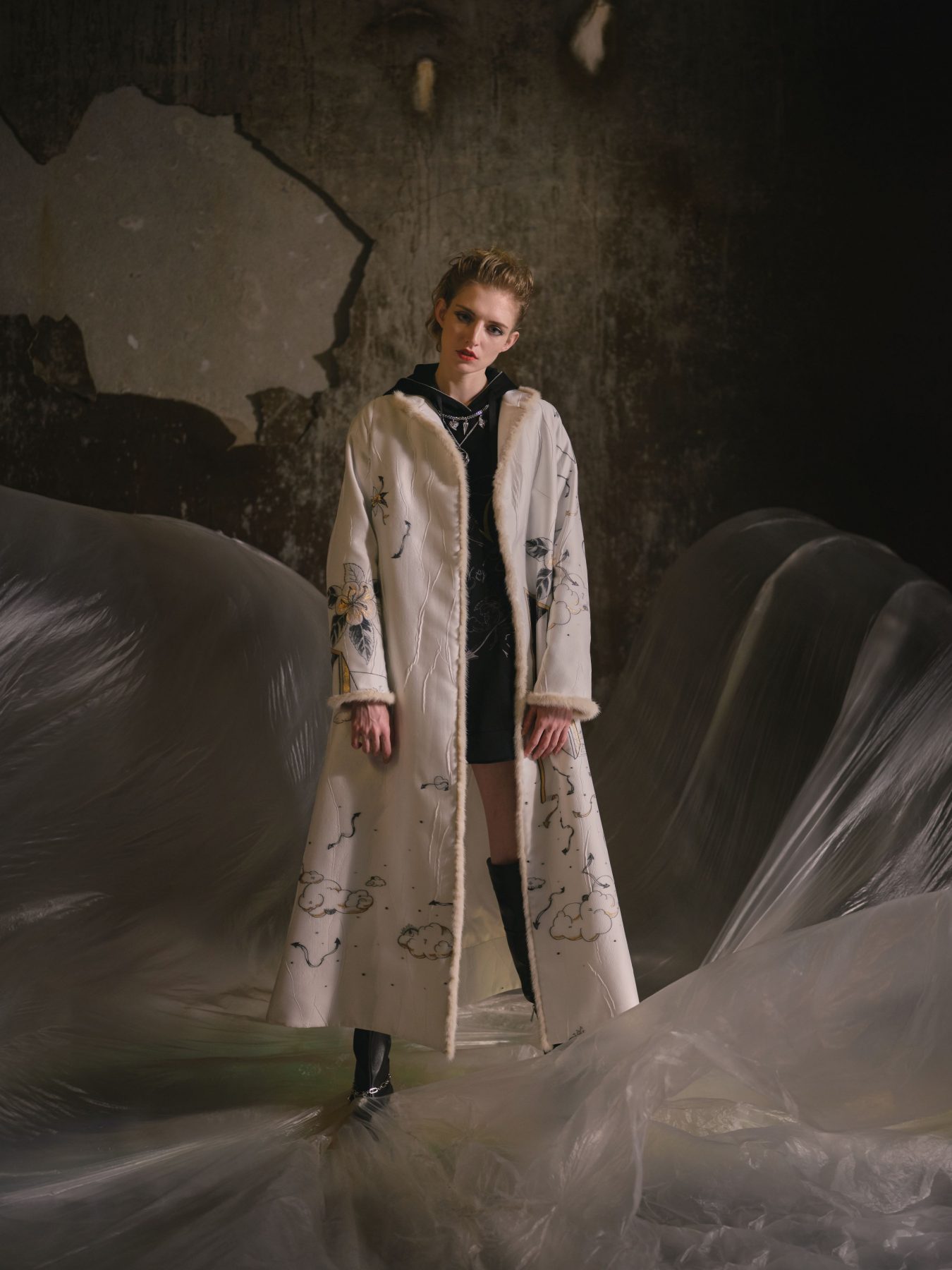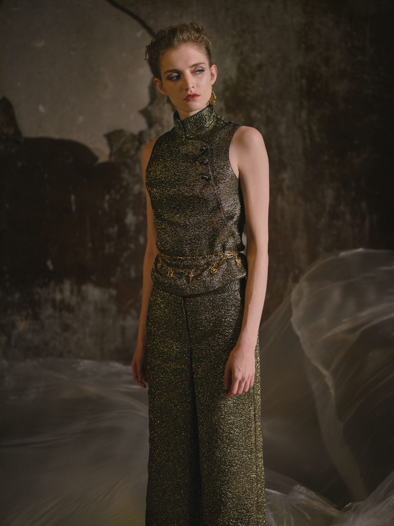 當中大量的超現實符碼以燒花、緹花、彩繪、刺繡等表現,織出富有年輕氣息的圖案。 圖騰元素不僅於織品上展現,同時也以具象的形態於飾品上展露無遺; 如項鍊、不對稱耳環、手鍊、腰鍊等,服裝上秉持著品牌手工技藝的核心精神不再拘泥於傳統的中式印象,打破制式的框架,定義現代東方奢華。 值得一提的是,今季較多比例的褲裝以及窄版裙裝,呈現簡約俐落的中性風格。 如小羊皮五分褲的造型配上帥氣長靴,上身混搭男性襯衫,OVERSIZE尺寸的大衣,長版連帽休閒衫等, 再以蕾絲馬甲內搭背心、透膚網紗刺繡上衣,金屬綴飾頸鏈及腰鍊,組合成剛柔並存的女性化的風貌;更重要的是,這些服裝設計耐看而實穿,符合當下重視細水長流的穿搭風格。