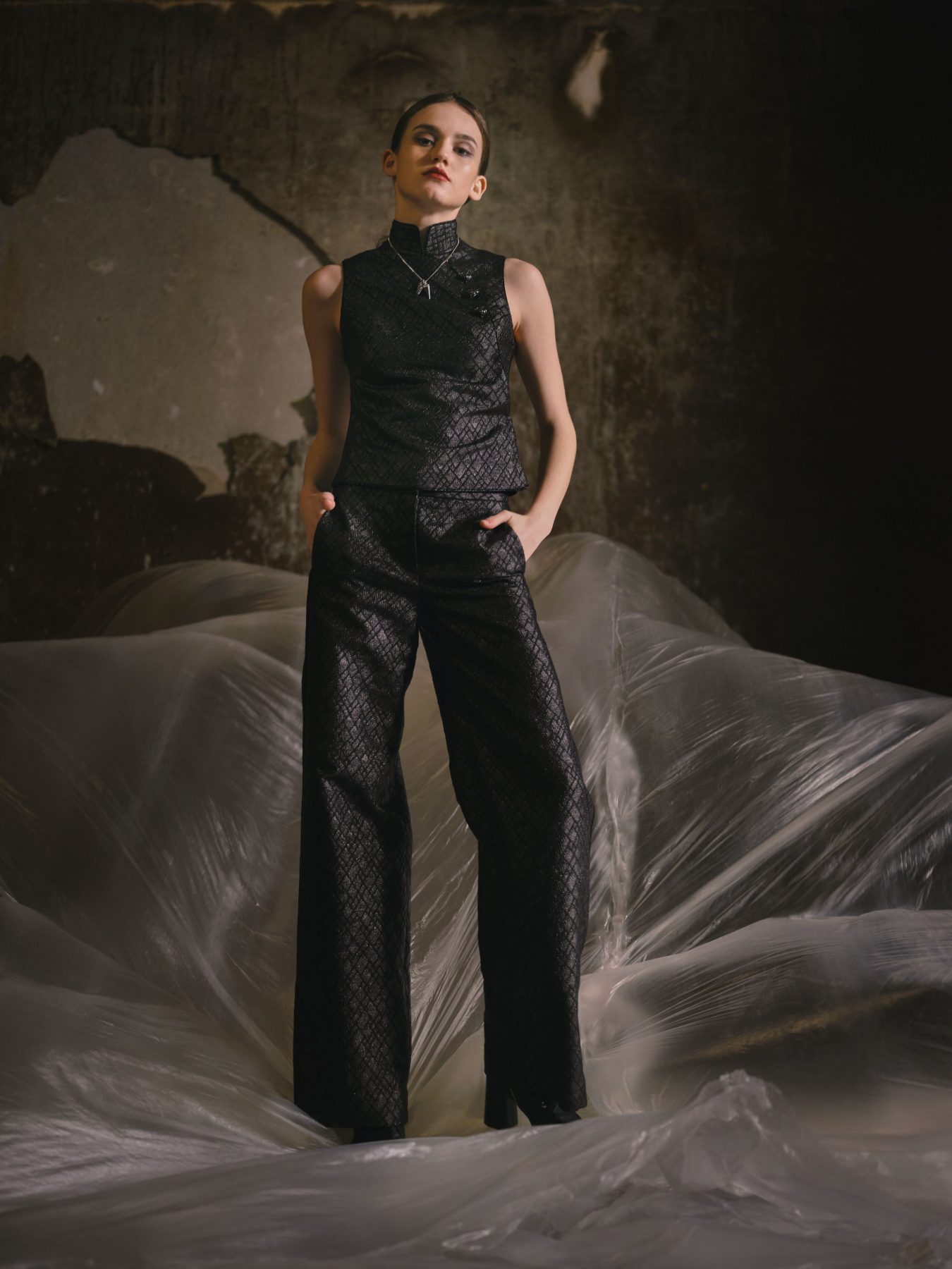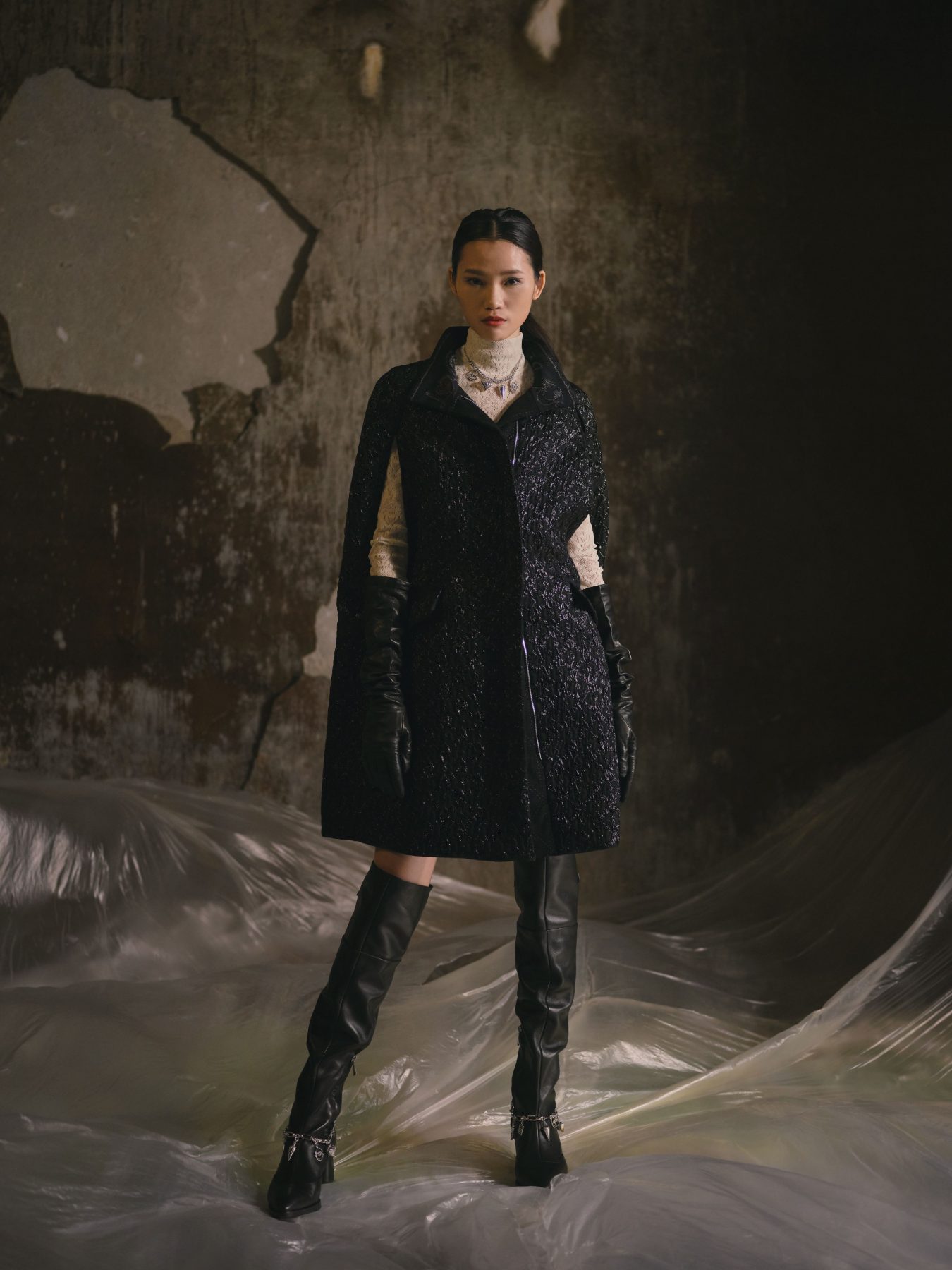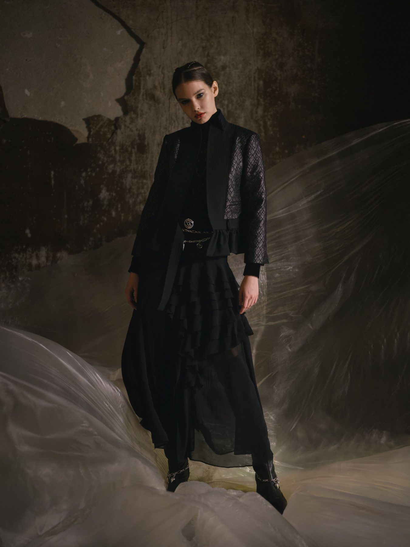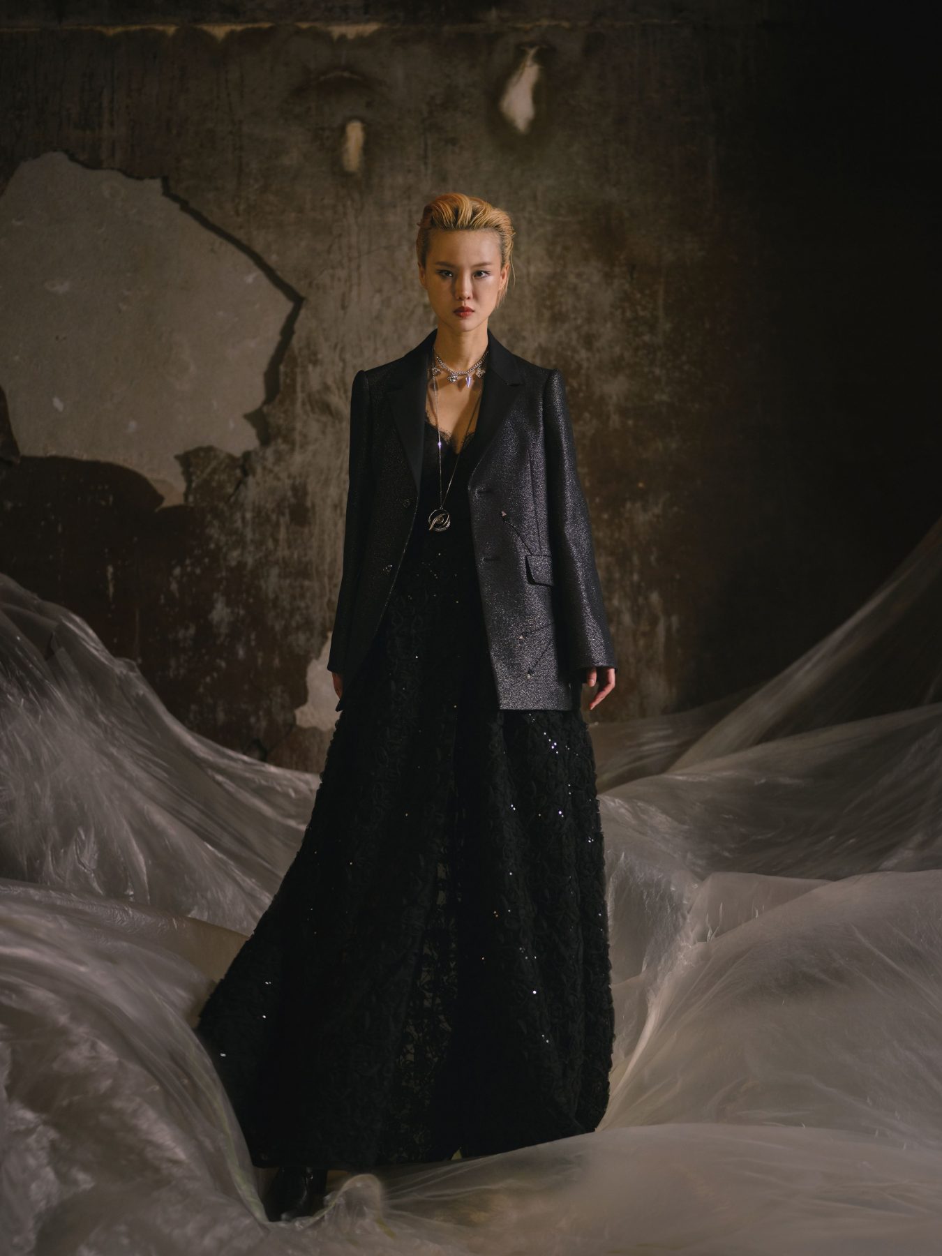 當中大量的超現實符碼以燒花、緹花、彩繪、刺繡等表現,織出富有年輕氣息的圖案。 圖騰元素不僅於織品上展現,同時也以具象的形態於飾品上展露無遺; 如項鍊、不對稱耳環、手鍊、腰鍊等,服裝上秉持著品牌手工技藝的核心精神不再拘泥於傳統的中式印象,打破制式的框架,定義現代東方奢華。 值得一提的是,今季較多比例的褲裝以及窄版裙裝,呈現簡約俐落的中性風格。 如小羊皮五分褲的造型配上帥氣長靴,上身混搭男性襯衫,OVERSIZE尺寸的大衣,長版連帽休閒衫等, 再以蕾絲馬甲內搭背心、透膚網紗刺繡上衣,金屬綴飾頸鏈及腰鍊,組合成剛柔並存的女性化的風貌;更重要的是,這些服裝設計耐看而實穿,符合當下重視細水長流的穿搭風格。
