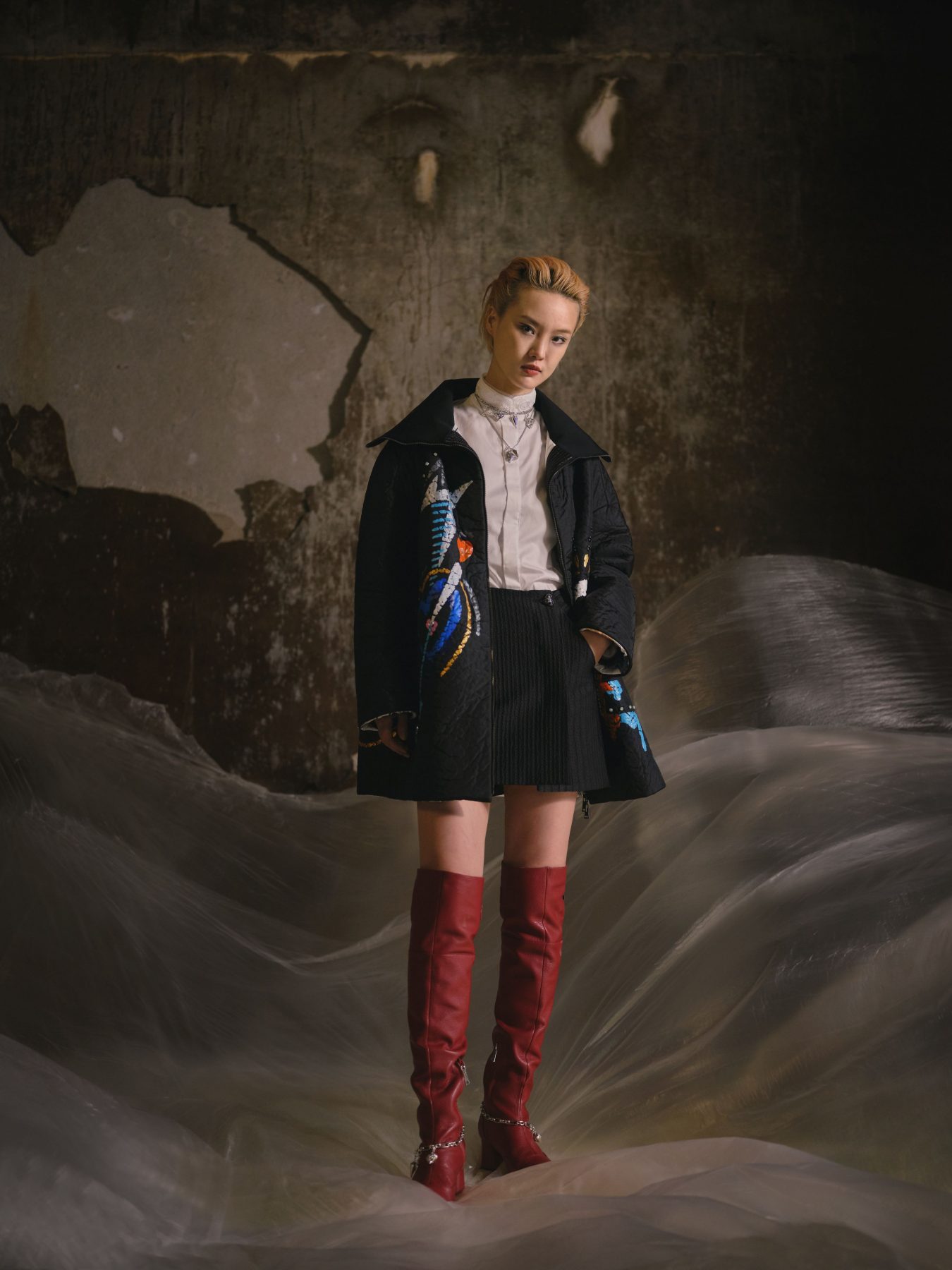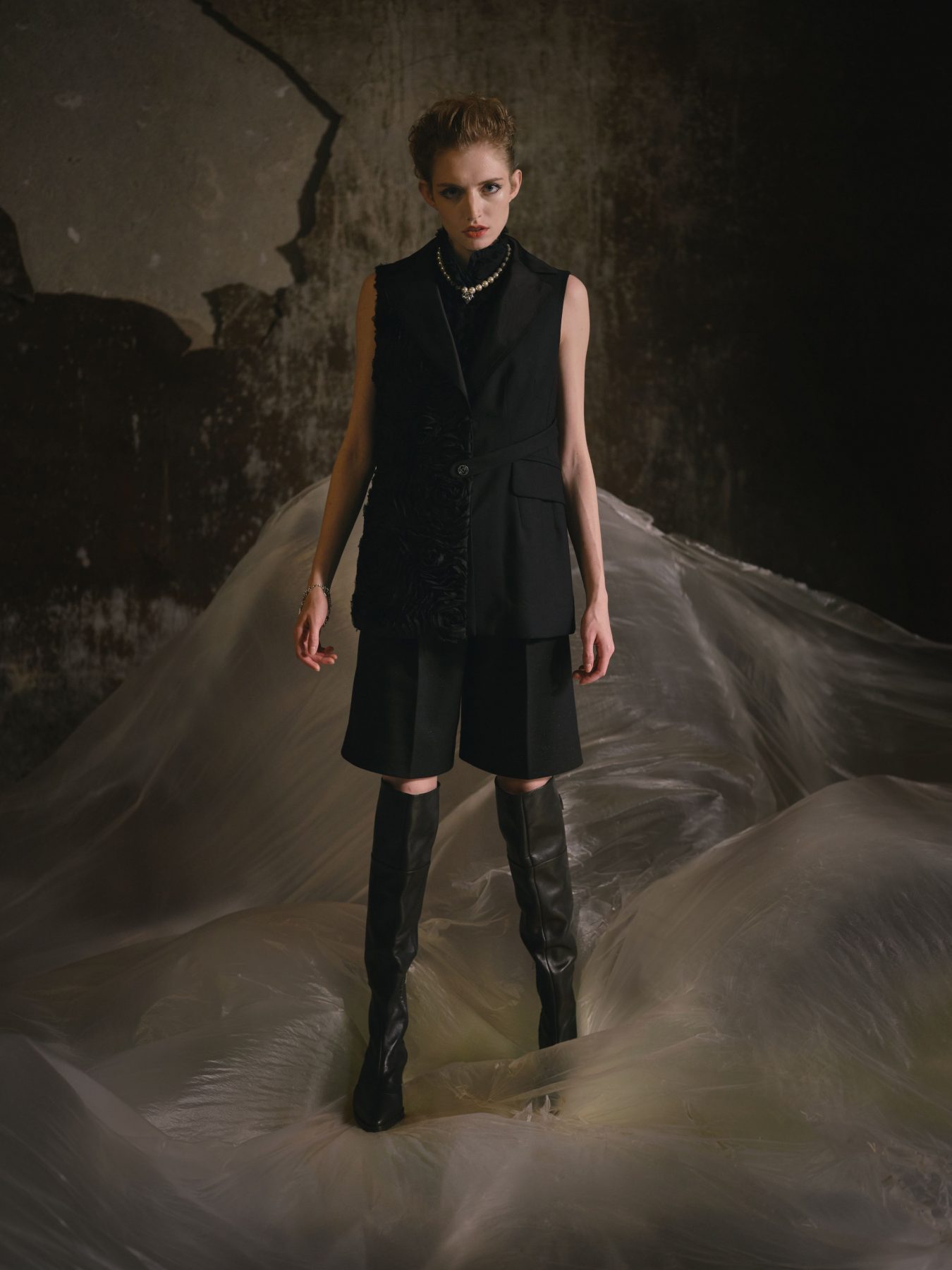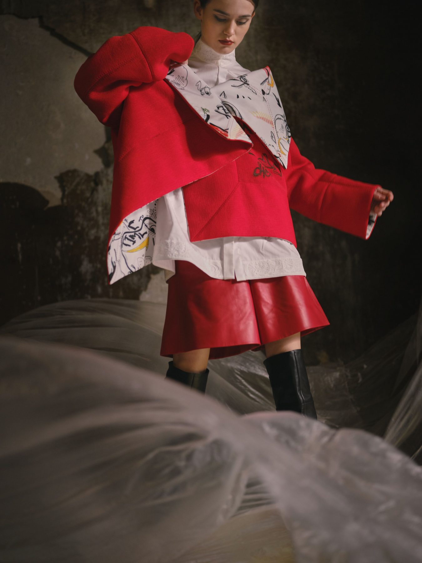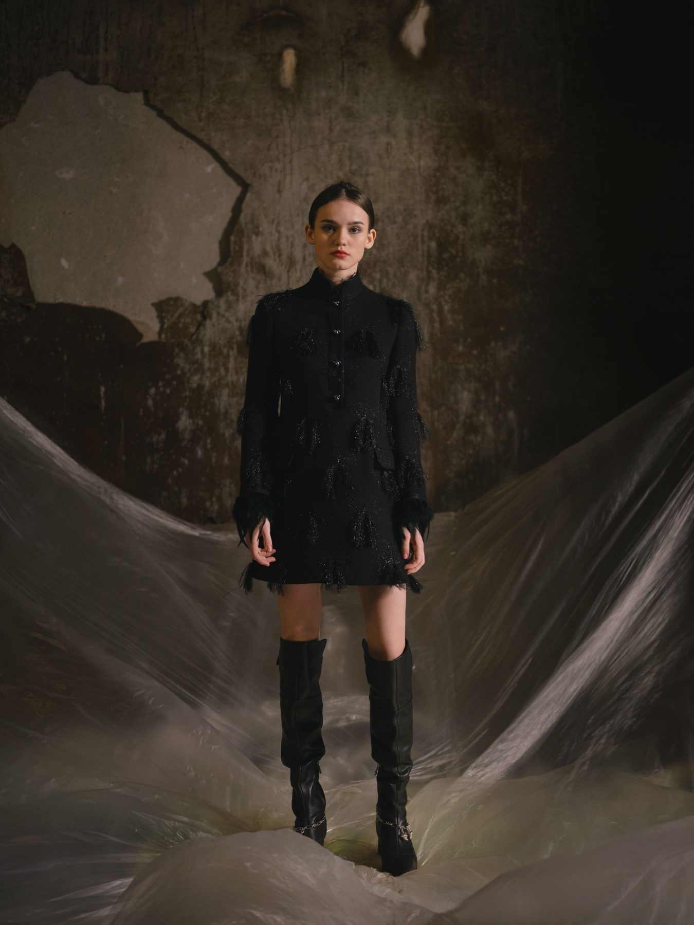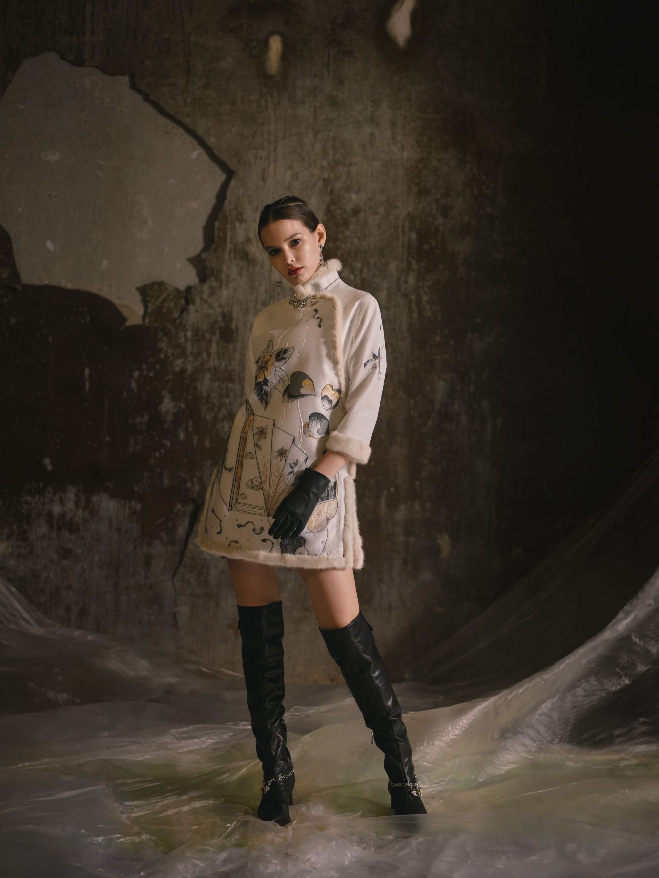 當中大量的超現實符碼以燒花、緹花、彩繪、刺繡等表現,織出富有年輕氣息的圖案。 圖騰元素不僅於織品上展現,同時也以具象的形態於飾品上展露無遺; 如項鍊、不對稱耳環、手鍊、腰鍊等,服裝上秉持著品牌手工技藝的核心精神不再拘泥於傳統的中式印象,打破制式的框架,定義現代東方奢華。 值得一提的是,今季較多比例的褲裝以及窄版裙裝,呈現簡約俐落的中性風格。 如小羊皮五分褲的造型配上帥氣長靴,上身混搭男性襯衫,OVERSIZE尺寸的大衣,長版連帽休閒衫等, 再以蕾絲馬甲內搭背心、透膚網紗刺繡上衣,金屬綴飾頸鏈及腰鍊,組合成剛柔並存的女性化的風貌;更重要的是,這些服裝設計耐看而實穿,符合當下重視細水長流的穿搭風格。