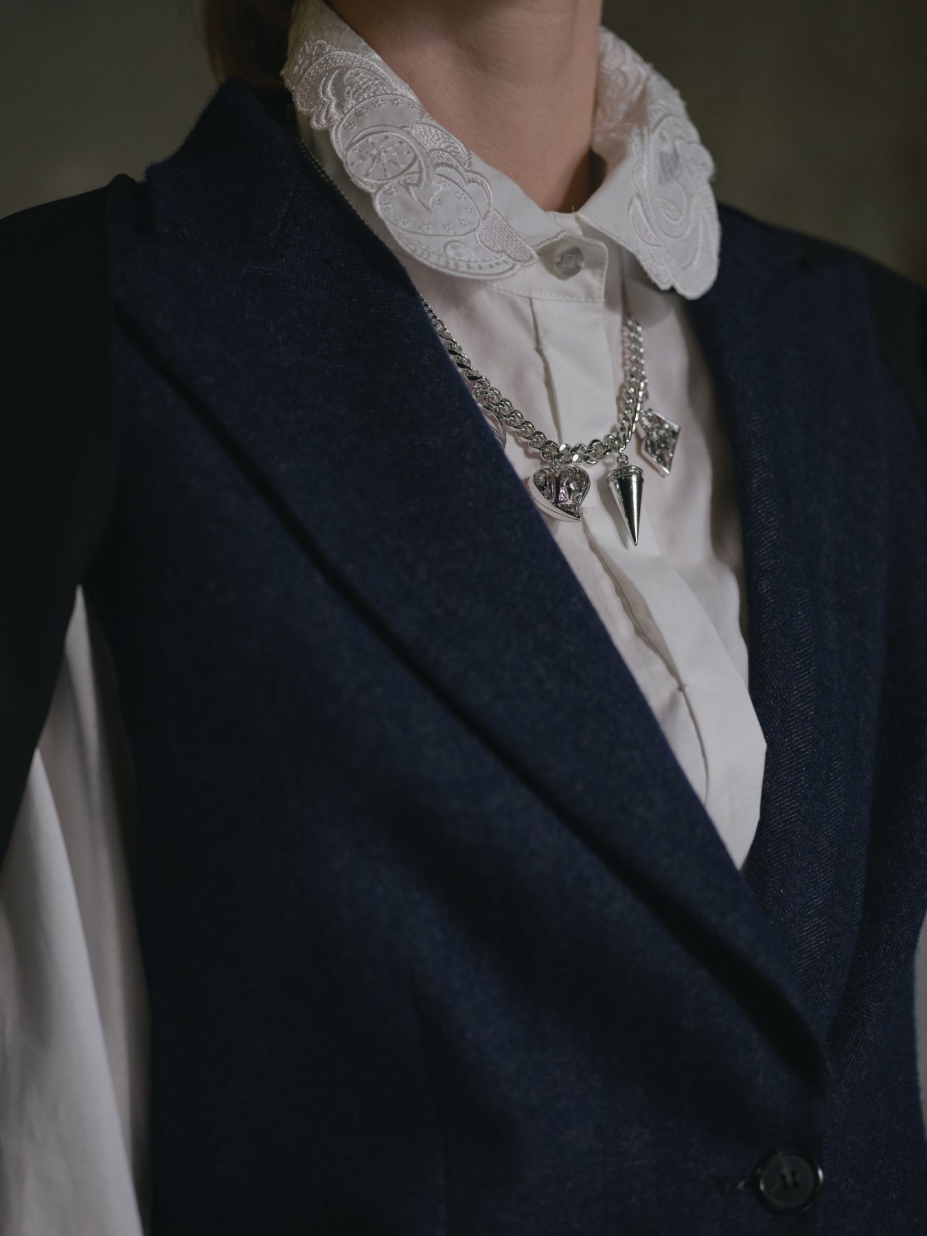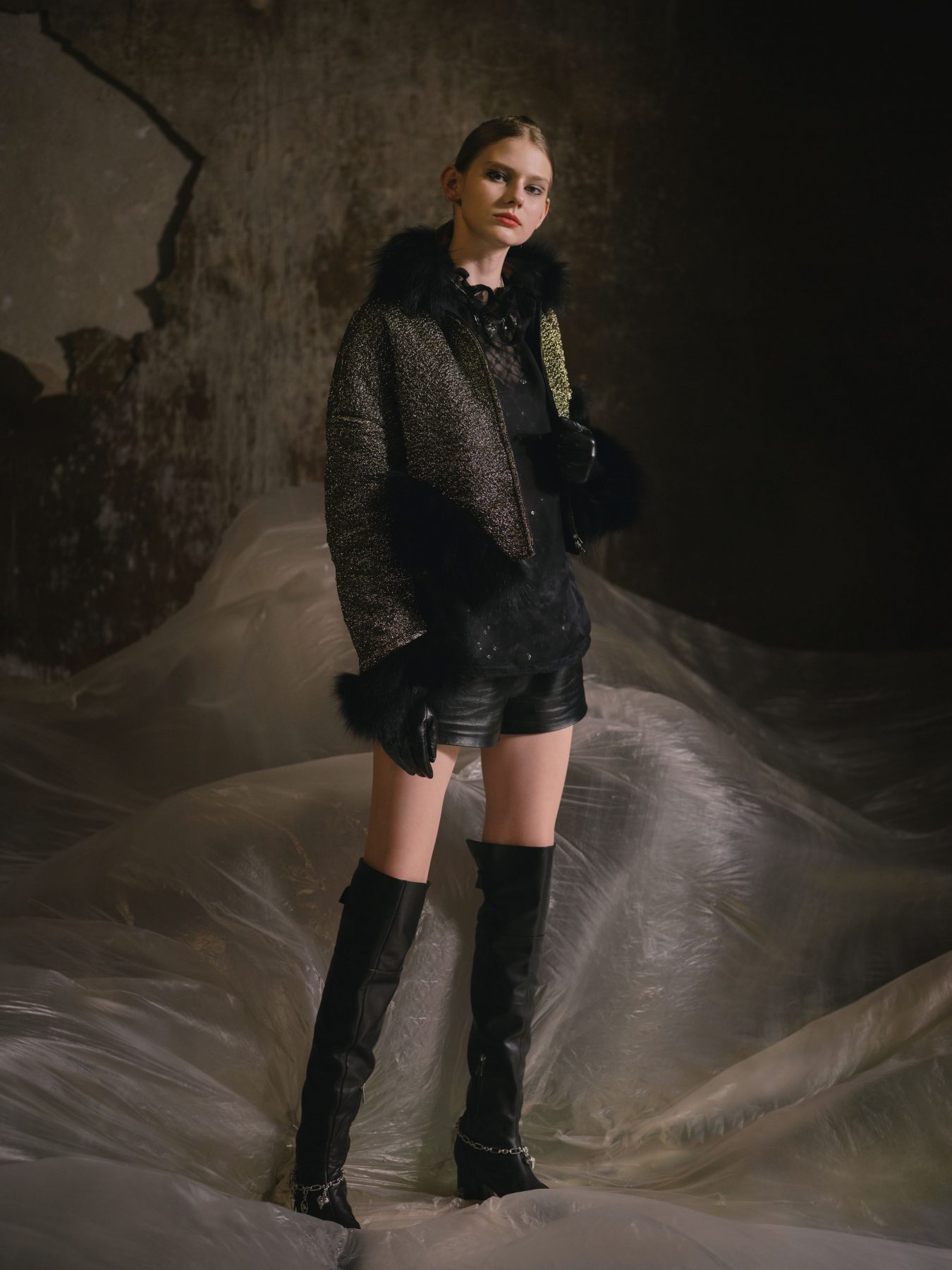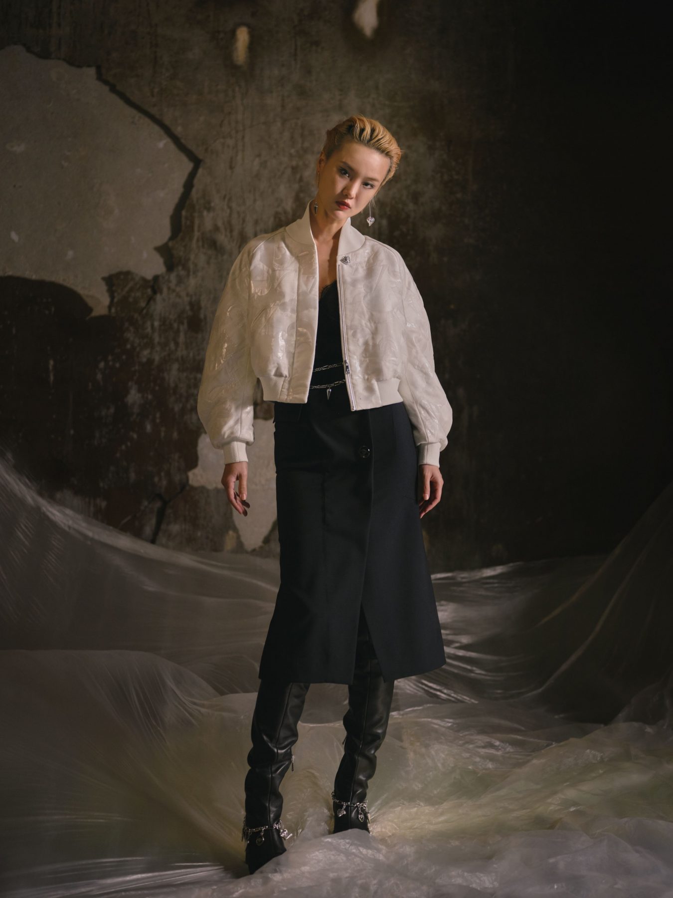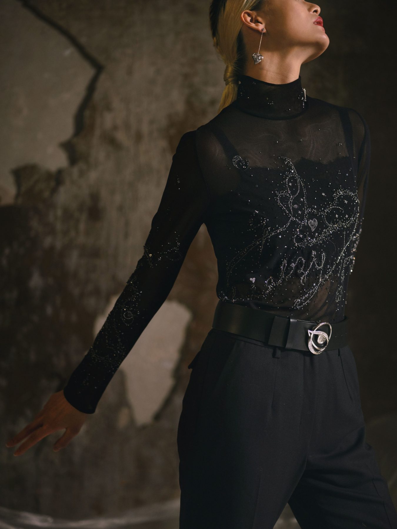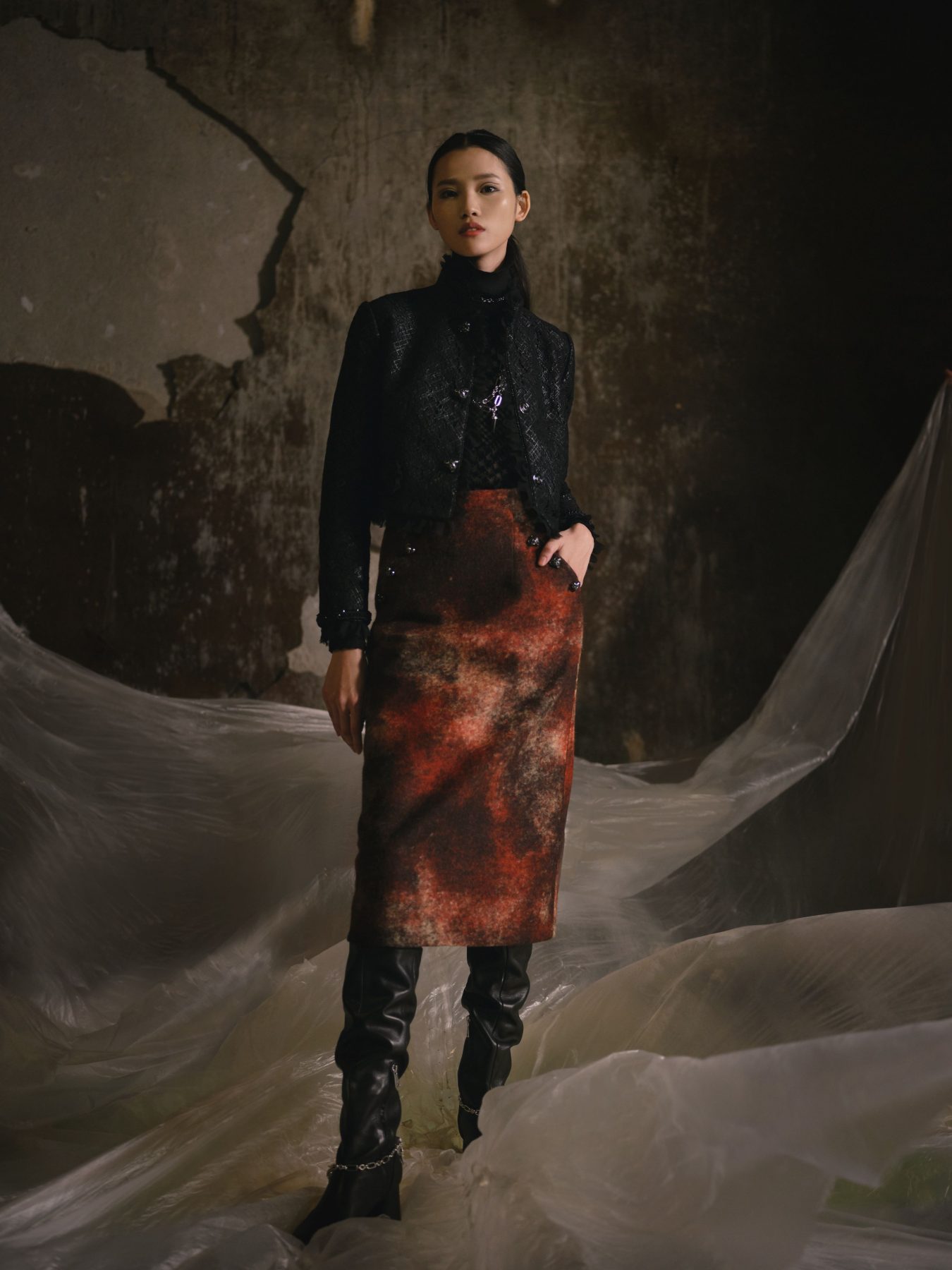 當中大量的超現實符碼以燒花、緹花、彩繪、刺繡等表現,織出富有年輕氣息的圖案。 圖騰元素不僅於織品上展現,同時也以具象的形態於飾品上展露無遺; 如項鍊、不對稱耳環、手鍊、腰鍊等,服裝上秉持著品牌手工技藝的核心精神不再拘泥於傳統的中式印象,打破制式的框架,定義現代東方奢華。 值得一提的是,今季較多比例的褲裝以及窄版裙裝,呈現簡約俐落的中性風格。 如小羊皮五分褲的造型配上帥氣長靴,上身混搭男性襯衫,OVERSIZE尺寸的大衣,長版連帽休閒衫等, 再以蕾絲馬甲內搭背心、透膚網紗刺繡上衣,金屬綴飾頸鏈及腰鍊,組合成剛柔並存的女性化的風貌;更重要的是,這些服裝設計耐看而實穿,符合當下重視細水長流的穿搭風格。