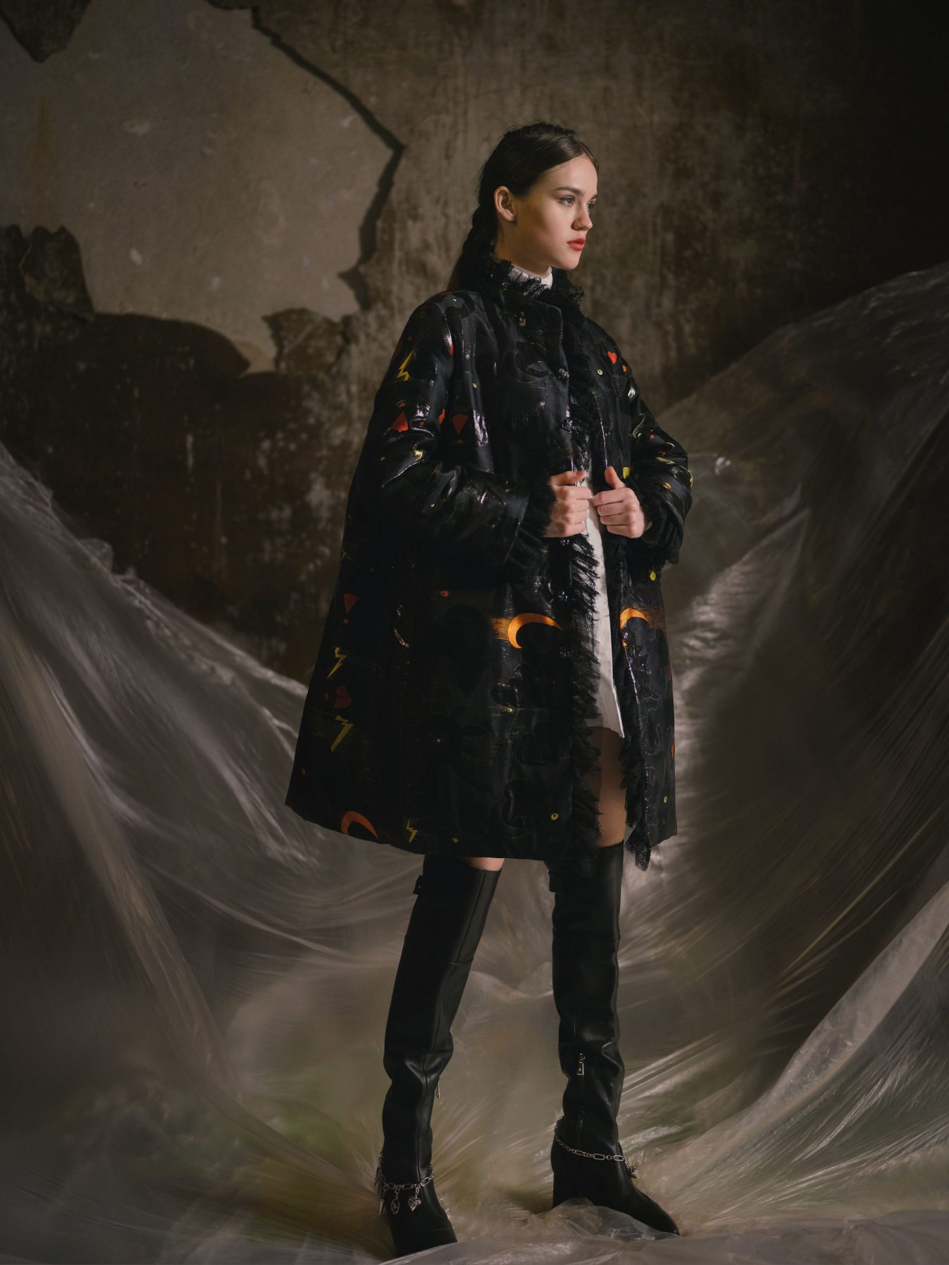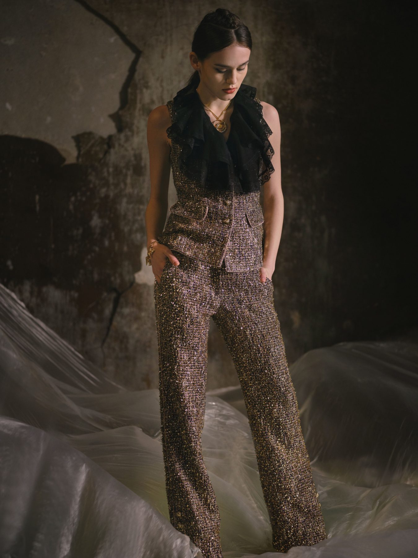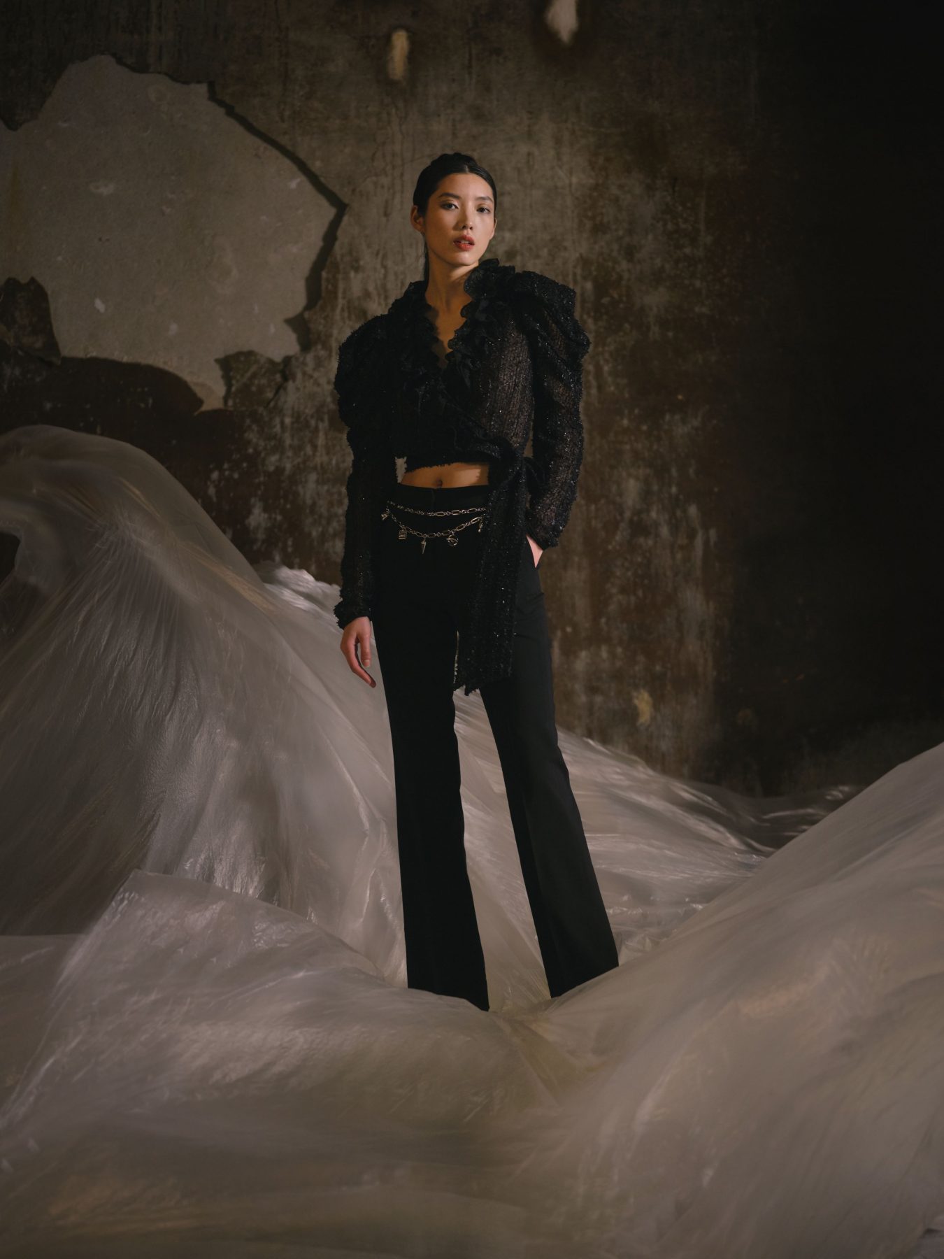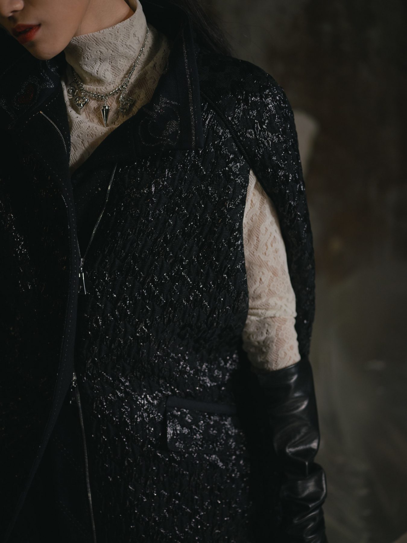當中大量的超現實符碼以燒花、緹花、彩繪、刺繡等表現,織出富有年輕氣息的圖案。 圖騰元素不僅於織品上展現,同時也以具象的形態於飾品上展露無遺; 如項鍊、不對稱耳環、手鍊、腰鍊等,服裝上秉持著品牌手工技藝的核心精神不再拘泥於傳統的中式印象,打破制式的框架,定義現代東方奢華。 值得一提的是,今季較多比例的褲裝以及窄版裙裝,呈現簡約俐落的中性風格。 如小羊皮五分褲的造型配上帥氣長靴,上身混搭男性襯衫,OVERSIZE尺寸的大衣,長版連帽休閒衫等, 再以蕾絲馬甲內搭背心、透膚網紗刺繡上衣,金屬綴飾頸鏈及腰鍊,組合成剛柔並存的女性化的風貌;更重要的是,這些服裝設計耐看而實穿,符合當下重視細水長流的穿搭風格。