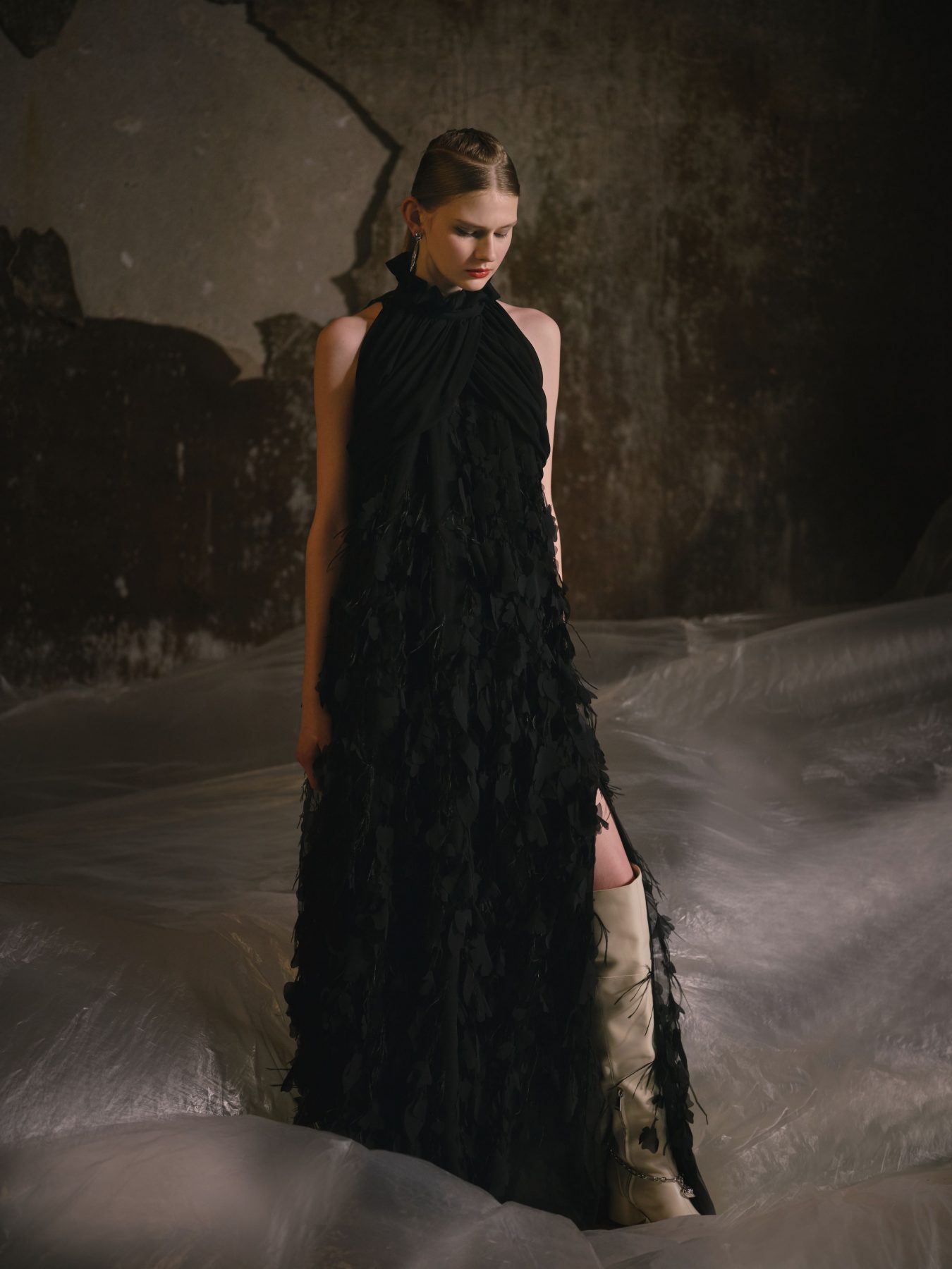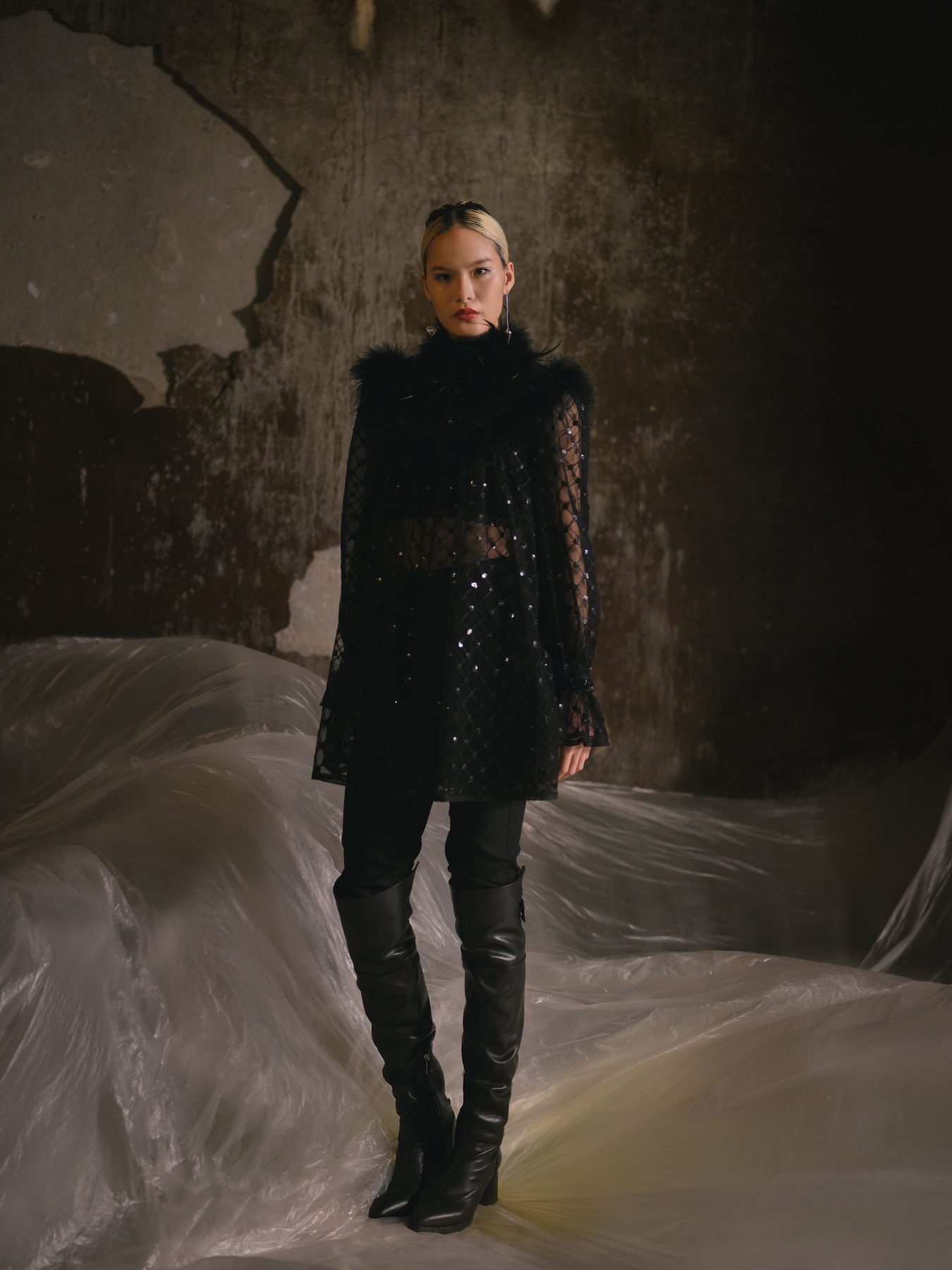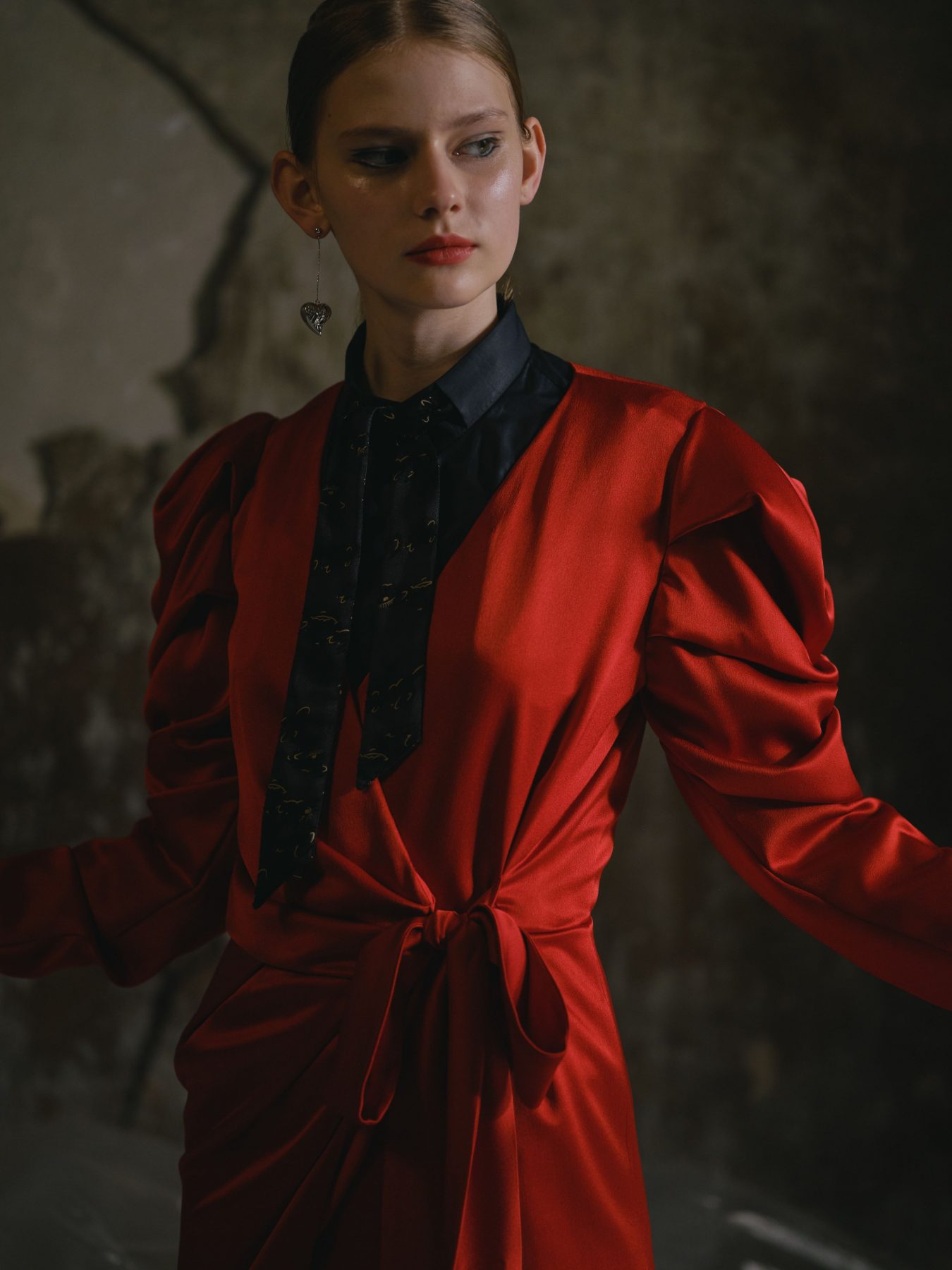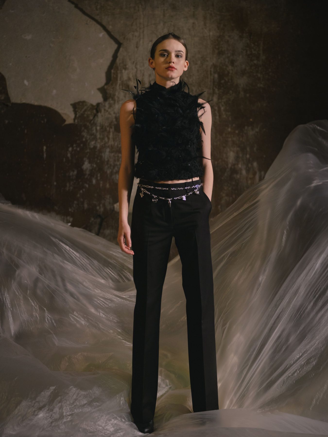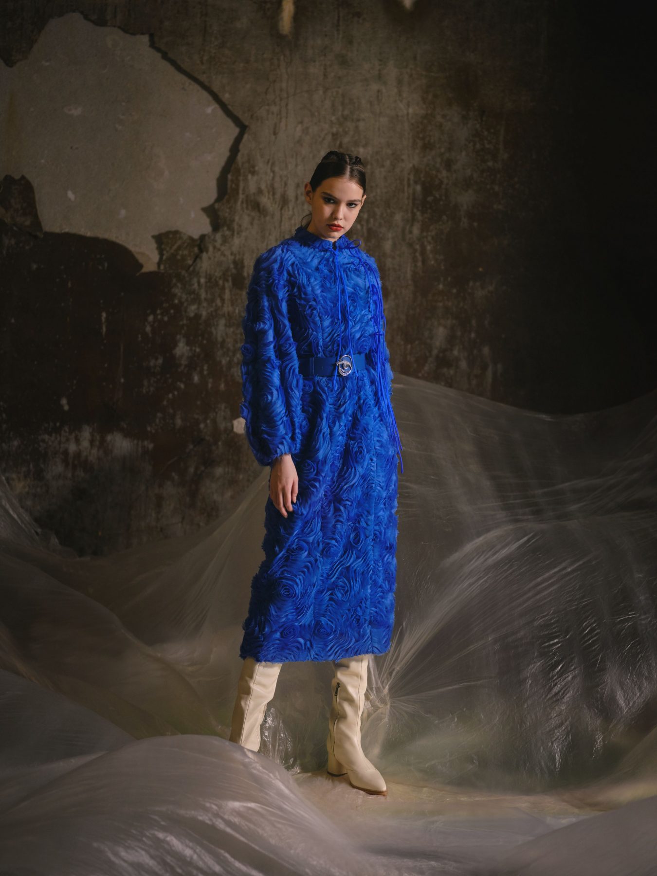 當中大量的超現實符碼以燒花、緹花、彩繪、刺繡等表現,織出富有年輕氣息的圖案。 圖騰元素不僅於織品上展現,同時也以具象的形態於飾品上展露無遺; 如項鍊、不對稱耳環、手鍊、腰鍊等,服裝上秉持著品牌手工技藝的核心精神不再拘泥於傳統的中式印象,打破制式的框架,定義現代東方奢華。 值得一提的是,今季較多比例的褲裝以及窄版裙裝,呈現簡約俐落的中性風格。 如小羊皮五分褲的造型配上帥氣長靴,上身混搭男性襯衫,OVERSIZE尺寸的大衣,長版連帽休閒衫等, 再以蕾絲馬甲內搭背心、透膚網紗刺繡上衣,金屬綴飾頸鏈及腰鍊,組合成剛柔並存的女性化的風貌;更重要的是,這些服裝設計耐看而實穿,符合當下重視細水長流的穿搭風格。