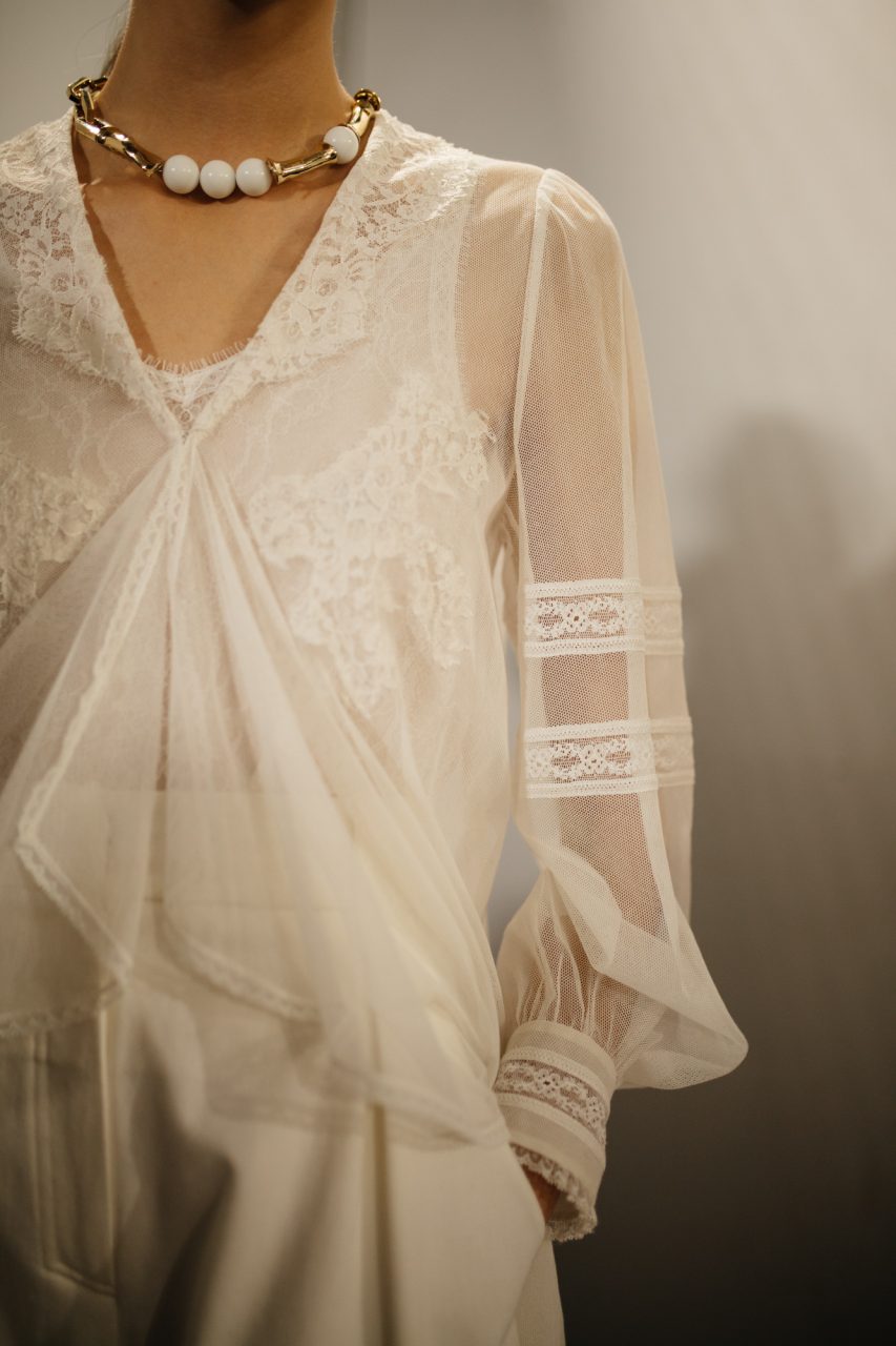 除了是觀察力,Shiatzy Chen呈現主題也有相當高的能力。她首先以修長的版型呈現竹的形態,然後巧妙地把刺繡和肚兜元素融入系列,透過襬褶的細節,配合光澤感布料的律動,在中式的廓形上,使用了西式的剪裁和布料,打造中西融合的時裝樣貌。當中還有多種烏干紗的結合運用,前短後長輔以薄透親膚的布料,像喱士、棉麻、絲緞等等營造輕盈姿態,一反竹給人硬橋硬碼的印象,以西方的墨,畫出了一片東方詩意。