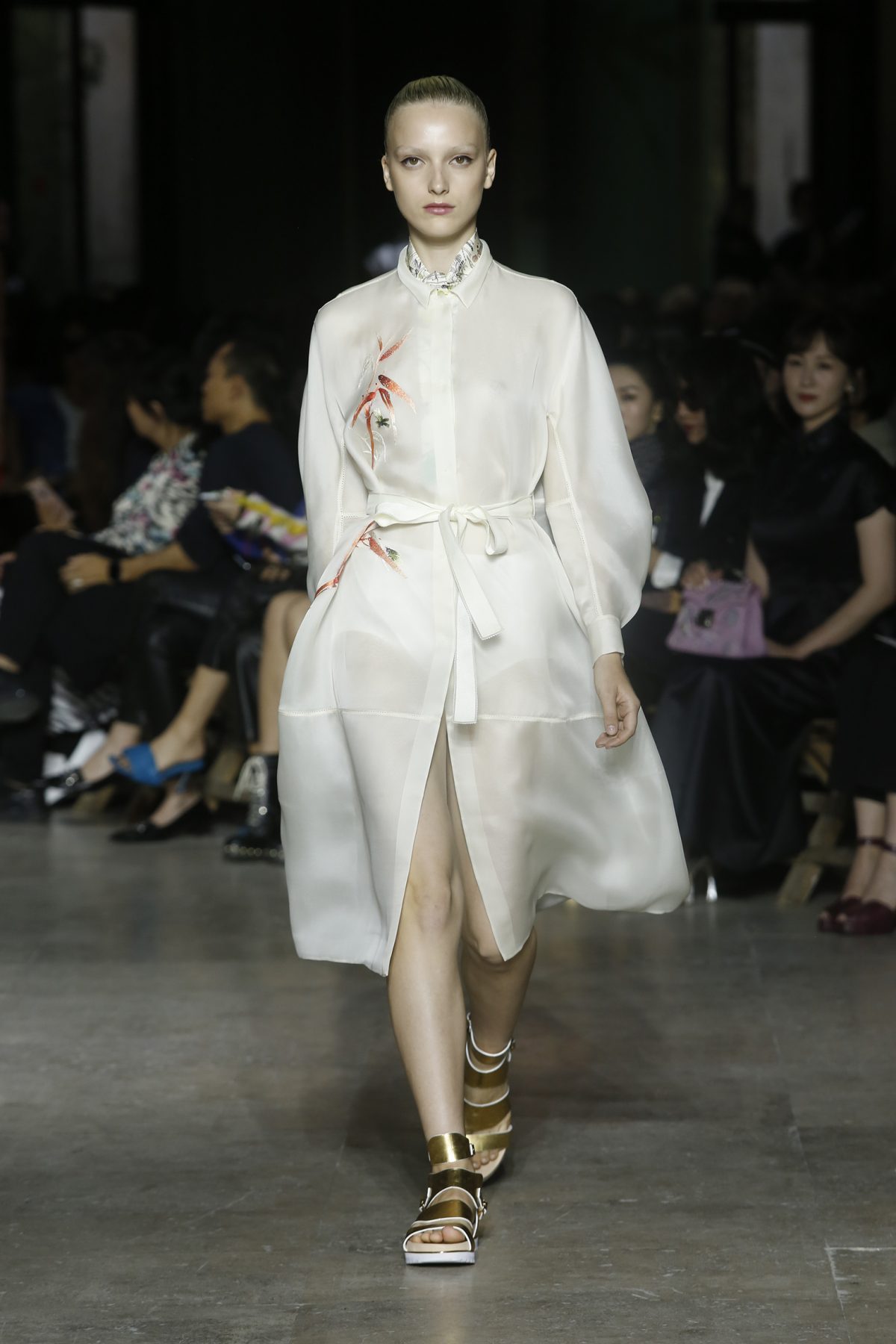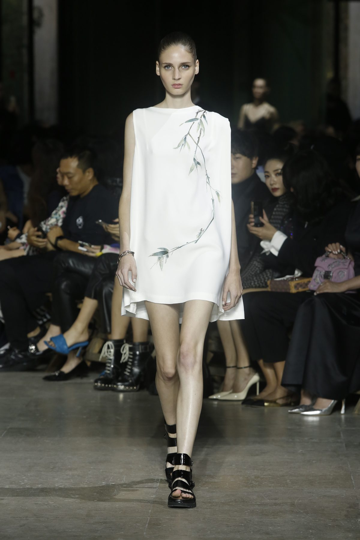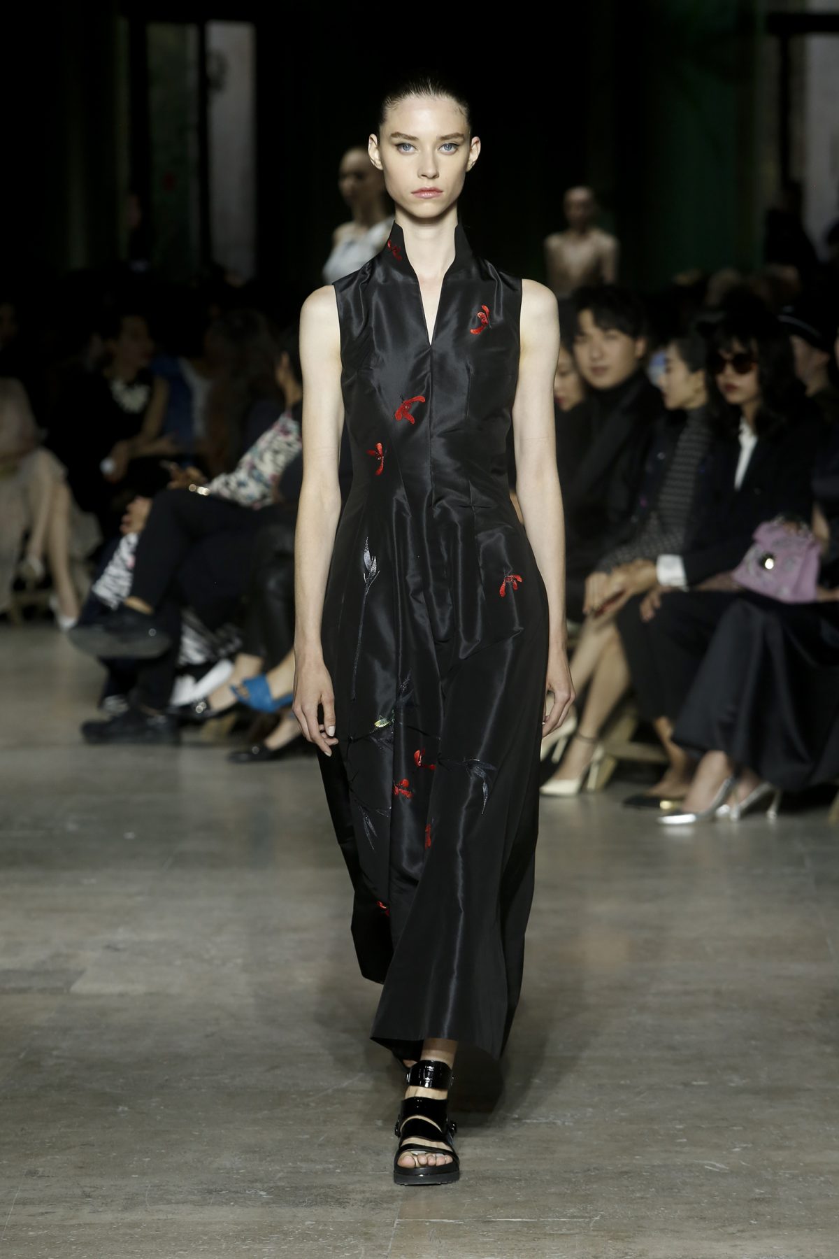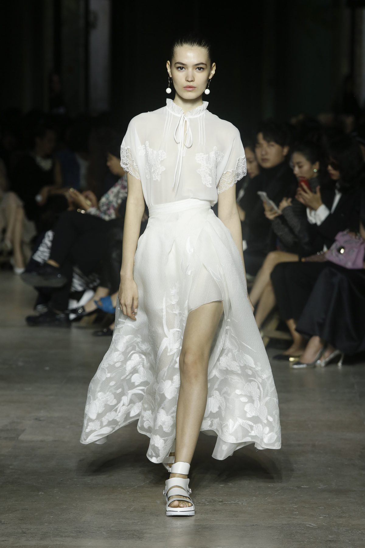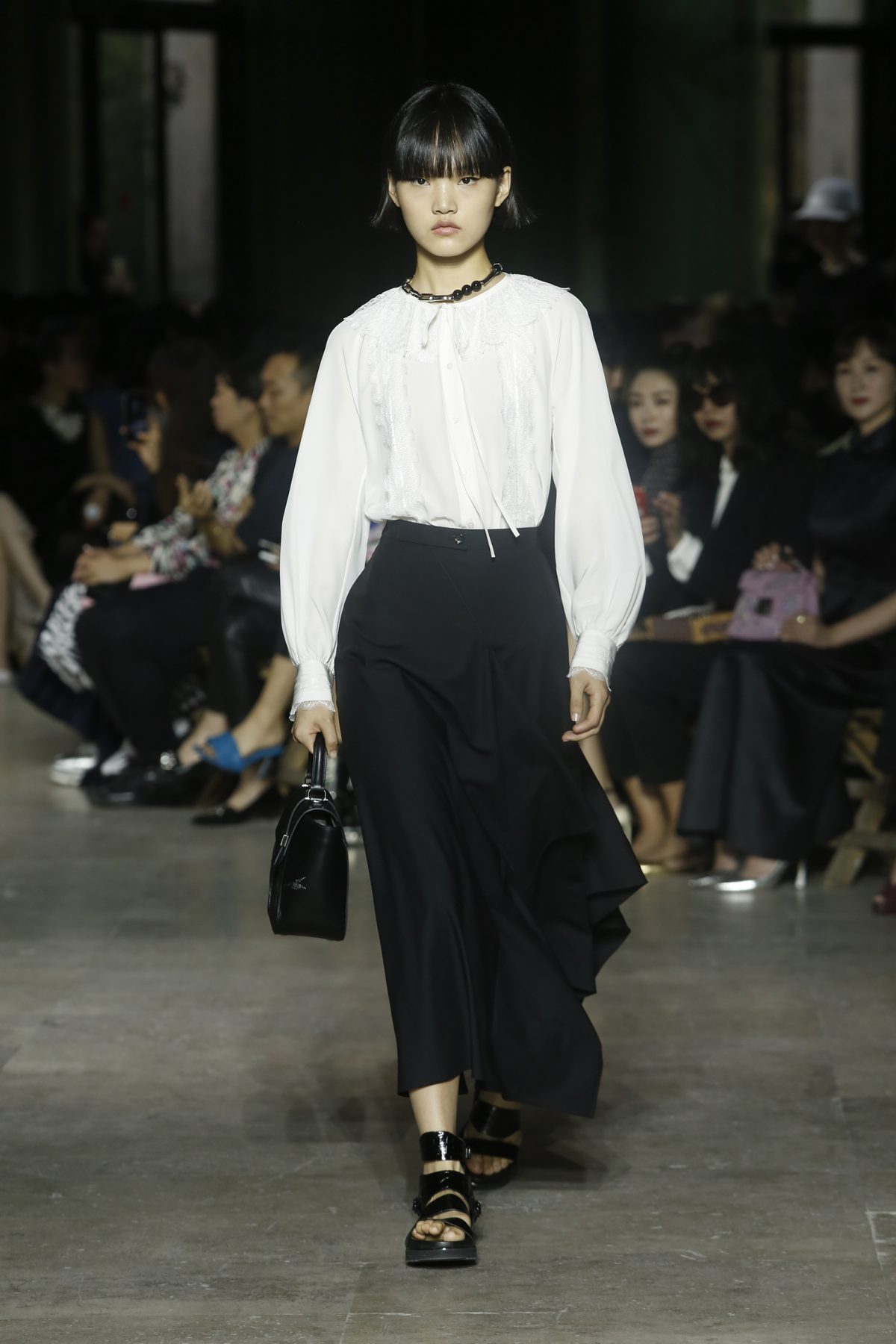 除了是觀察力,Shiatzy Chen呈現主題也有相當高的能力。她首先以修長的版型呈現竹的形態,然後巧妙地把刺繡和肚兜元素融入系列,透過襬褶的細節,配合光澤感布料的律動,在中式的廓形上,使用了西式的剪裁和布料,打造中西融合的時裝樣貌。當中還有多種烏干紗的結合運用,前短後長輔以薄透親膚的布料,像喱士、棉麻、絲緞等等營造輕盈姿態,一反竹給人硬橋硬碼的印象,以西方的墨,畫出了一片東方詩意。
