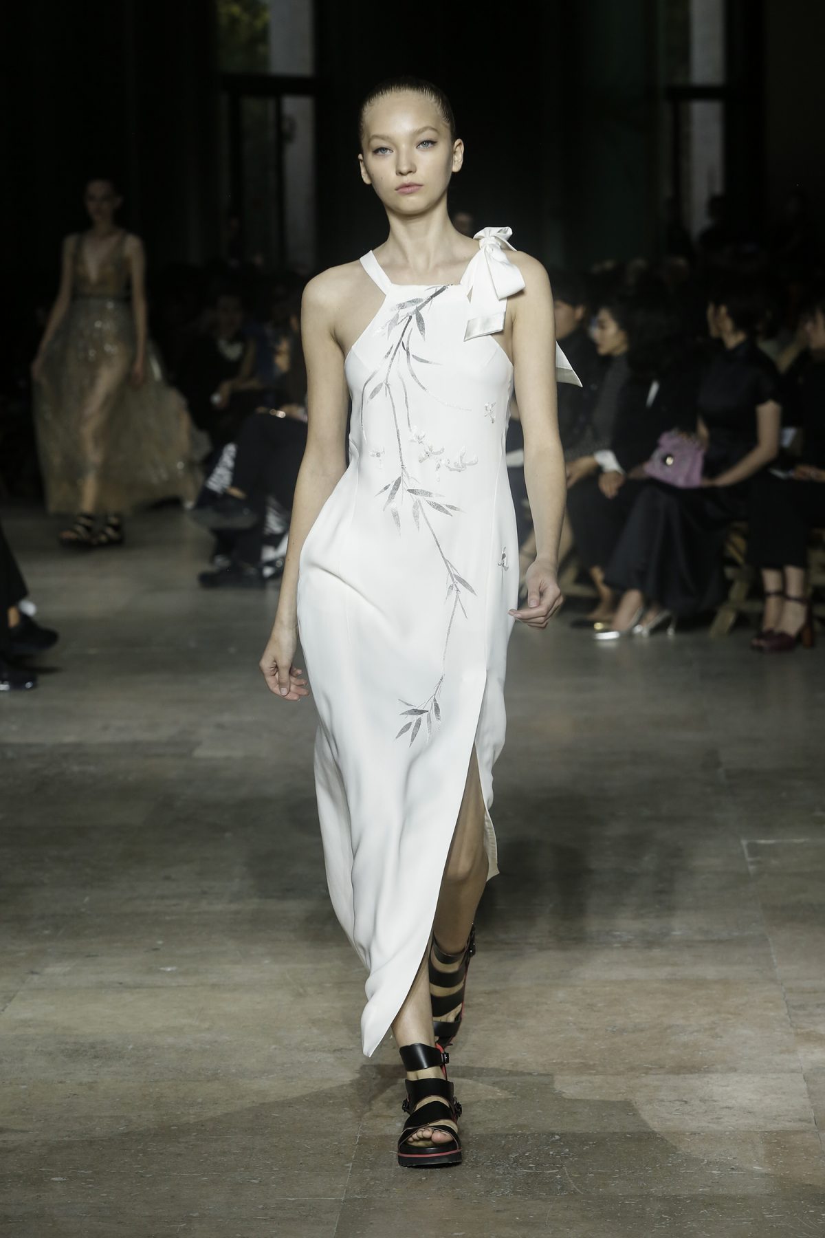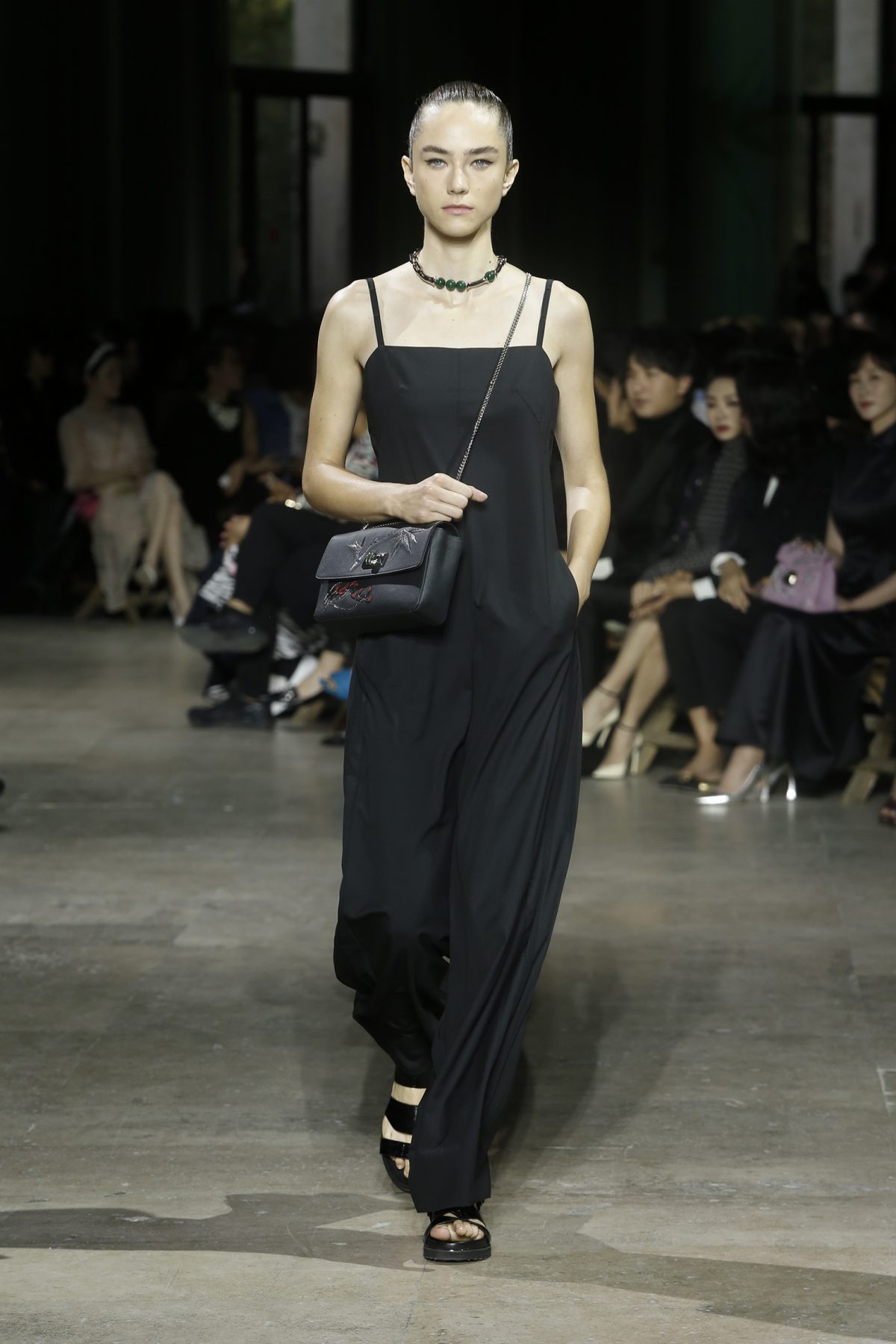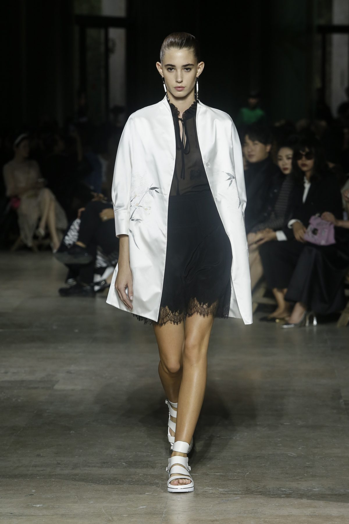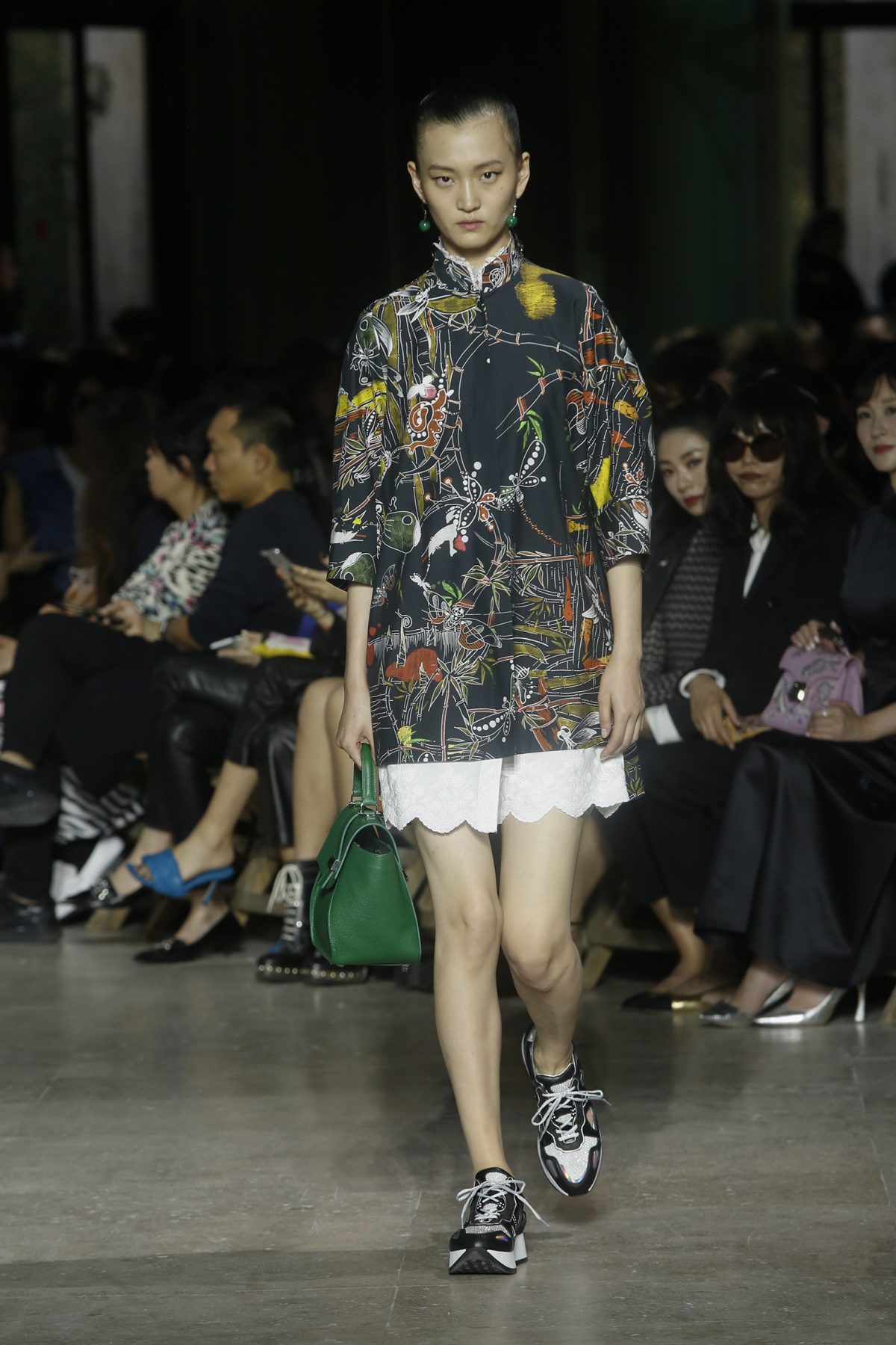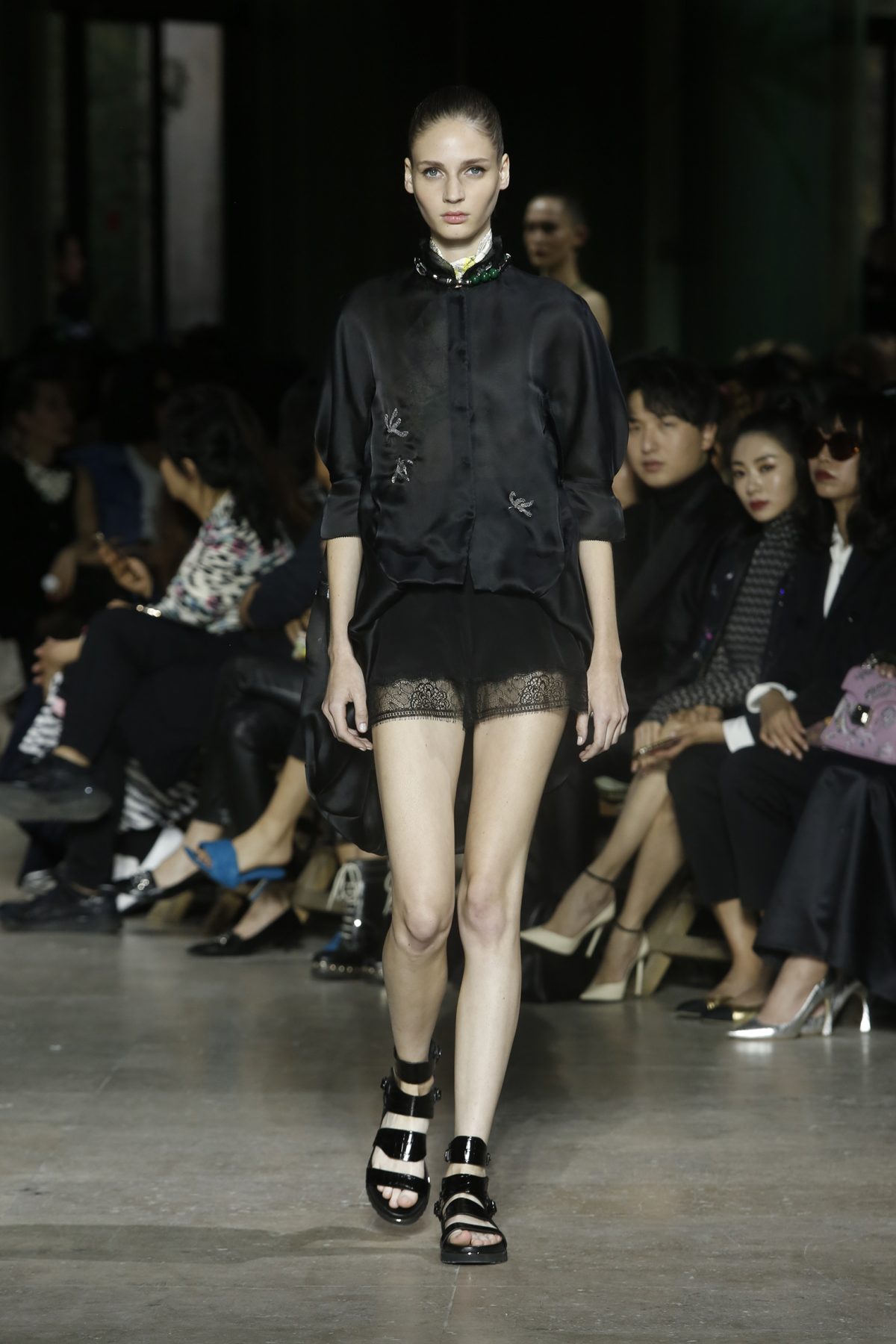 除了是觀察力,Shiatzy Chen呈現主題也有相當高的能力。她首先以修長的版型呈現竹的形態,然後巧妙地把刺繡和肚兜元素融入系列,透過襬褶的細節,配合光澤感布料的律動,在中式的廓形上,使用了西式的剪裁和布料,打造中西融合的時裝樣貌。當中還有多種烏干紗的結合運用,前短後長輔以薄透親膚的布料,像喱士、棉麻、絲緞等等營造輕盈姿態,一反竹給人硬橋硬碼的印象,以西方的墨,畫出了一片東方詩意。