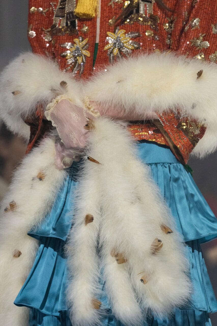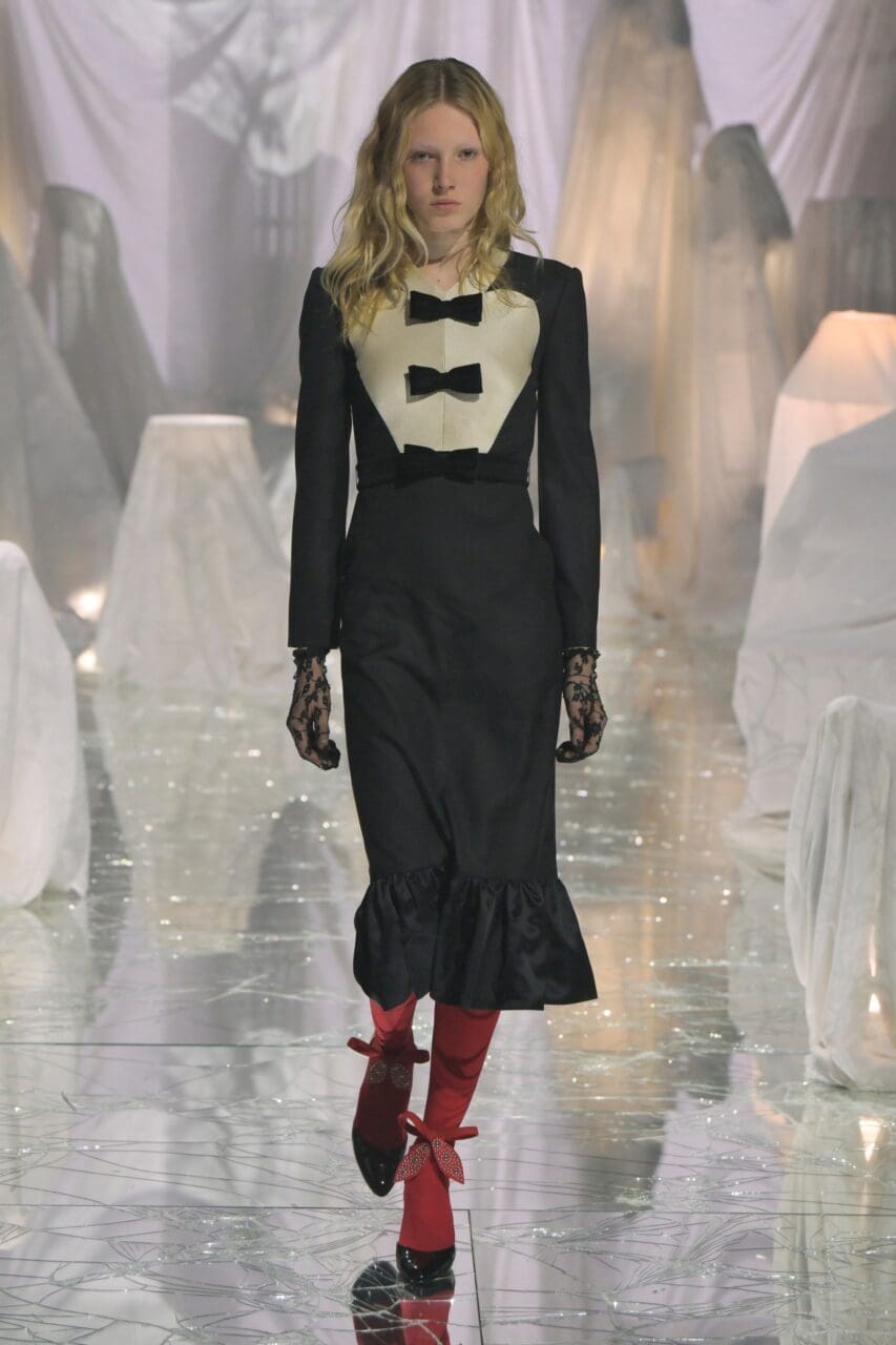 他首先在檔案庫中找到來自 6、70 年代的洋娃娃造型,以及 80 年代的強勢西裝造型,這些都是讓他深受啟發的歷史作品。他將造型中的元素拆解並以誇大的方式融入自己的創作風格當中,以塑造出新一代的 Valentino 風格。蝴蝶結、流蘇、波點、羽毛圍巾,以及大量荷葉邊,Alessandro 毫不留情地將這些元素相互搭配於每個造型上,形成裝飾感強烈的復古藝術效果。此外,原本作為配飾設計師的 Alessandro 也重點着墨於各種精緻飾品——網狀絲綢頭巾與深檔草帽、喱士手套和絲襪、細跟鞋和方跟膝靴,一切都精準到位地提升了整體華麗感。尤其是流蘇麂皮單肩包,以及抓人眼球的貓咪造型收納包,都在這場豐富的系列中脫穎而出,展現出設計師打造配件的功力。