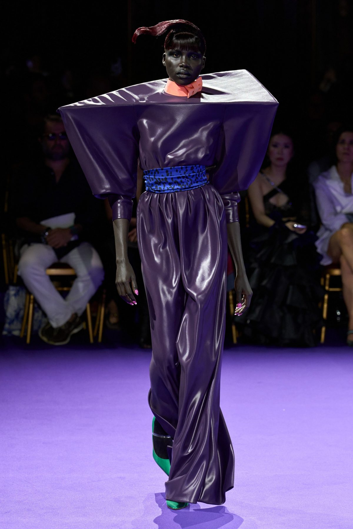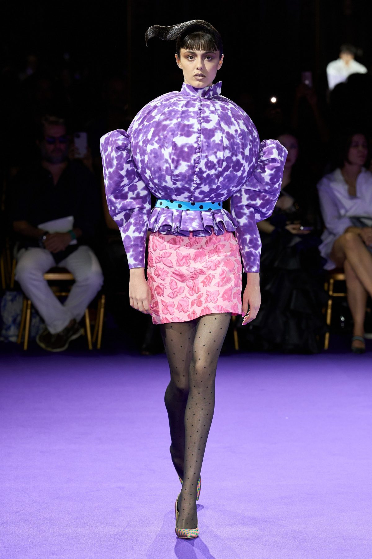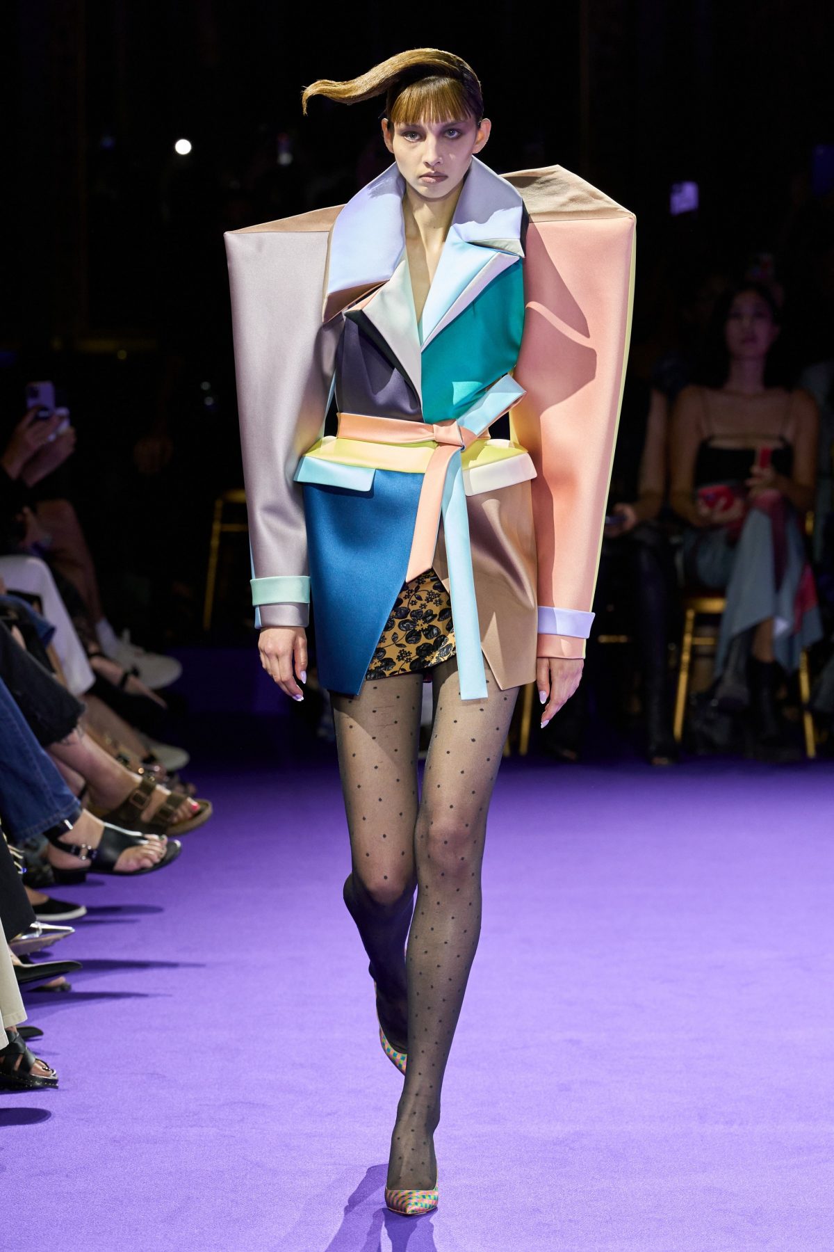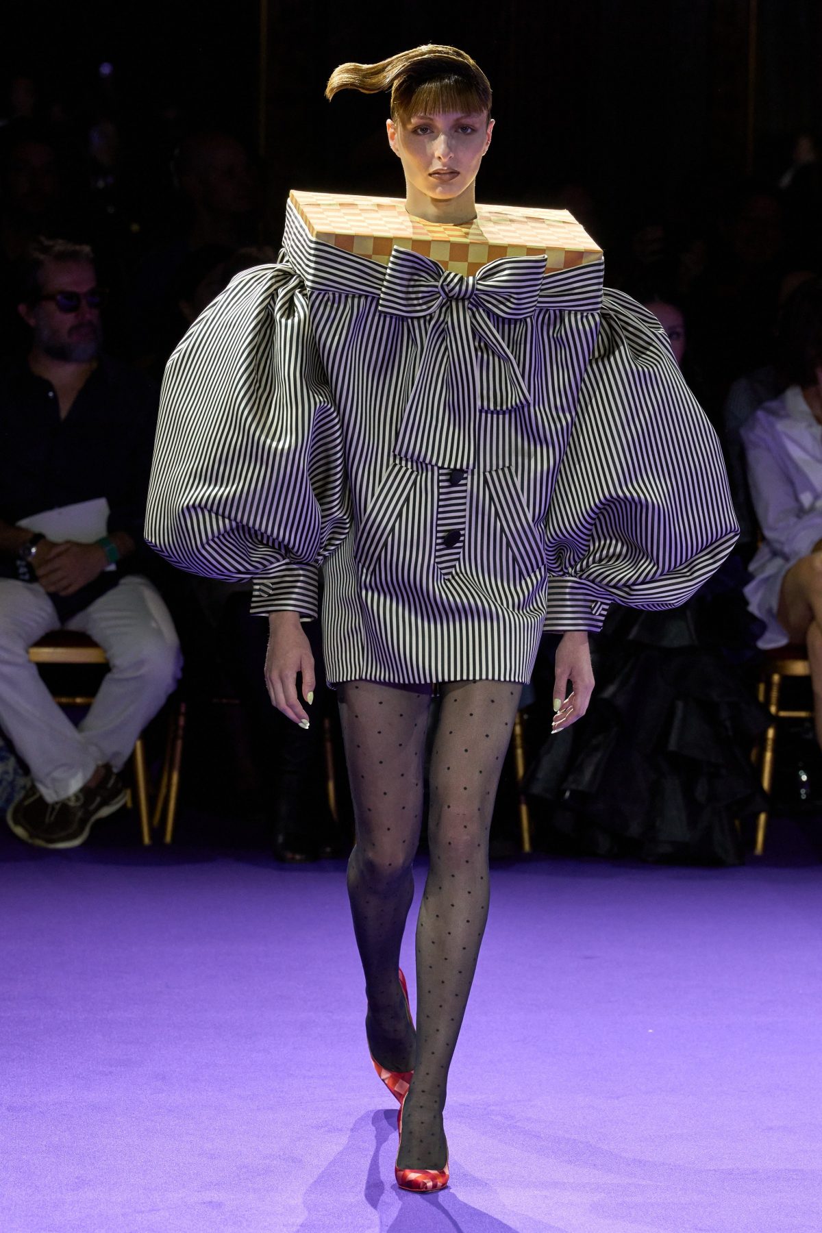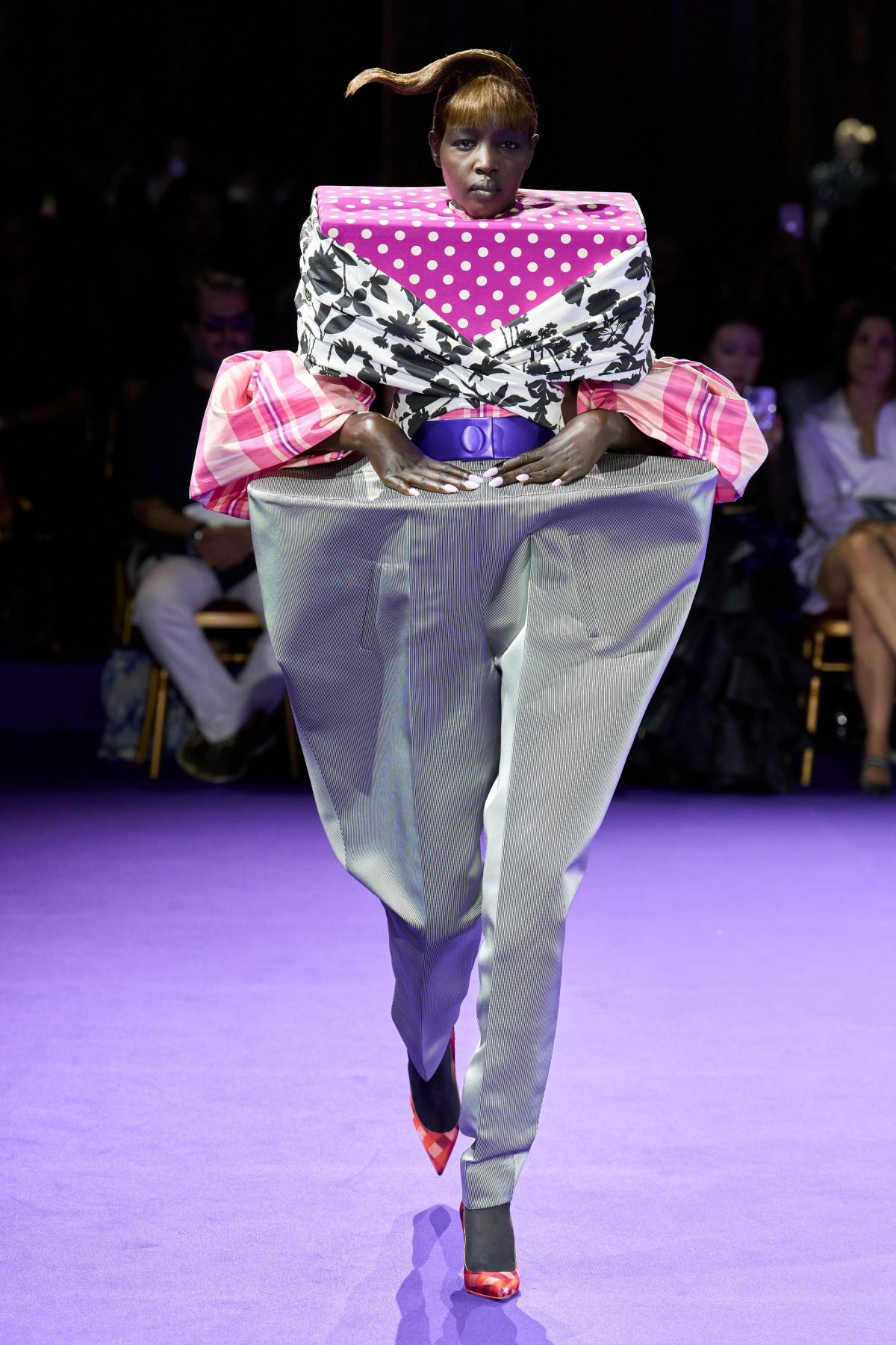 就像孩子們玩積木一樣,他們根據幾何形狀製作服裝,設計出矩形、三角形、球形或梯形的體積。一件連身裙將身體包裹在紫紅色布料的盒子裡;迷你裙套裝外套的巨大肩部懸掛在剃刀形的梯形上;一件彩色短版緞面大衣像一堆3D正方形和長方形一樣組裝起來;形狀像巨大氣球的蝴蝶結褶皺襯衫似乎從一件露肩收腰的雙排扣黑白維希棉質西裝外套中爆炸出來。
