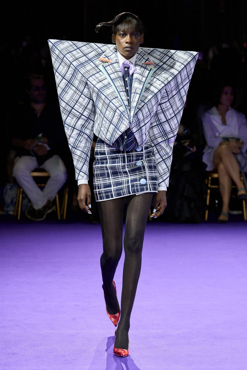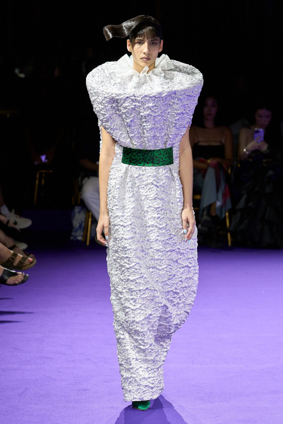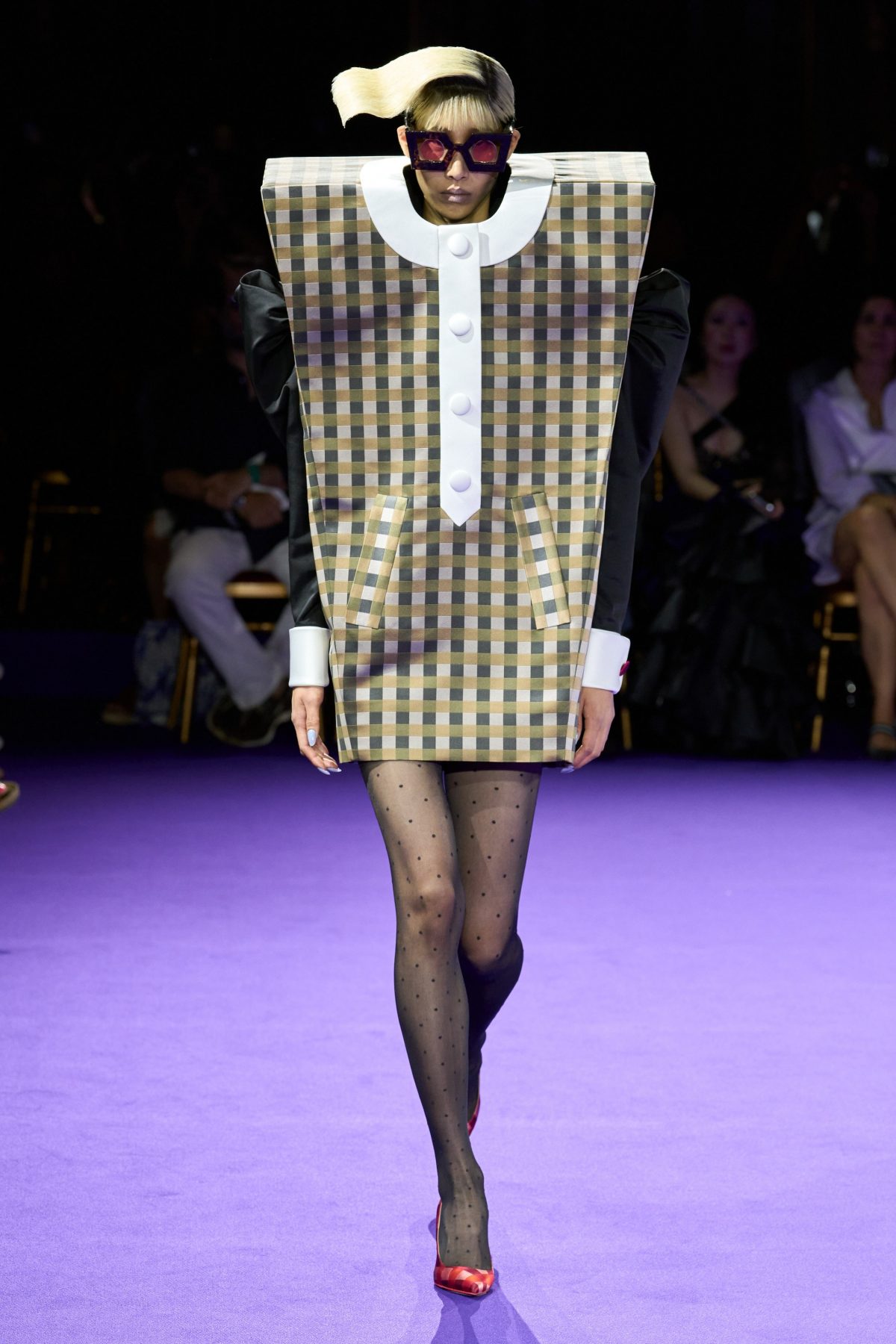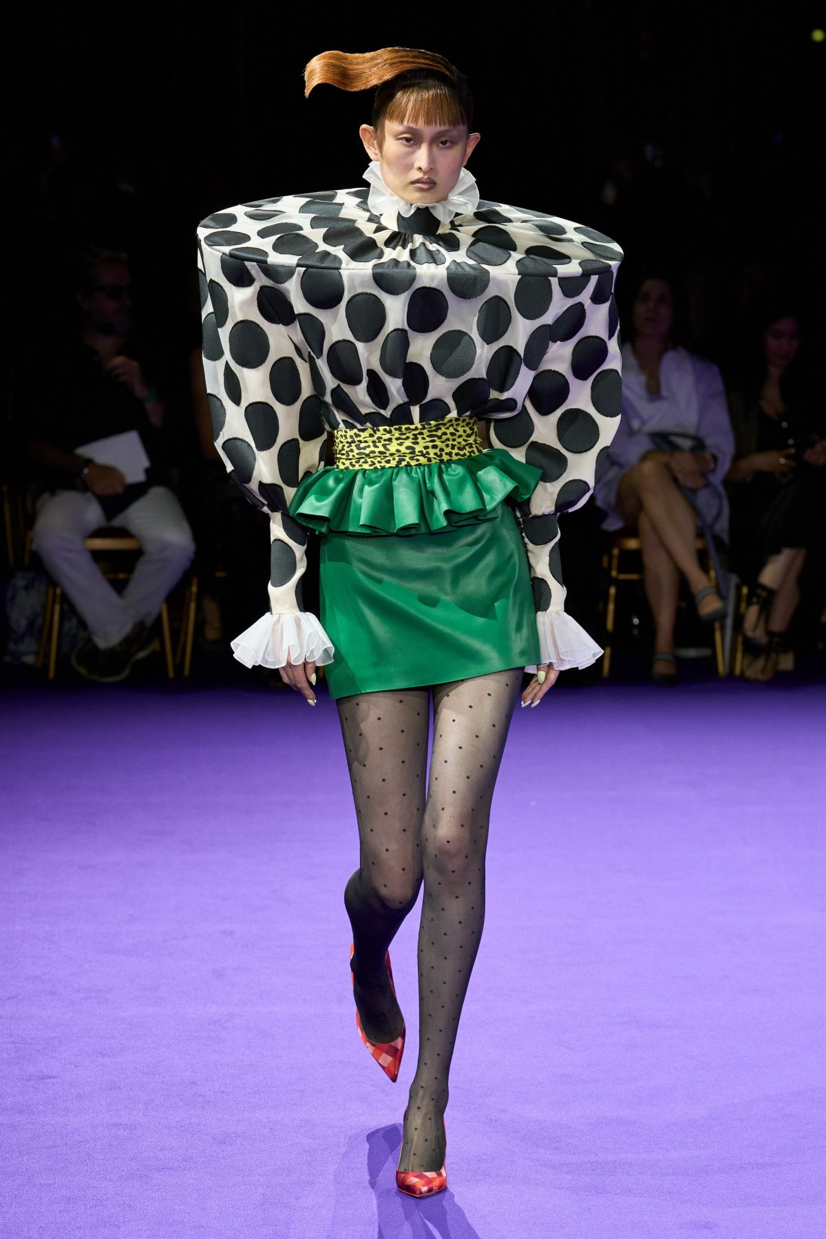 就像孩子們玩積木一樣,他們根據幾何形狀製作服裝,設計出矩形、三角形、球形或梯形的體積。一件連身裙將身體包裹在紫紅色布料的盒子裡;迷你裙套裝外套的巨大肩部懸掛在剃刀形的梯形上;一件彩色短版緞面大衣像一堆3D正方形和長方形一樣組裝起來;形狀像巨大氣球的蝴蝶結褶皺襯衫似乎從一件露肩收腰的雙排扣黑白維希棉質西裝外套中爆炸出來。