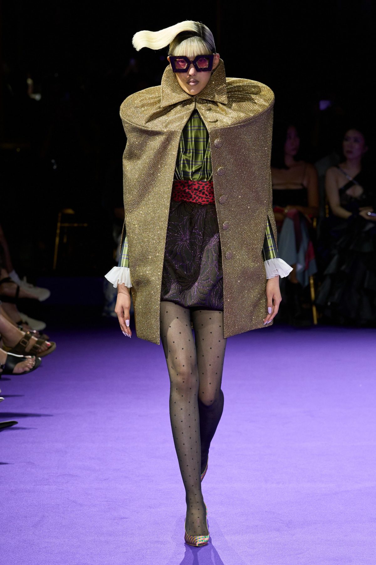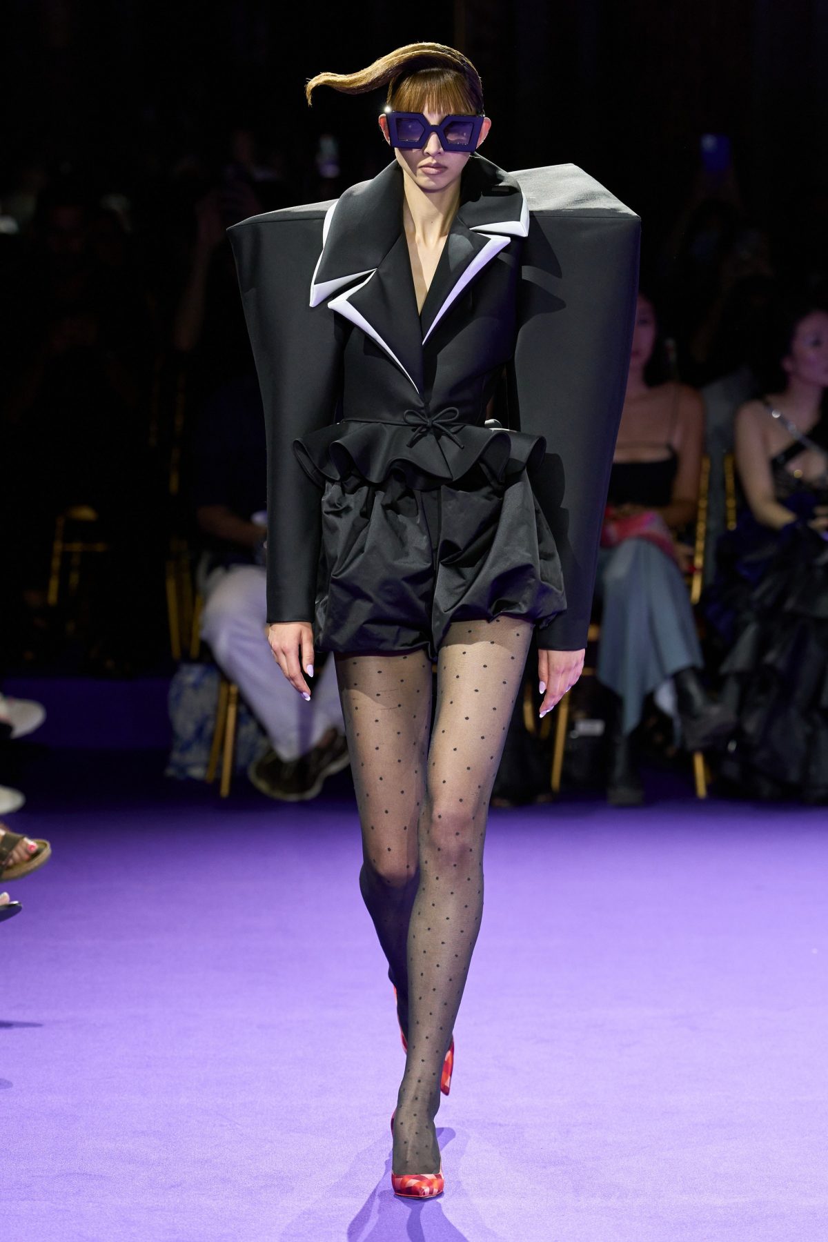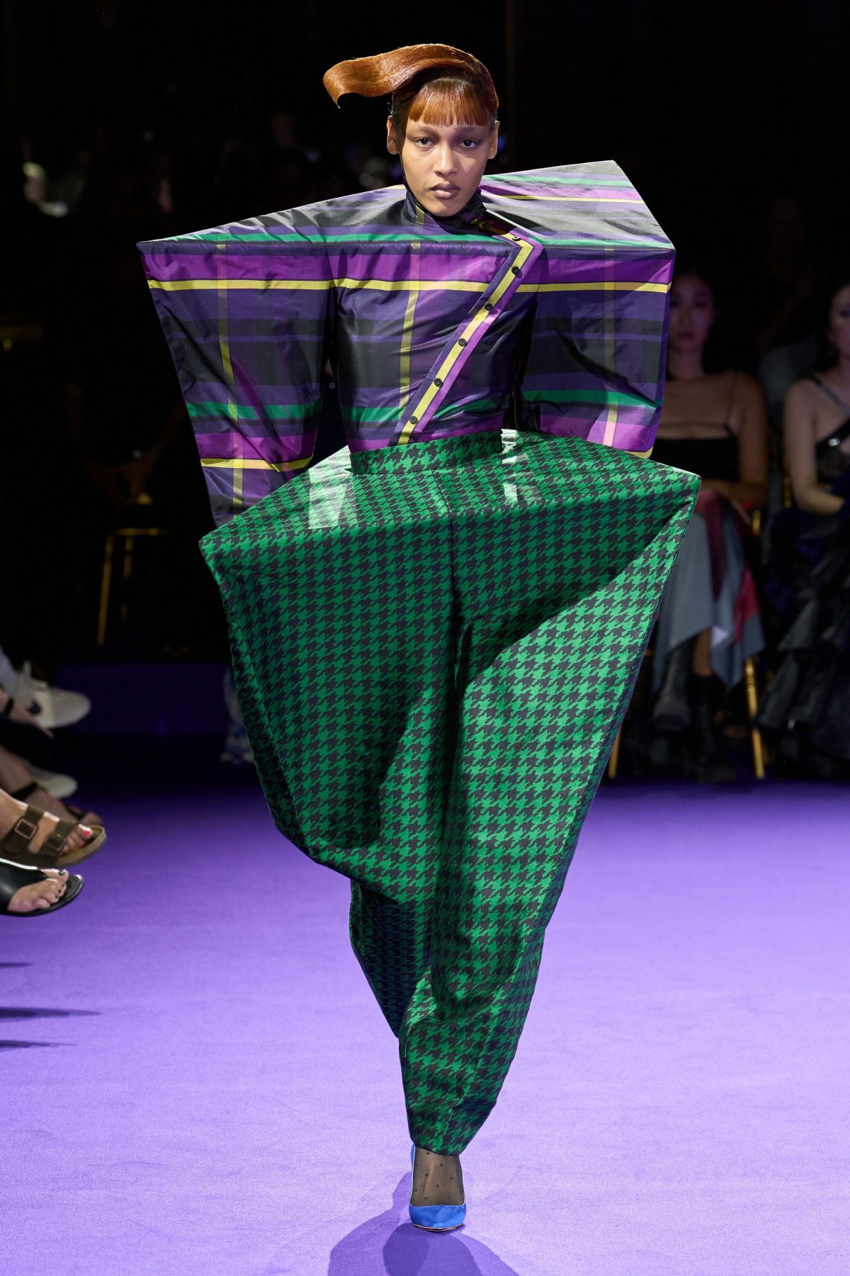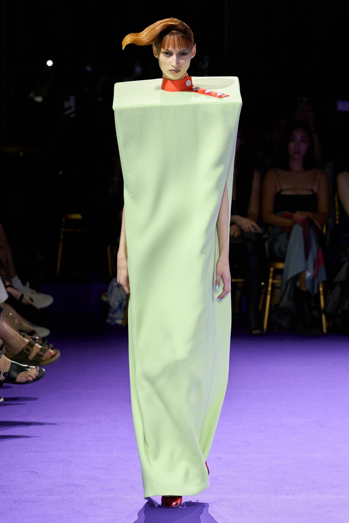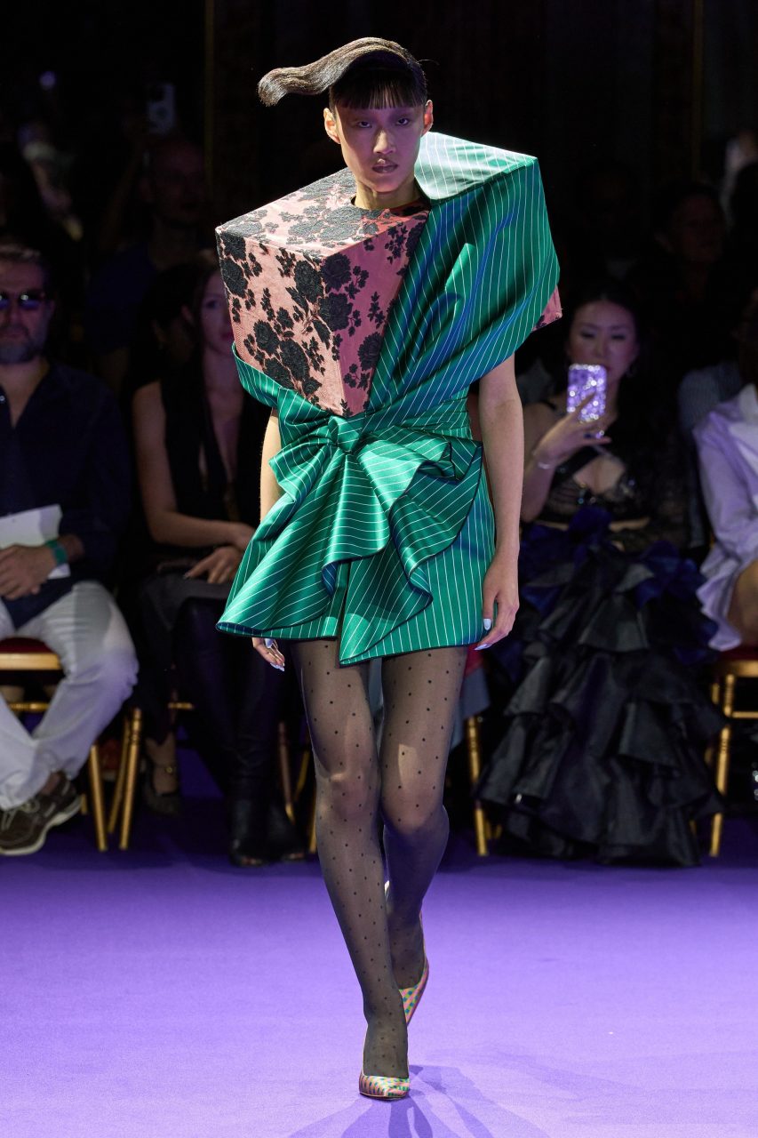 就像孩子們玩積木一樣,他們根據幾何形狀製作服裝,設計出矩形、三角形、球形或梯形的體積。一件連身裙將身體包裹在紫紅色布料的盒子裡;迷你裙套裝外套的巨大肩部懸掛在剃刀形的梯形上;一件彩色短版緞面大衣像一堆3D正方形和長方形一樣組裝起來;形狀像巨大氣球的蝴蝶結褶皺襯衫似乎從一件露肩收腰的雙排扣黑白維希棉質西裝外套中爆炸出來。