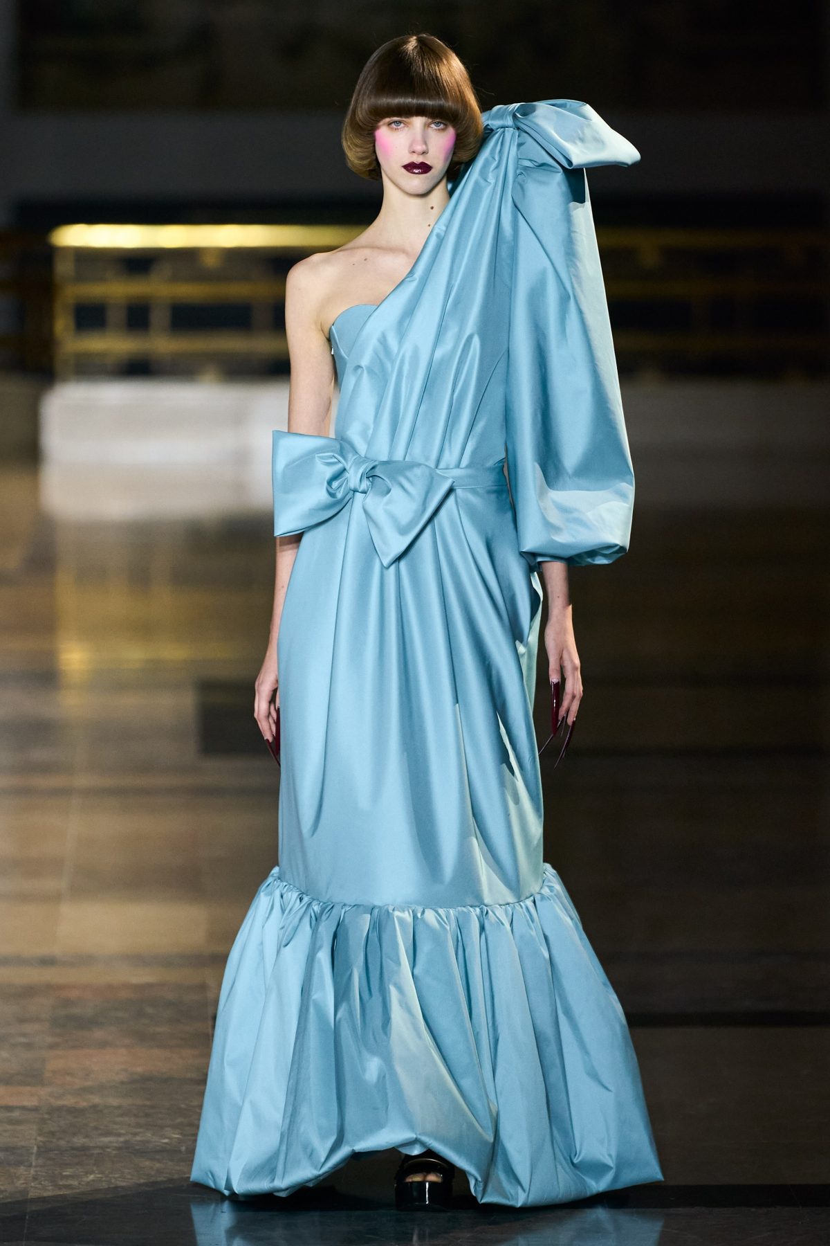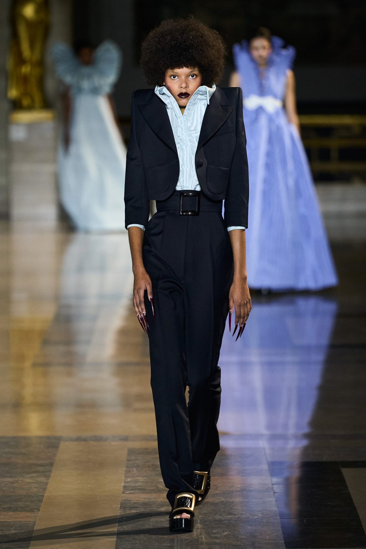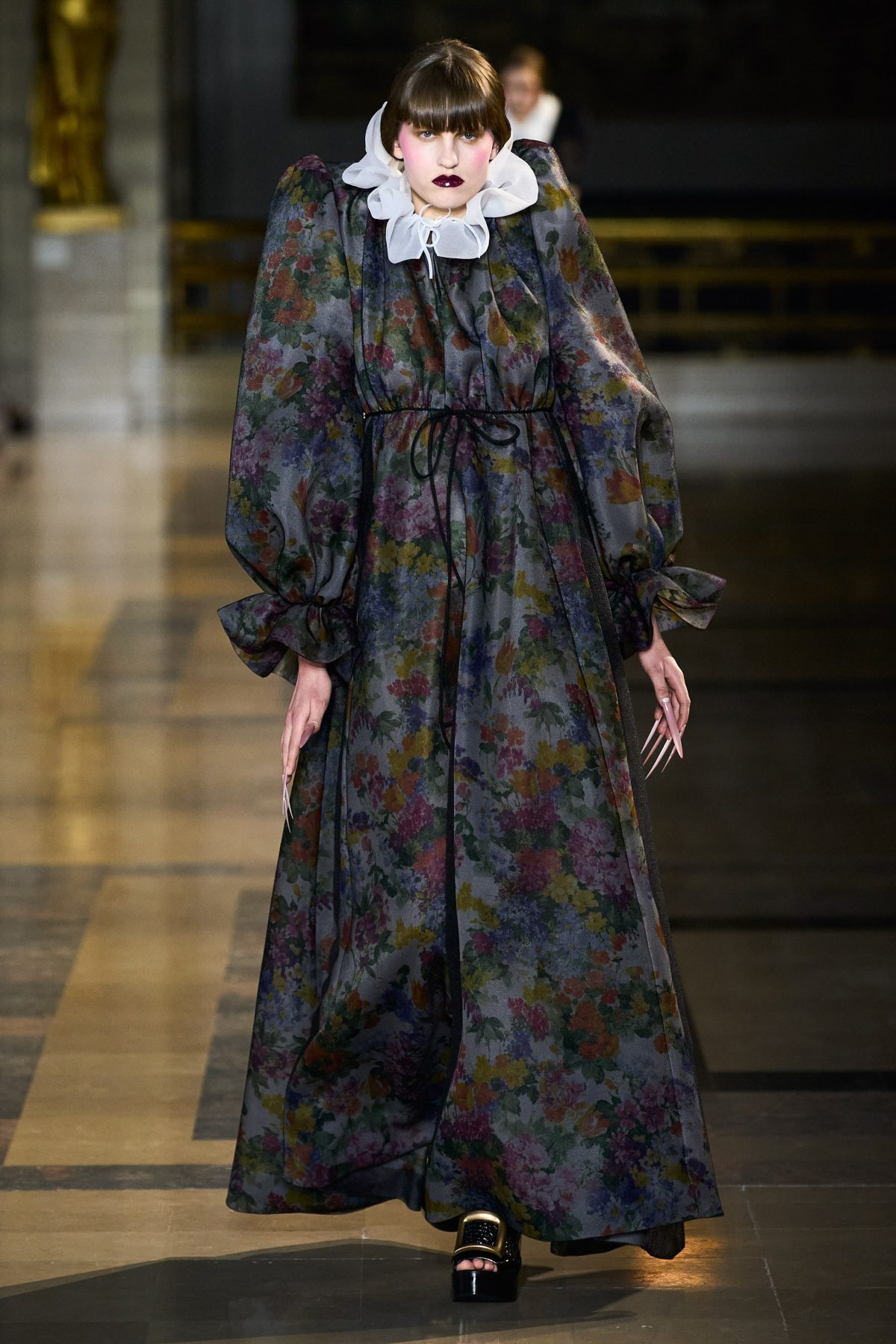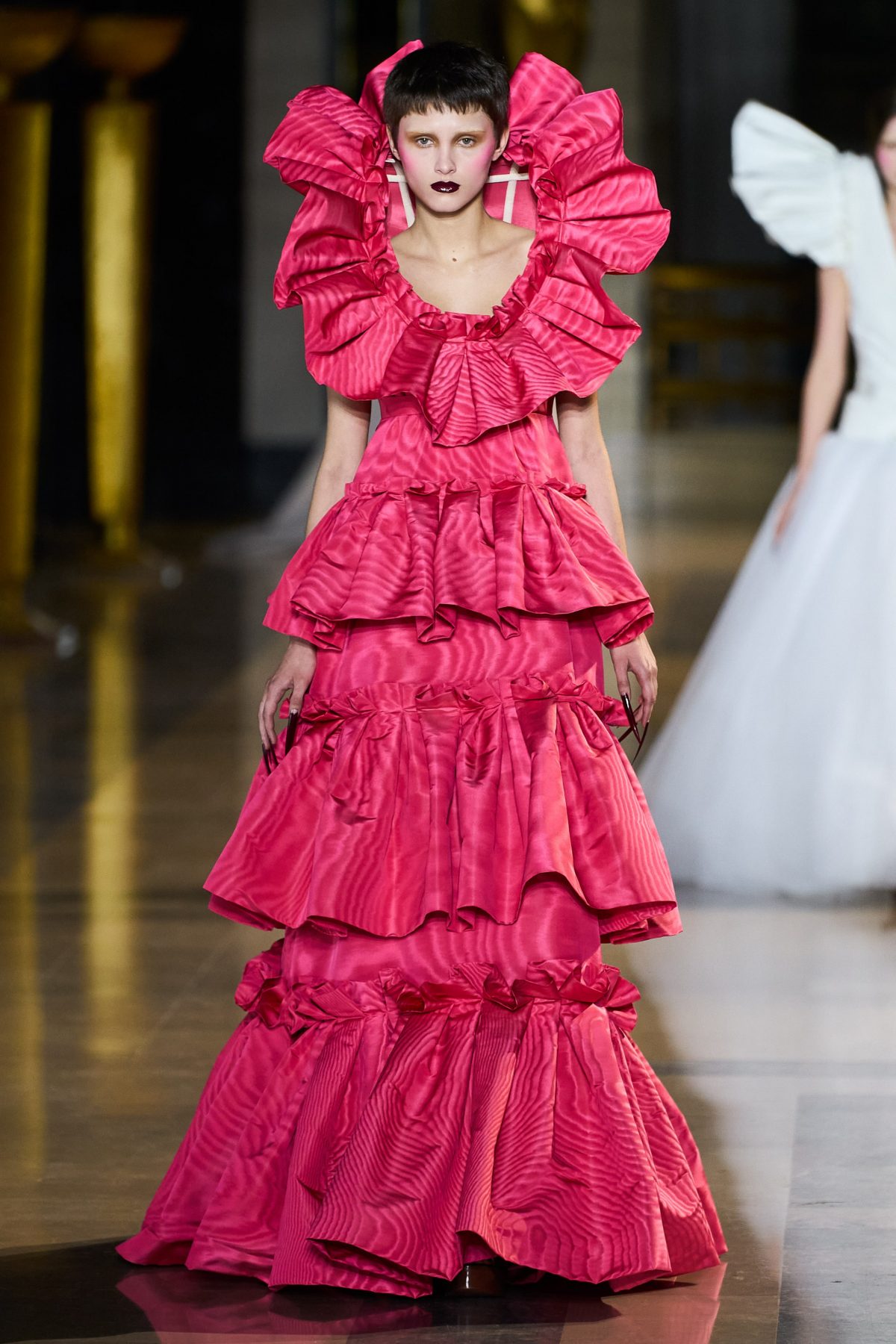 正如恐懼再次出現在當今世界之際,Viktor & Rolf 以「Surreal Shoulder」為題,設計師一方面參考了來自荷里活德古拉(Dracula)吸血鬼電影的標誌性形象(這曾象徵對社會變革的恐懼),又回顧了品牌在 1993 年發布的首個系列的肩線設計,帶來了一系列誇張地拉長和變形輪廓設計。