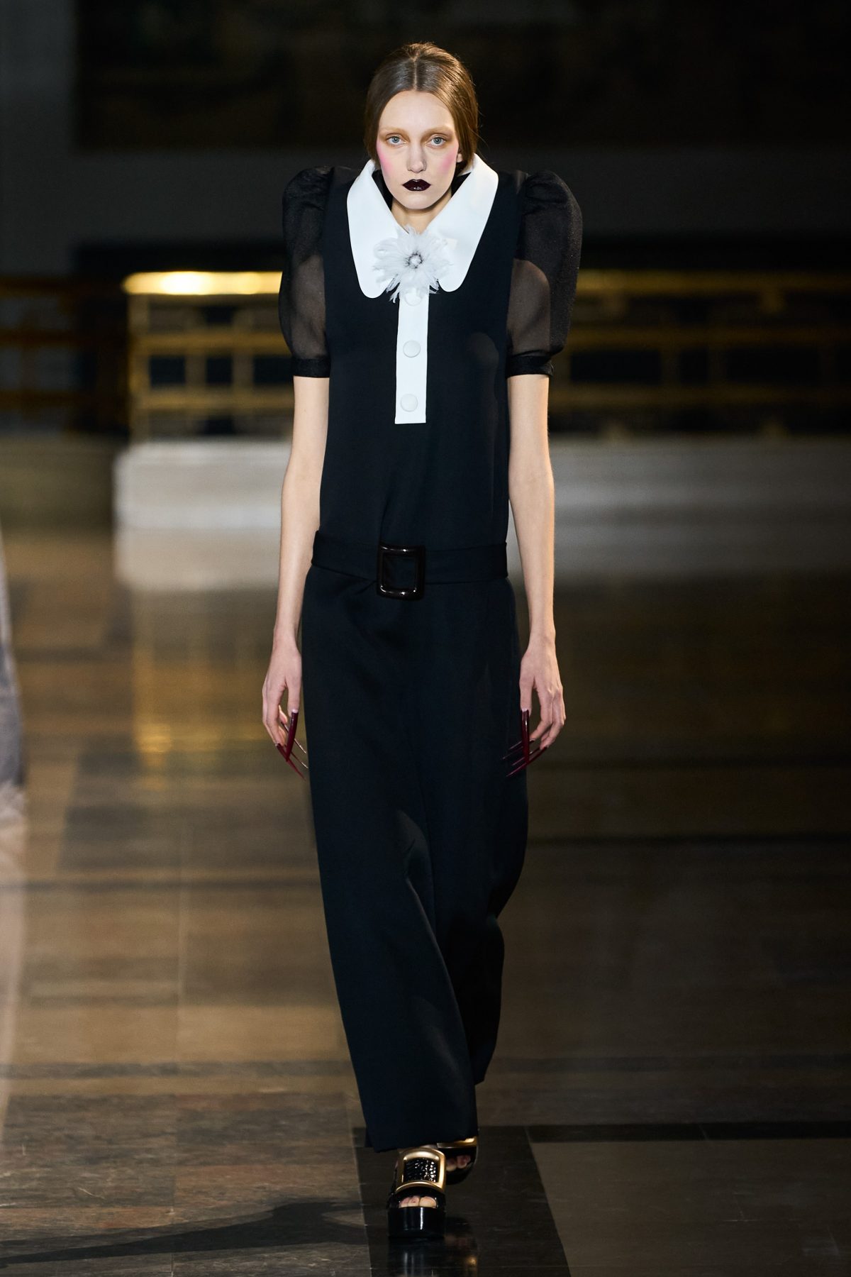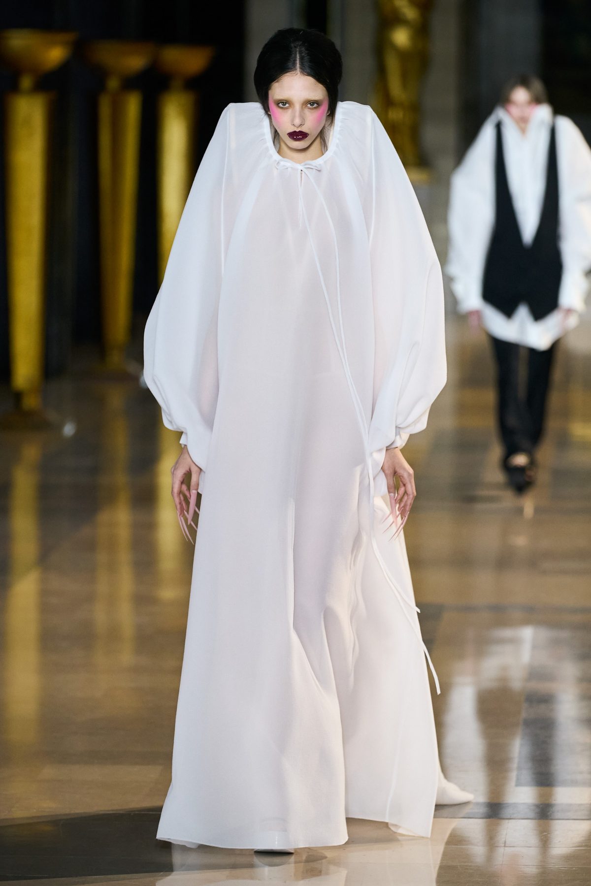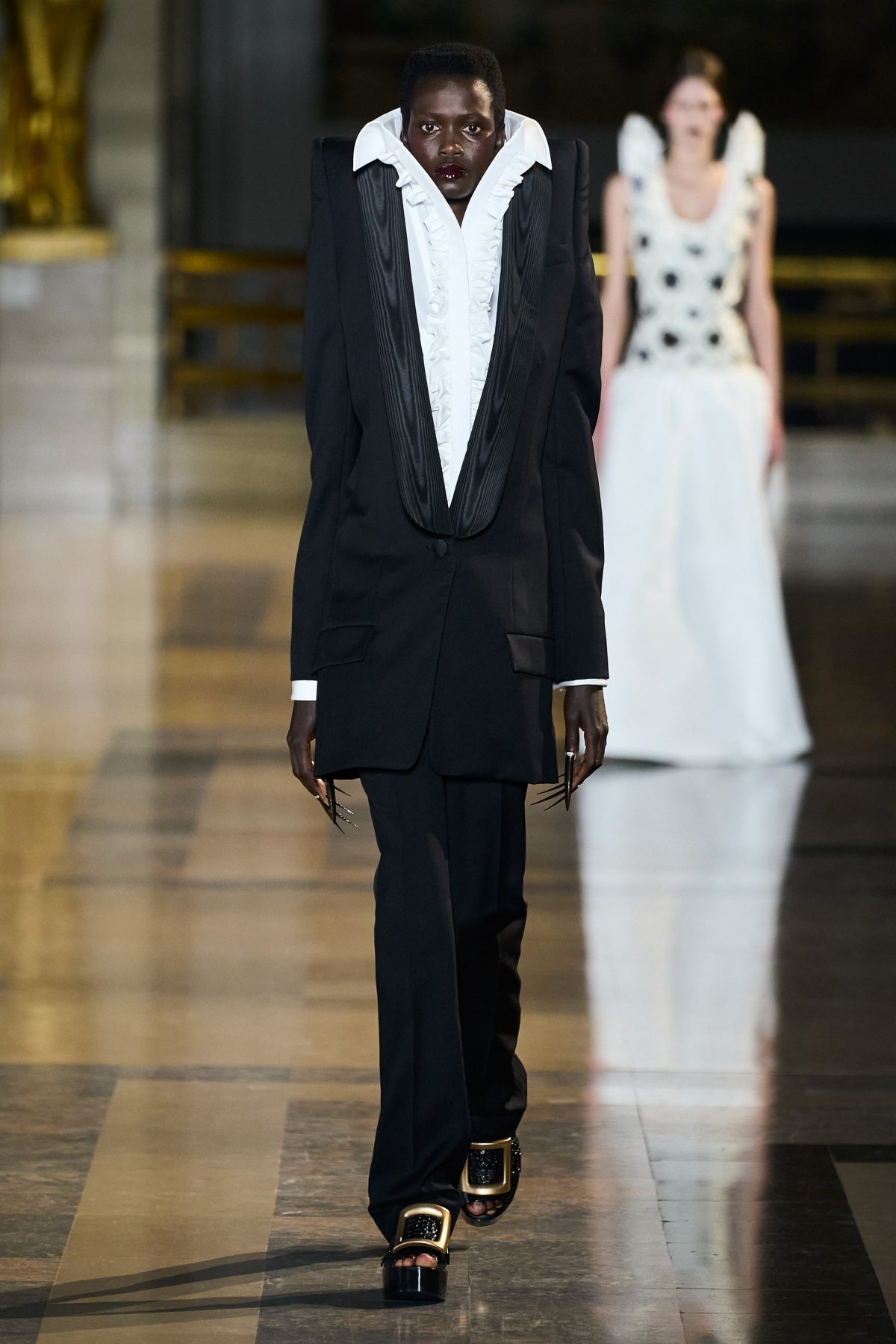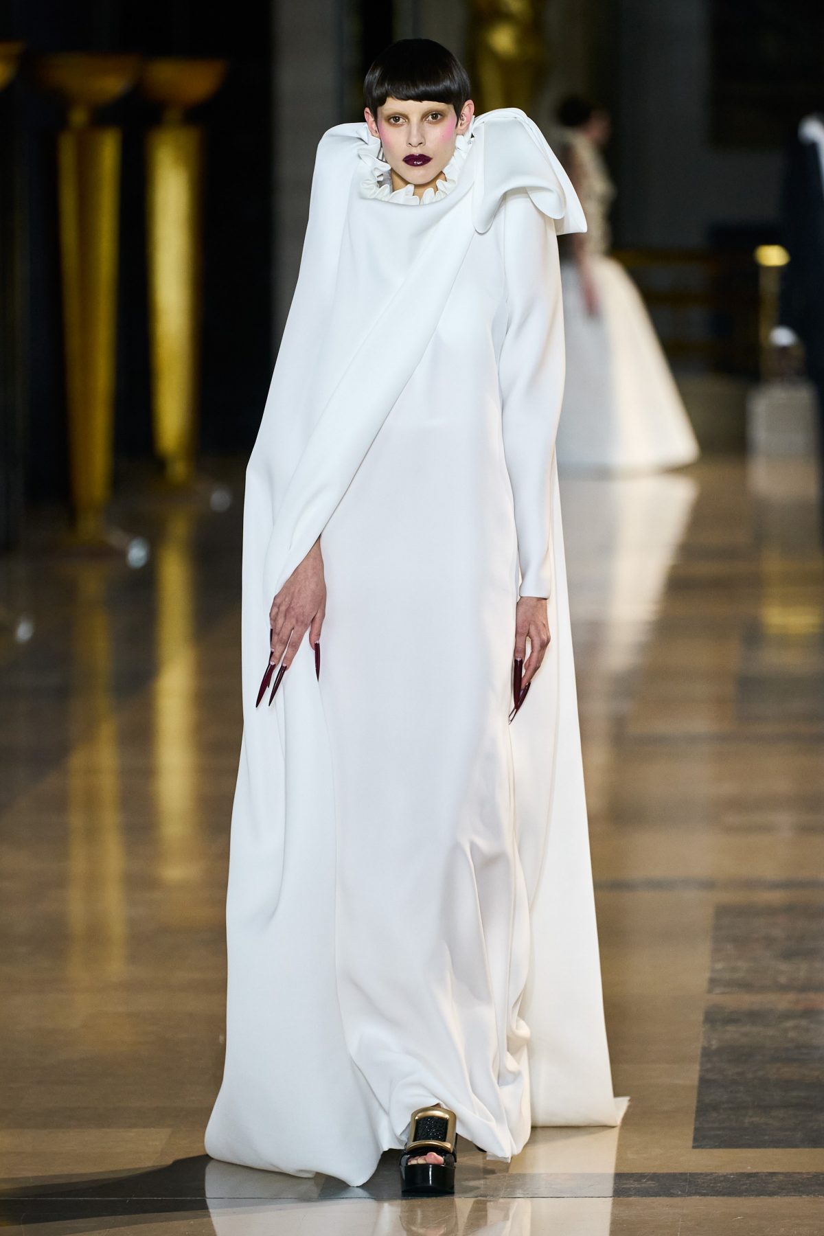 正如恐懼再次出現在當今世界之際,Viktor & Rolf 以「Surreal Shoulder」為題,設計師一方面參考了來自荷里活德古拉(Dracula)吸血鬼電影的標誌性形象(這曾象徵對社會變革的恐懼),又回顧了品牌在 1993 年發布的首個系列的肩線設計,帶來了一系列誇張地拉長和變形輪廓設計。