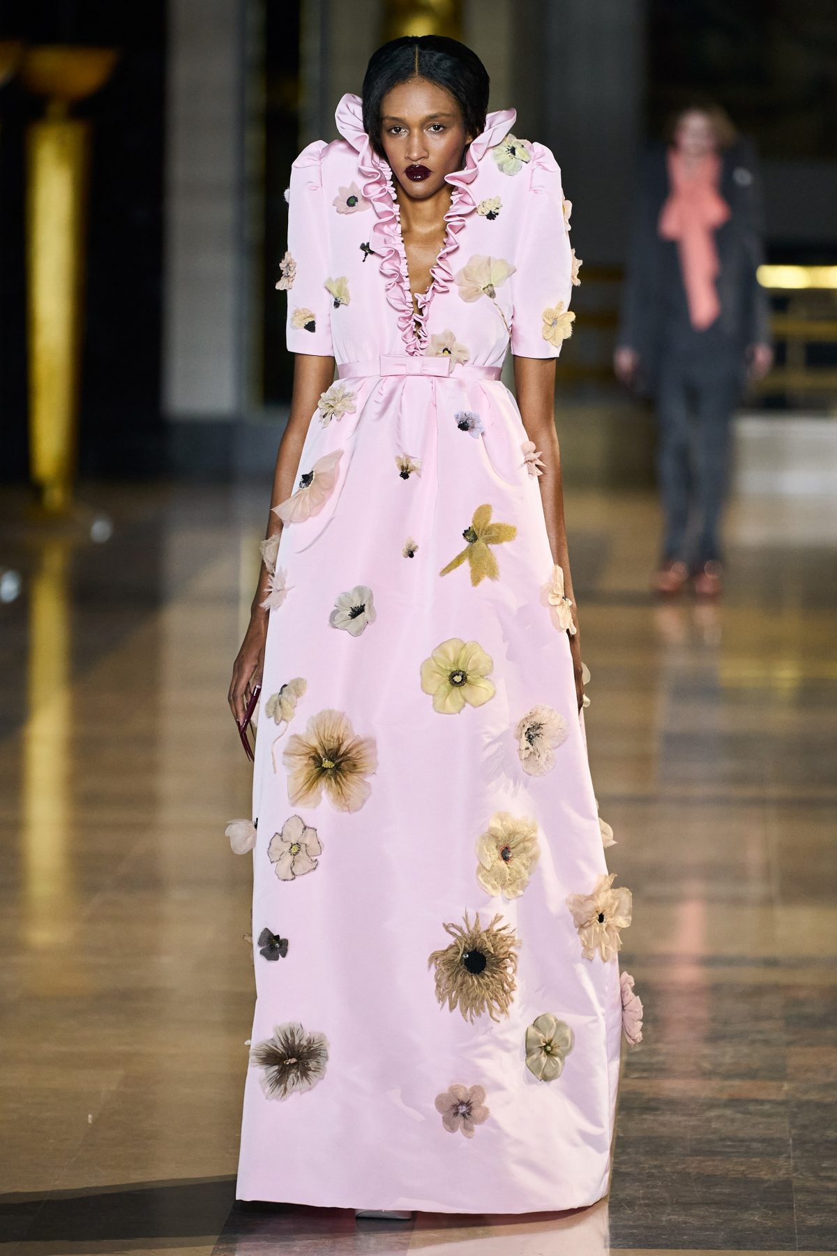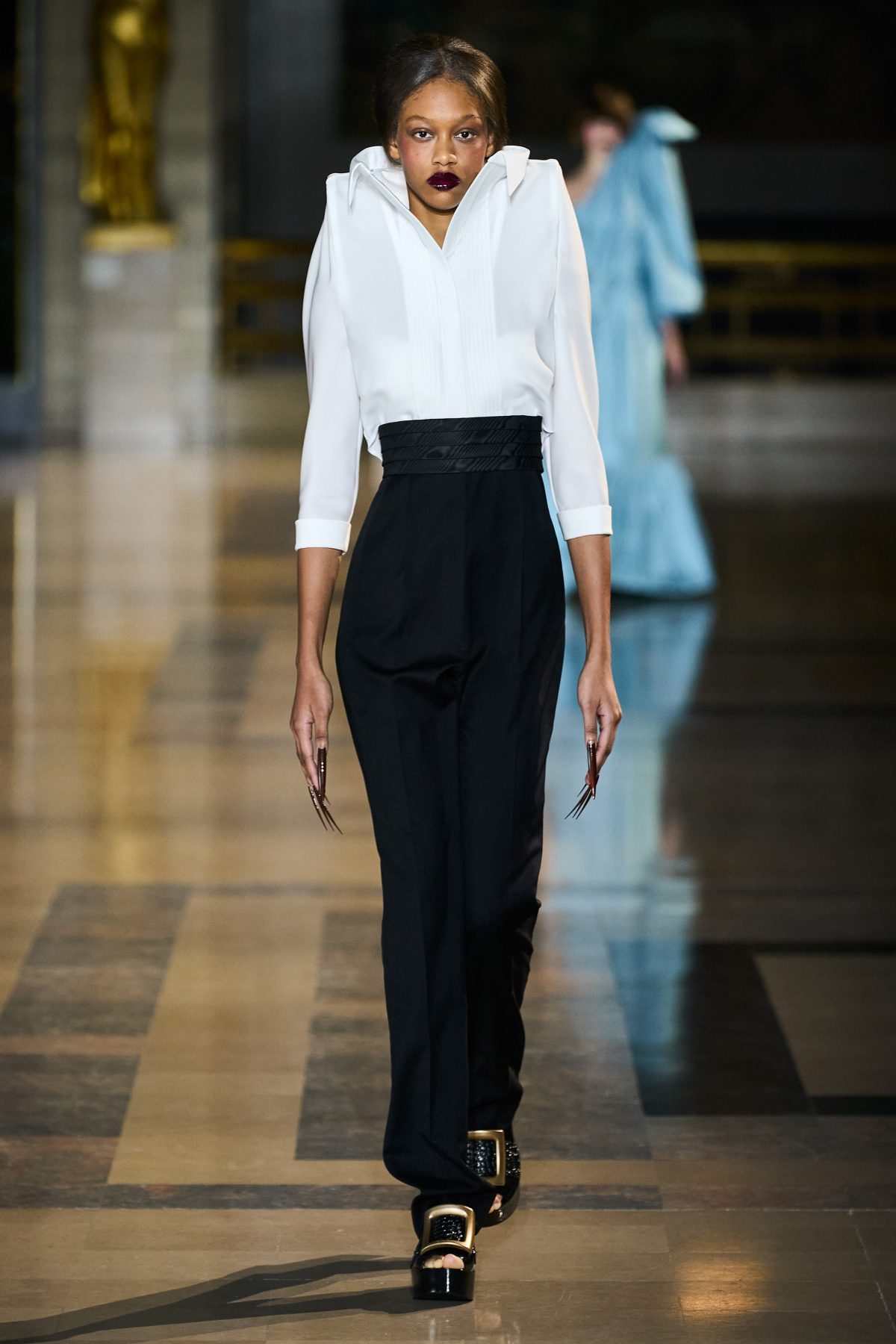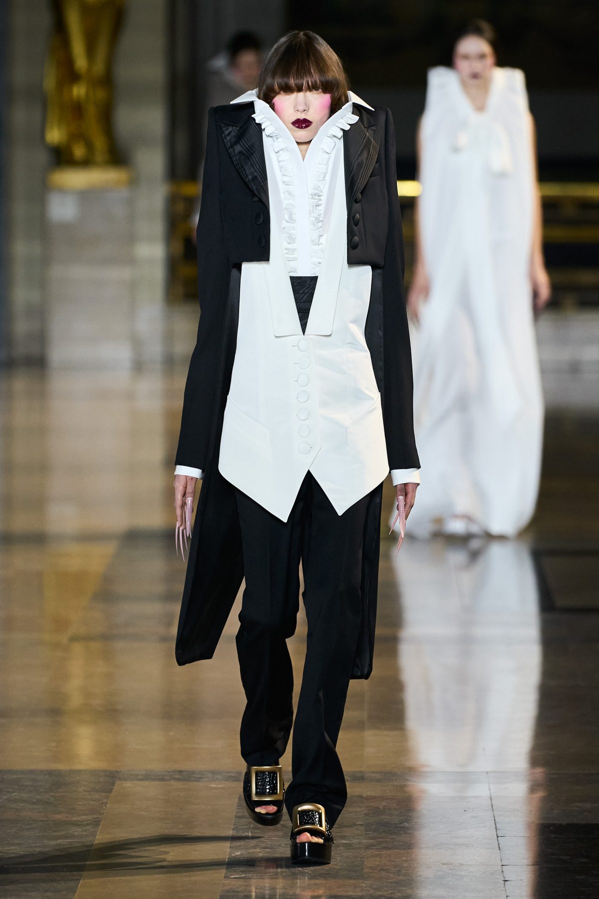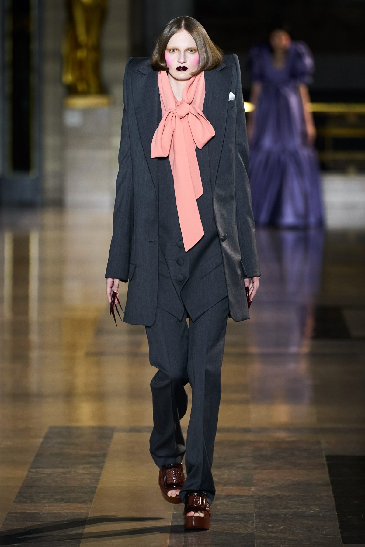 正如恐懼再次出現在當今世界之際,Viktor & Rolf 以「Surreal Shoulder」為題,設計師一方面參考了來自荷里活德古拉(Dracula)吸血鬼電影的標誌性形象(這曾象徵對社會變革的恐懼),又回顧了品牌在 1993 年發布的首個系列的肩線設計,帶來了一系列誇張地拉長和變形輪廓設計。