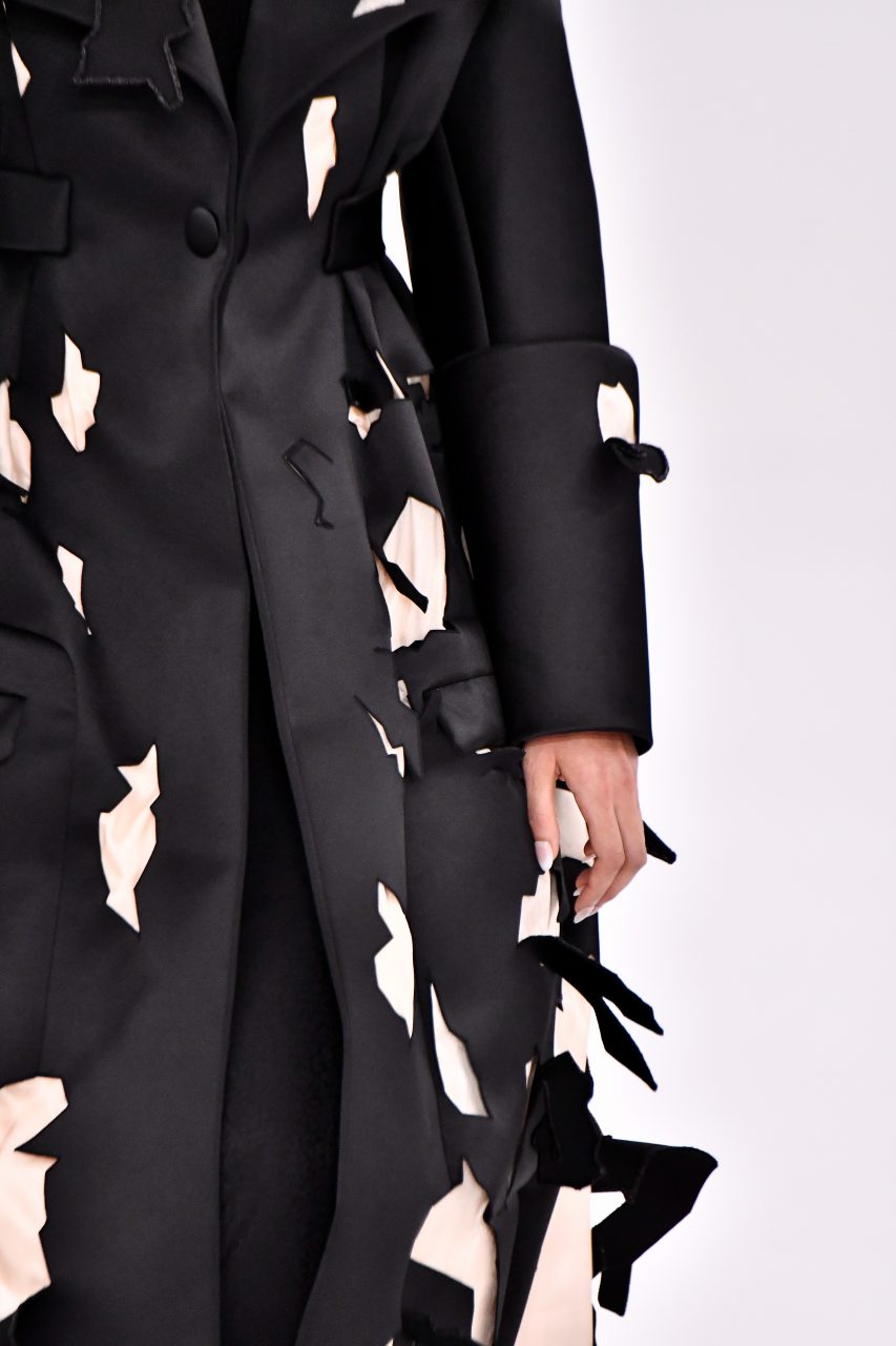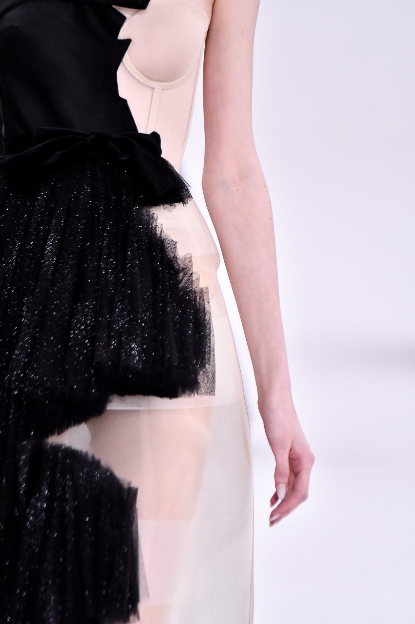 時裝騷分為七個小組,每個小組以一個完整的高訂造型為首,其後跟隨三個逐漸解構的實驗變體。具體的呈現形式有裁剪成剝落狀、撕扯掉半邊、僅剩一個輪廓、將最初的蝴蝶結放大後再撕裂、將裙擺裁出來作為披肩、薄紗裙子凹陷、腰部被揭開······