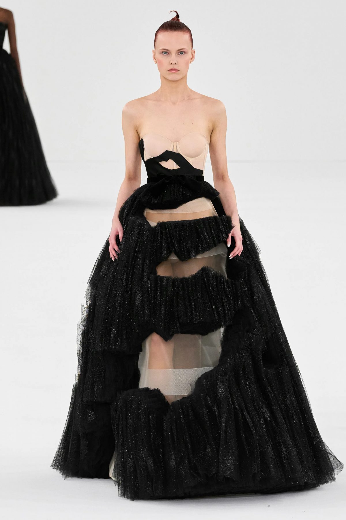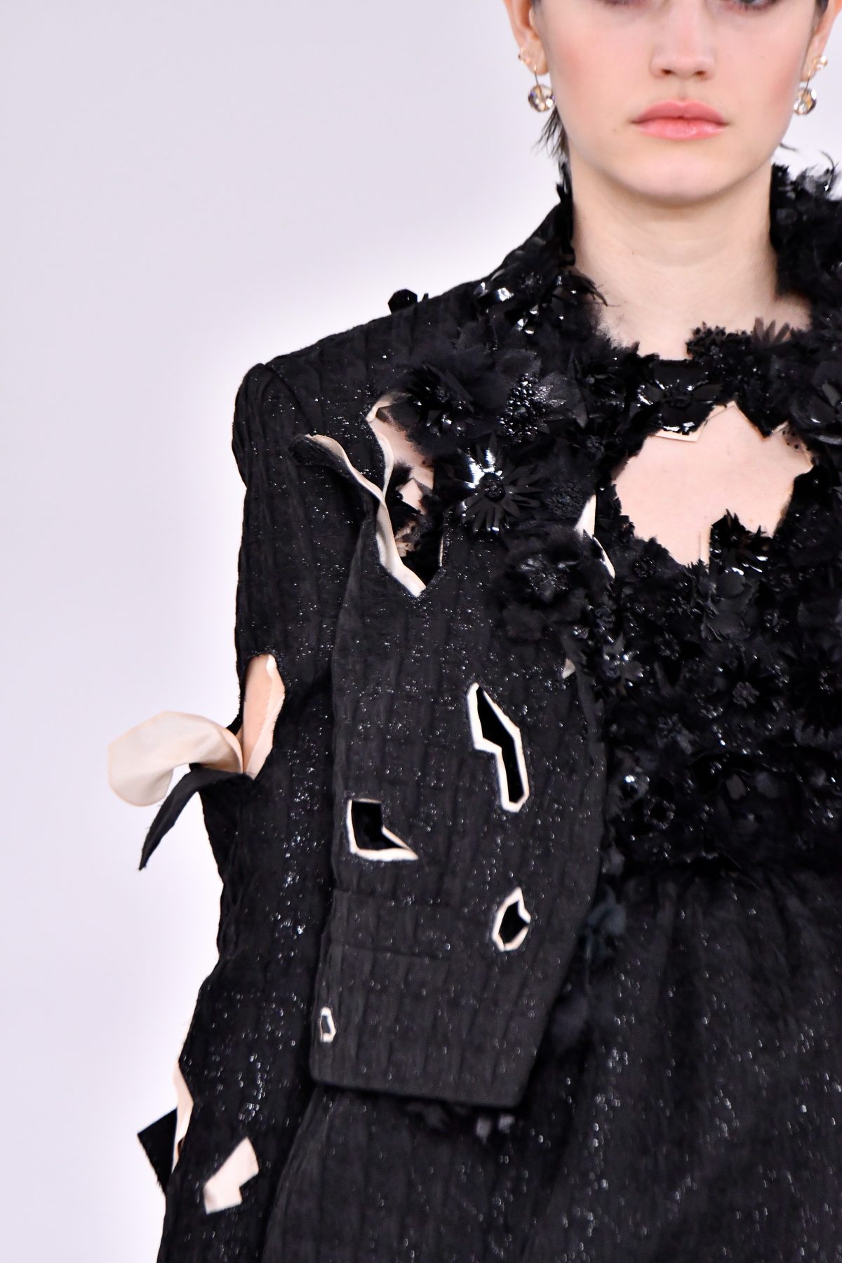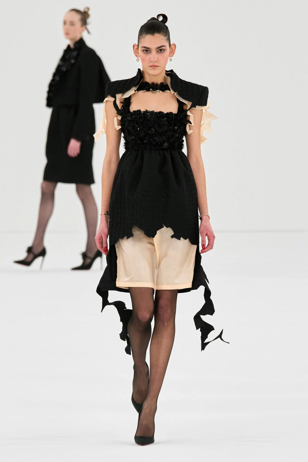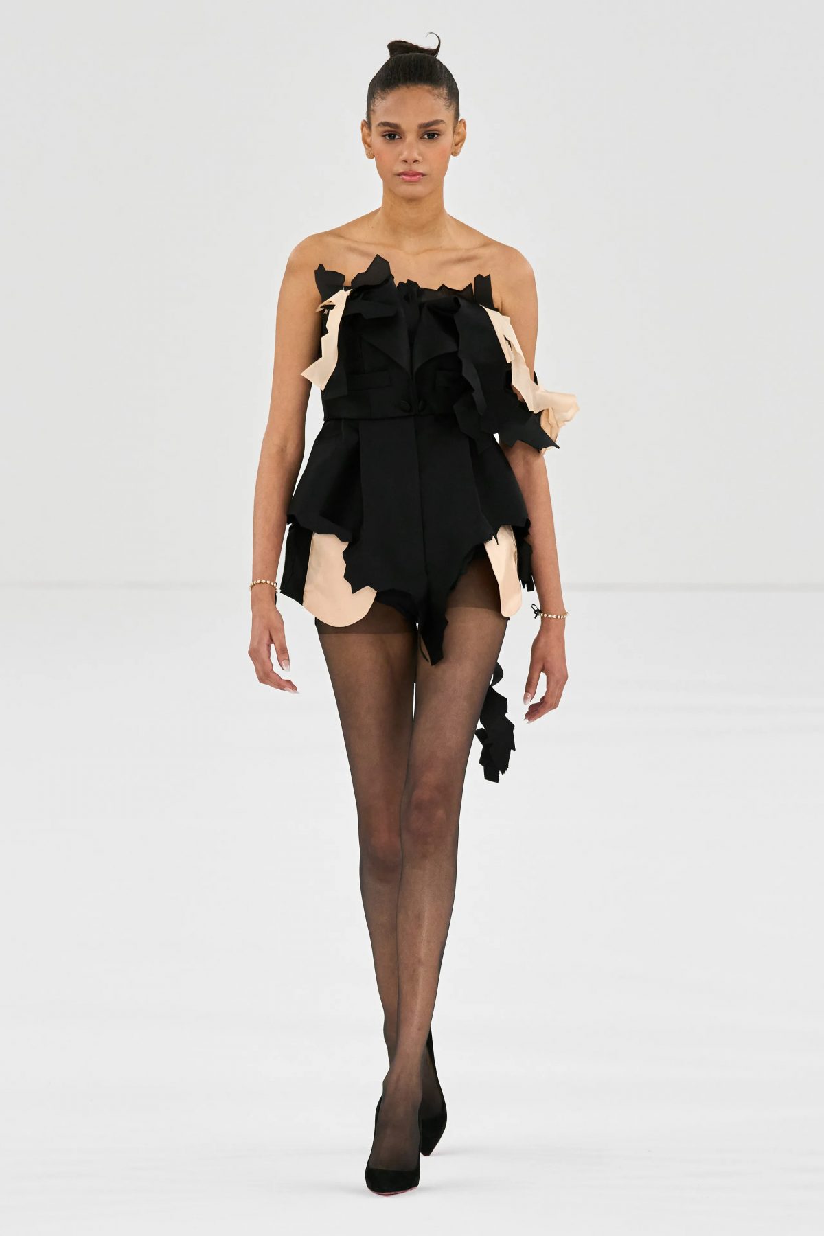 時裝騷分為七個小組,每個小組以一個完整的高訂造型為首,其後跟隨三個逐漸解構的實驗變體。具體的呈現形式有裁剪成剝落狀、撕扯掉半邊、僅剩一個輪廓、將最初的蝴蝶結放大後再撕裂、將裙擺裁出來作為披肩、薄紗裙子凹陷、腰部被揭開······