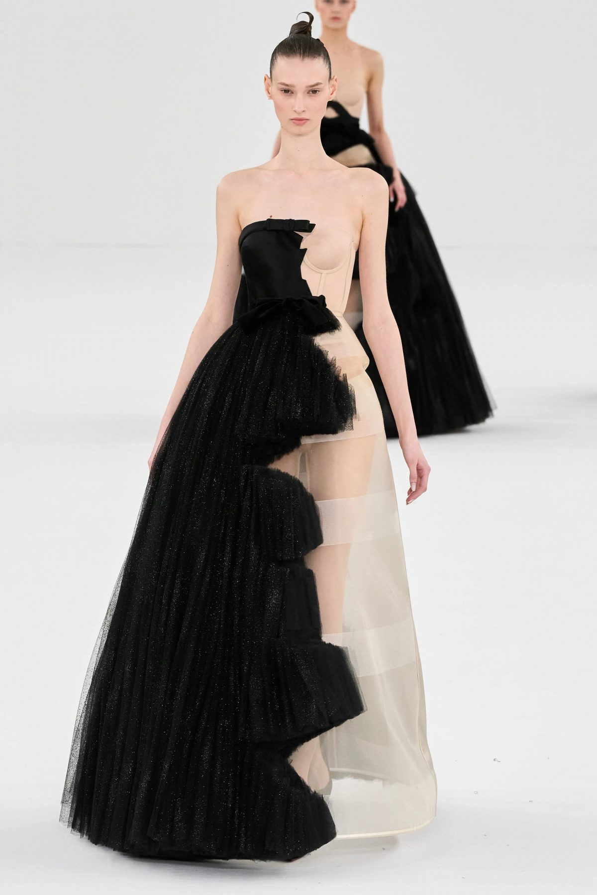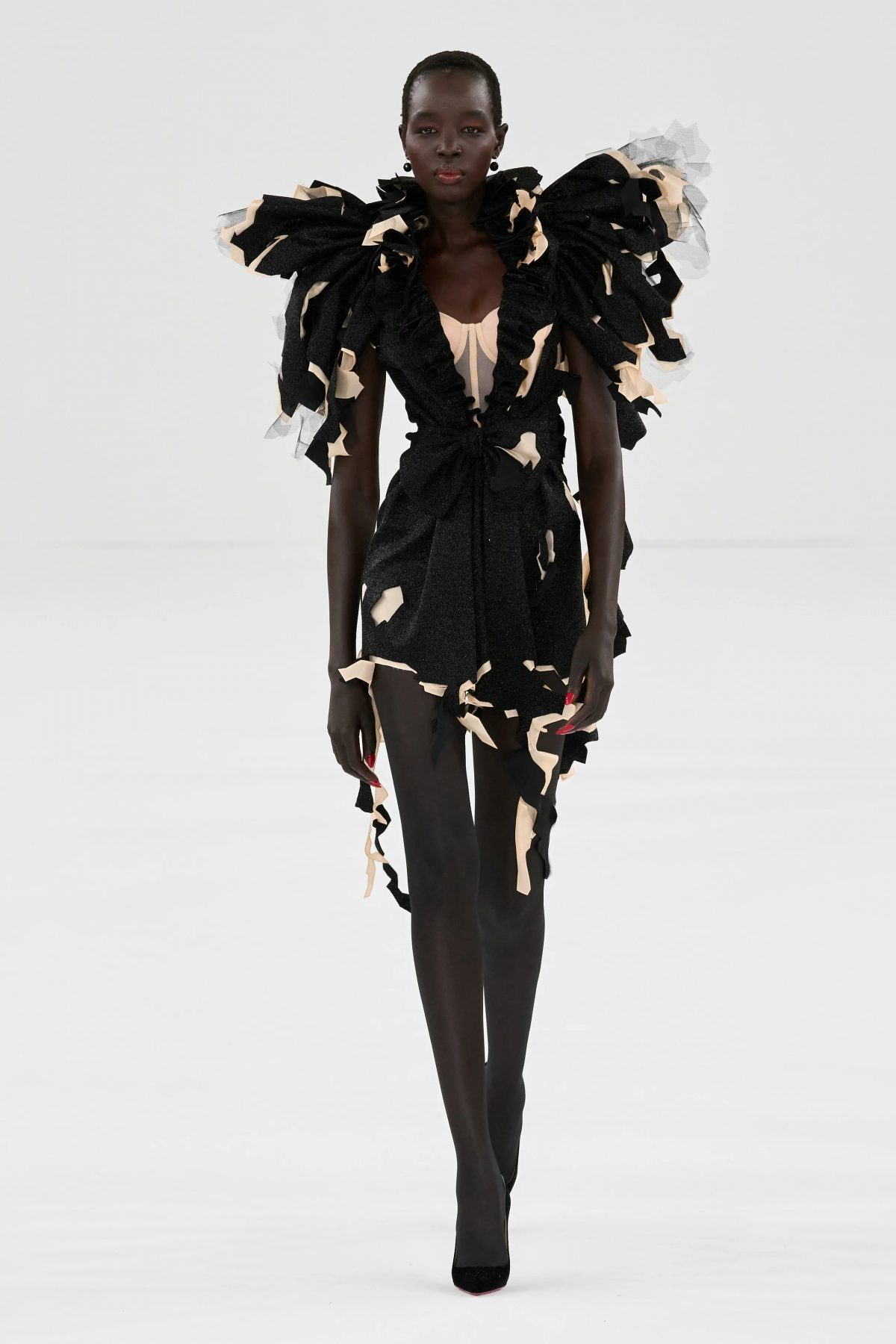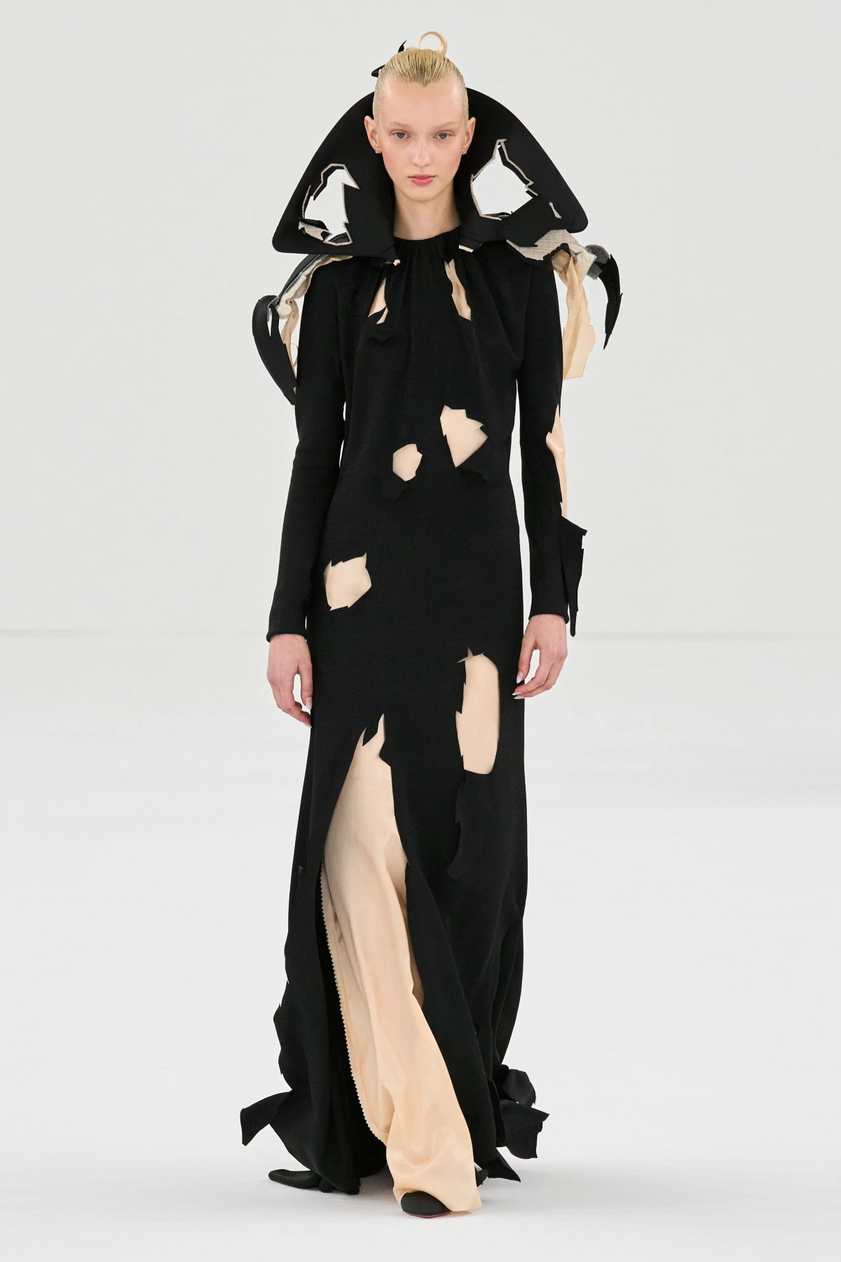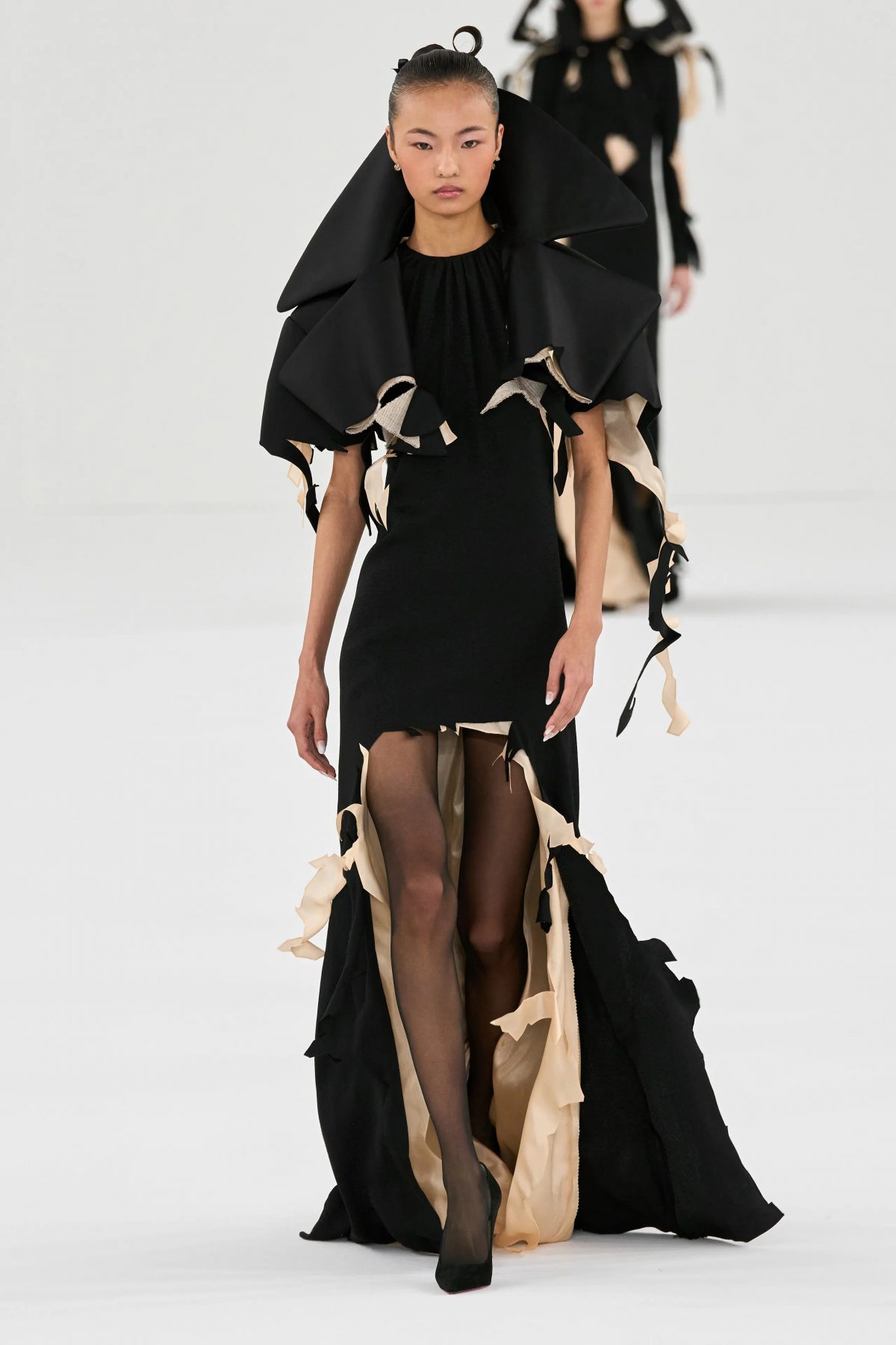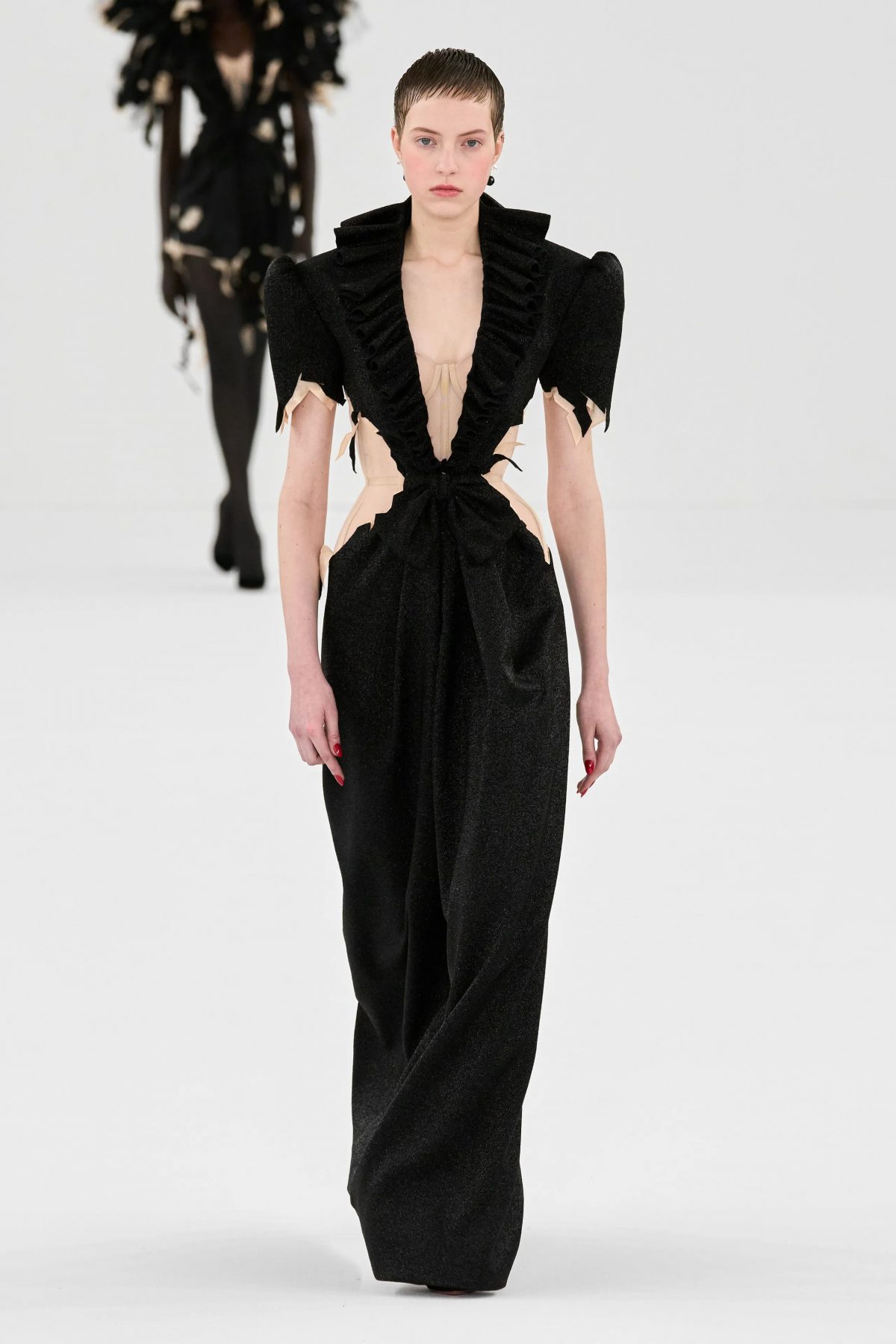 時裝騷分為七個小組,每個小組以一個完整的高訂造型為首,其後跟隨三個逐漸解構的實驗變體。具體的呈現形式有裁剪成剝落狀、撕扯掉半邊、僅剩一個輪廓、將最初的蝴蝶結放大後再撕裂、將裙擺裁出來作為披肩、薄紗裙子凹陷、腰部被揭開······