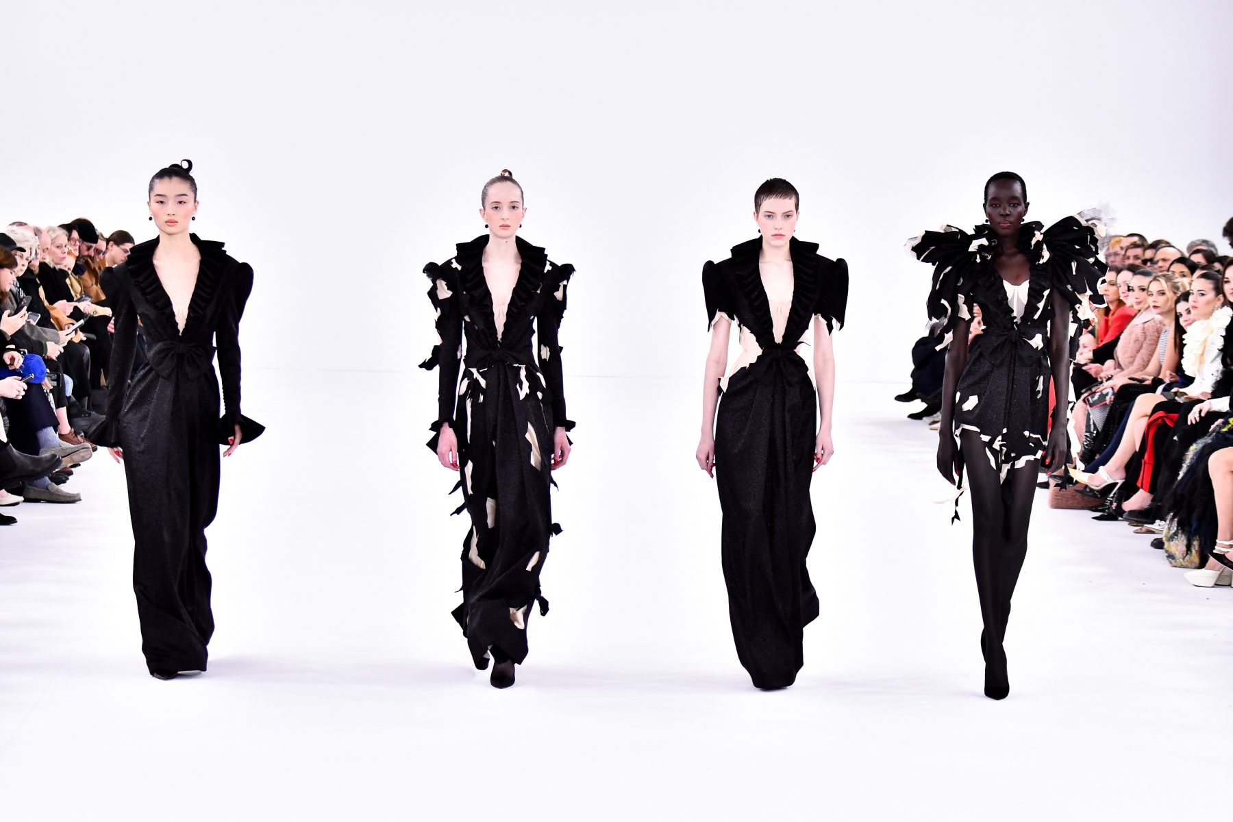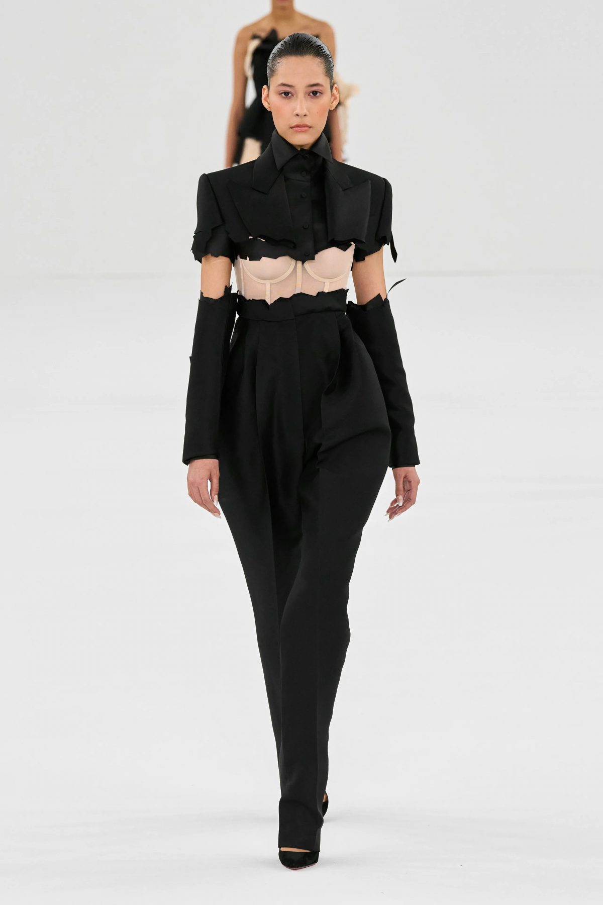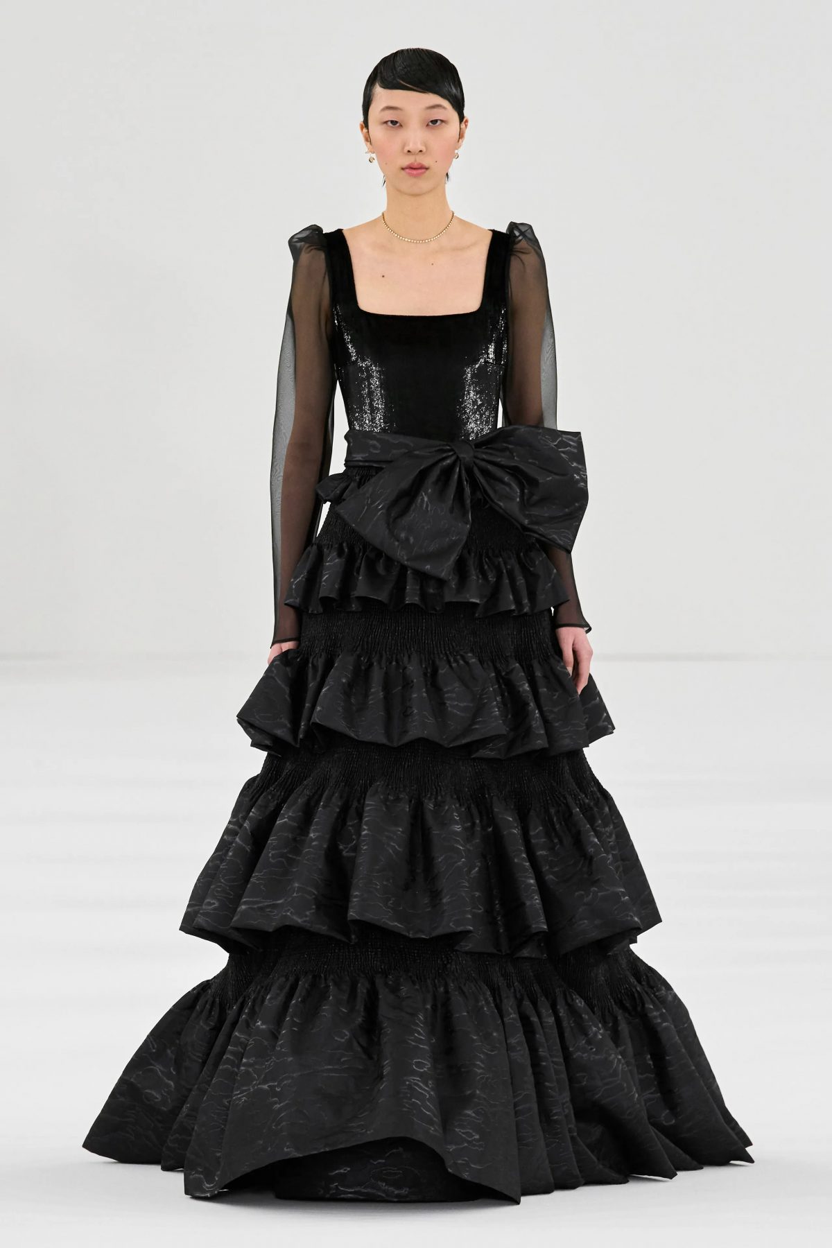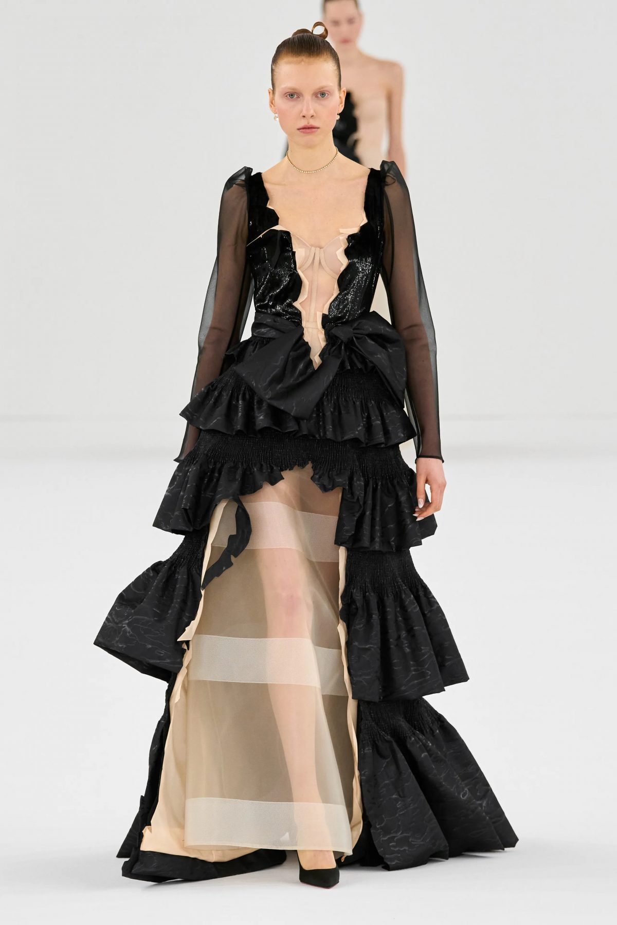 時裝騷分為七個小組,每個小組以一個完整的高訂造型為首,其後跟隨三個逐漸解構的實驗變體。具體的呈現形式有裁剪成剝落狀、撕扯掉半邊、僅剩一個輪廓、將最初的蝴蝶結放大後再撕裂、將裙擺裁出來作為披肩、薄紗裙子凹陷、腰部被揭開······