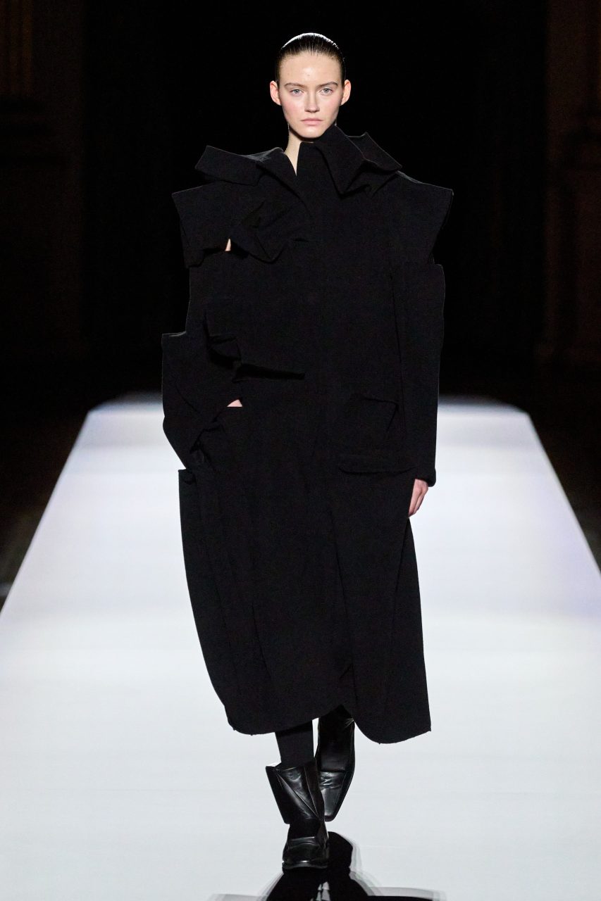 山本先生有着「極簡主義大師」的稱號,而從這場時裝展的第一位模特兒步出,你便能親身感受到其「極簡」之處——現場並沒有任何配樂,只有模特兒在木製走道上步行的鞋踏聲,她穿着能夠融入黑暗背景的極致全黑造型,讓你幾乎只能看到不規則的大衣造型廓形。白色穿插於全黑造型之間的,被加入到黑色服飾上的白色布料成為了主角,兩者如同影子般互相補替,讓人聯想起經典的 Noir 風格電影。