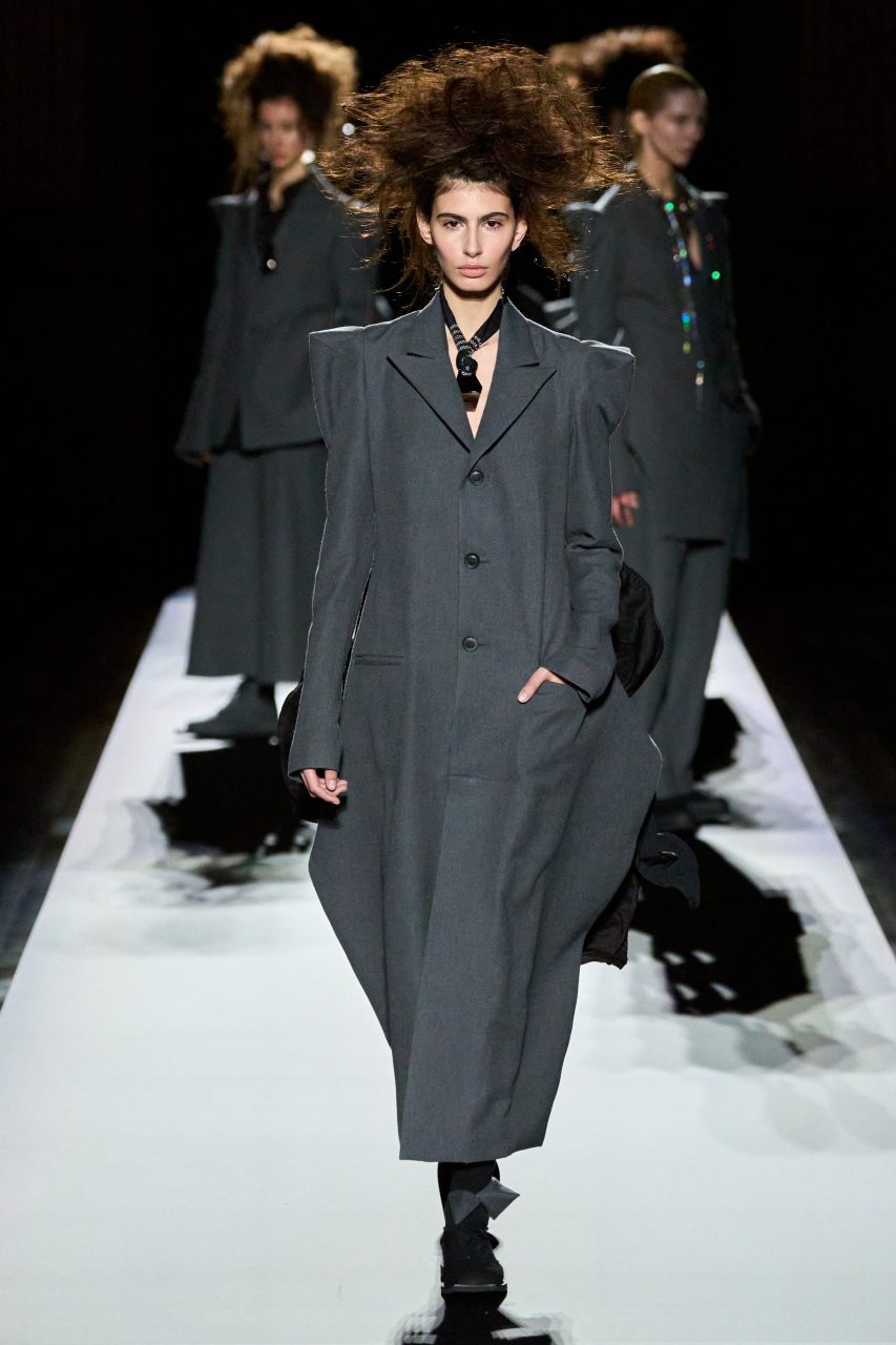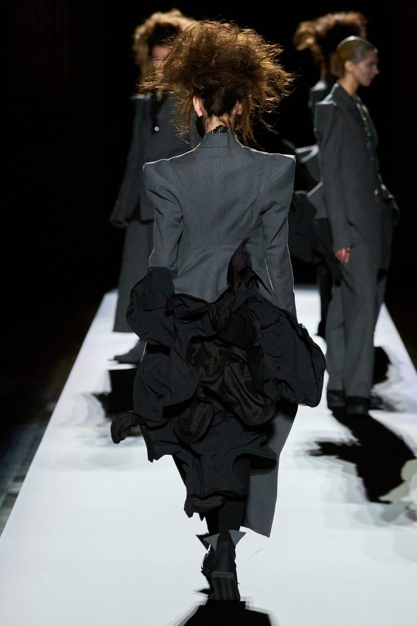 在四十多年來的多場時裝展中,山本先生創作出無數的西裝外套,風格一致,卻從不重複,獨特剪裁顯然已經成為了品牌標誌之一。在時裝展的最後,是五套黑配灰的西裝造型,他們有着一模一樣的尖銳雙肩,她們有些穿着黑襯衣,有些帶着浮誇珠寶,正當大家以為設計師將以五套剪裁良好的西裝結束本季系列,模特兒轉身展示出隱藏在背後的有趣巧思——外套底下是原創的不規則裝飾,它們逐個變大,最終成為綻放的黑色花卉。