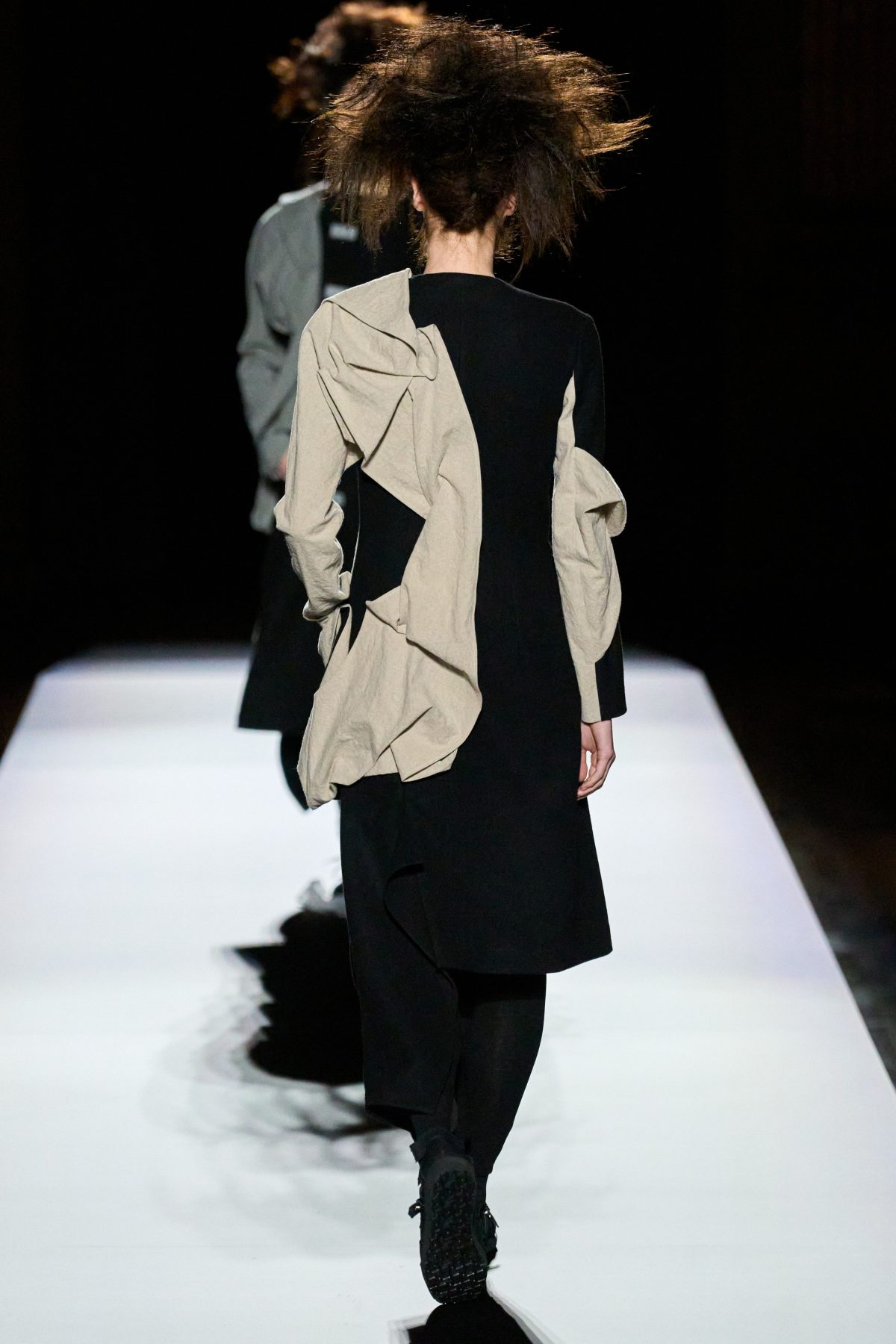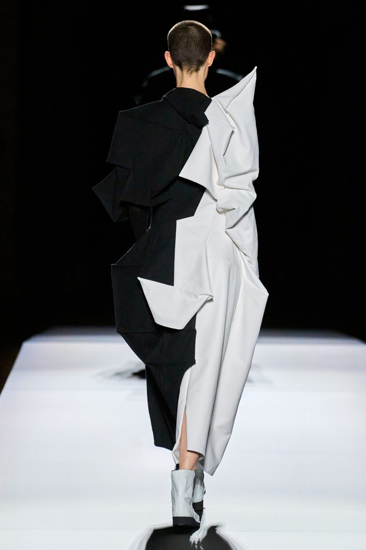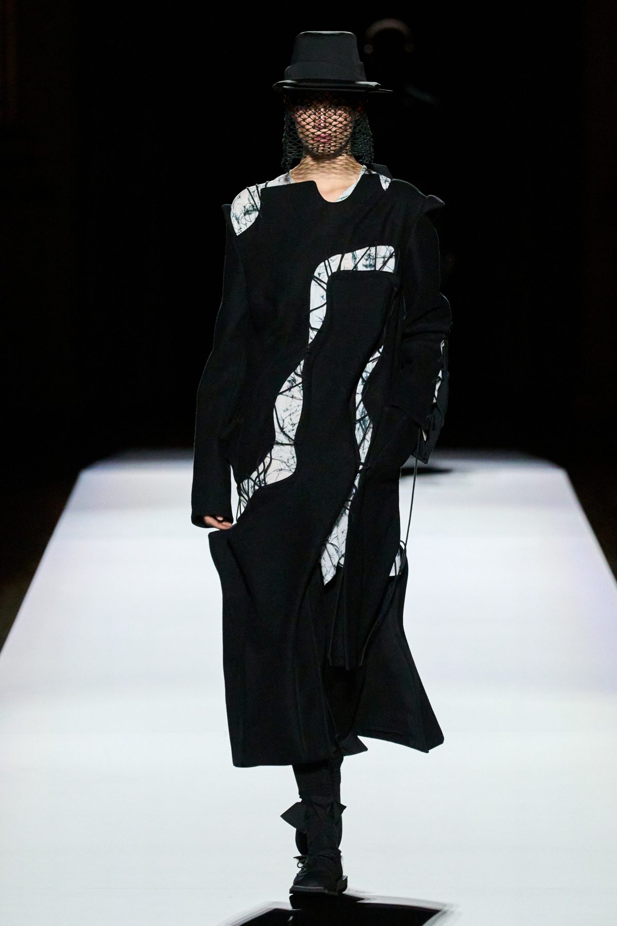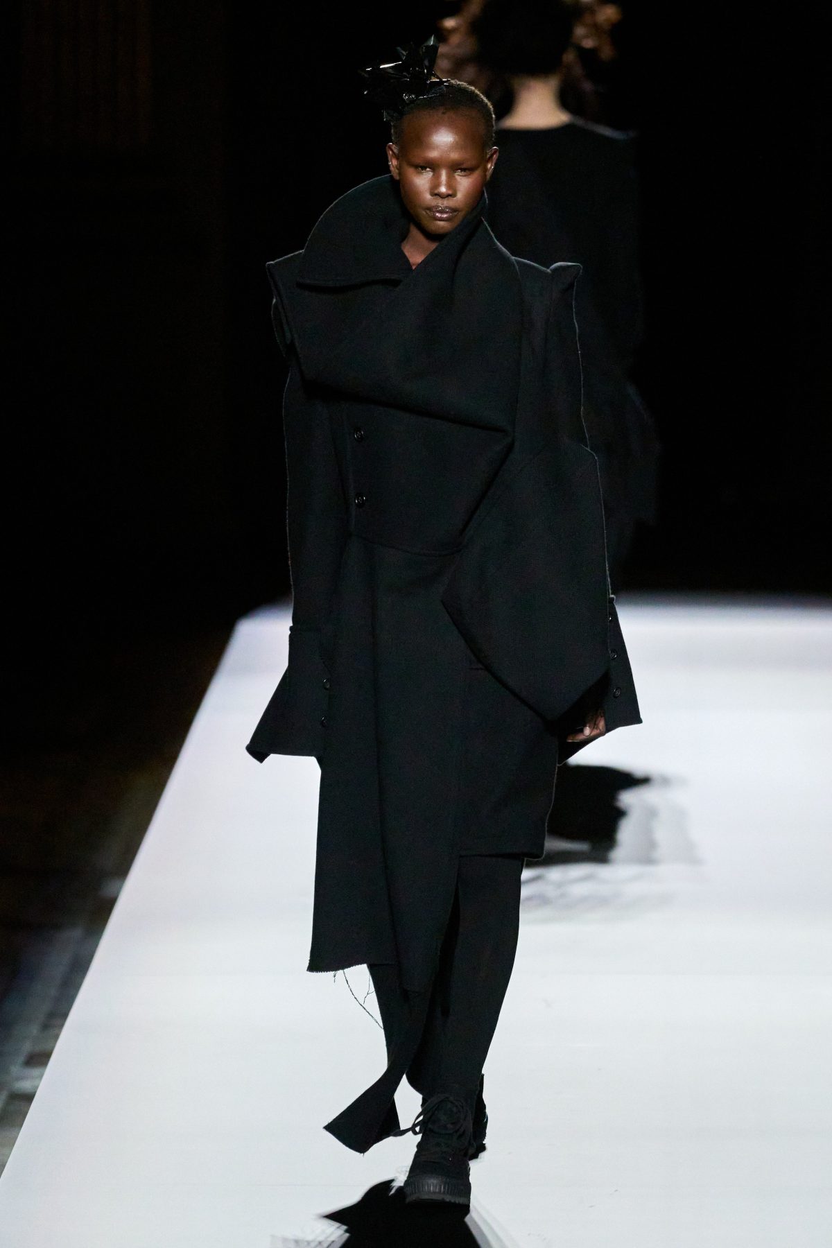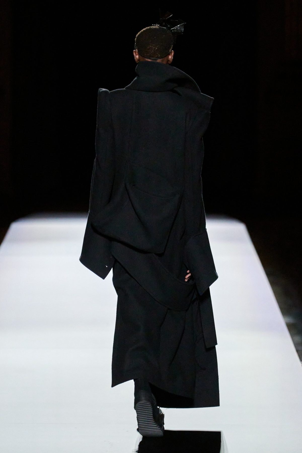 山本先生有着「極簡主義大師」的稱號,而從這場時裝展的第一位模特兒步出,你便能親身感受到其「極簡」之處——現場並沒有任何配樂,只有模特兒在木製走道上步行的鞋踏聲,她穿着能夠融入黑暗背景的極致全黑造型,讓你幾乎只能看到不規則的大衣造型廓形。白色穿插於全黑造型之間的,被加入到黑色服飾上的白色布料成為了主角,兩者如同影子般互相補替,讓人聯想起經典的 Noir 風格電影。