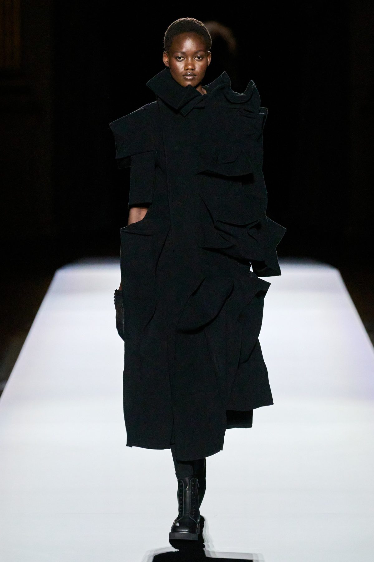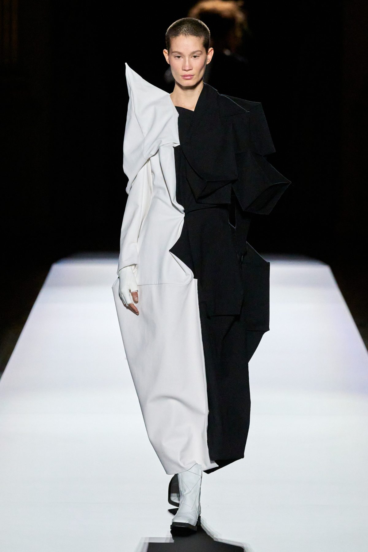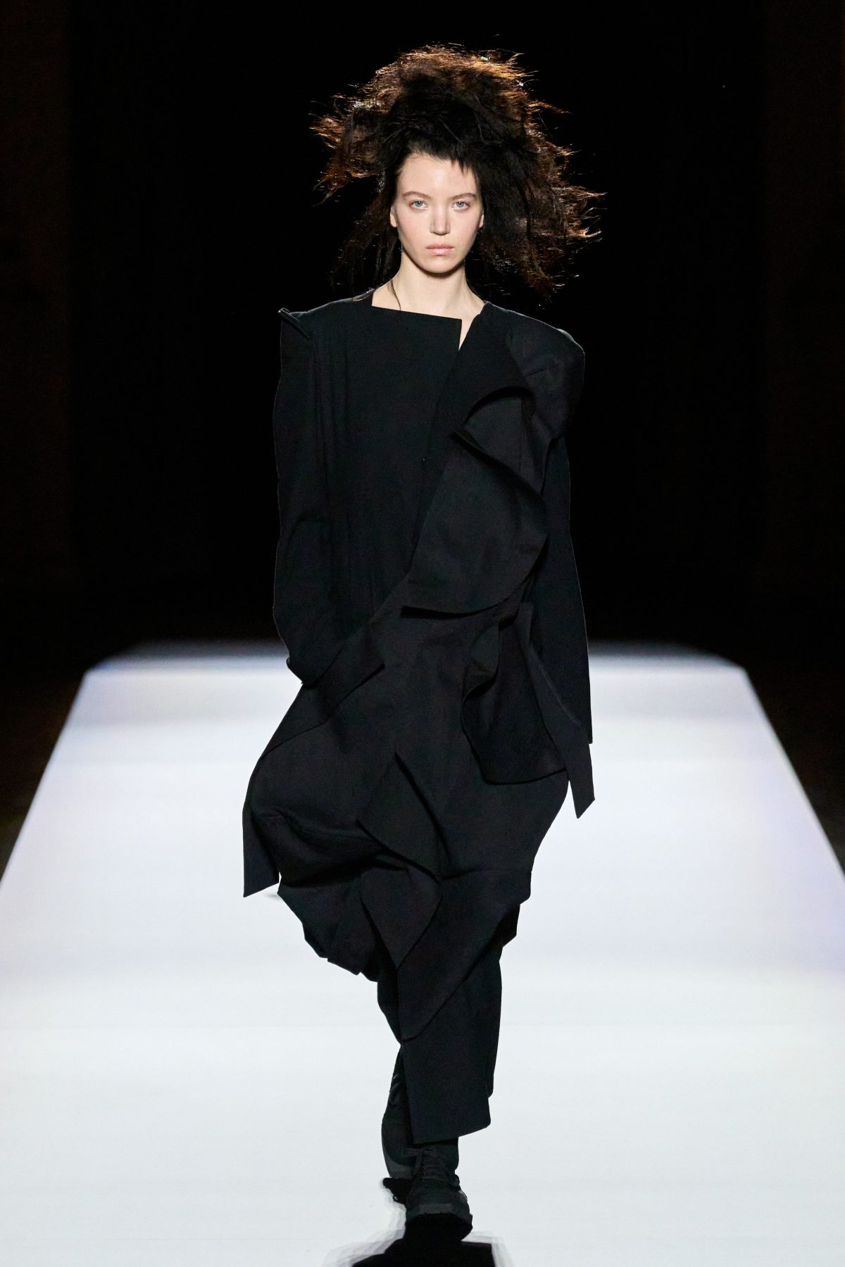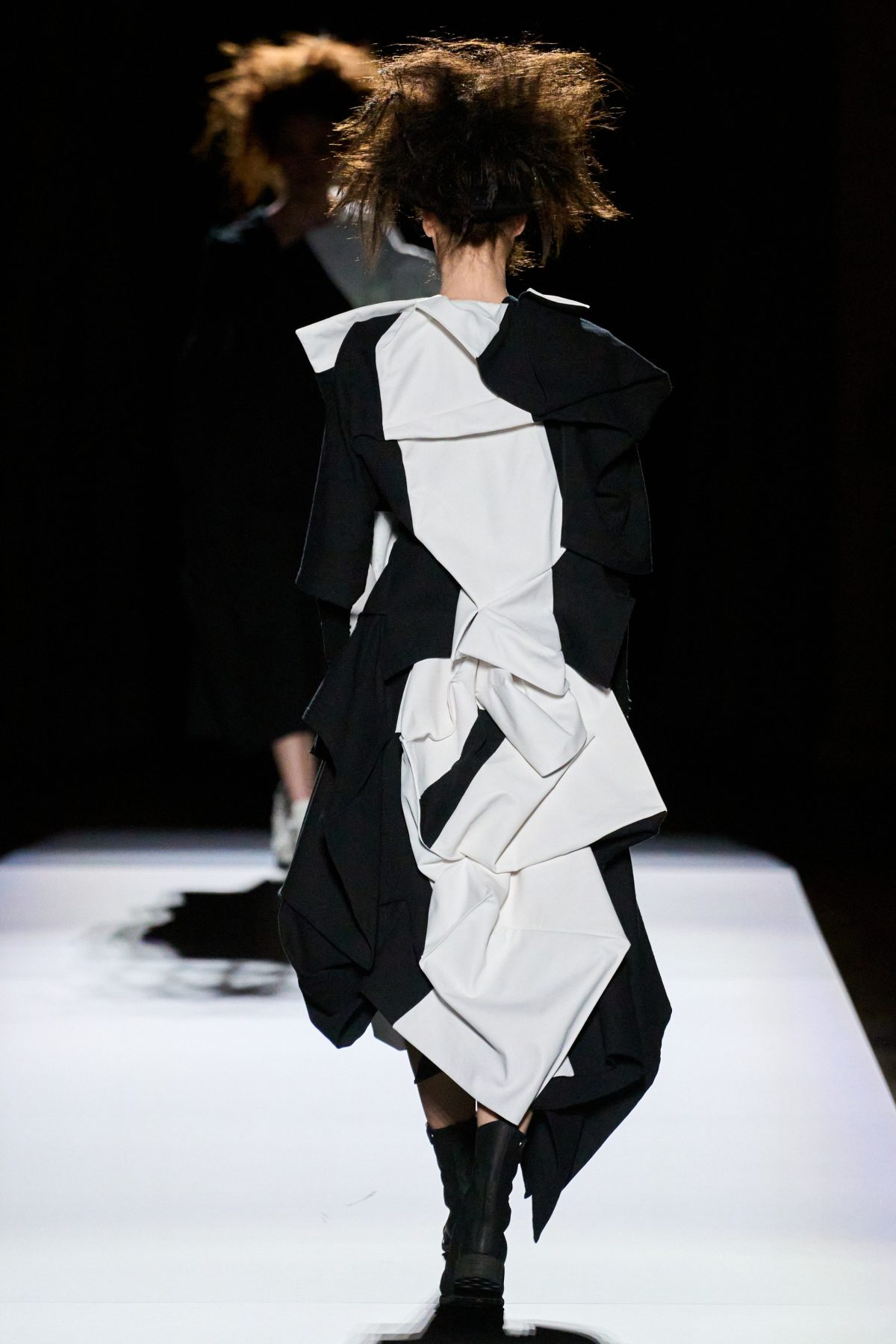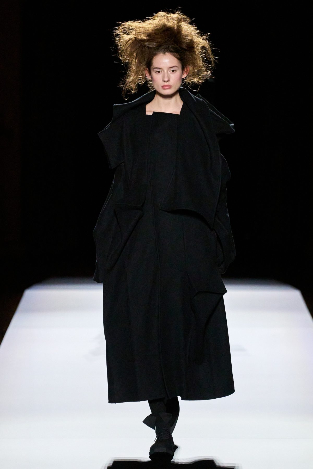 山本先生有着「極簡主義大師」的稱號,而從這場時裝展的第一位模特兒步出,你便能親身感受到其「極簡」之處——現場並沒有任何配樂,只有模特兒在木製走道上步行的鞋踏聲,她穿着能夠融入黑暗背景的極致全黑造型,讓你幾乎只能看到不規則的大衣造型廓形。白色穿插於全黑造型之間的,被加入到黑色服飾上的白色布料成為了主角,兩者如同影子般互相補替,讓人聯想起經典的 Noir 風格電影。