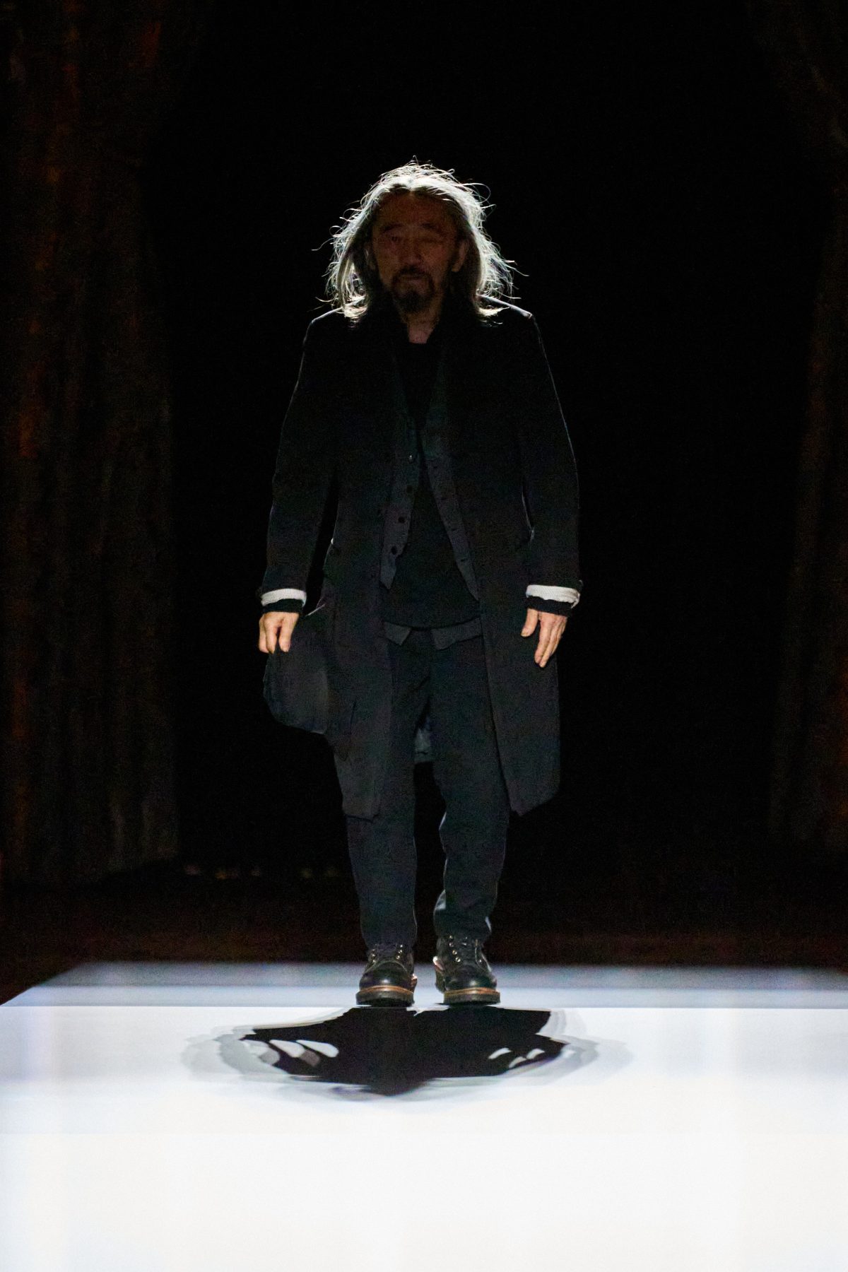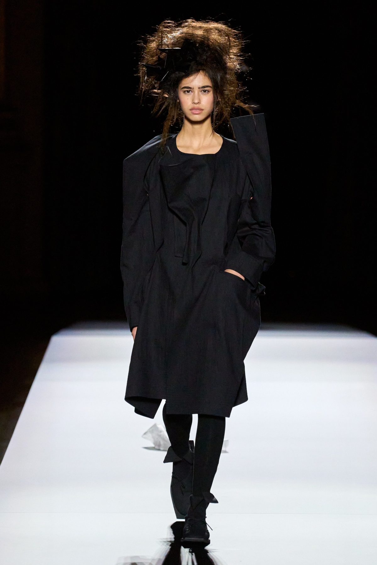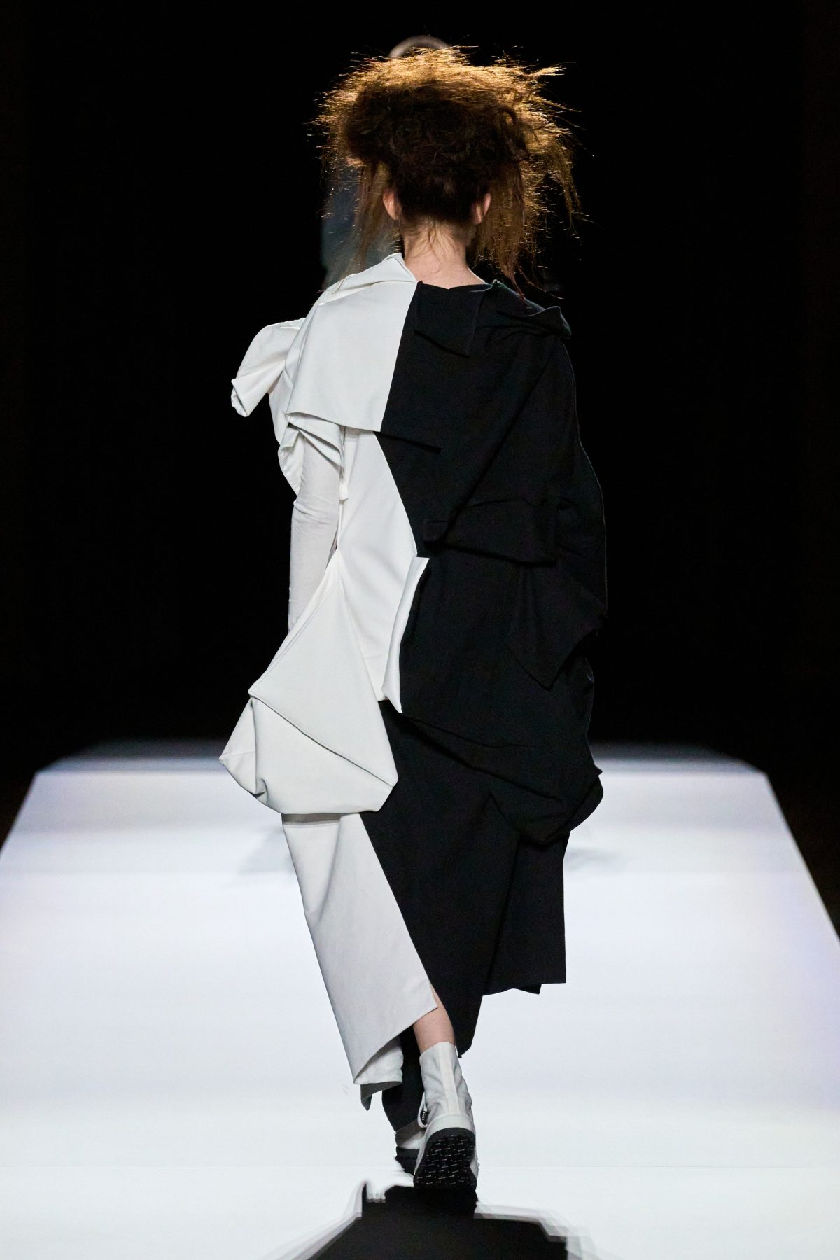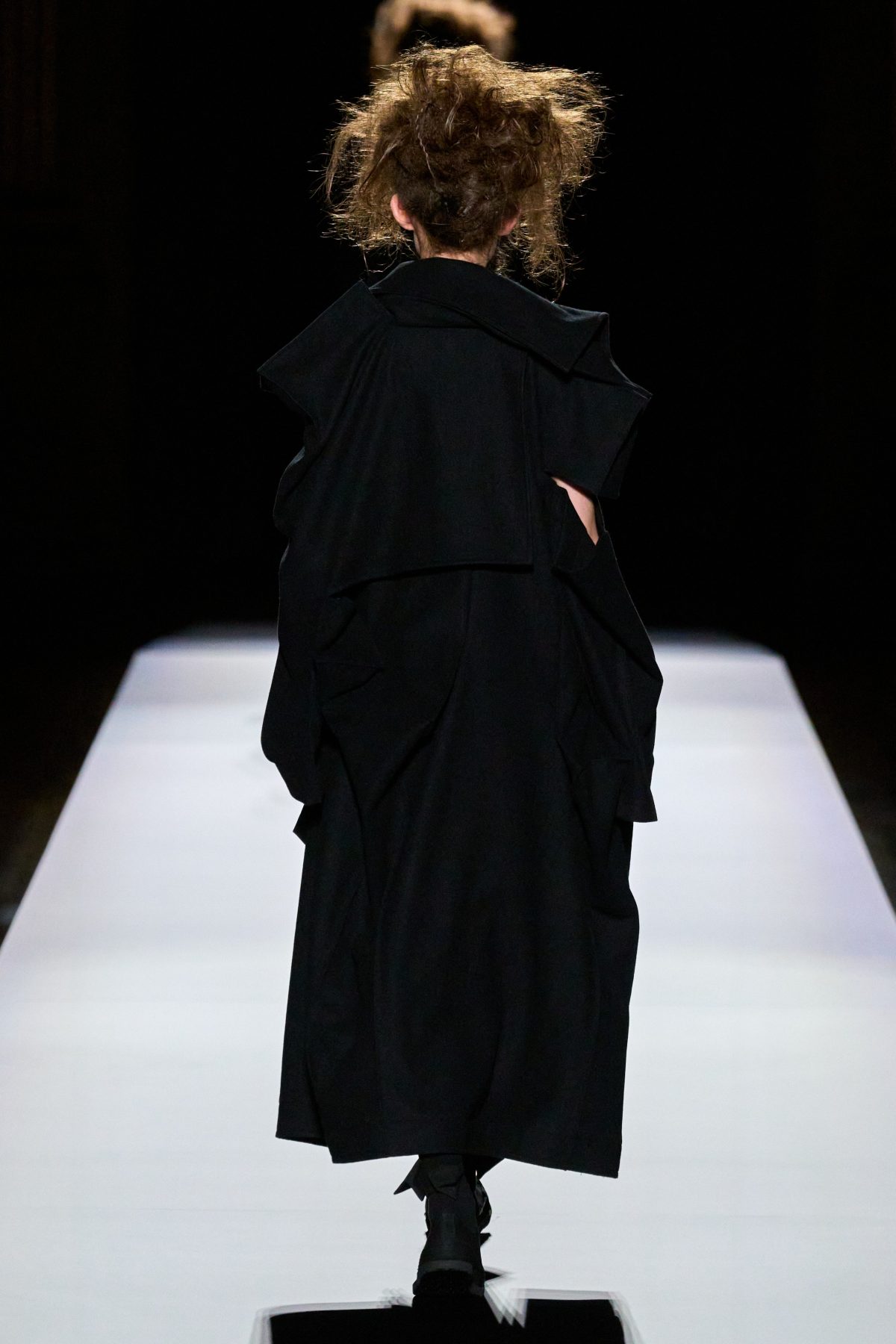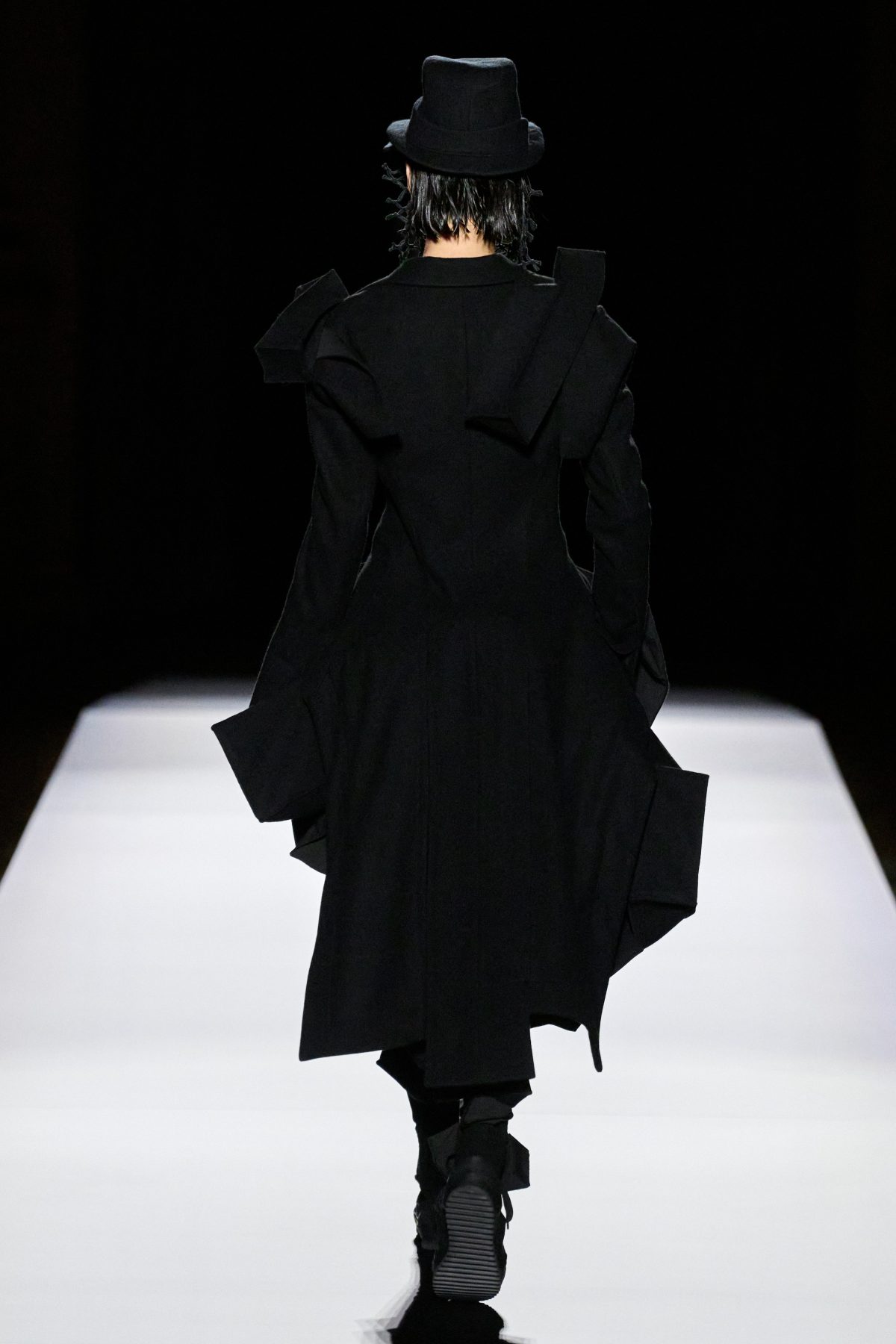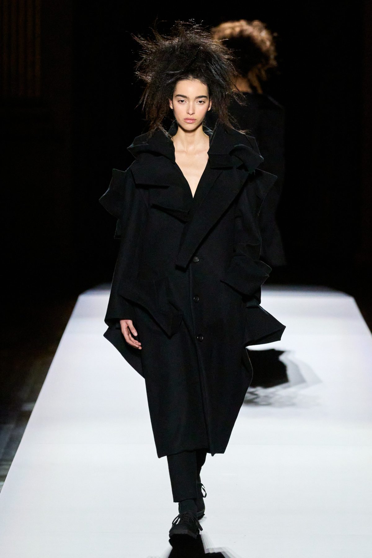 山本先生有着「極簡主義大師」的稱號,而從這場時裝展的第一位模特兒步出,你便能親身感受到其「極簡」之處——現場並沒有任何配樂,只有模特兒在木製走道上步行的鞋踏聲,她穿着能夠融入黑暗背景的極致全黑造型,讓你幾乎只能看到不規則的大衣造型廓形。白色穿插於全黑造型之間的,被加入到黑色服飾上的白色布料成為了主角,兩者如同影子般互相補替,讓人聯想起經典的 Noir 風格電影。