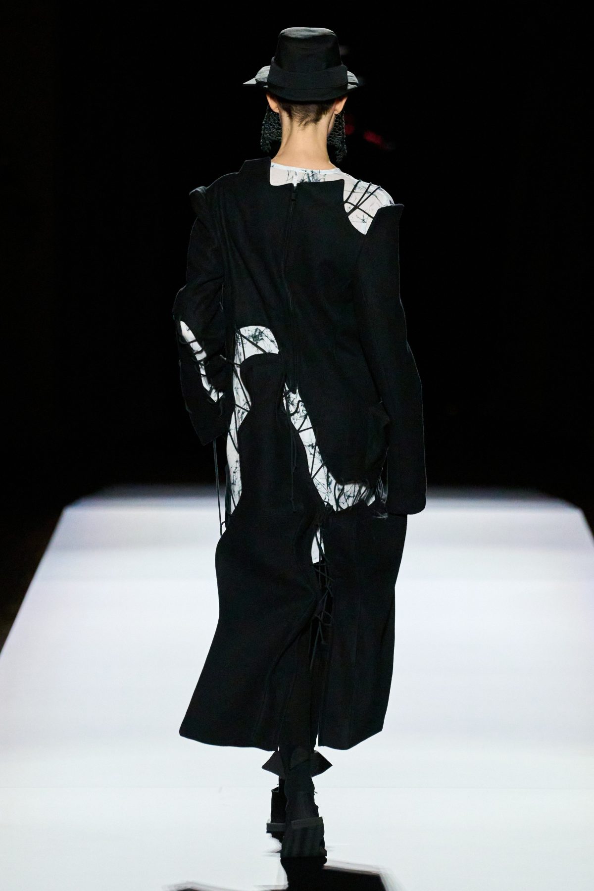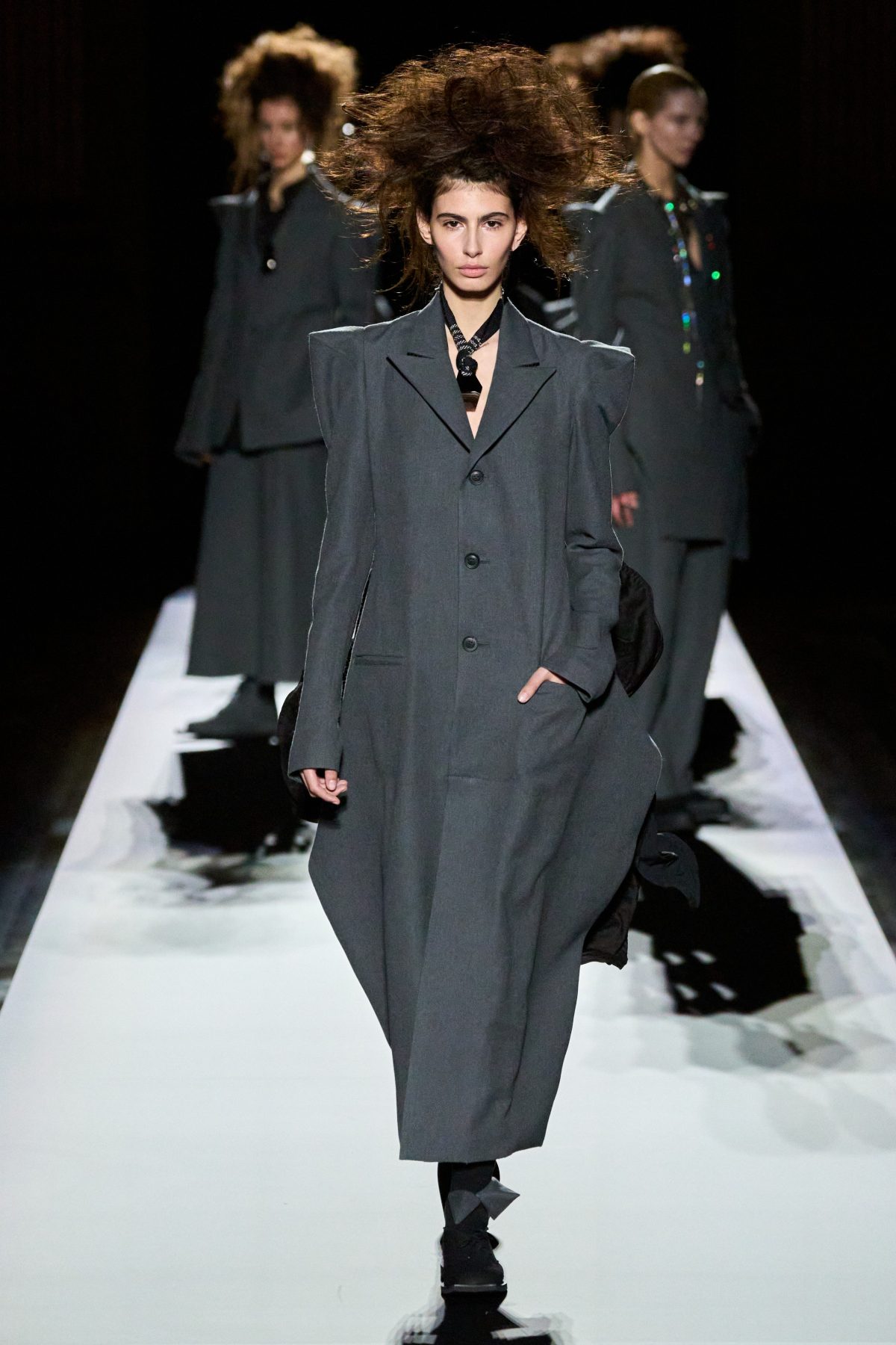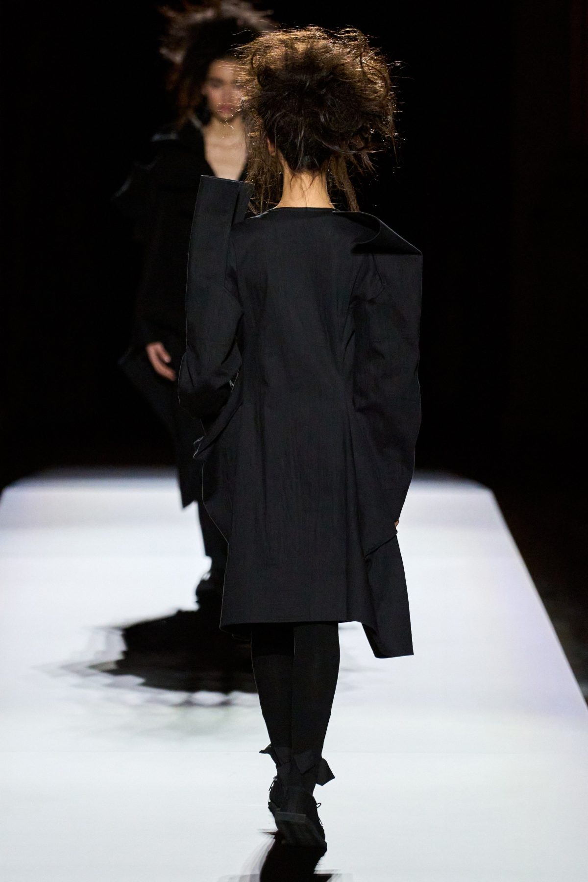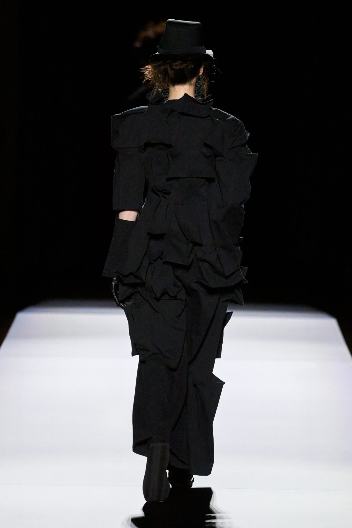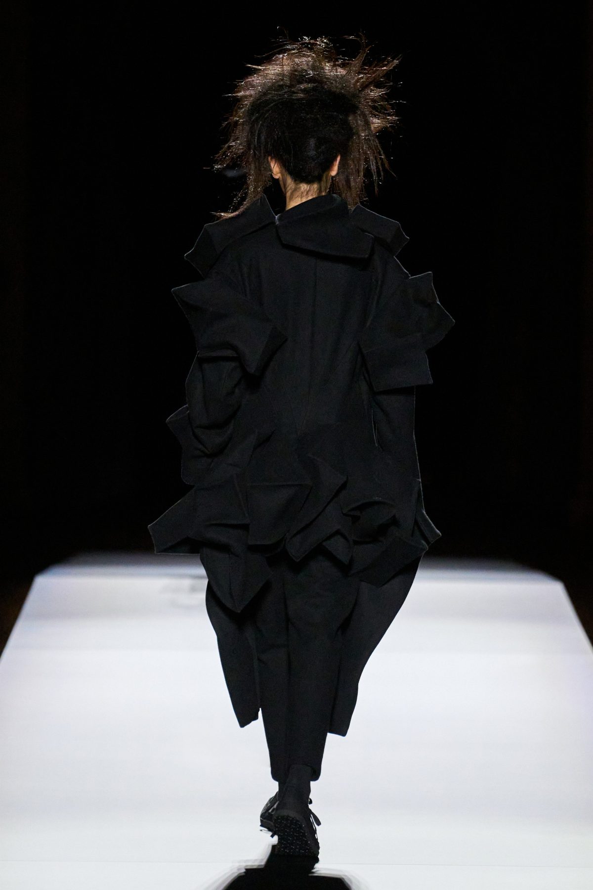 山本先生有着「極簡主義大師」的稱號,而從這場時裝展的第一位模特兒步出,你便能親身感受到其「極簡」之處——現場並沒有任何配樂,只有模特兒在木製走道上步行的鞋踏聲,她穿着能夠融入黑暗背景的極致全黑造型,讓你幾乎只能看到不規則的大衣造型廓形。白色穿插於全黑造型之間的,被加入到黑色服飾上的白色布料成為了主角,兩者如同影子般互相補替,讓人聯想起經典的 Noir 風格電影。