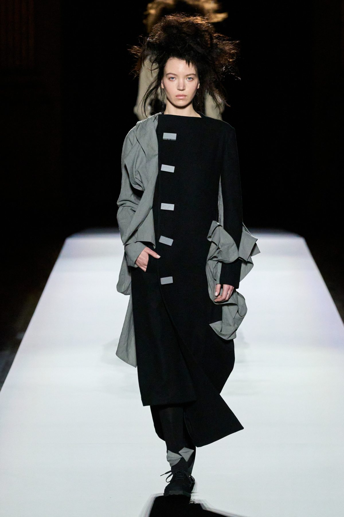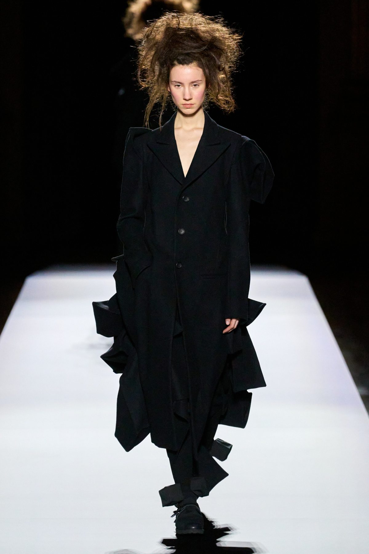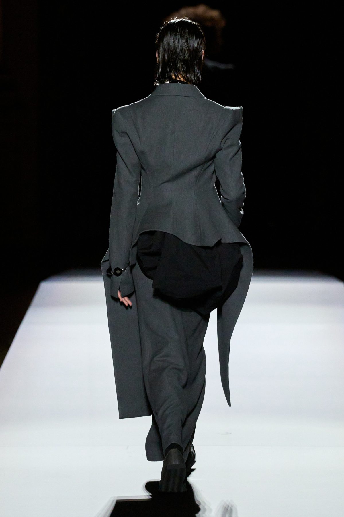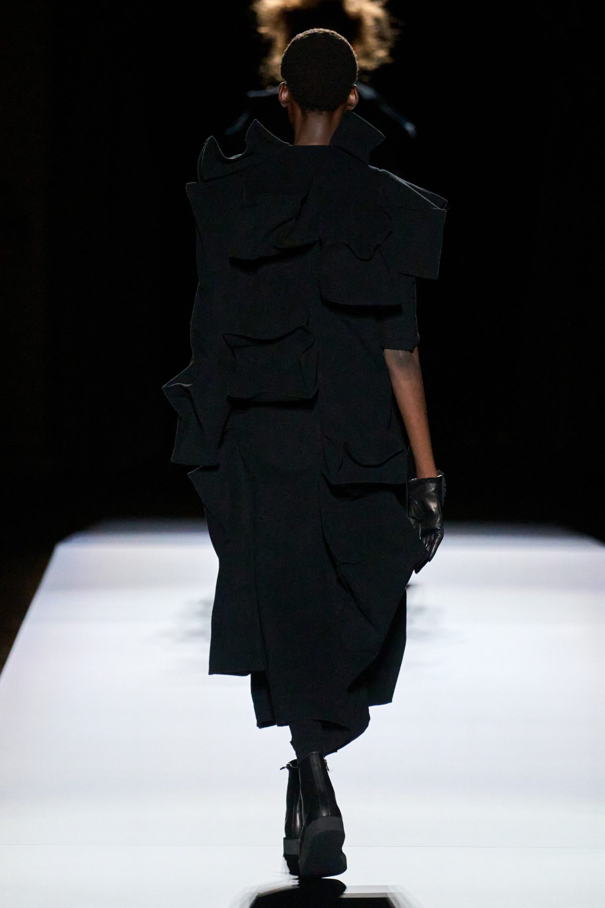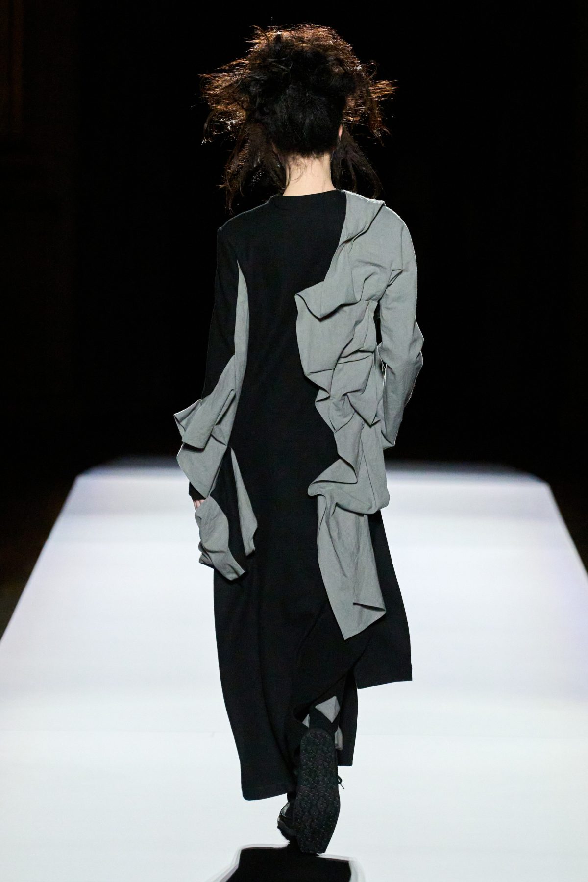 山本先生有着「極簡主義大師」的稱號,而從這場時裝展的第一位模特兒步出,你便能親身感受到其「極簡」之處——現場並沒有任何配樂,只有模特兒在木製走道上步行的鞋踏聲,她穿着能夠融入黑暗背景的極致全黑造型,讓你幾乎只能看到不規則的大衣造型廓形。白色穿插於全黑造型之間的,被加入到黑色服飾上的白色布料成為了主角,兩者如同影子般互相補替,讓人聯想起經典的 Noir 風格電影。
