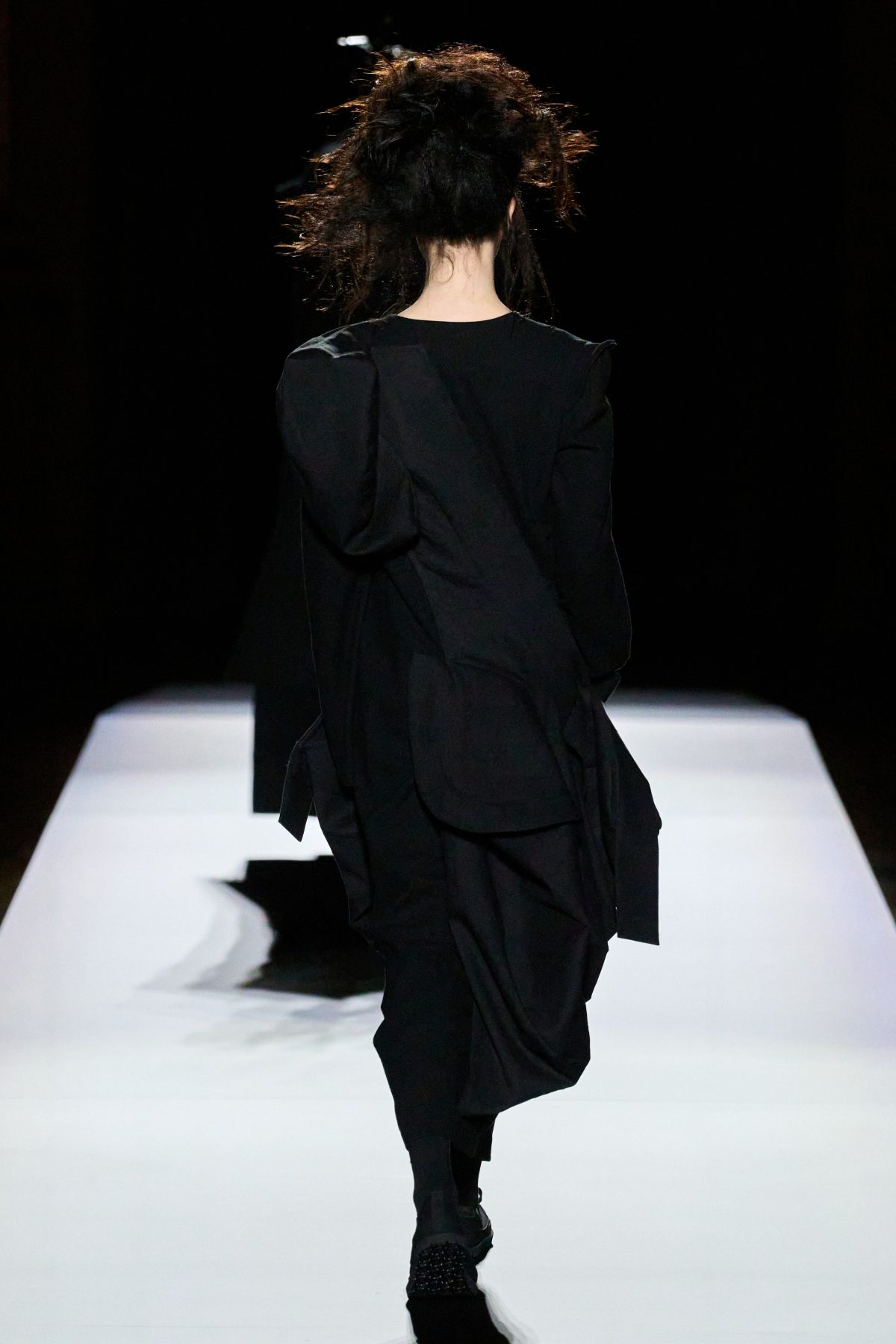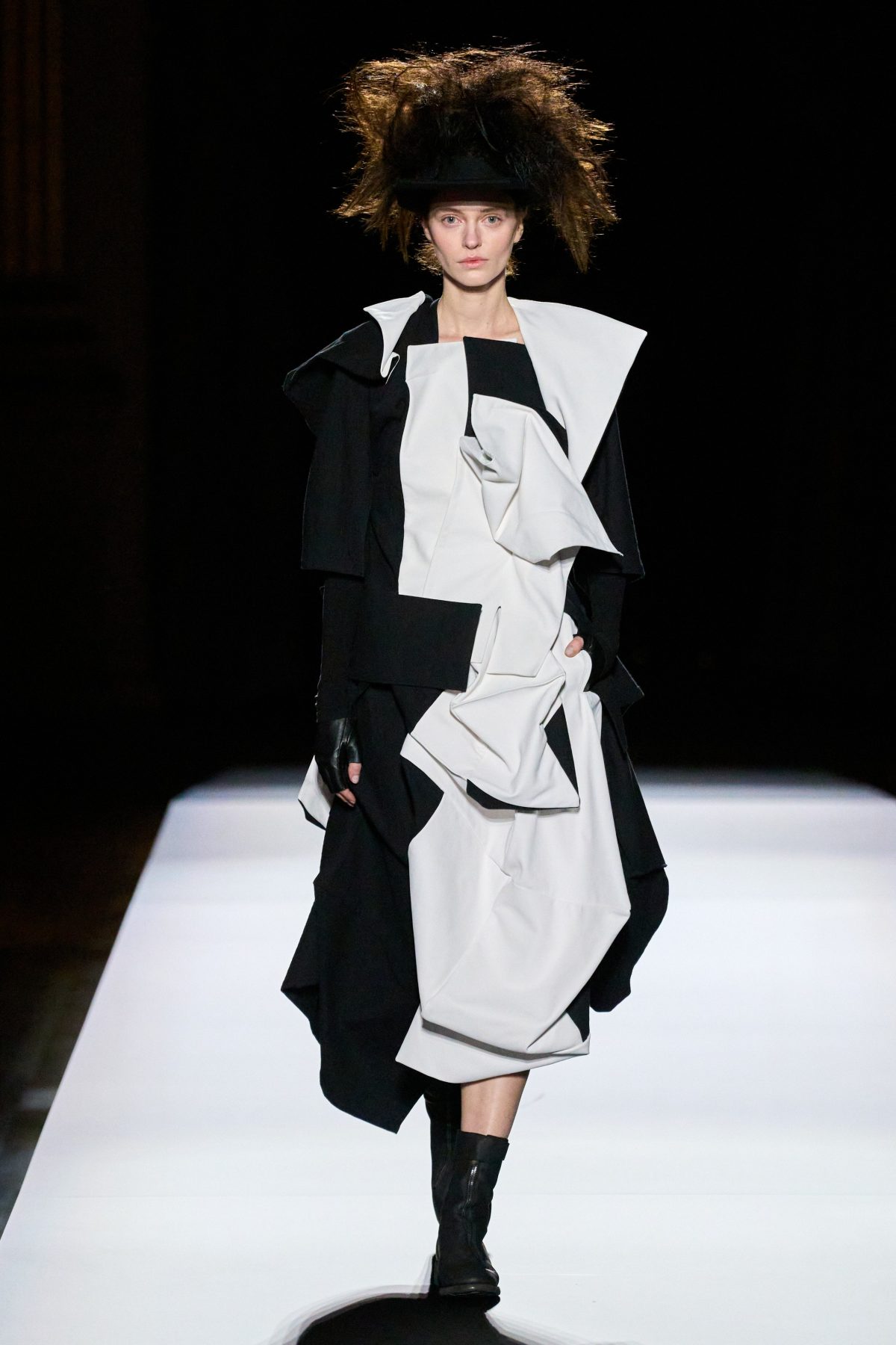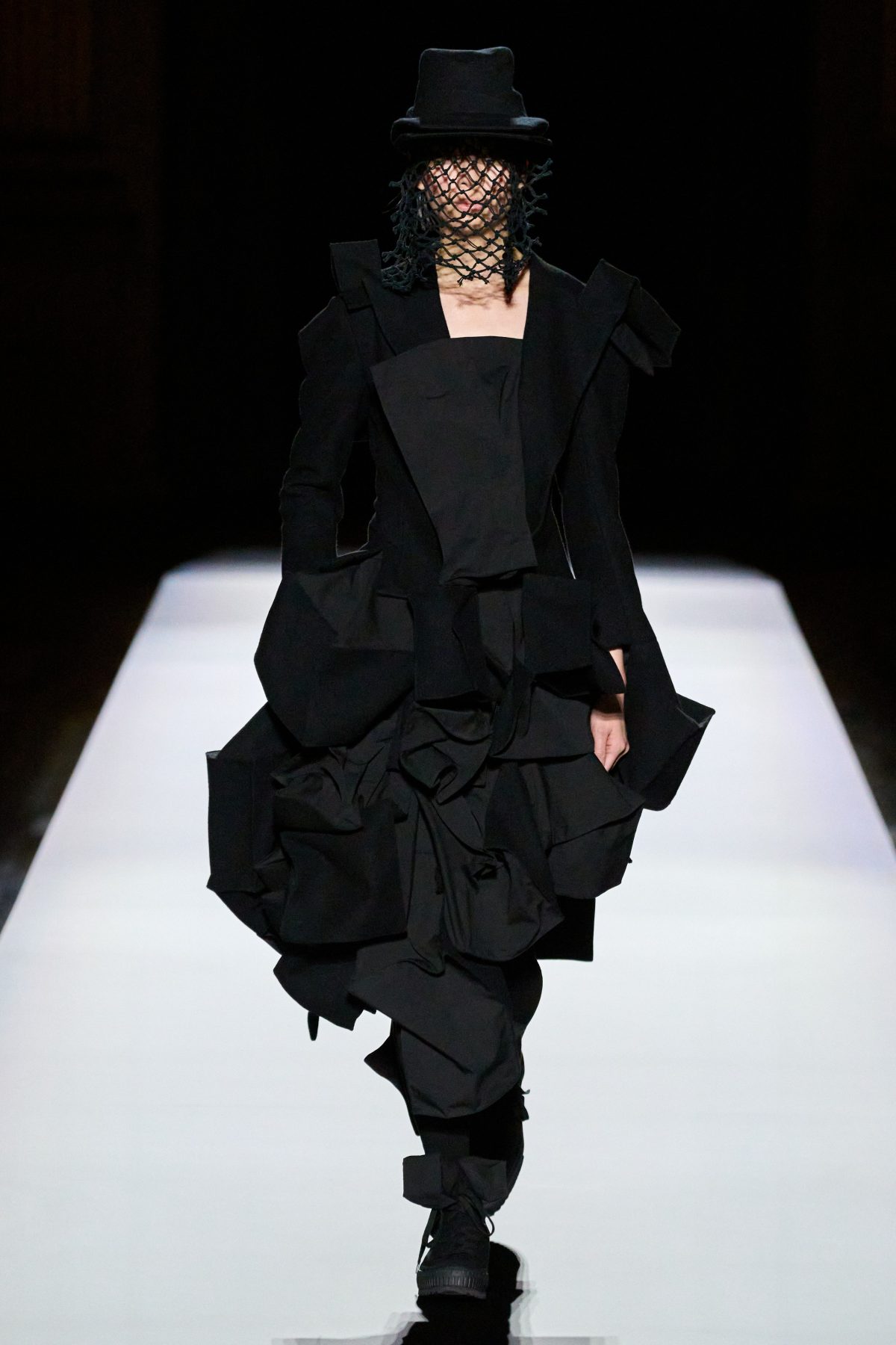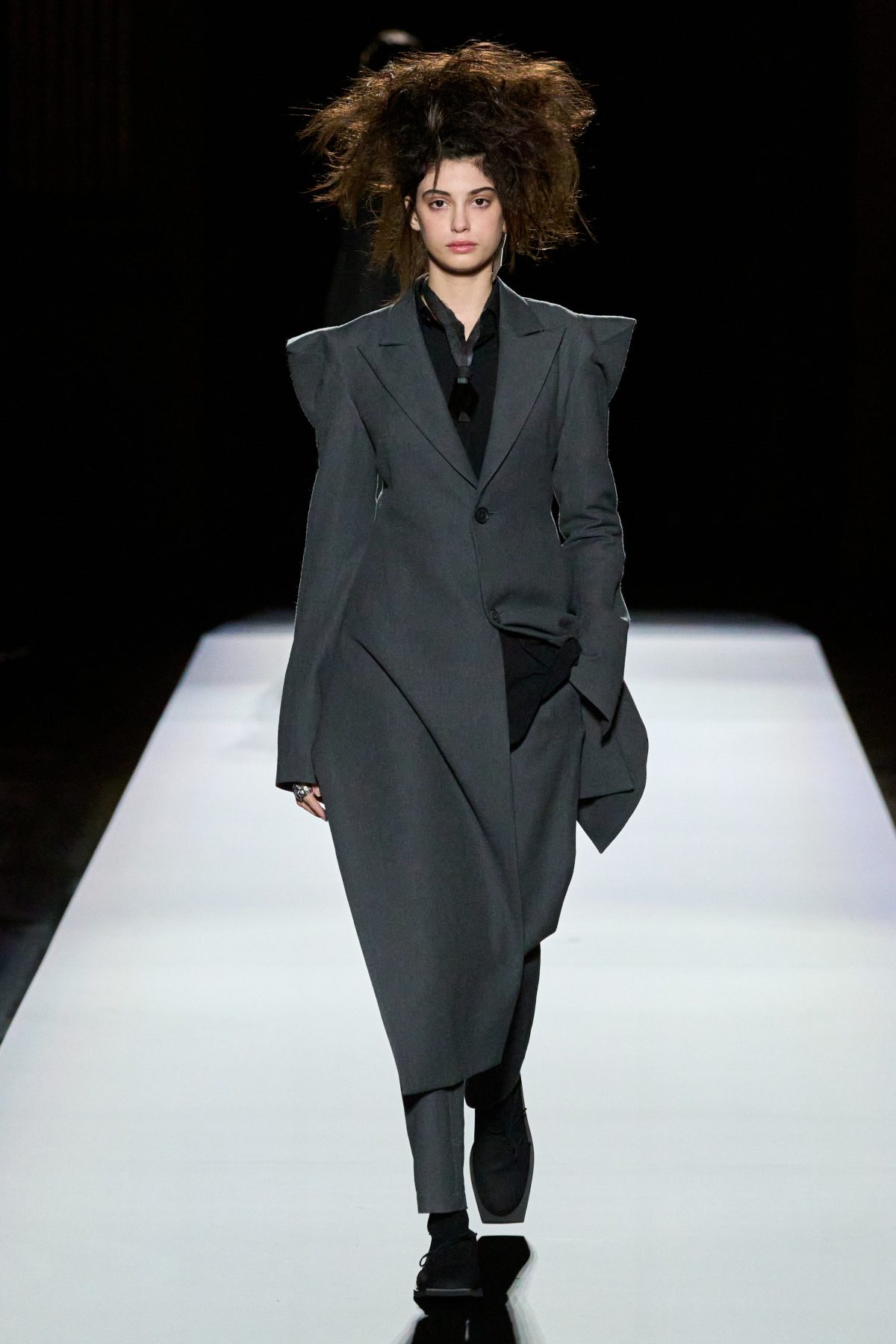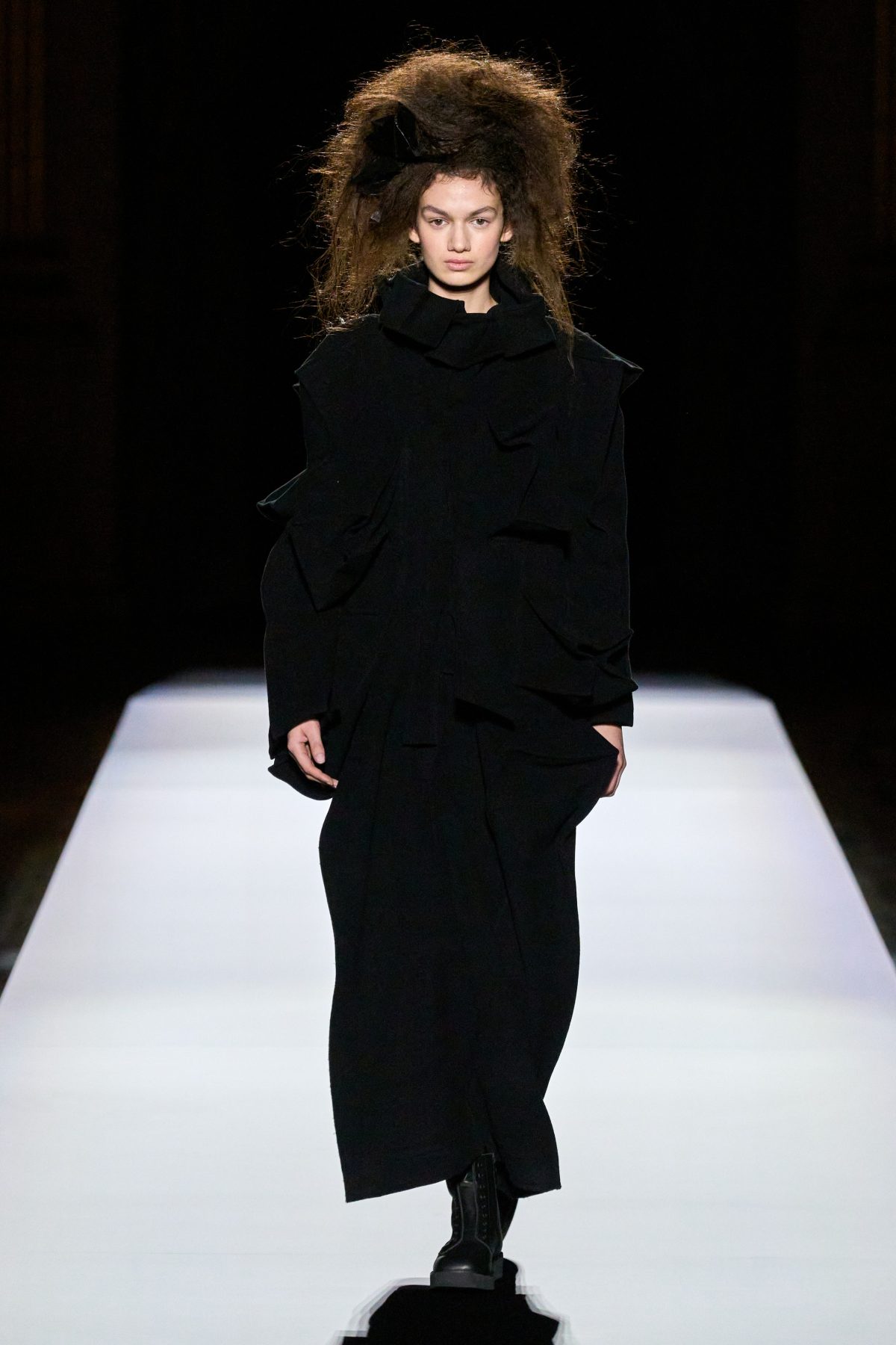 山本先生有着「極簡主義大師」的稱號,而從這場時裝展的第一位模特兒步出,你便能親身感受到其「極簡」之處——現場並沒有任何配樂,只有模特兒在木製走道上步行的鞋踏聲,她穿着能夠融入黑暗背景的極致全黑造型,讓你幾乎只能看到不規則的大衣造型廓形。白色穿插於全黑造型之間的,被加入到黑色服飾上的白色布料成為了主角,兩者如同影子般互相補替,讓人聯想起經典的 Noir 風格電影。