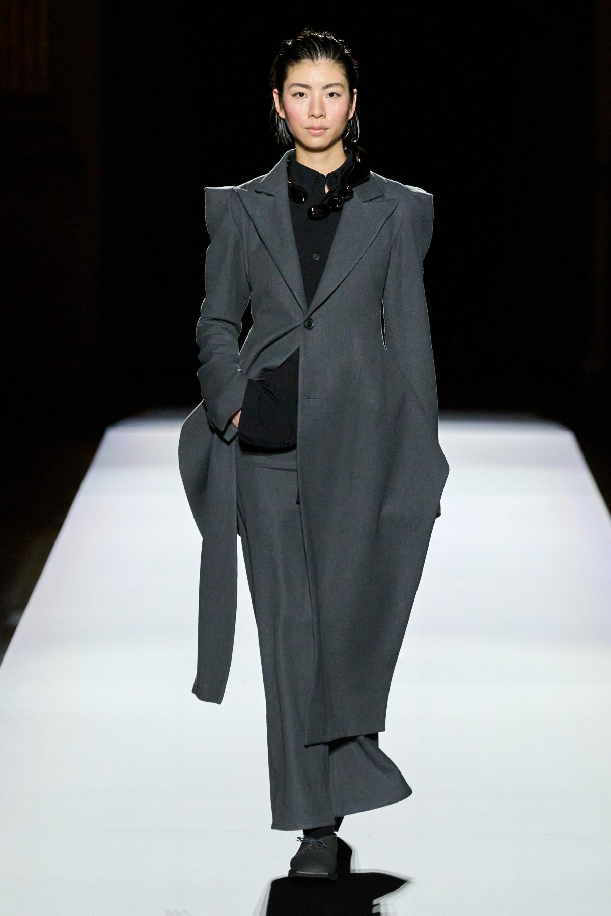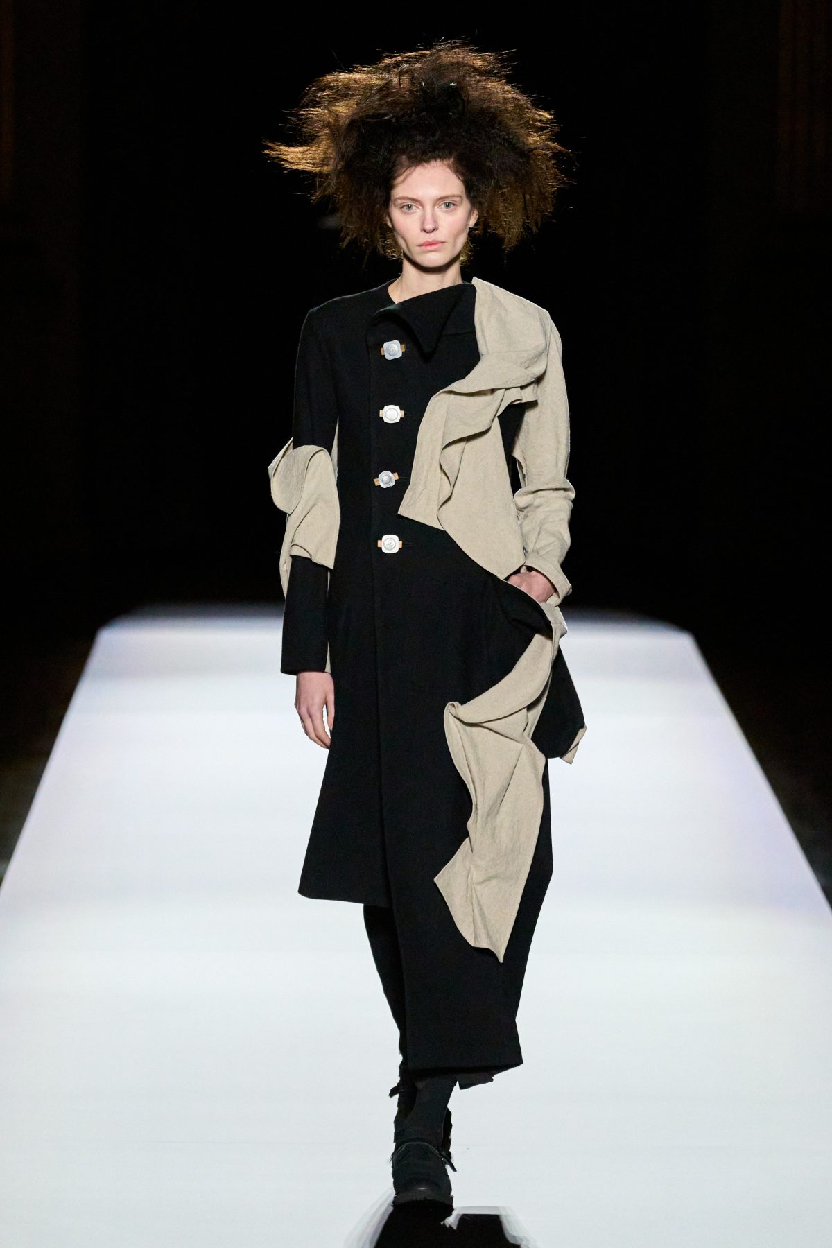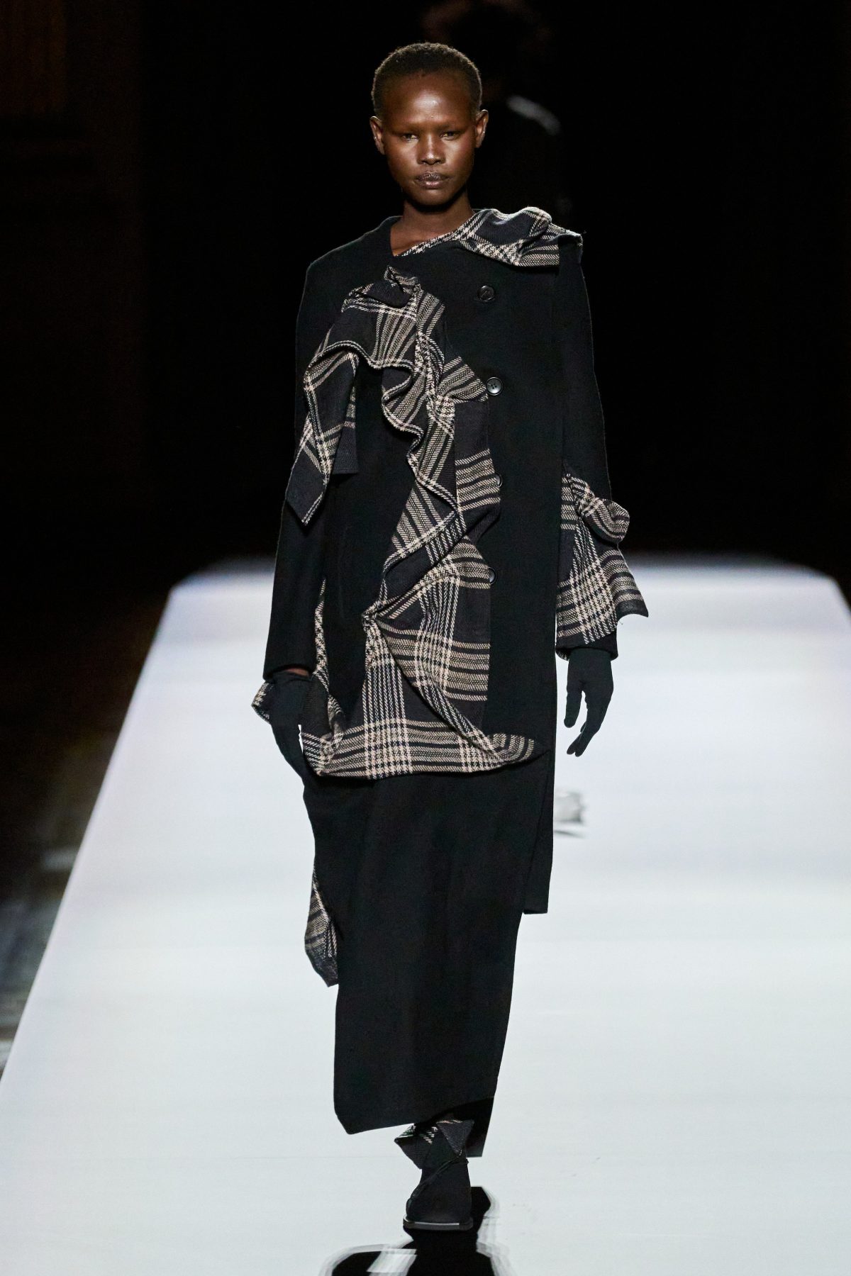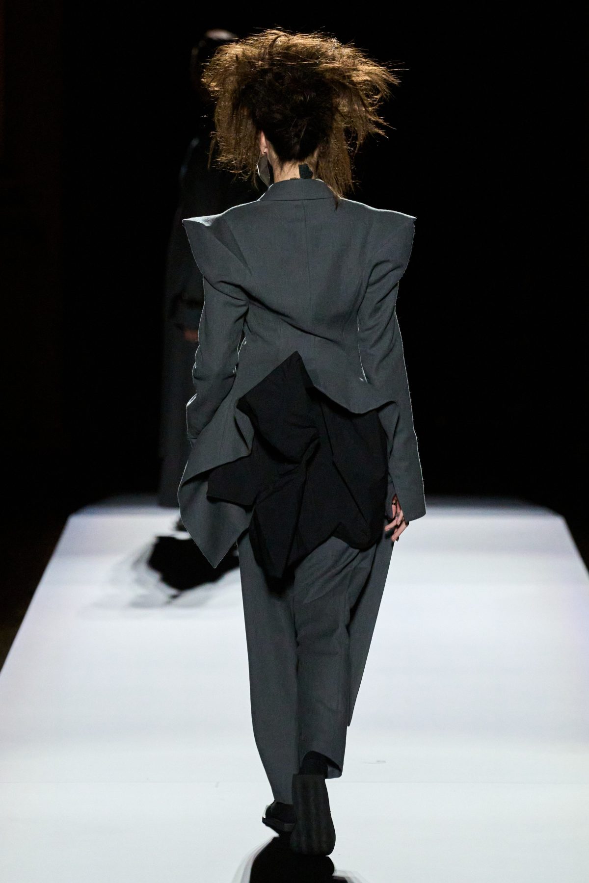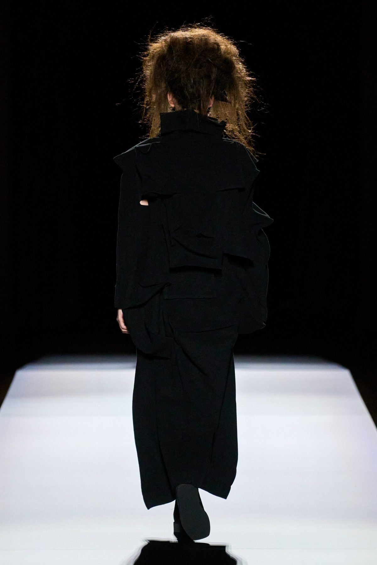 山本先生有着「極簡主義大師」的稱號,而從這場時裝展的第一位模特兒步出,你便能親身感受到其「極簡」之處——現場並沒有任何配樂,只有模特兒在木製走道上步行的鞋踏聲,她穿着能夠融入黑暗背景的極致全黑造型,讓你幾乎只能看到不規則的大衣造型廓形。白色穿插於全黑造型之間的,被加入到黑色服飾上的白色布料成為了主角,兩者如同影子般互相補替,讓人聯想起經典的 Noir 風格電影。