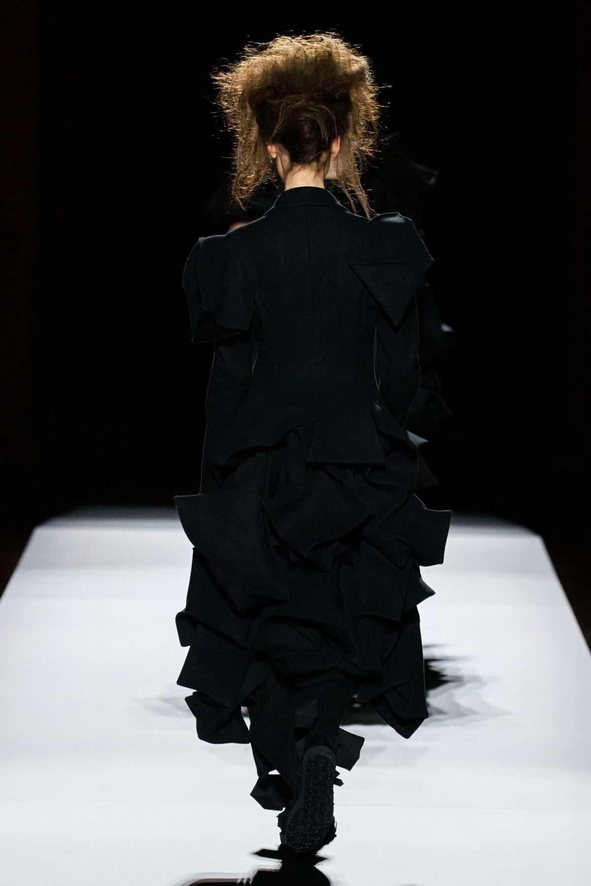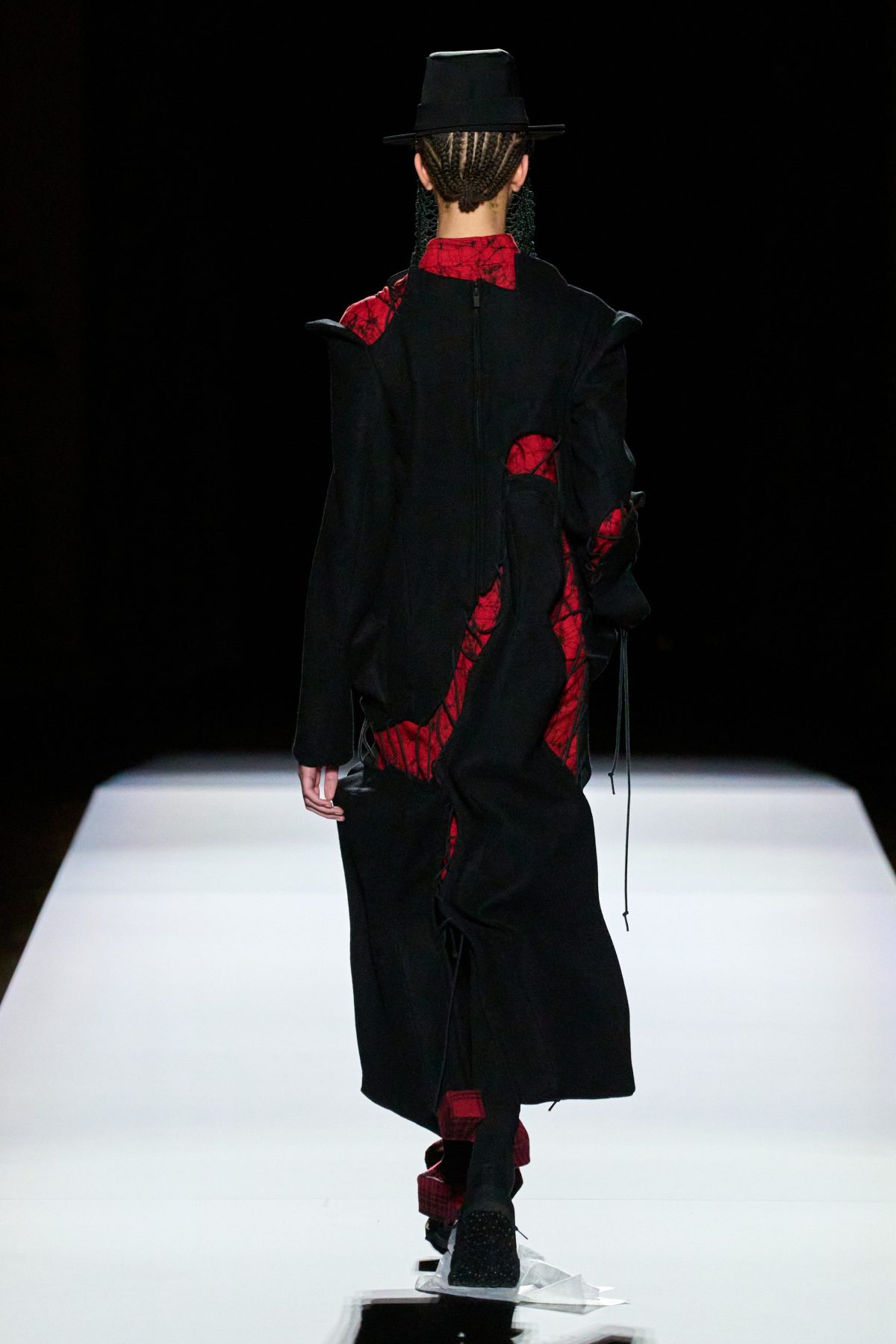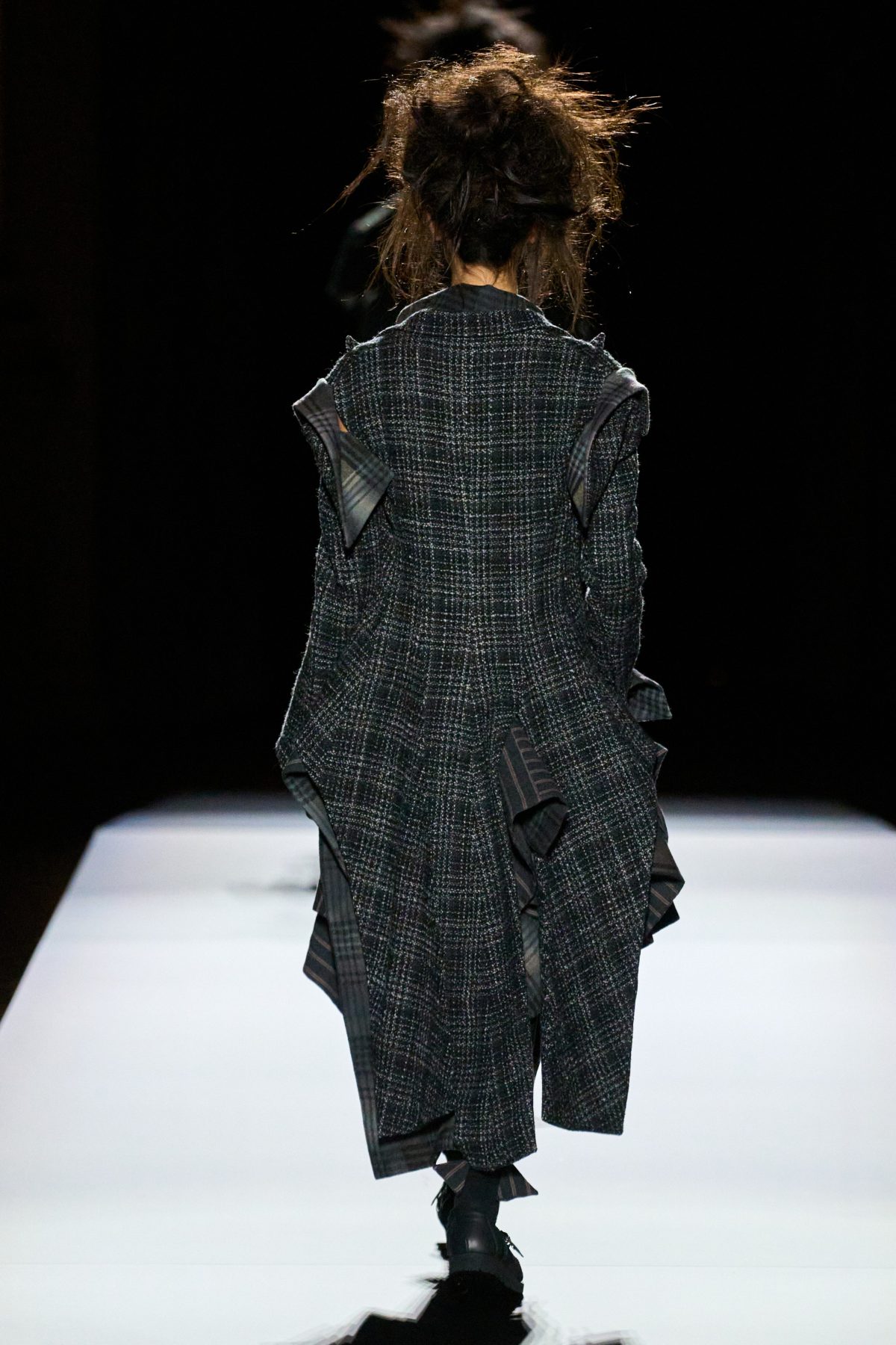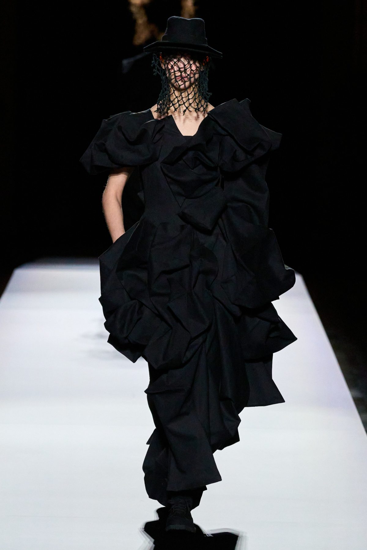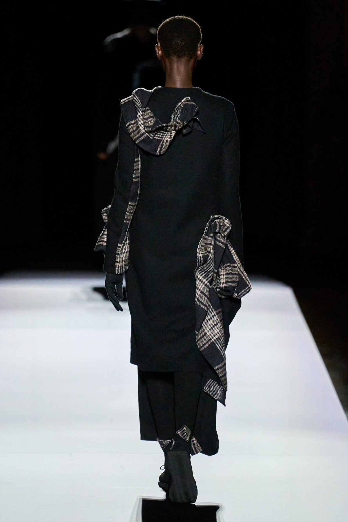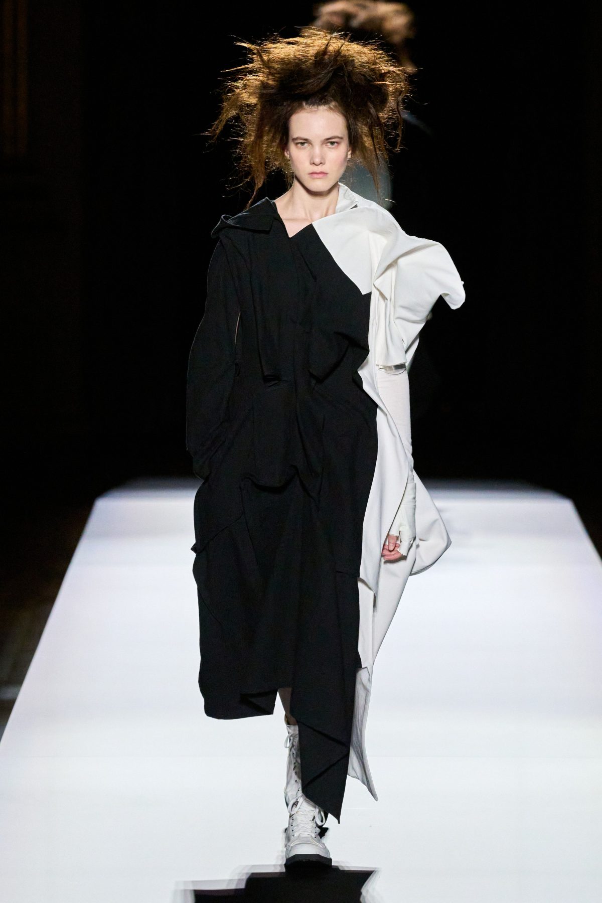 山本先生有着「極簡主義大師」的稱號,而從這場時裝展的第一位模特兒步出,你便能親身感受到其「極簡」之處——現場並沒有任何配樂,只有模特兒在木製走道上步行的鞋踏聲,她穿着能夠融入黑暗背景的極致全黑造型,讓你幾乎只能看到不規則的大衣造型廓形。白色穿插於全黑造型之間的,被加入到黑色服飾上的白色布料成為了主角,兩者如同影子般互相補替,讓人聯想起經典的 Noir 風格電影。