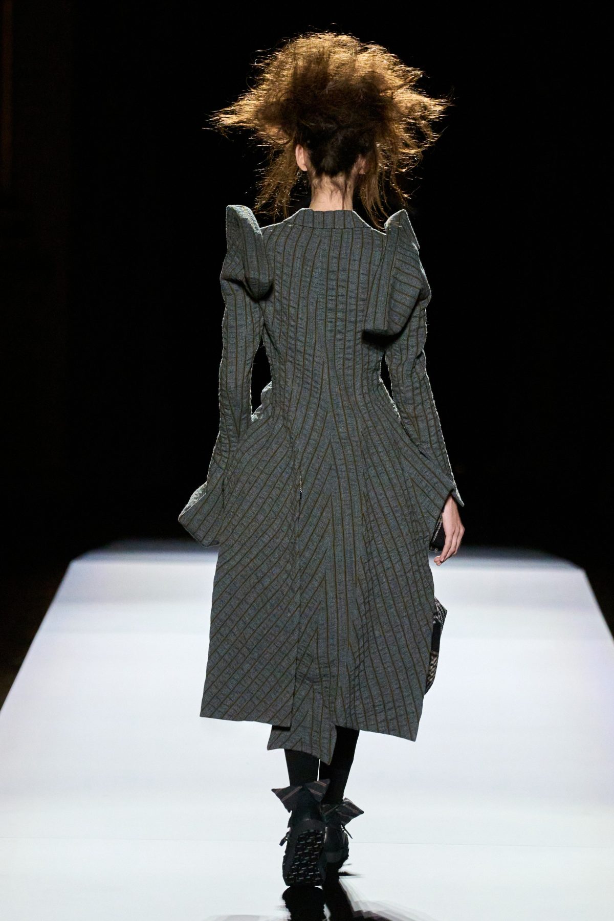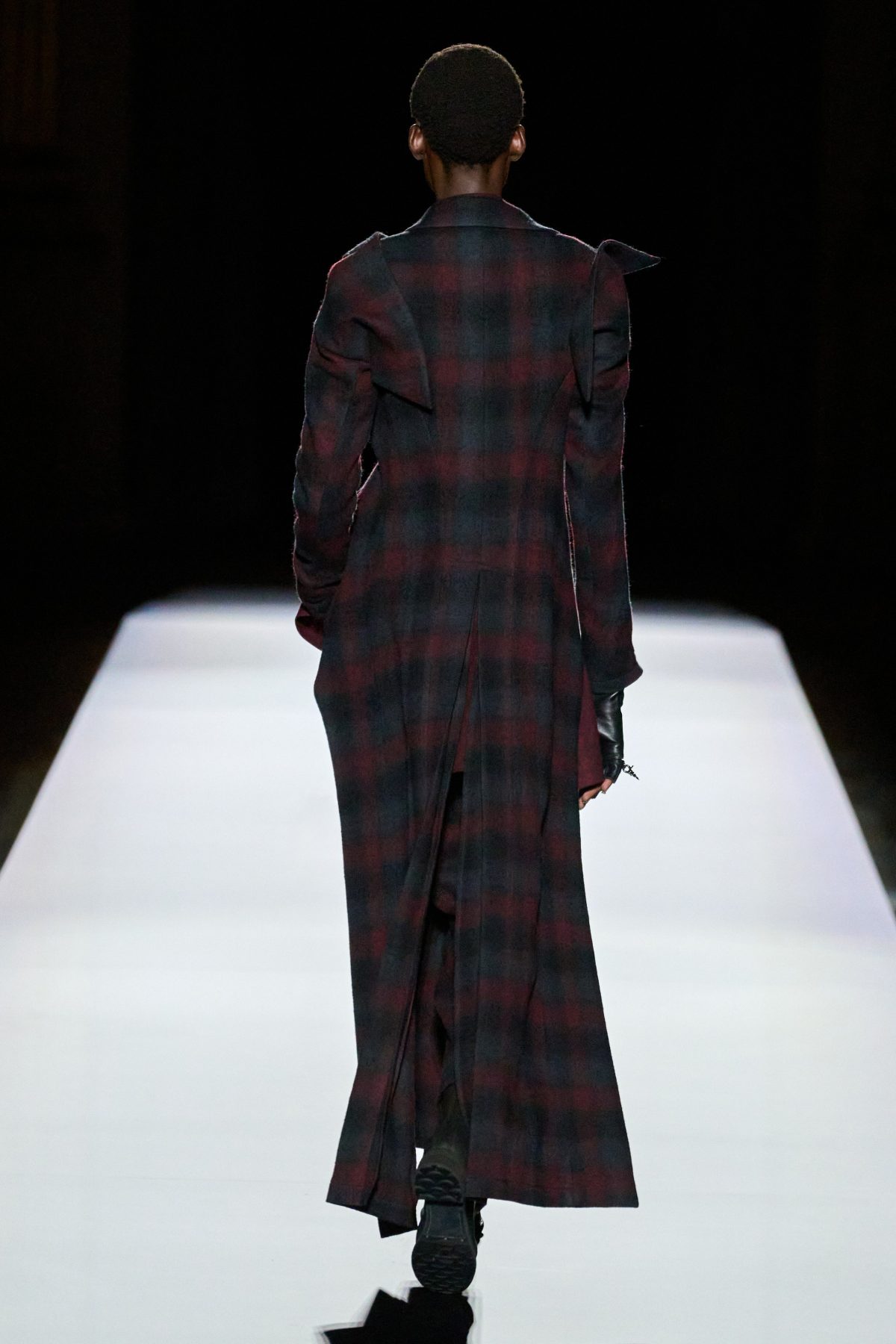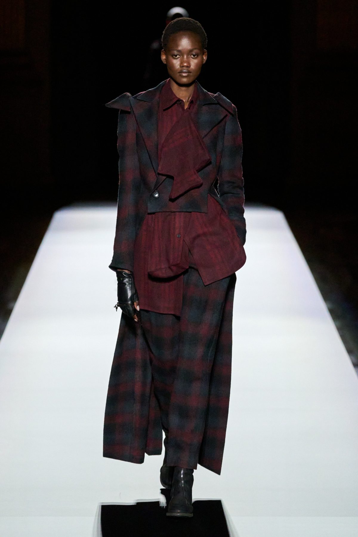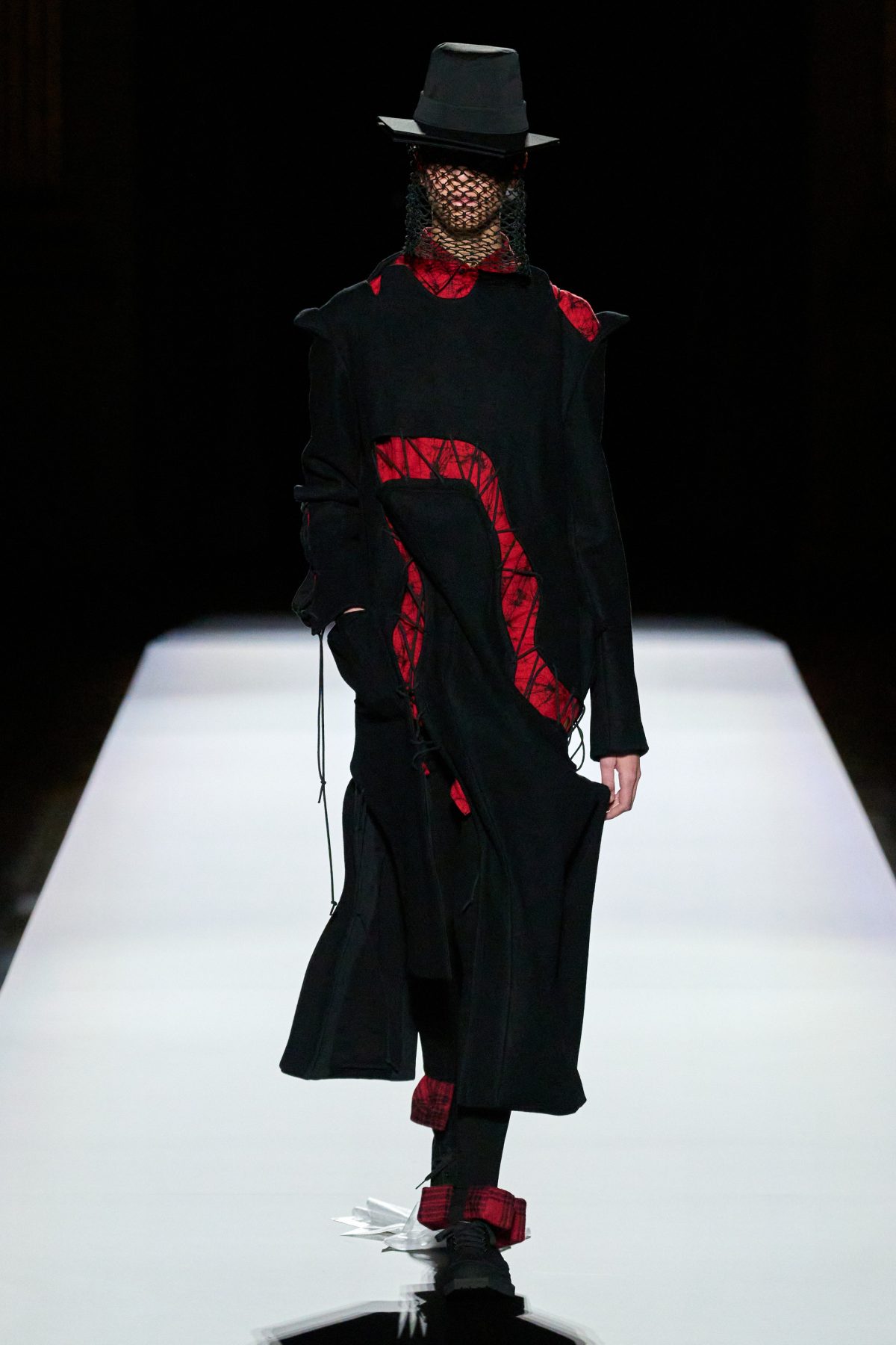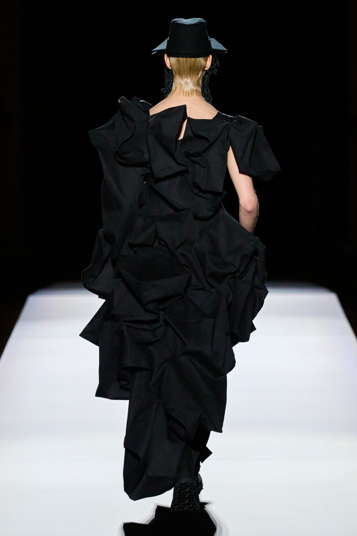 山本先生有着「極簡主義大師」的稱號,而從這場時裝展的第一位模特兒步出,你便能親身感受到其「極簡」之處——現場並沒有任何配樂,只有模特兒在木製走道上步行的鞋踏聲,她穿着能夠融入黑暗背景的極致全黑造型,讓你幾乎只能看到不規則的大衣造型廓形。白色穿插於全黑造型之間的,被加入到黑色服飾上的白色布料成為了主角,兩者如同影子般互相補替,讓人聯想起經典的 Noir 風格電影。