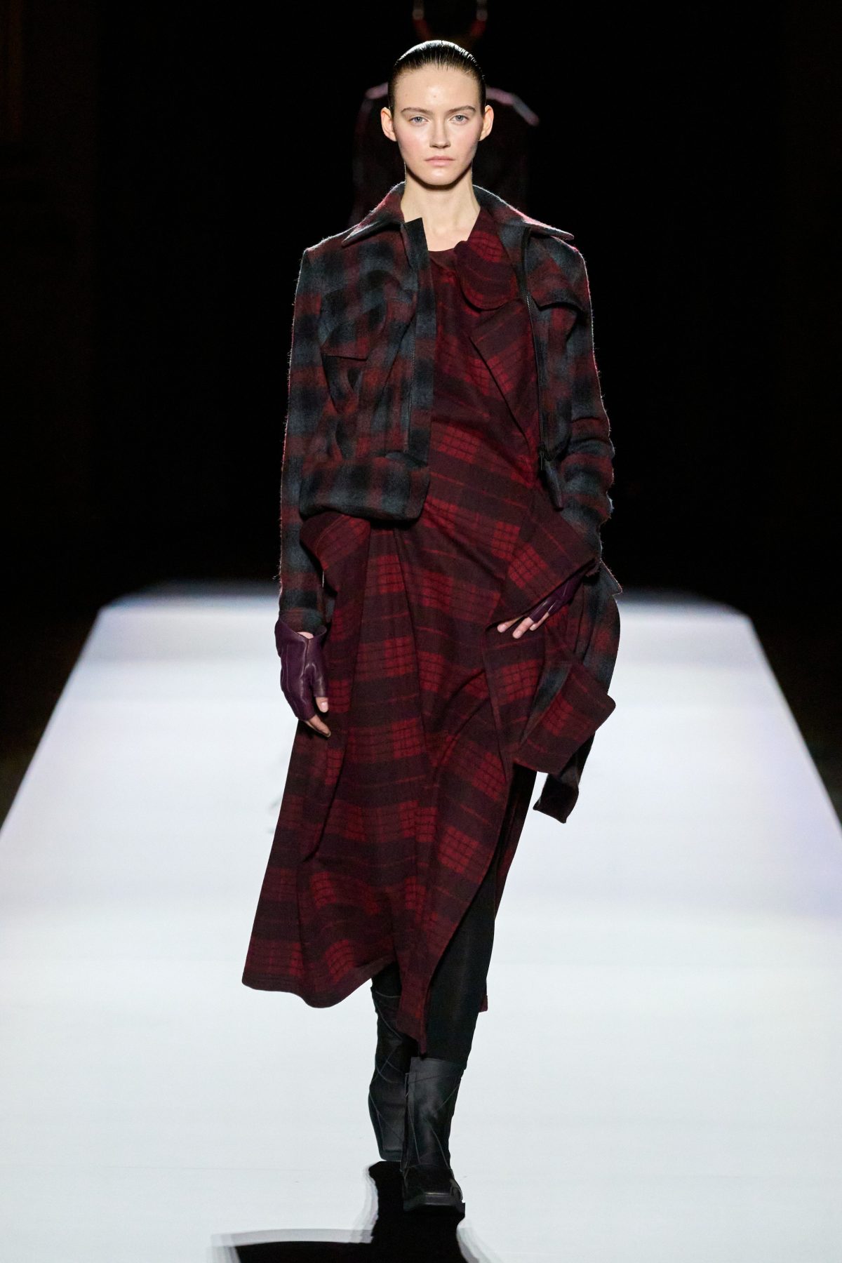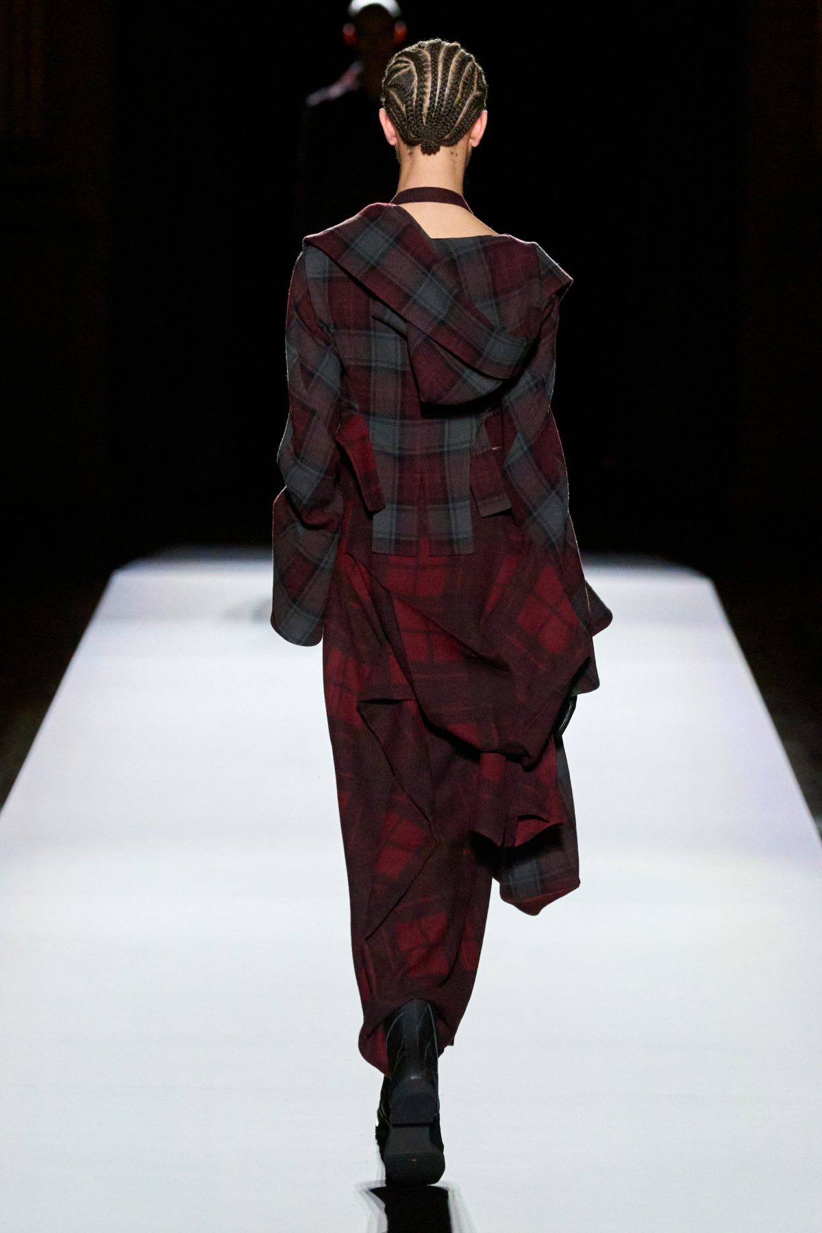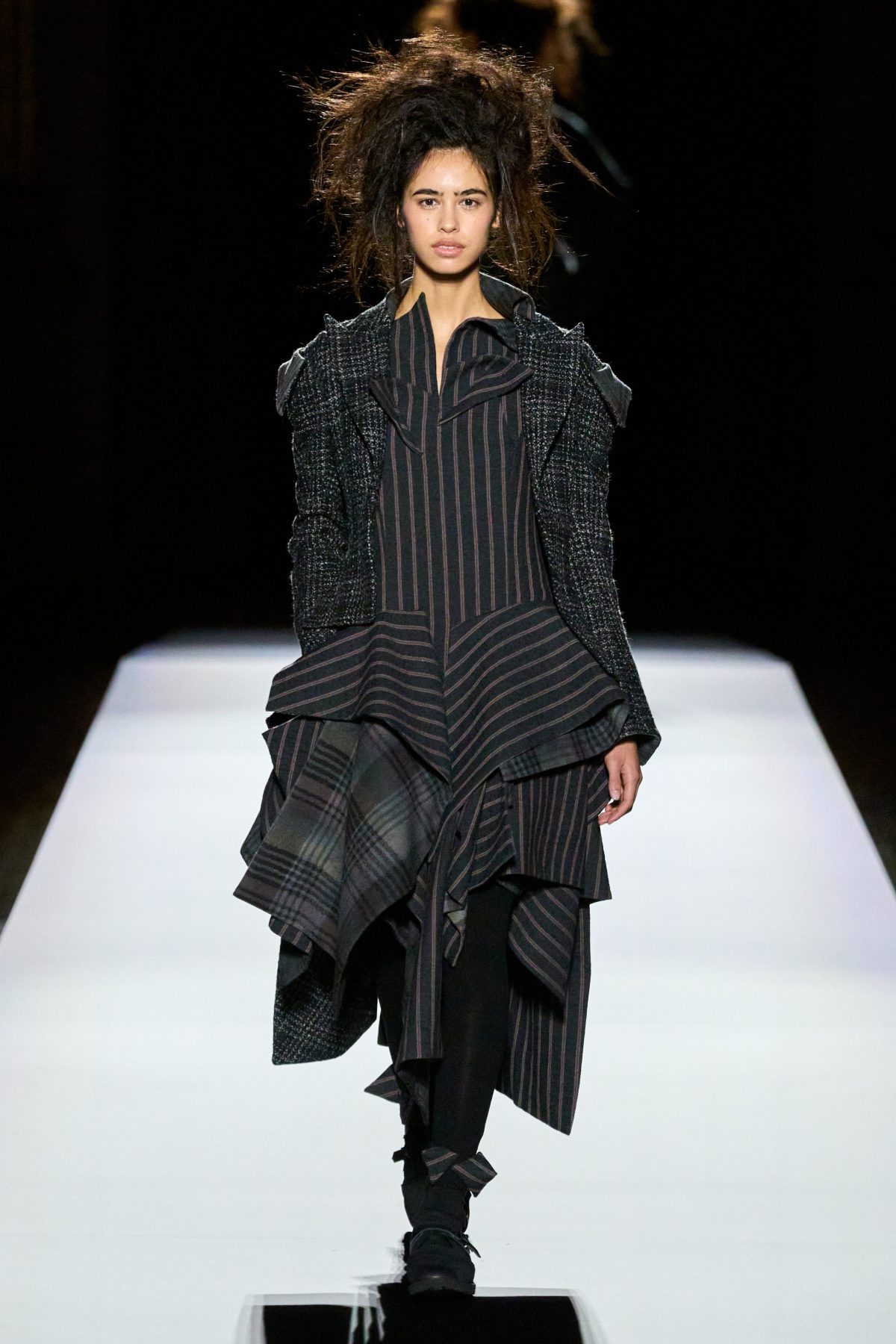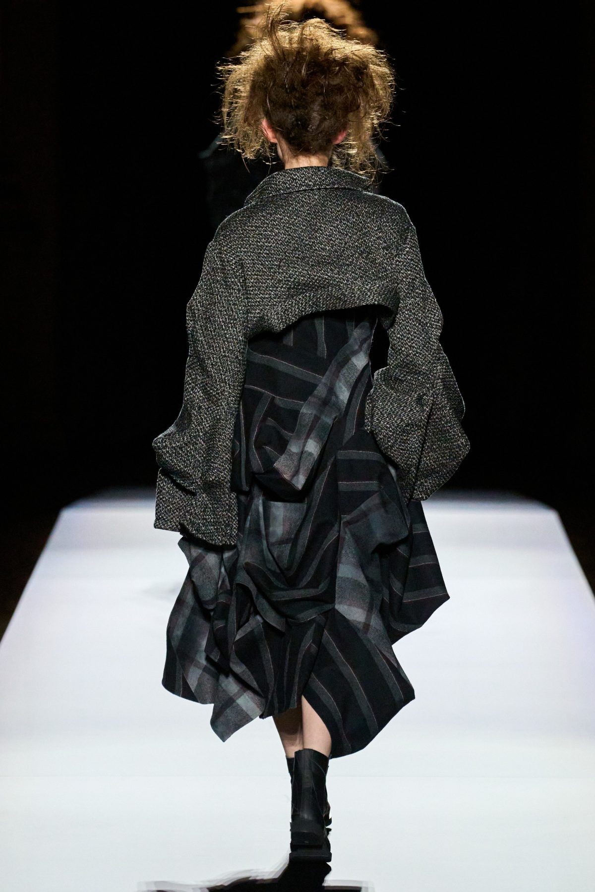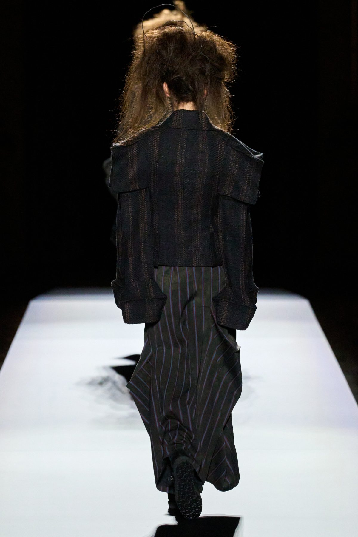 山本先生有着「極簡主義大師」的稱號,而從這場時裝展的第一位模特兒步出,你便能親身感受到其「極簡」之處——現場並沒有任何配樂,只有模特兒在木製走道上步行的鞋踏聲,她穿着能夠融入黑暗背景的極致全黑造型,讓你幾乎只能看到不規則的大衣造型廓形。白色穿插於全黑造型之間的,被加入到黑色服飾上的白色布料成為了主角,兩者如同影子般互相補替,讓人聯想起經典的 Noir 風格電影。