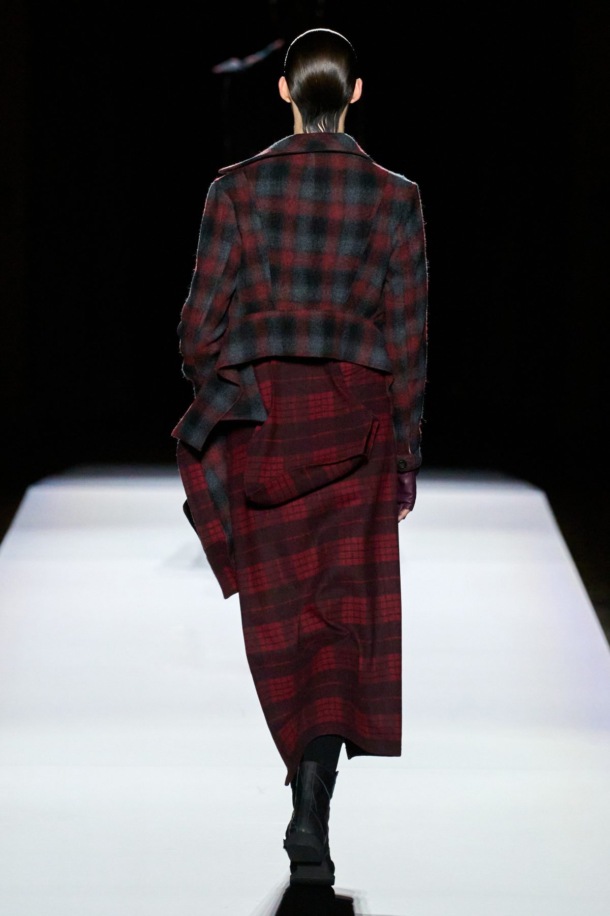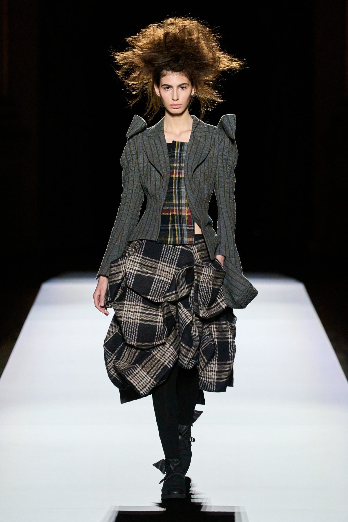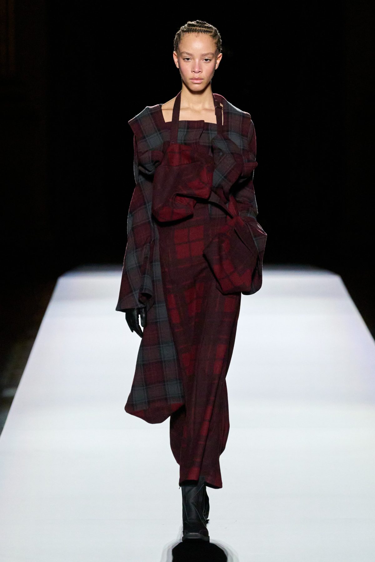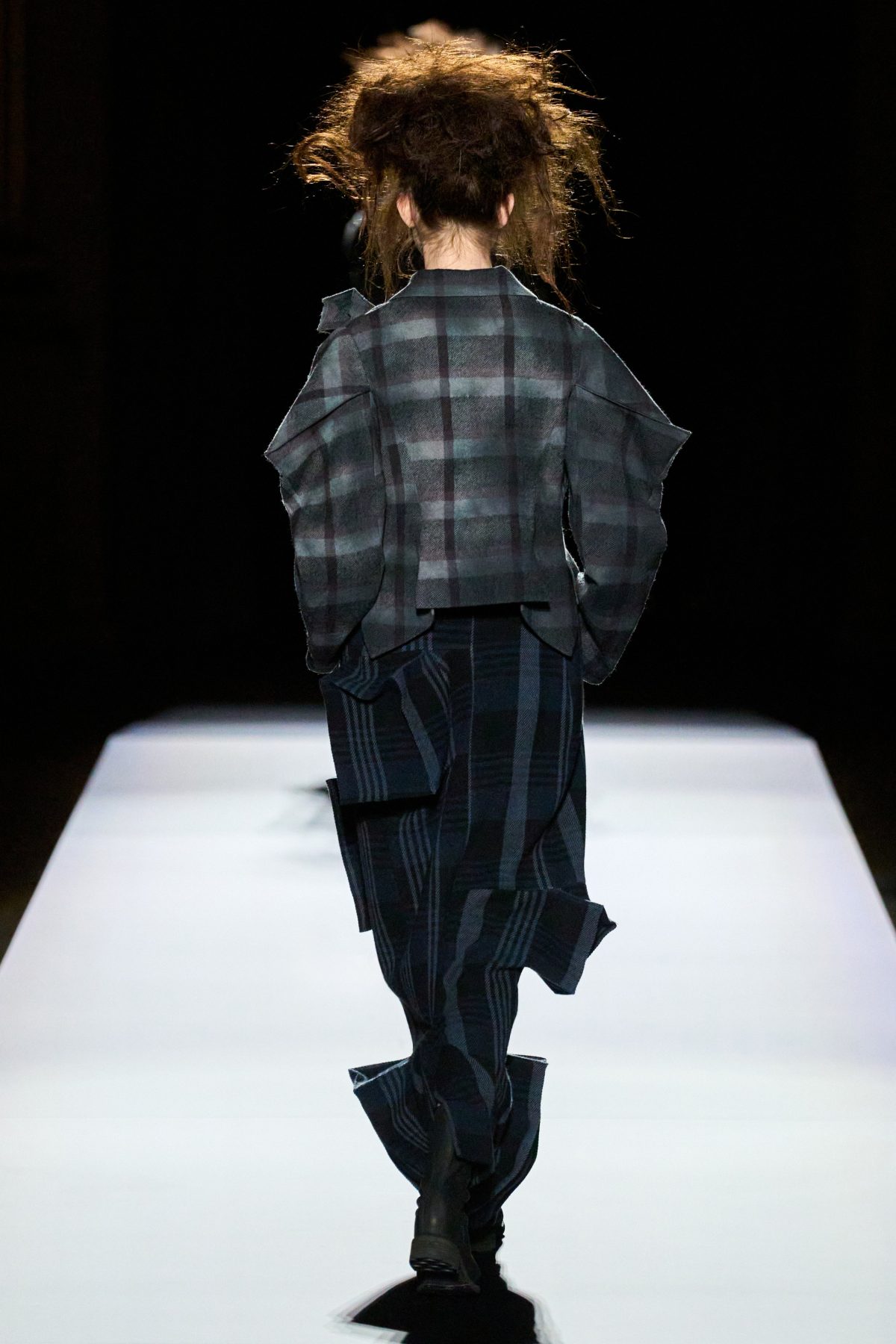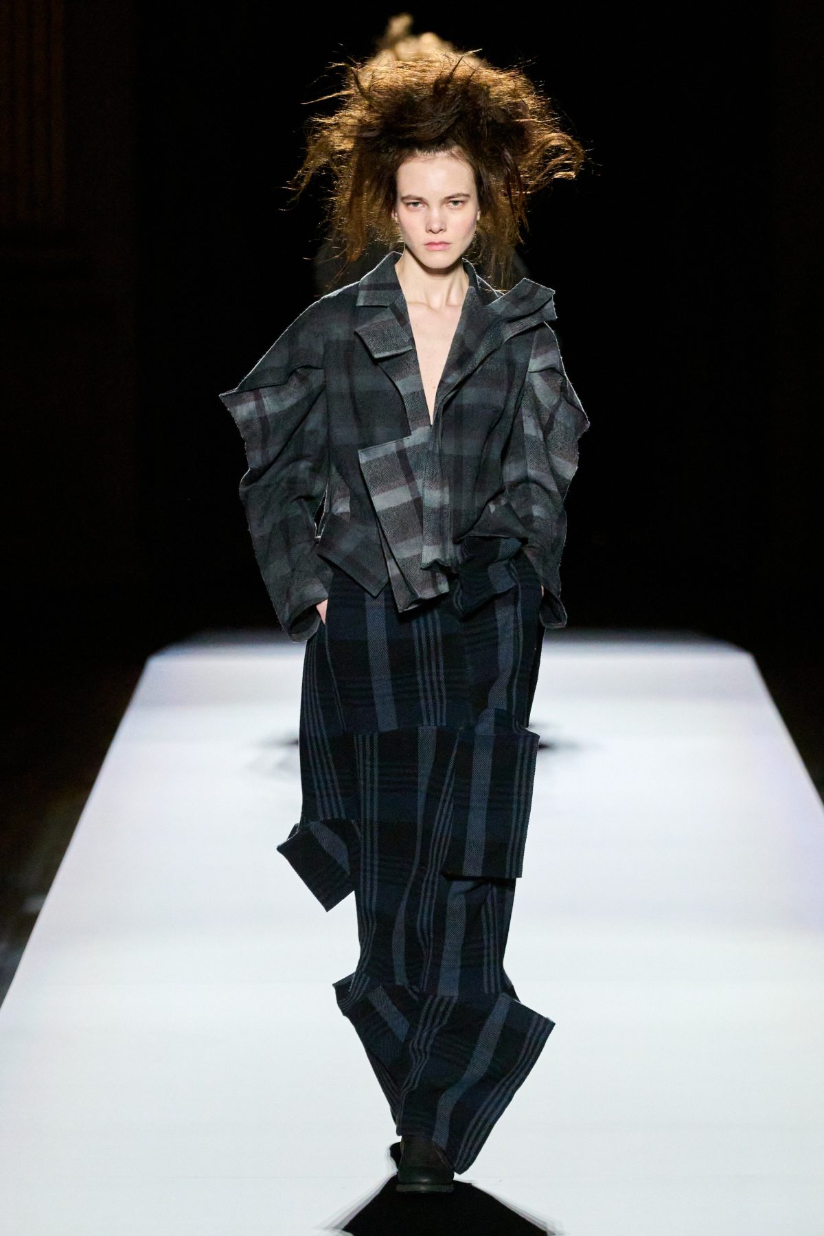 在黑色造型之後緊接着的是格子拼布,而在無限格子上的,則是一個又一個立體格子,營造出有有趣的錯視效果。儘管某些方塊上帶有拉鍊或掀蓋,被設計成衣服上的小口袋,但相信實用性絕不會是它們被創作出的重點目的,而是更深層次的藝術與情感考量。當被問到這次的靈感來源是否立體主義,寡言少語的山本先生簡短地回答:「是。」畢卡索嗎?他則糾正說:「布拉克。」