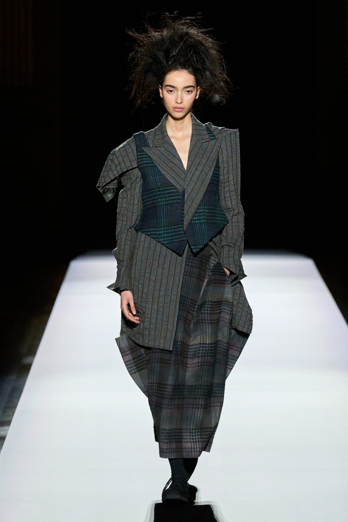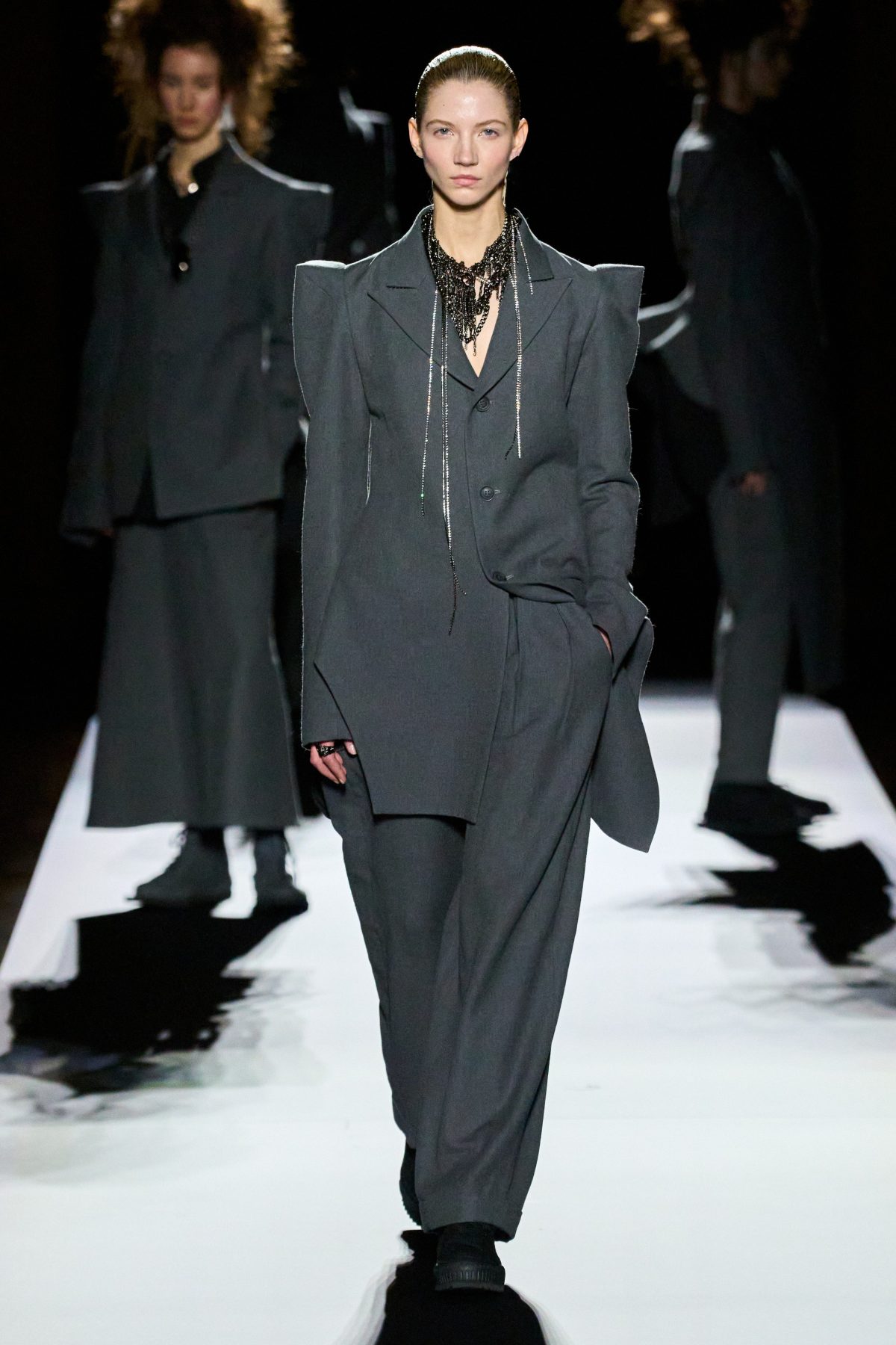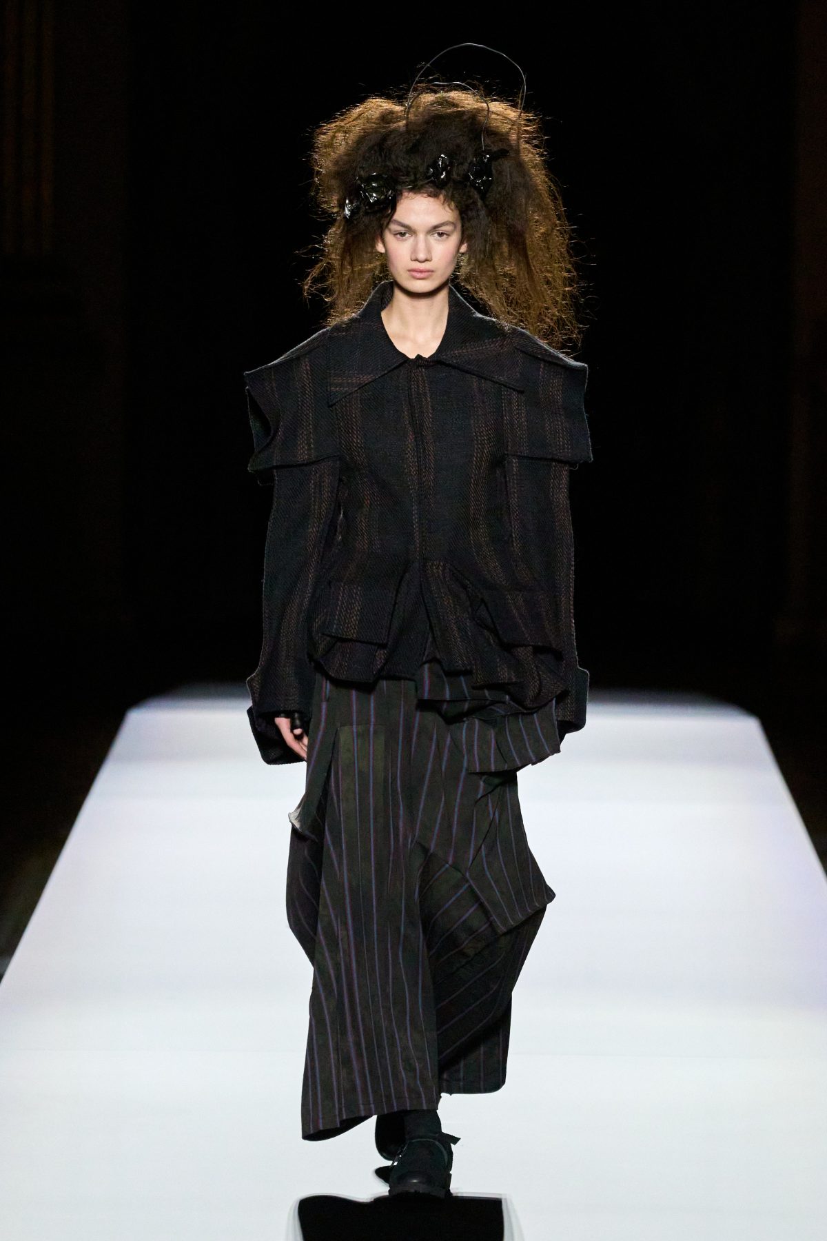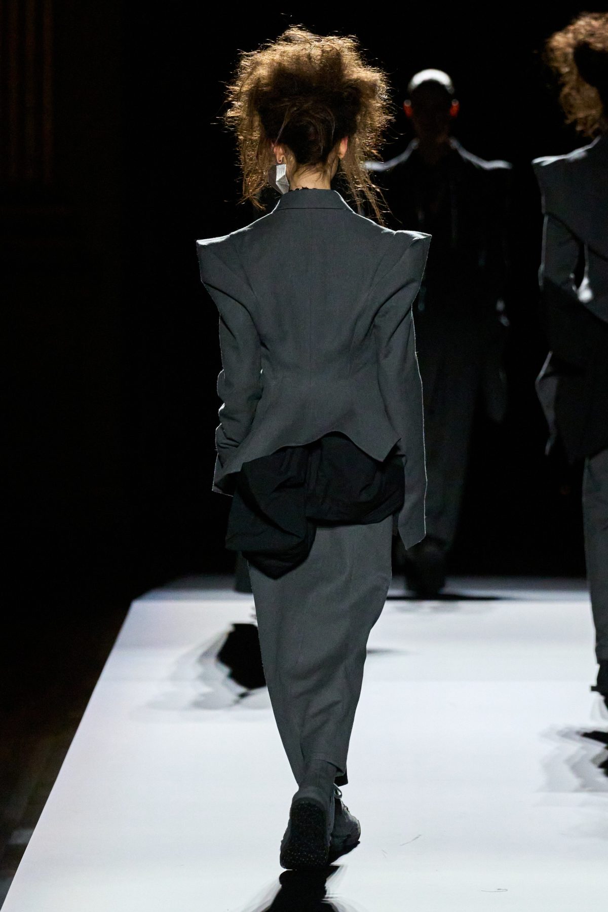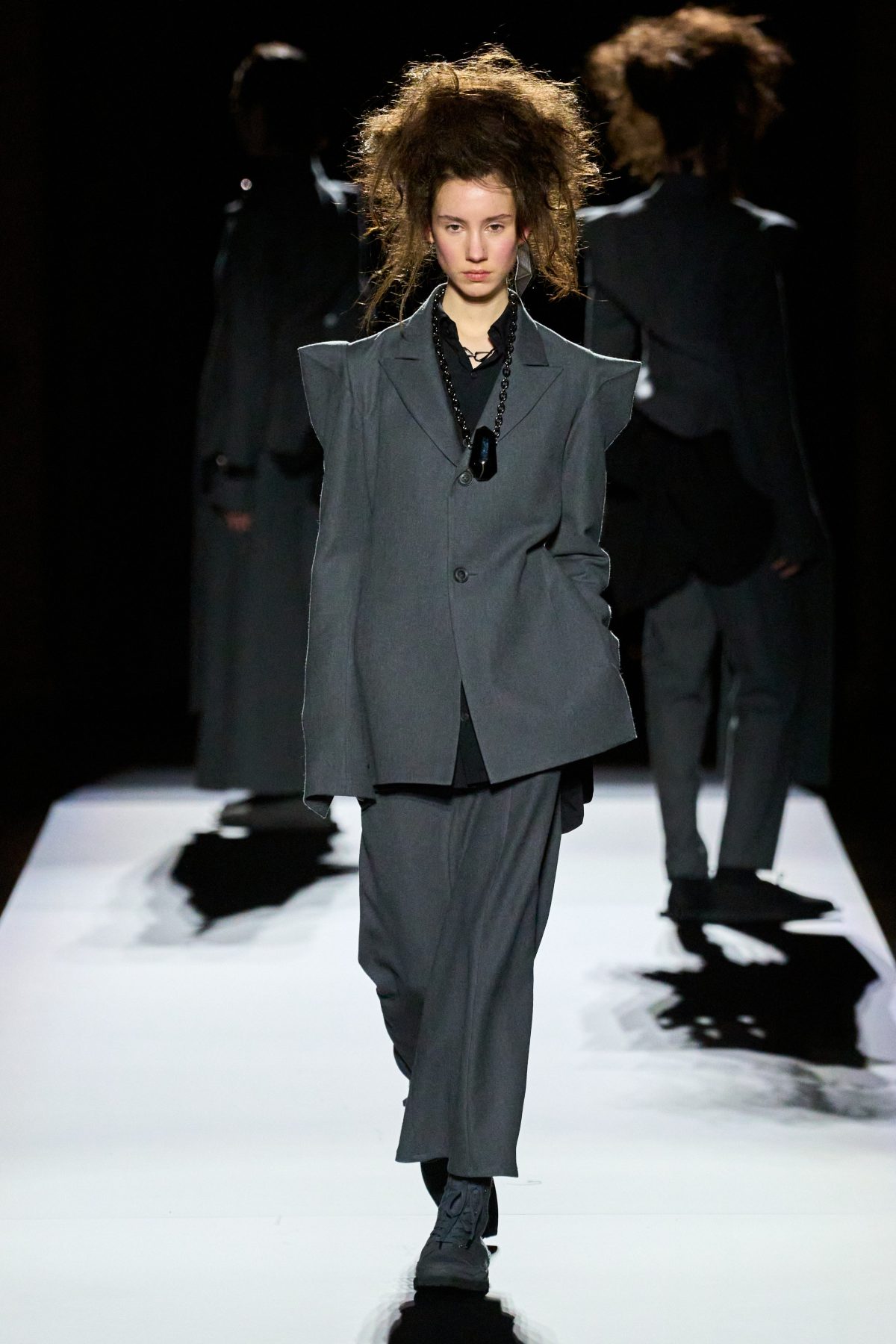 在四十多年來的多場時裝展中,山本先生創作出無數的西裝外套,風格一致,卻從不重複,獨特剪裁顯然已經成為了品牌標誌之一。在時裝展的最後,是五套黑配灰的西裝造型,他們有着一模一樣的尖銳雙肩,她們有些穿着黑襯衣,有些帶着浮誇珠寶,正當大家以為設計師將以五套剪裁良好的西裝結束本季系列,模特兒轉身展示出隱藏在背後的有趣巧思——外套底下是原創的不規則裝飾,它們逐個變大,最終成為綻放的黑色花卉。