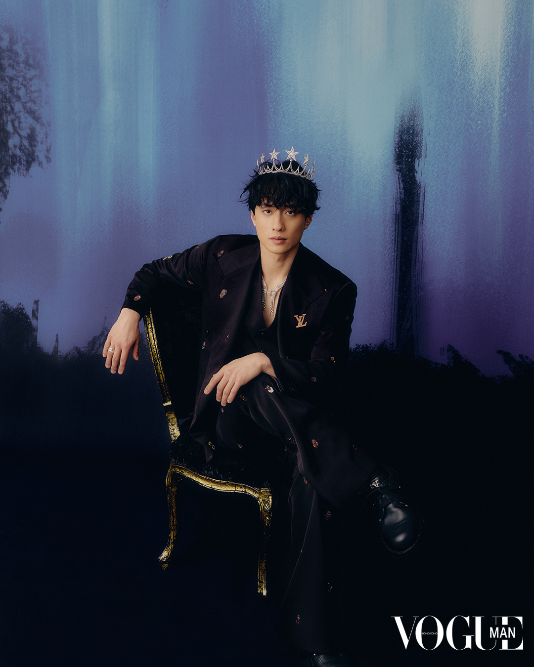 Embroidered blazer, cotton trousers, Louis Vuitton. Firmament de Minuit tiara in White Gold, Chaumet. Mosaique Delilah Necklace, white gold, diamonds, Quatre Radiant Edition Ring, white gold, diamonds, Boucheron.