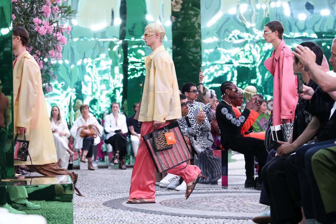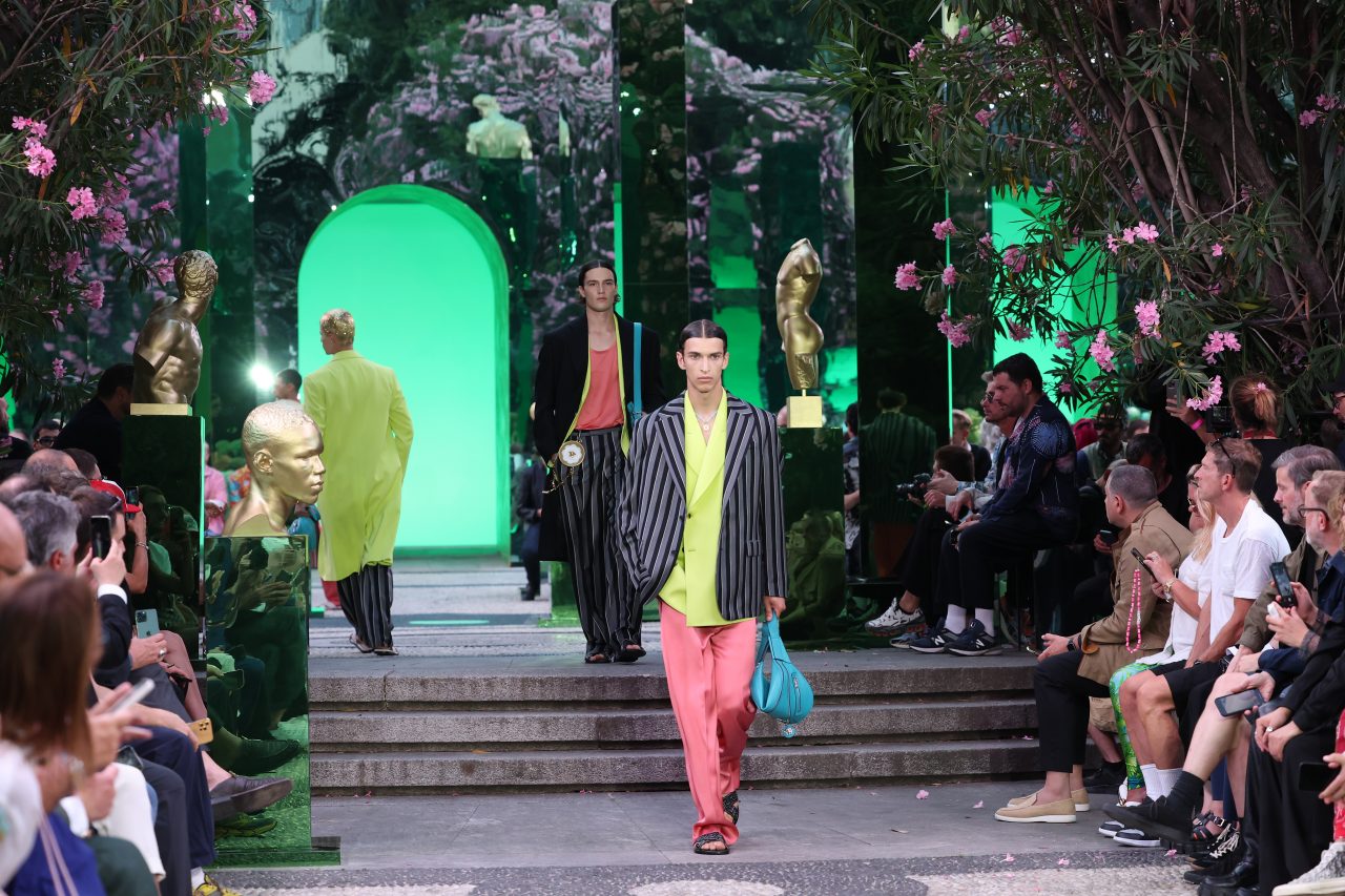 MILAN, ITALY - JUNE 18: A model walks the runway at the Versace fashion show during the Milan Fashion Week S/S 2023 on June 18, 2022 in Milan, Italy. (Photo by Daniele Venturelli/Daniele Venturelli / WireImage )