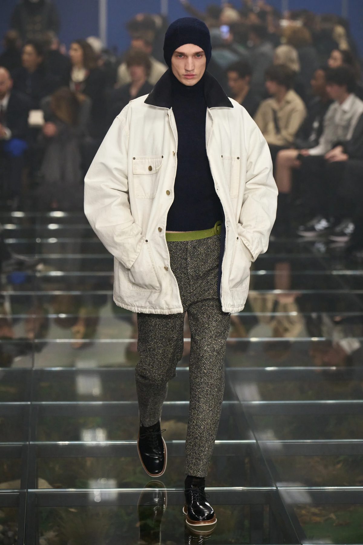 本次時裝騷以尋找真實情感為主軸,將日常生活所需納入設計考量之中,並帶領各位觀眾走到擬幻擬真的行騷場地。整個時裝騷空間瀰漫著白霧,地下設計成玻璃,以黑色方格分隔,就像辦公室的假天花,顛倒放在地上;而地下的玻璃底層,則鋪滿各種綠色植物,充滿田園氣息,仿似一個融合辦公室內部和大自然的神秘空間。Prada團隊希望藉此向大眾展示這兩個貌似矛盾的世界,一同探討共存世界的概念、發掘情感所需。而全新系列的服裝多以合身剪裁呈現,非常適合日常穿著的恤衫和西裝外套頻繁出現,卻在用色上稍花心思,例如黑白色調的西裝中,加上了青色領呔,豐富整個穿搭,加上亮點的風格一向是品牌的強項。