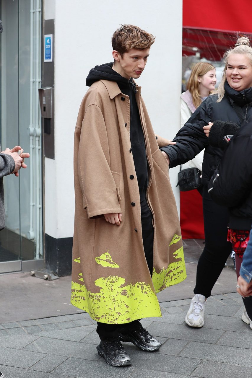 Sivan 在倫敦 Global Radio Studios 露面時,因應英國多變的天氣,所以穿上了配有帽子的衛衣,以及 Valentino 大衣,易於脫下,又能達到整體配搭的層次感。