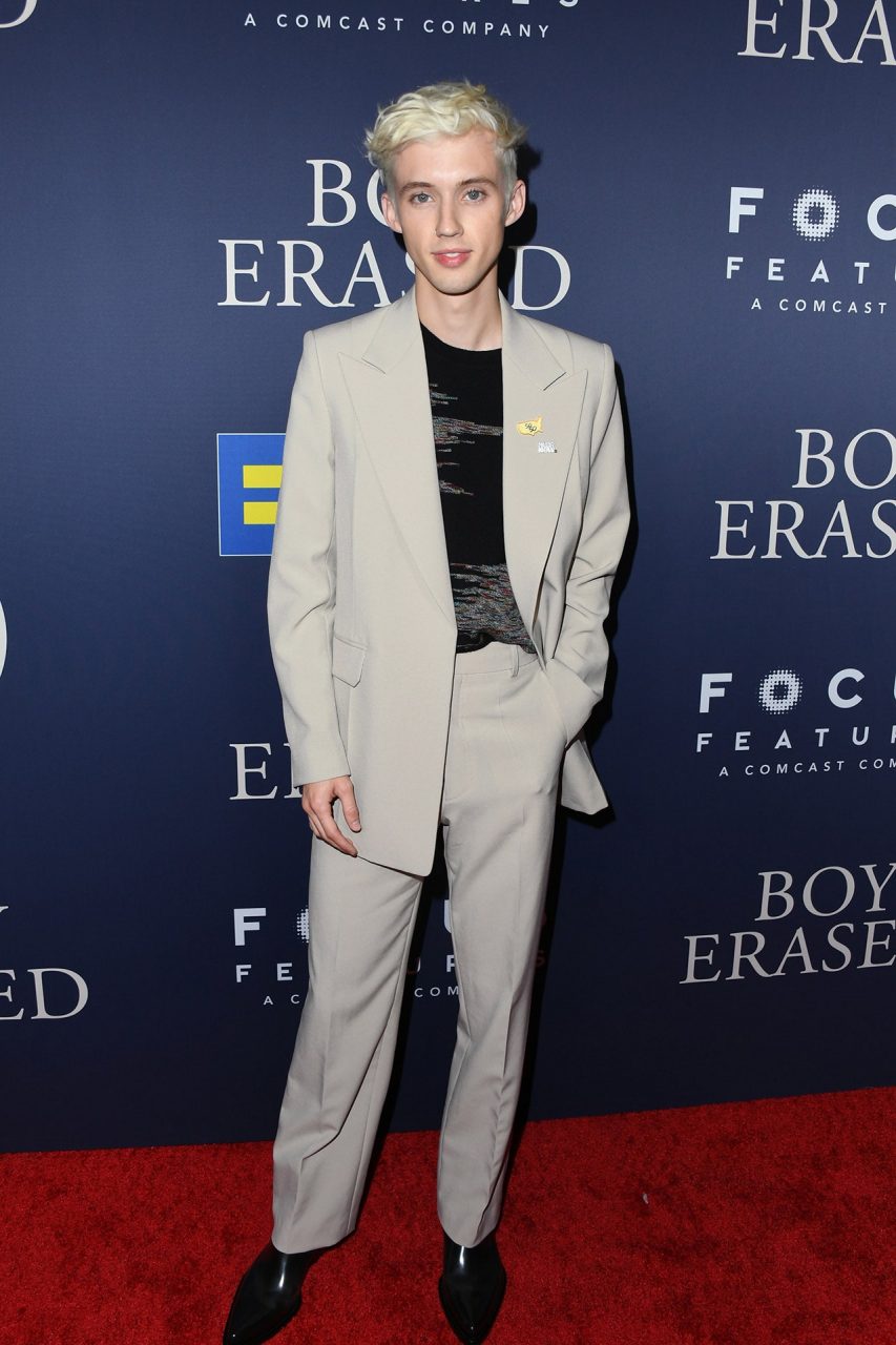 如果 Draco Malfoy 參加紅地毯活動,我們可以想像他會出現這樣的場景——一件翻滾的及膝長斗篷和一件合身的單色衣服;如今 Troye Sivan 更加在胸前展示「包容性」的別針。