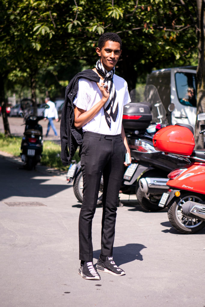 MILAN, ITALY - JUNE 17: A guest, wearing a white t-shirt, black trousers, black and white sneakers and black and white striped Fendi scarf, is seen outside Fendi show, during the Milan Men's Fashion Week Spring/Summer 2020 on June 17, 2019 in Milan, Italy. (Photo by Claudio Lavenia/Getty Images)
