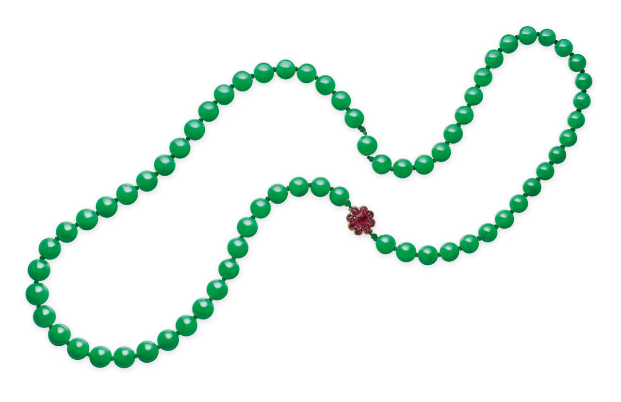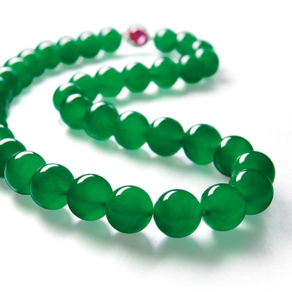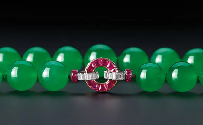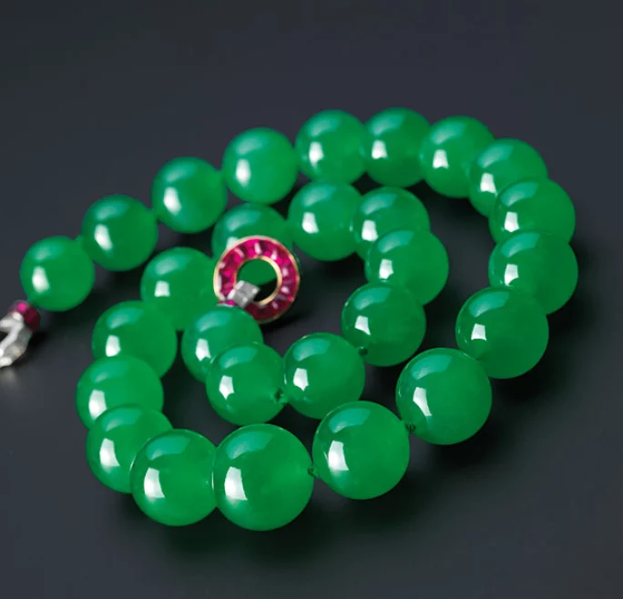 Christie’s香港2017年11月的「瑰麗珠寶及翡翠首飾」拍賣中,這條由29顆翡翠珠組成的頸鏈是當天的成交之冠,每顆翡翠珠色澤均勻而透光度高,直徑均達15毫米,極高品質的翡翠加上巨大尺寸,配合被鑽石包圍的紅寶石作為點綴,散發貴族氣派,使其成為價值連城的珍寶!